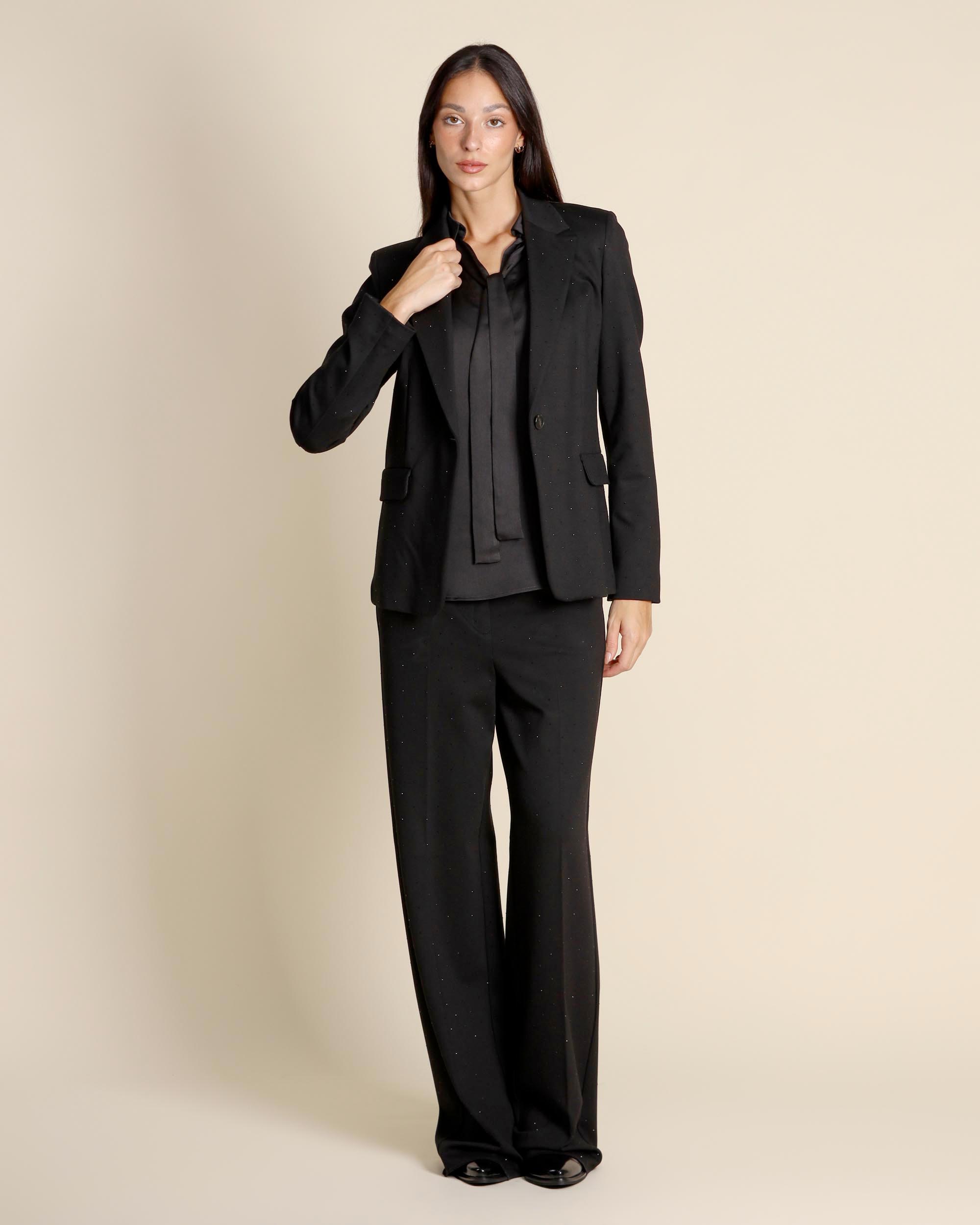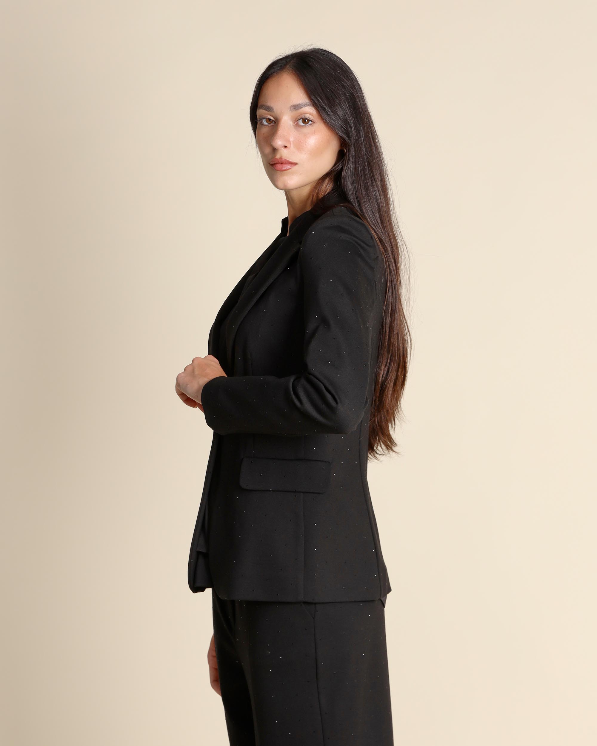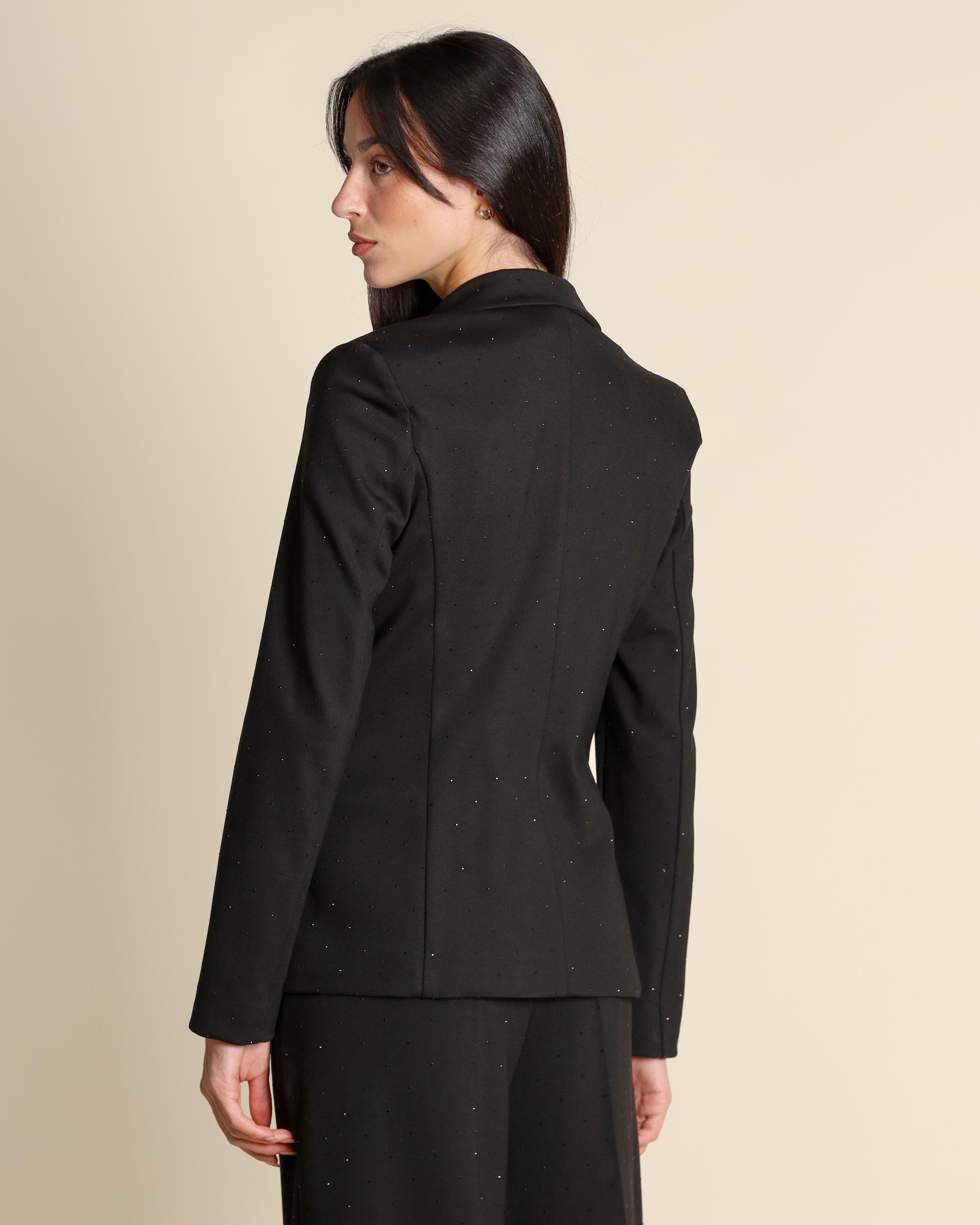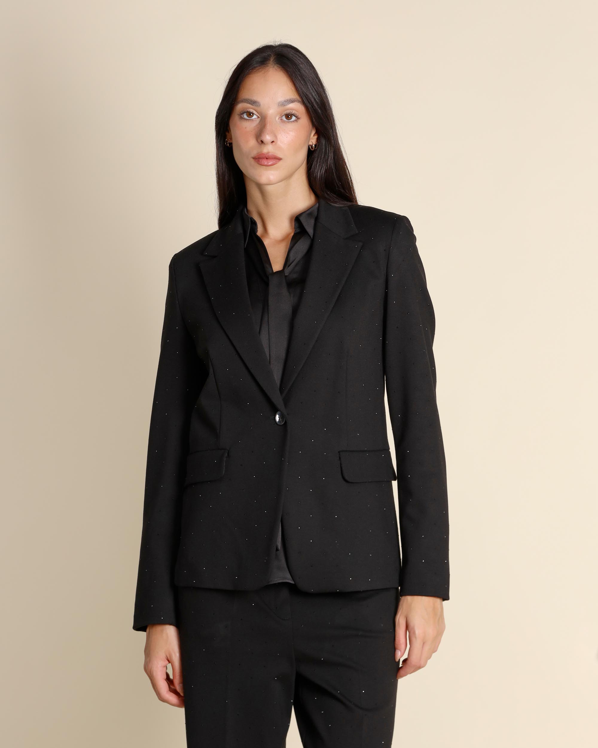 Giacca nera in jersey di misto viscosa stretch con applicazione di piccoli strass neri, collo a rever, maniche lunghe, chiusura con bottone, linea semiaderente, tasche con patta, sfoderata, la modella indossa una tg.42, la modella ha le seguenti misure: altezza 173, seno 86,vita 65, fianchi 93, collezione donna Emme by Marella Autunno Inverno 2025/26