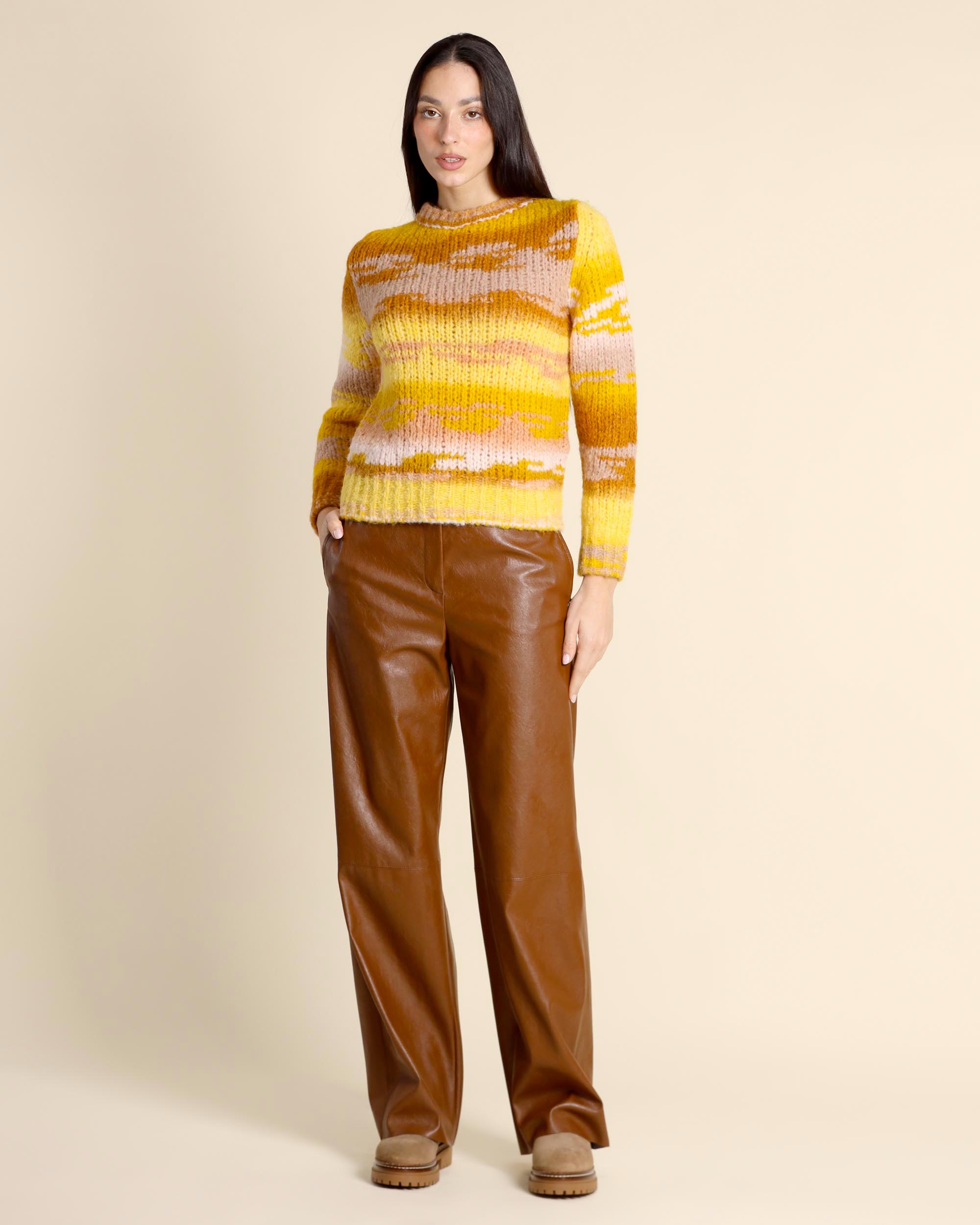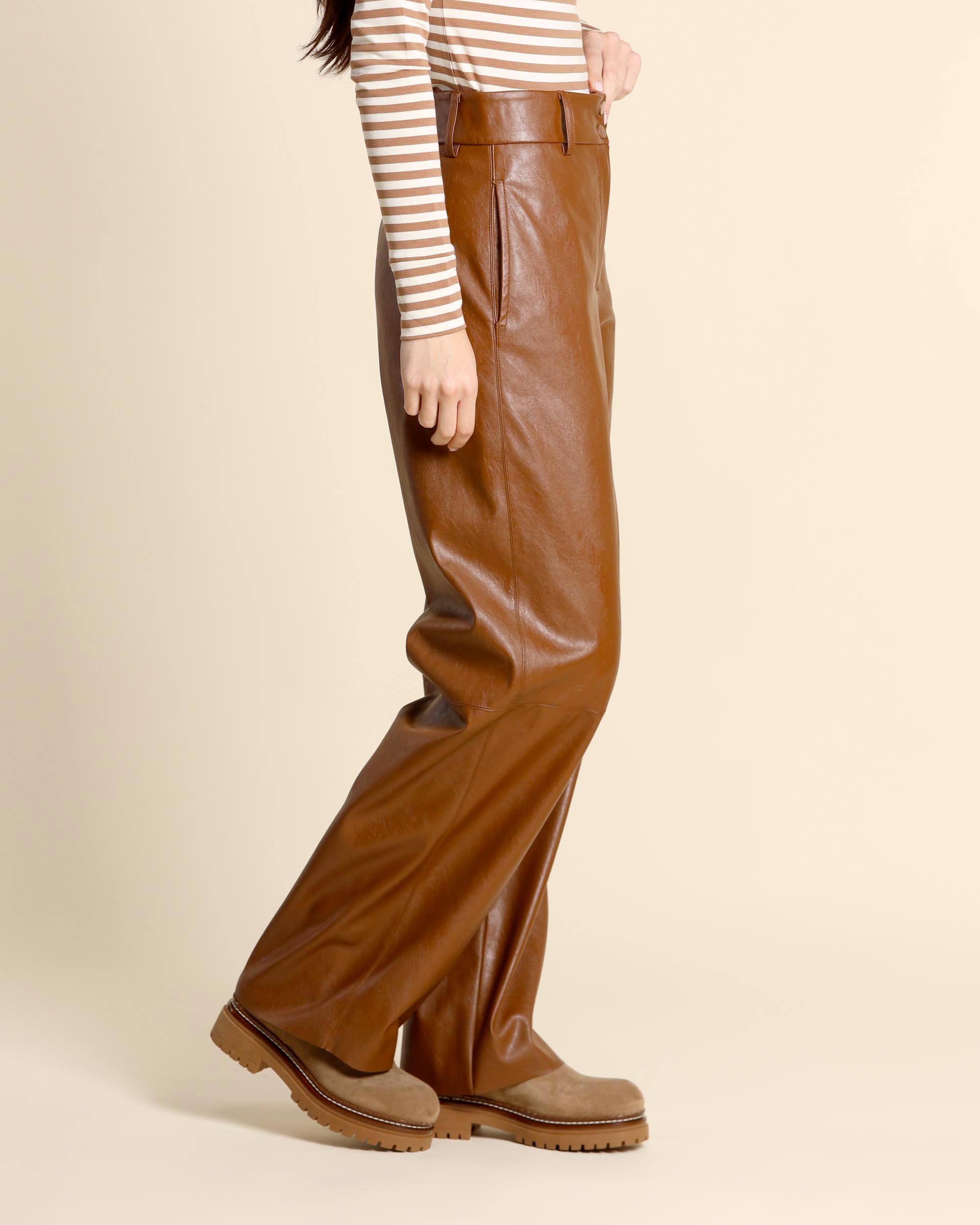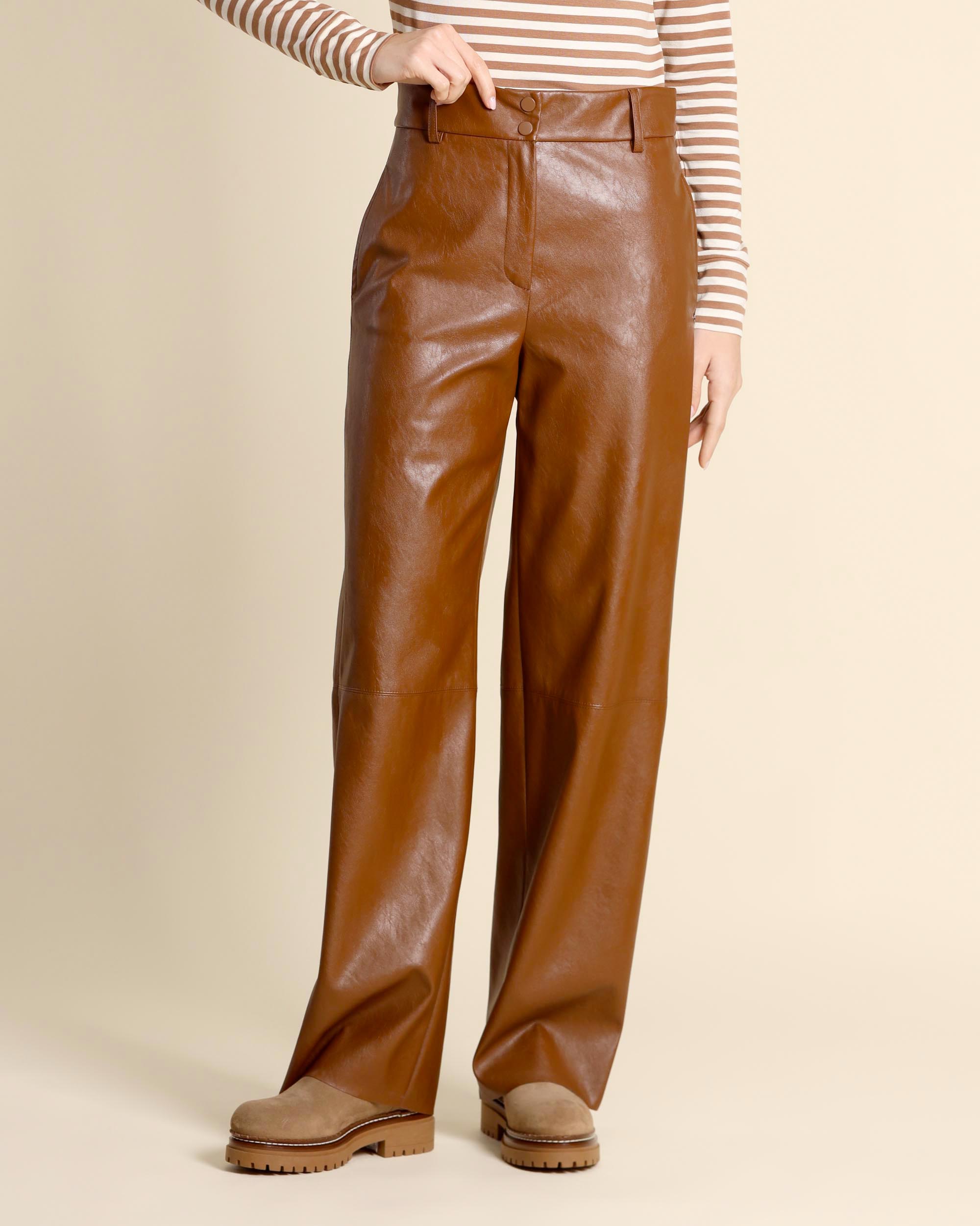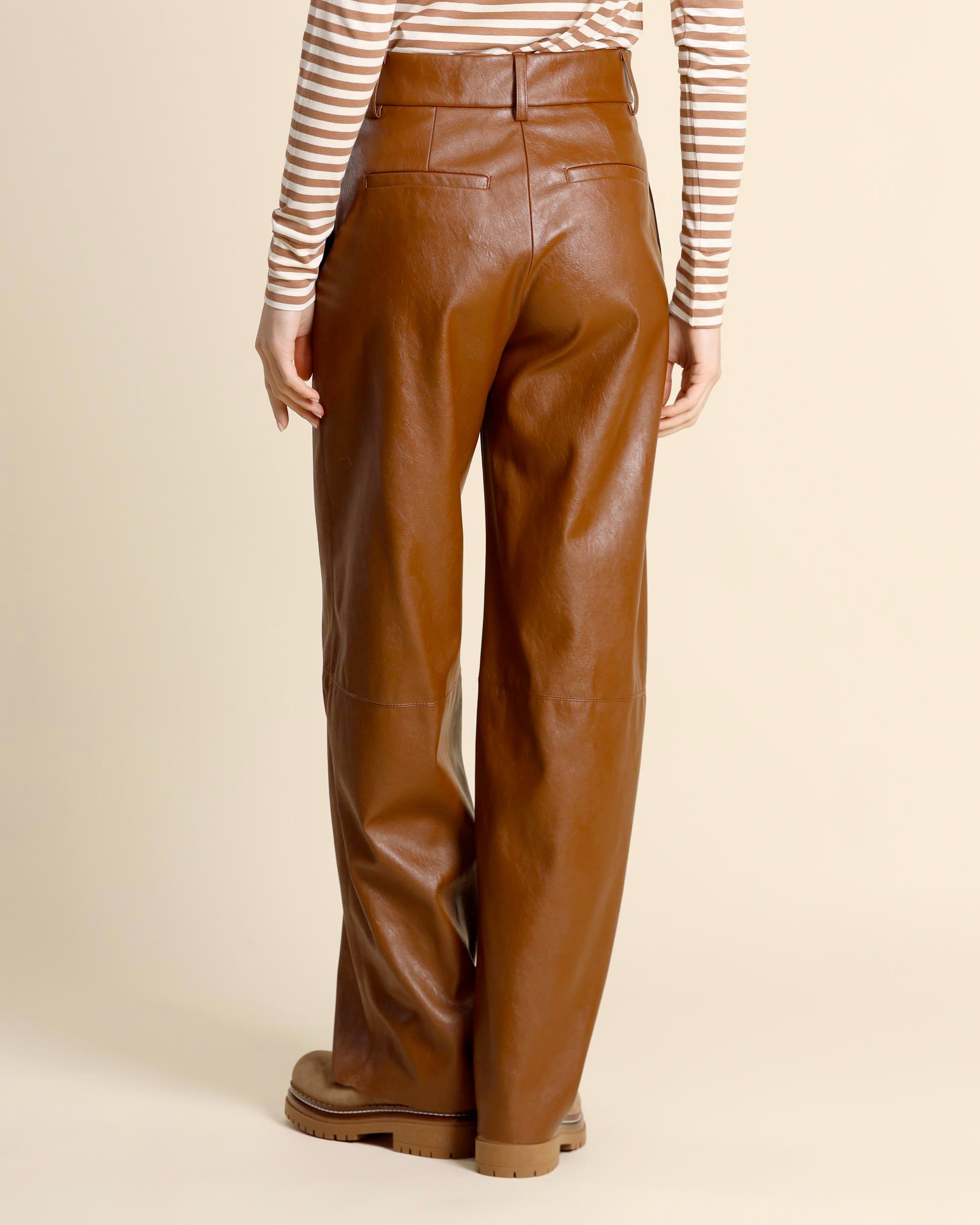 Pantaloni color cuoio in jersey con finitura spalmata effetto pelle, chiusura con bottoni a pressione e zip nascosta, tasche inserite sul fianco, tasche a filetto sul dietro, linea morbida, la modella indossa una tg.40, la modella ha le seguenti misure: altezza 173, seno 86,vita 65, fianchi 93, collezione donna Pennyblack Autunno Inverno 2025/26