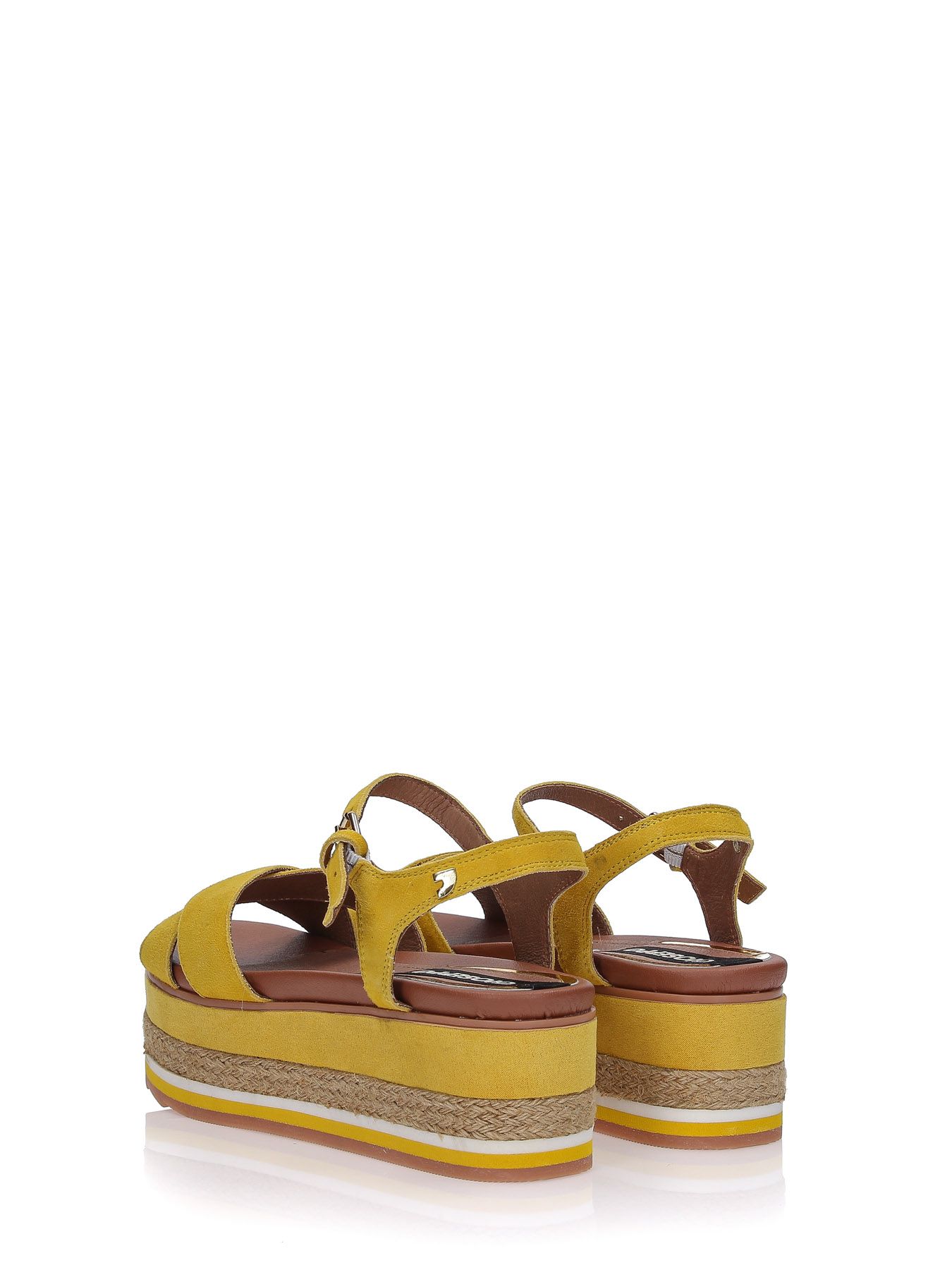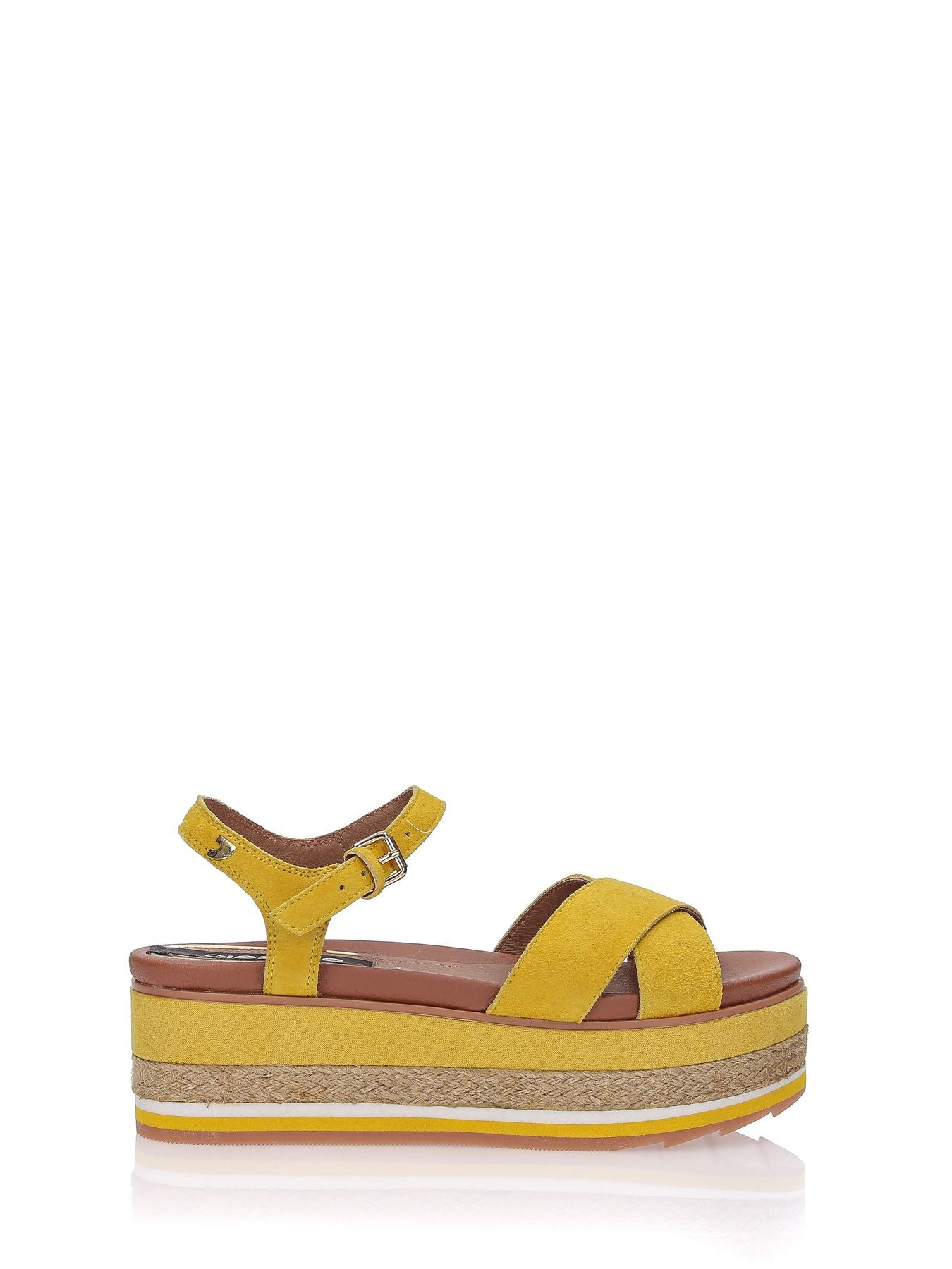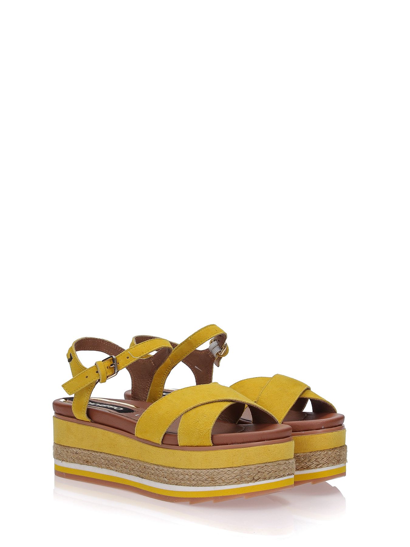 Sandali con zeppa in camoscio giallo mostarda, fasce incrociate, zeppa ricoperta in camoscio, corda e gomma ultralight 55mm, sottopiede in pelle, suola in gomma, cinturino regolabile con fibbia, punta tonda, collezione Gioseppo Primavera Estate 2019