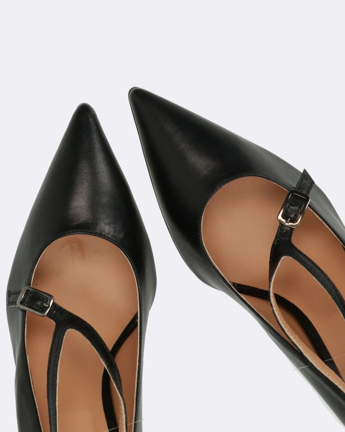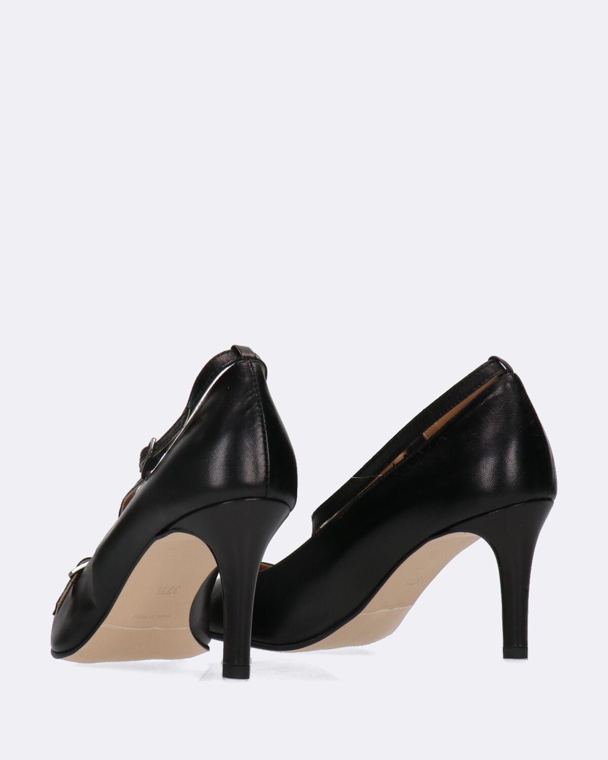 Decolletè in pelle nera, a punta, tacco ricoperto in pelle 75mm, suola in gomma, sottopiede in pelle imbottito, fodera in pelle, cinturino regolabile con doppia fibbia, made in Italy, collezione donna Hope