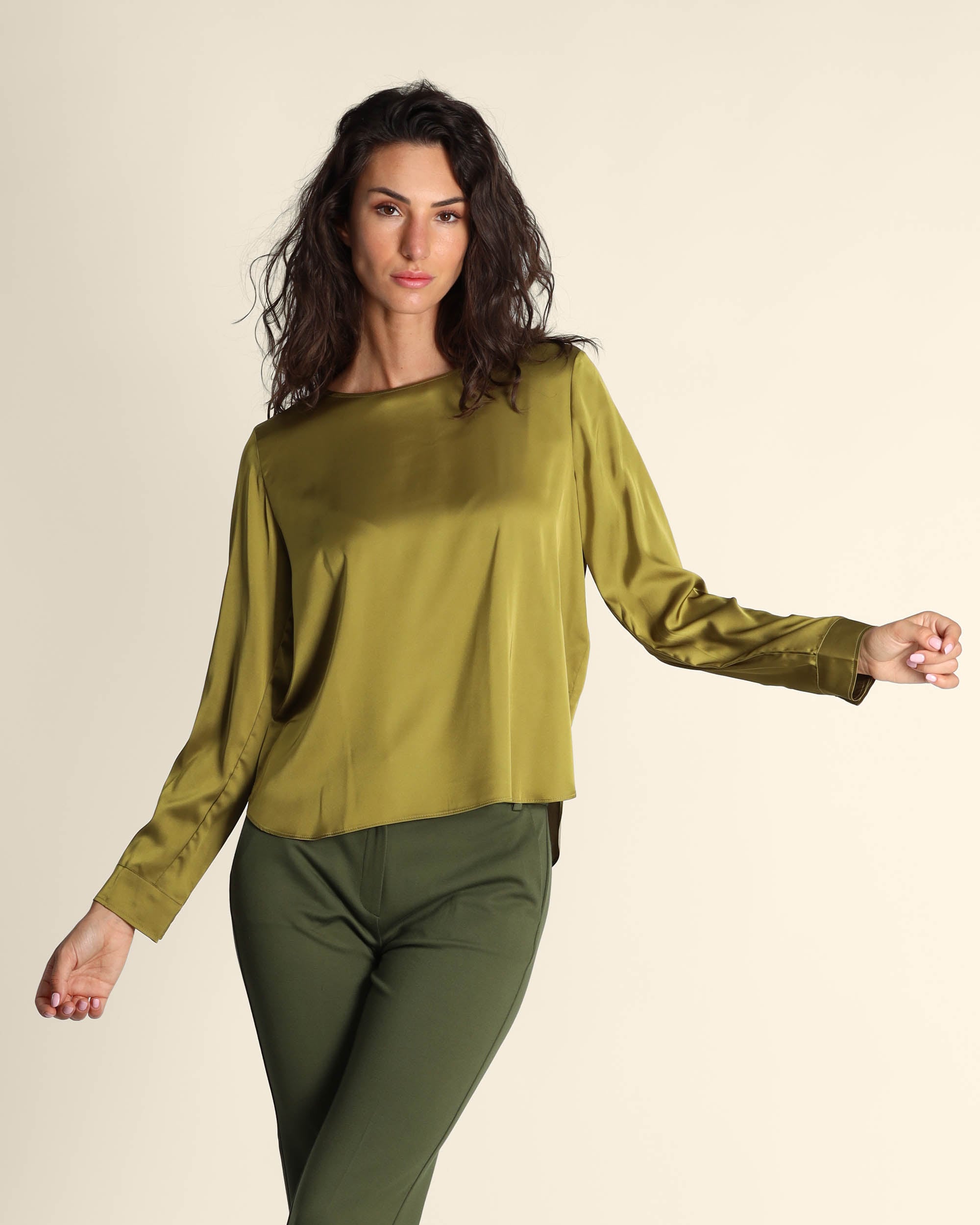 Blusa verde acido in twill, scollo tondo, maniche lunghe con polsino, linea dritta, fondo stondato, la modella indossa una tg.42, la modella ha le seguenti misure: altezza 178, seno 86,vita 65, fianchi 93, collezione donna Emme by Marella Autunno Inverno 2025/26