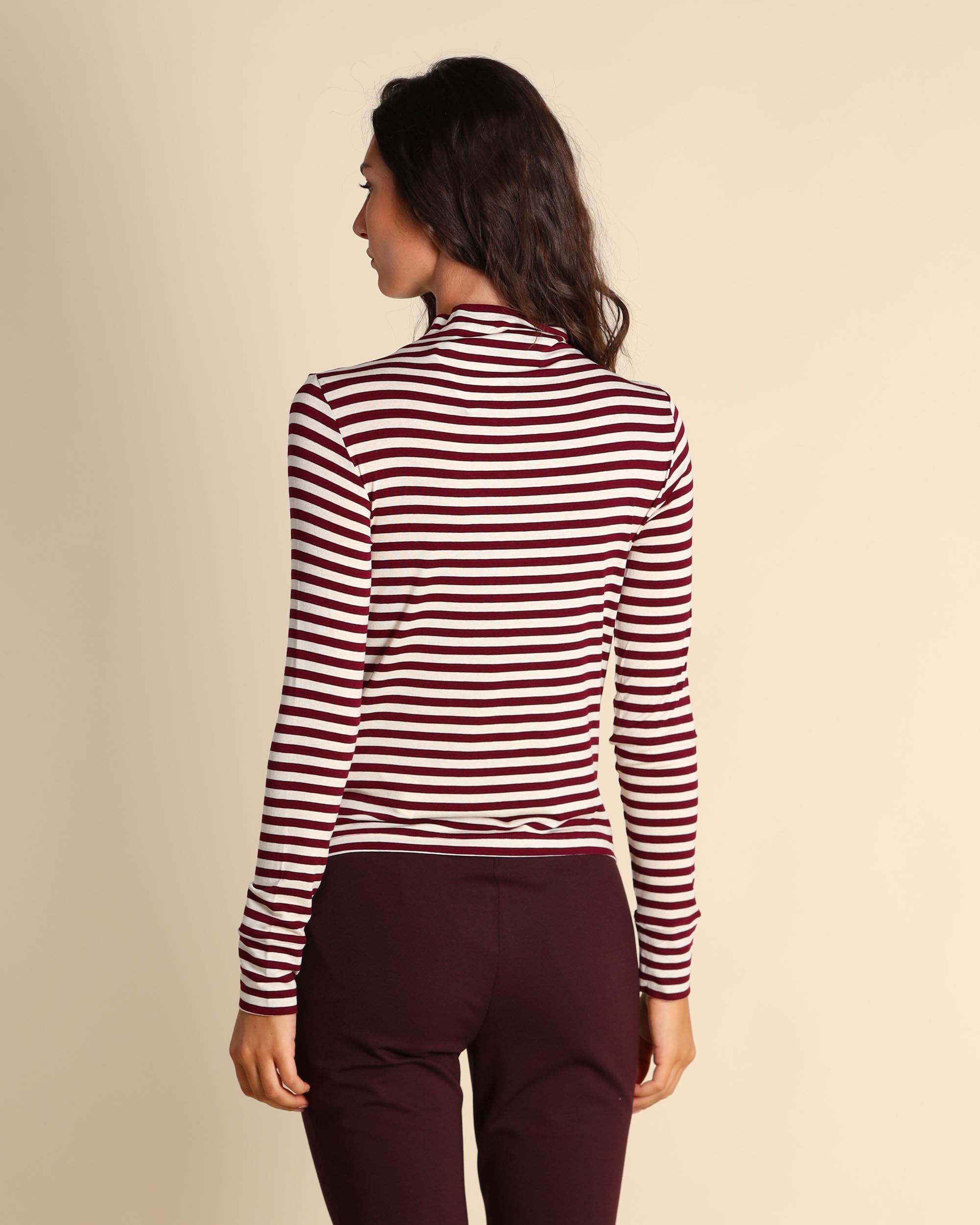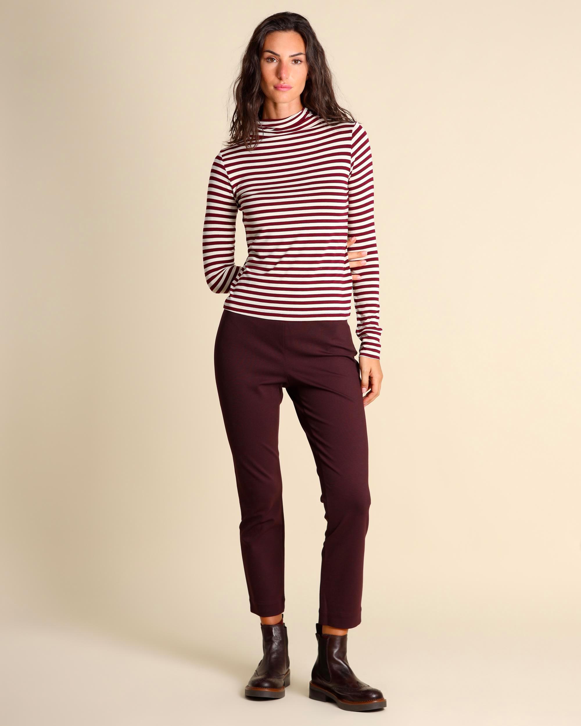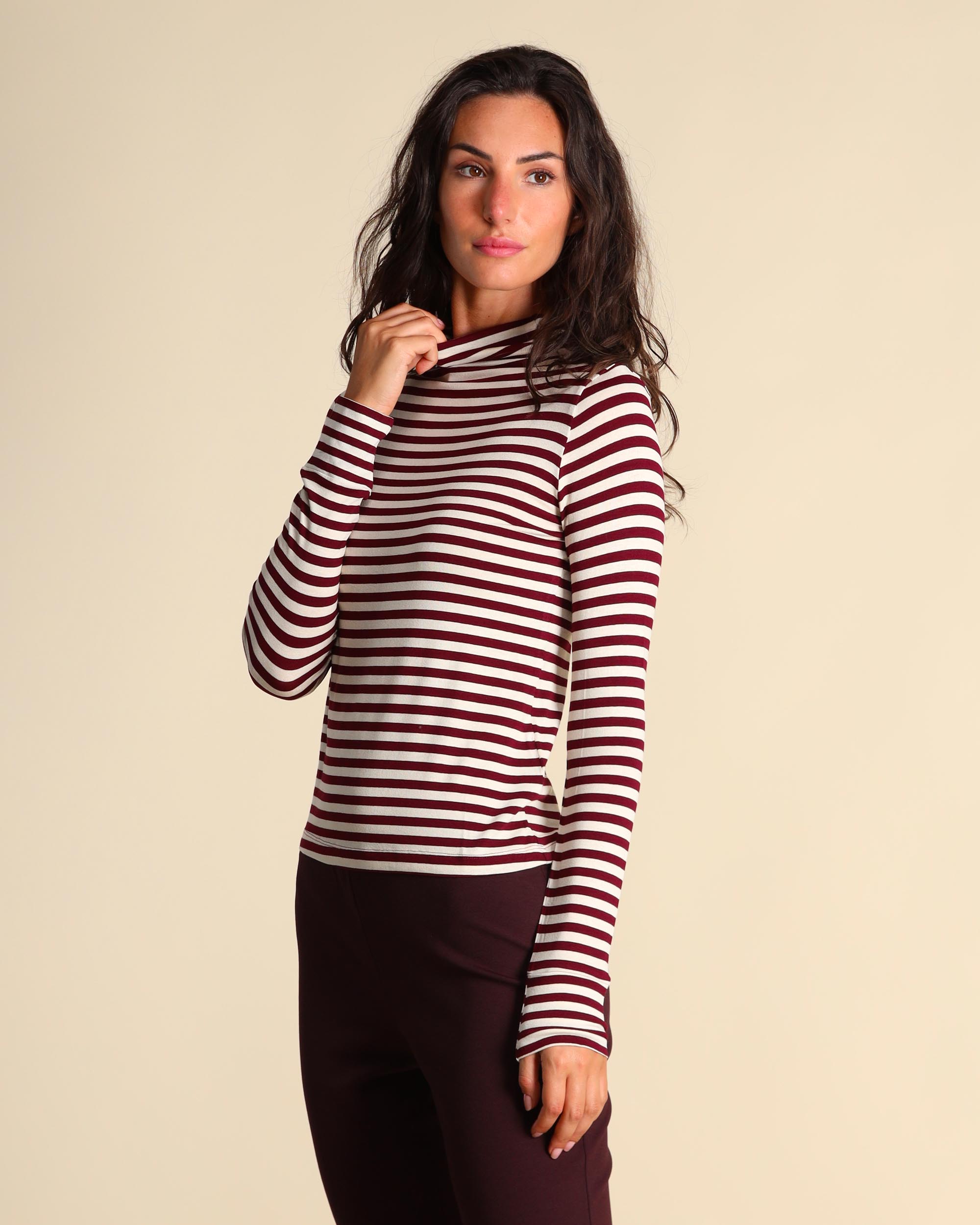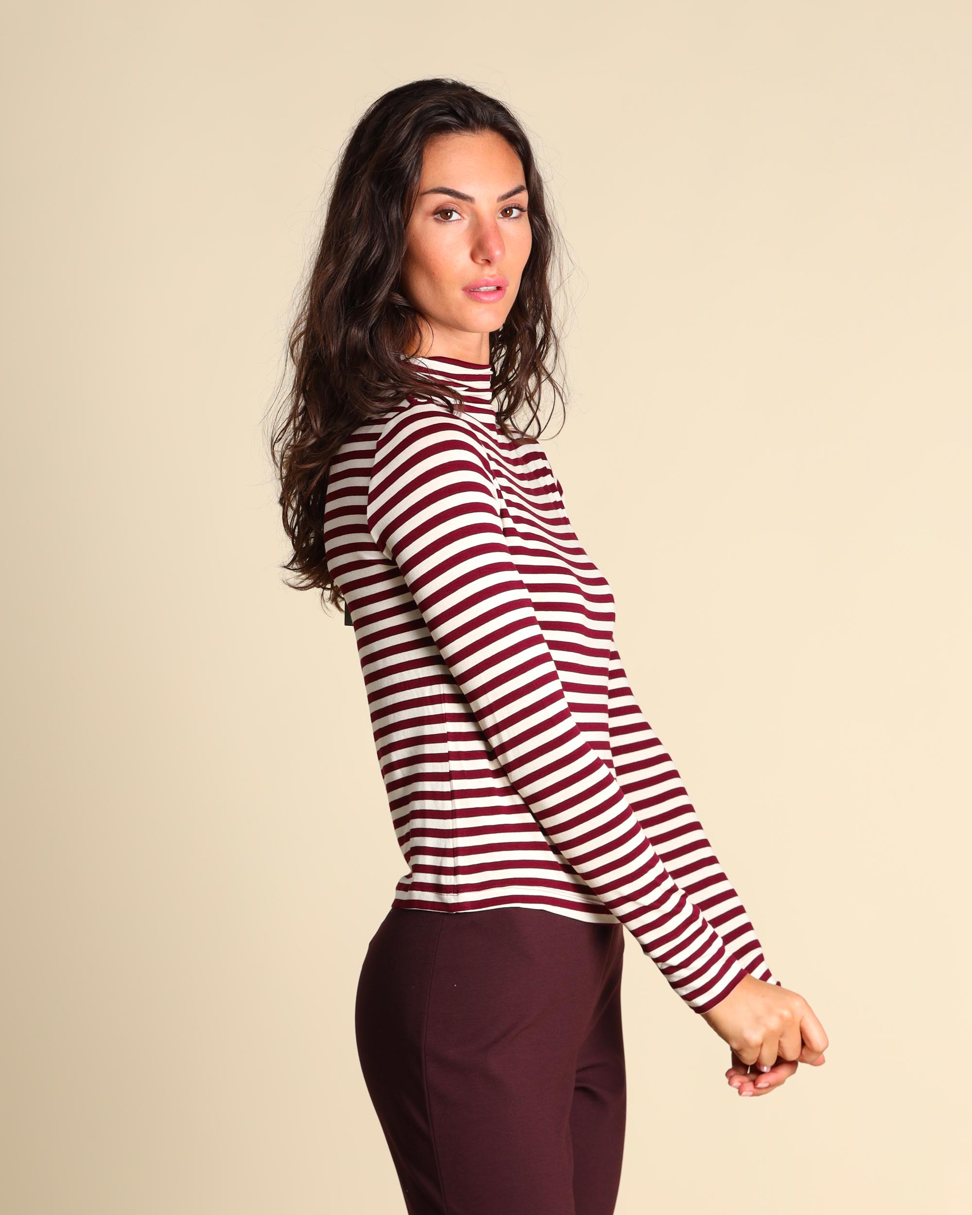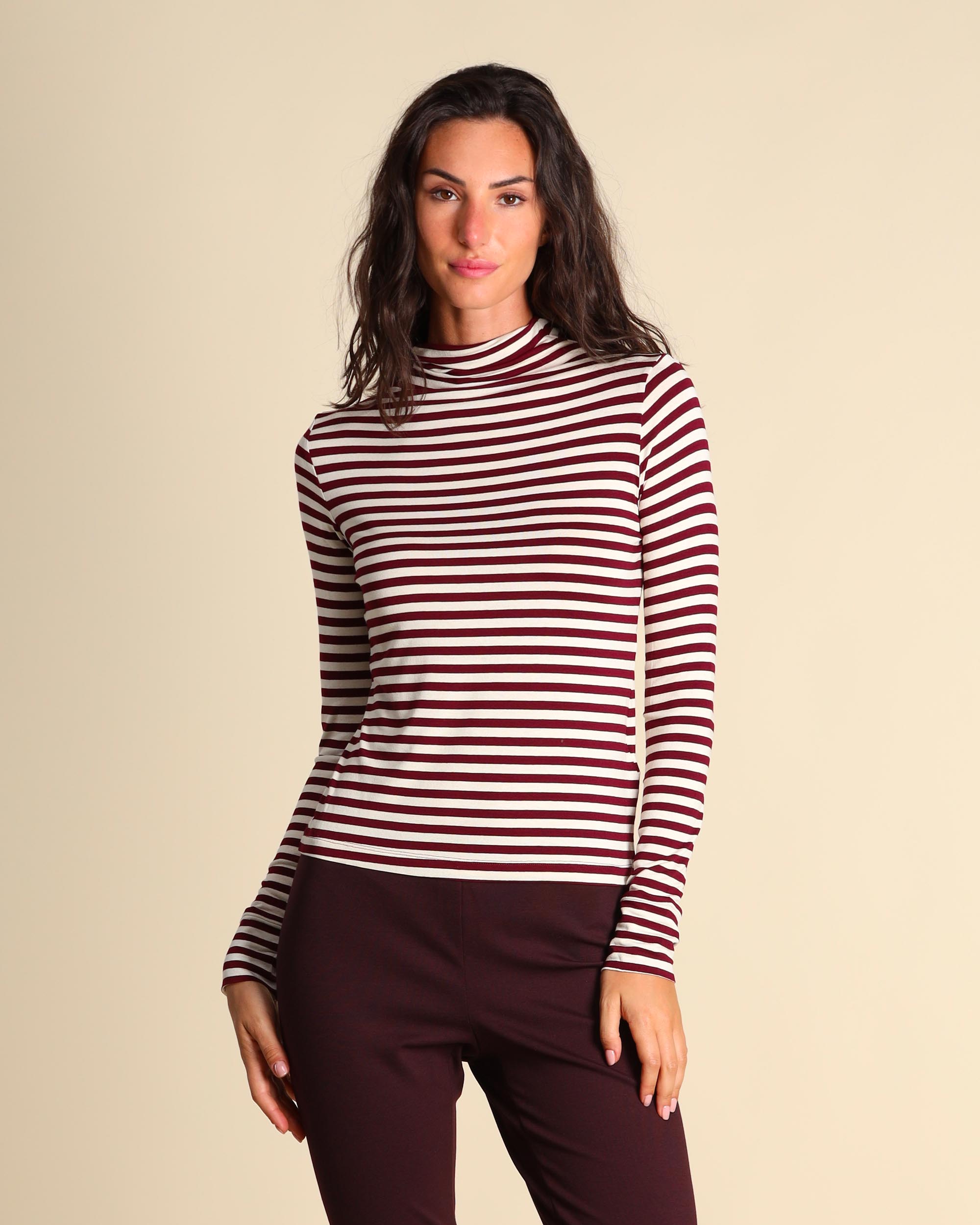 T shirt bordeaux e panna in jersey di viscosa stretch, collo alto, maniche lunghe, linea semiaderente, la modella indossa una tg.S, la modella ha le seguenti misure: altezza 179, seno 84, vita 63, fianchi 94, collezione donna Emme by Marella Autunno Inverno 2025/26