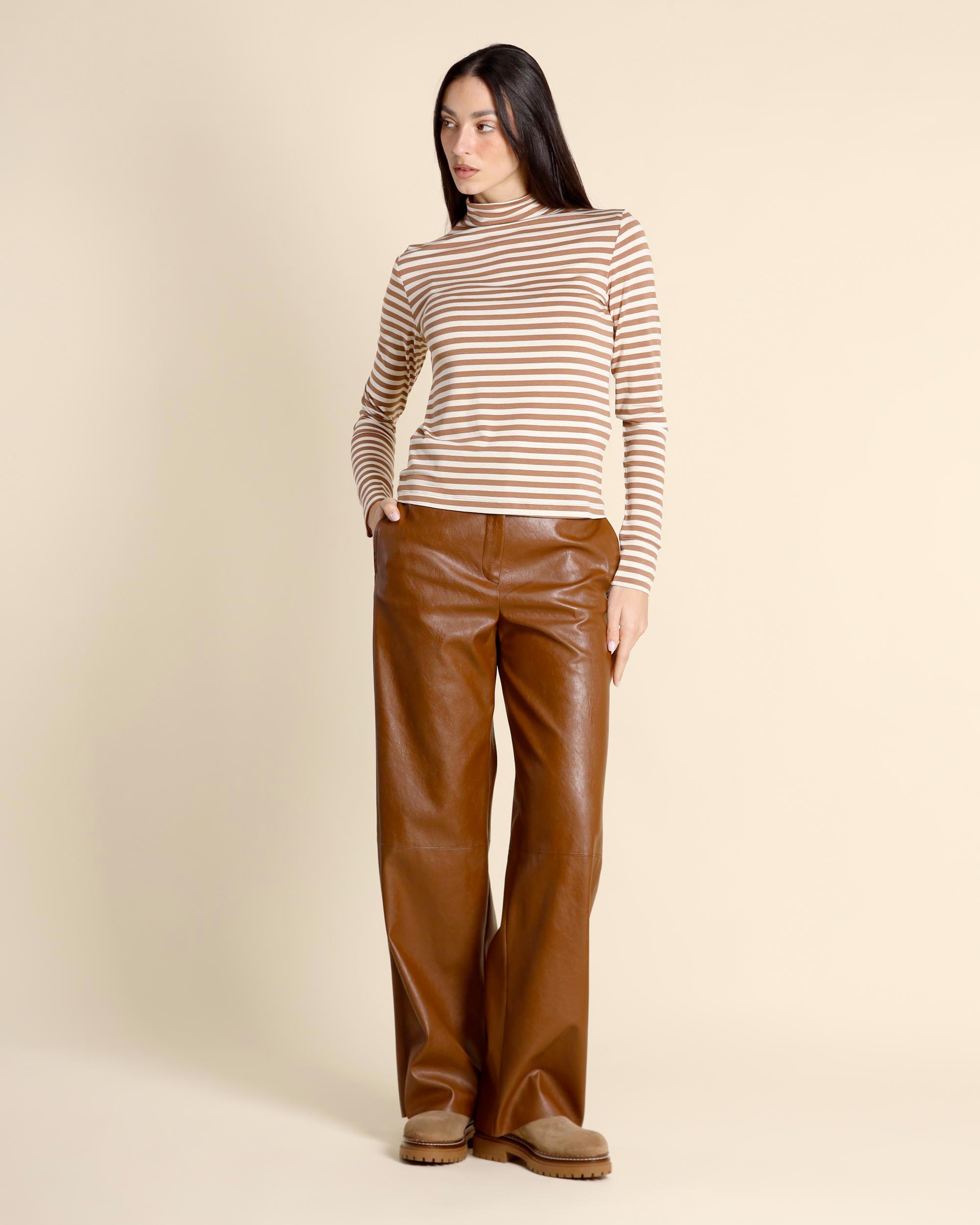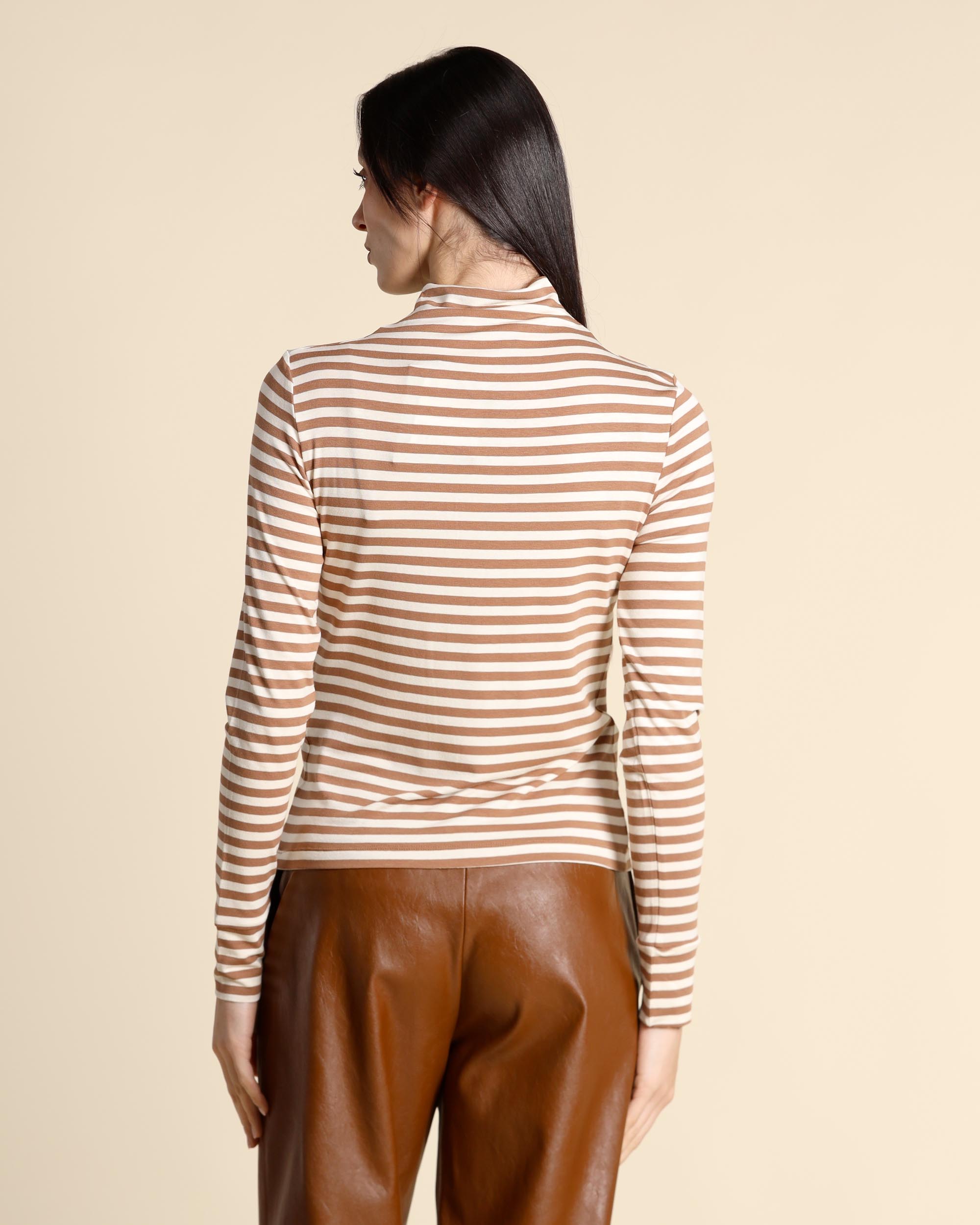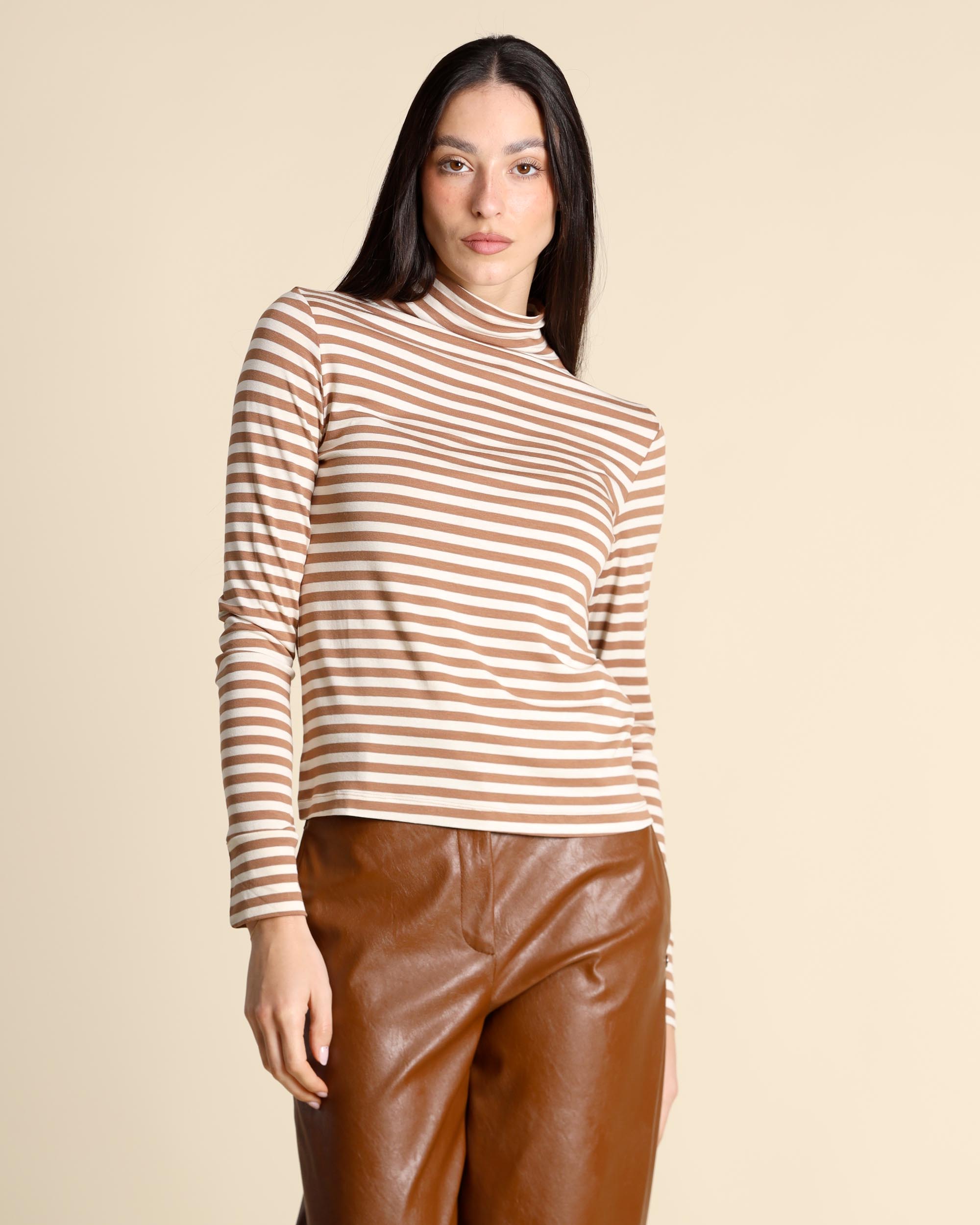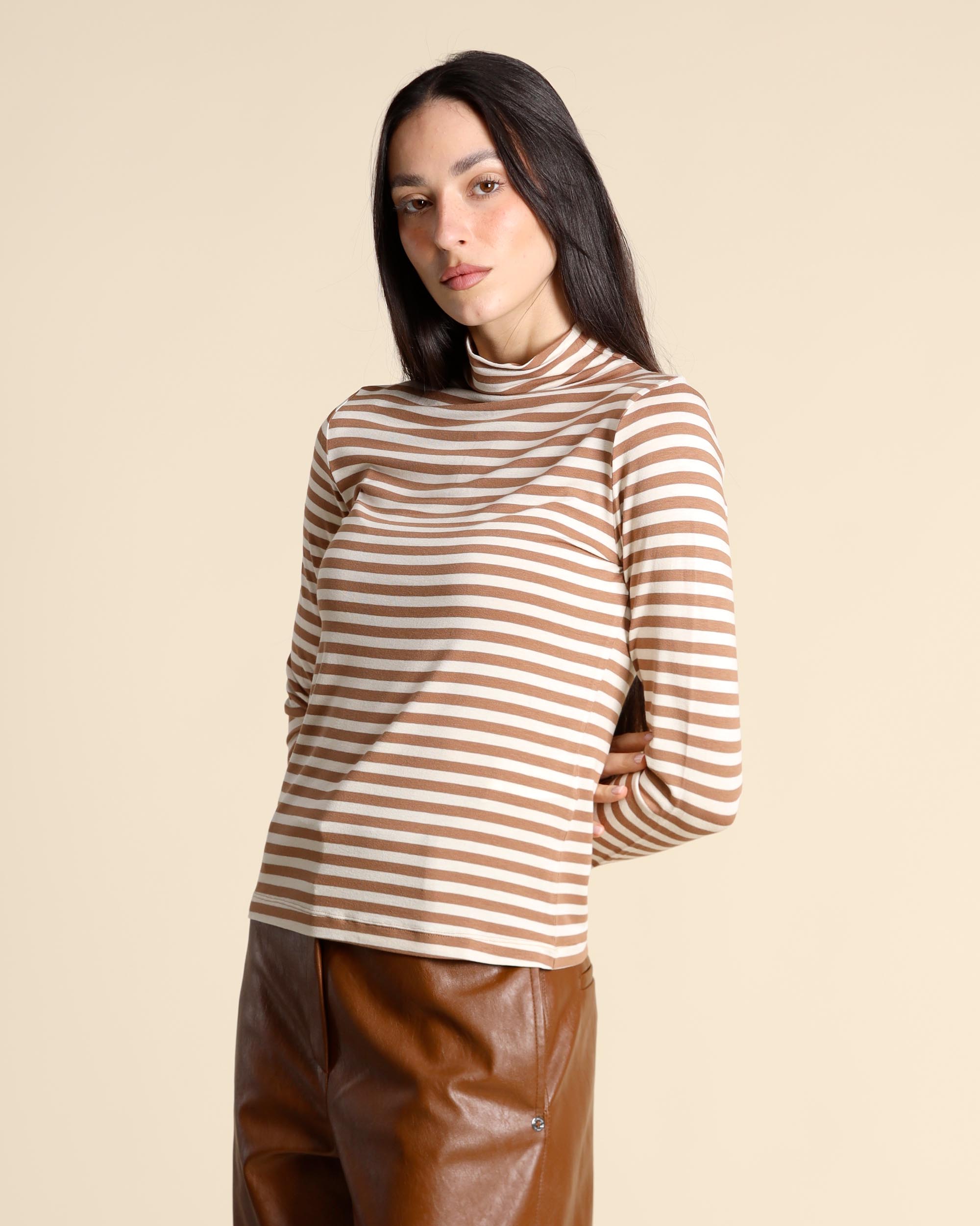 T shirt coloniale e panna in jersey di viscosa stretch, collo alto, maniche lunghe, linea semiaderente, la modella indossa una tg.S, la modella ha le seguenti misure: altezza 179, seno 84, vita 63, fianchi 94, collezione donna Emme by Marella Autunno Inverno 2025/26