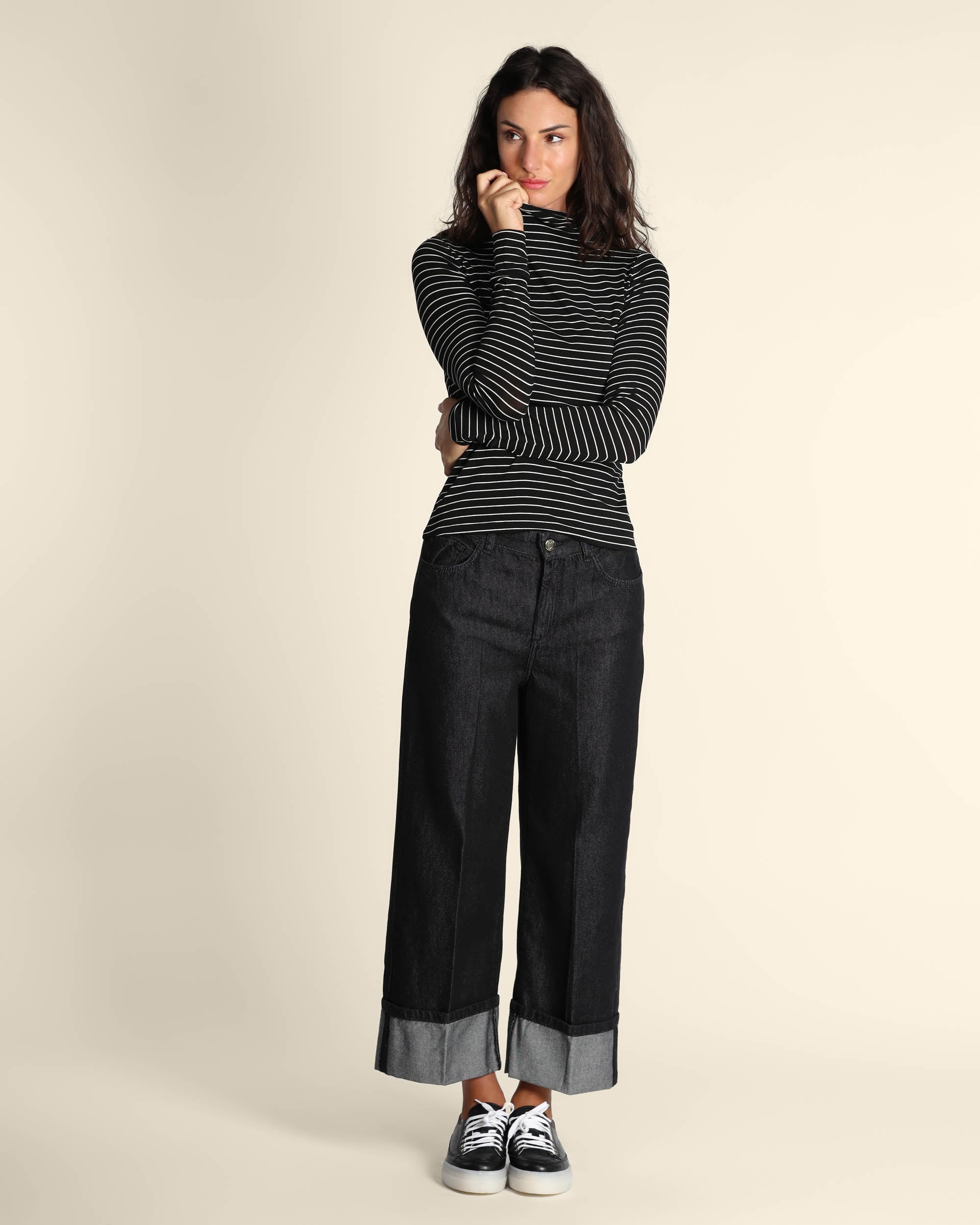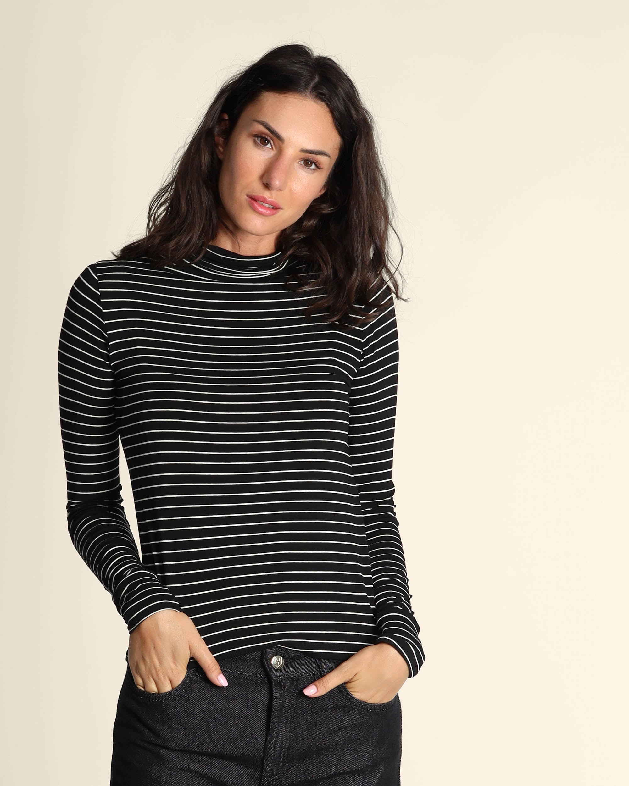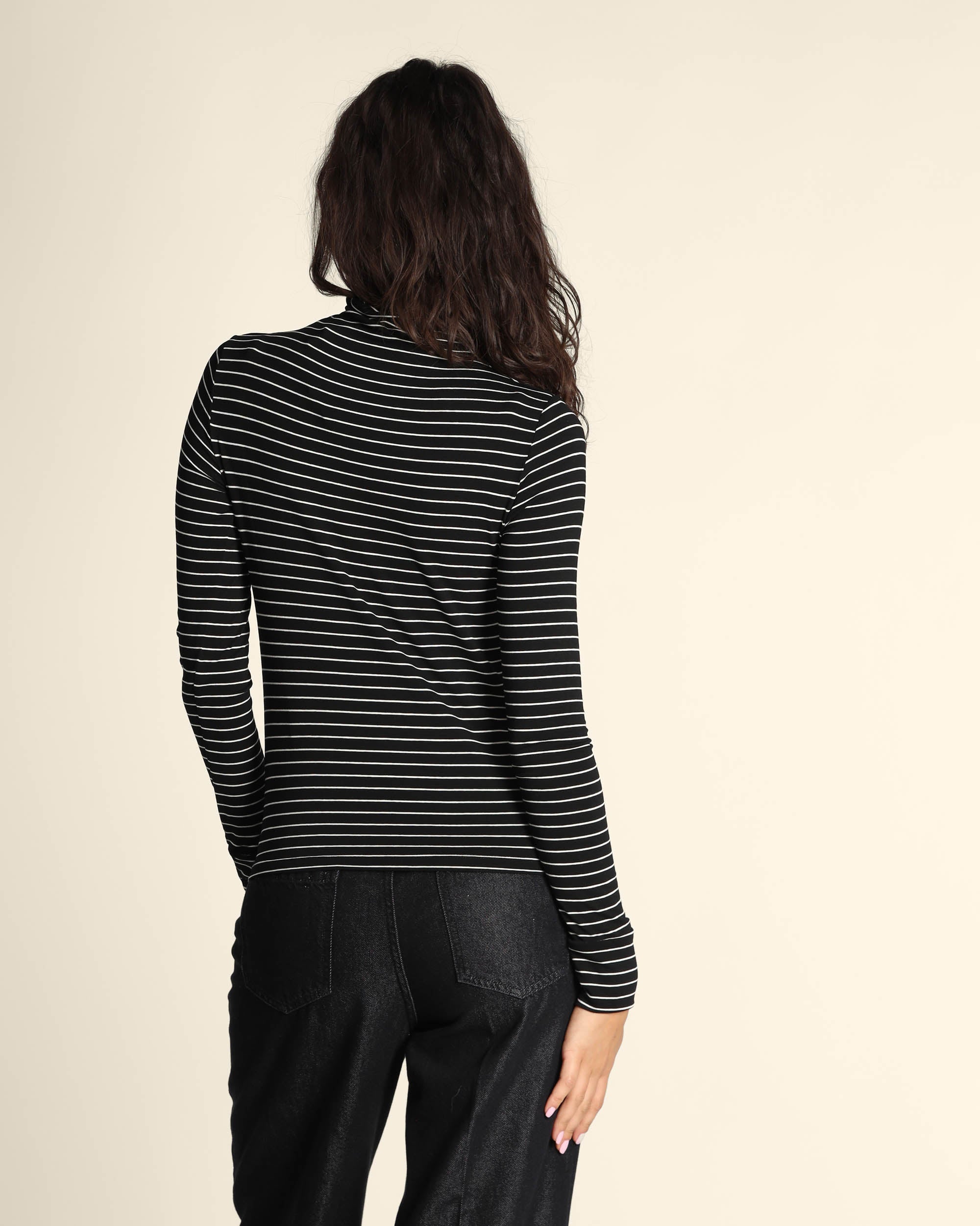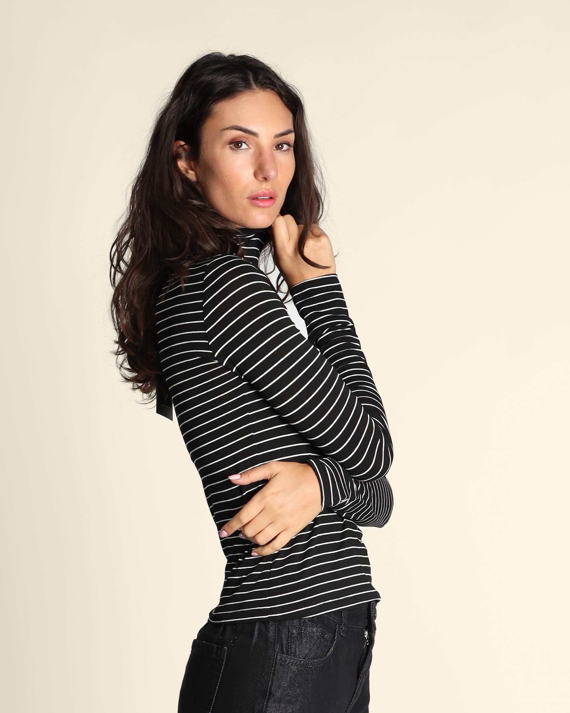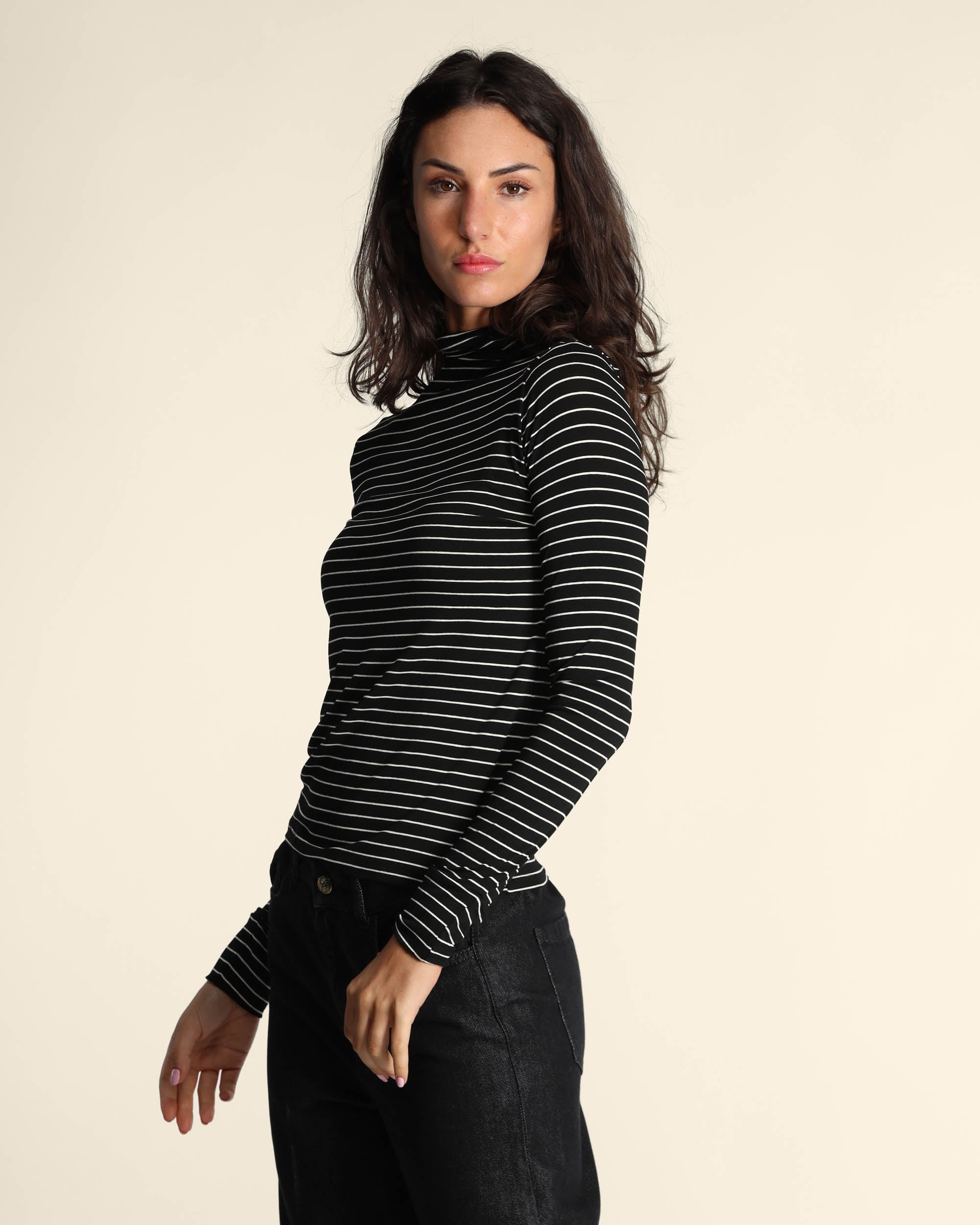T shirt nera a righe in jesrey di viscosa stretch, collo alto, maniche lunghe, linea semiaderente, la modella indossa una tg.S, la modella ha le seguenti misure: altezza 179, seno 84, vita 63, fianchi 94, collezione donna Emme by Marella Autunno Inverno 2025/26
