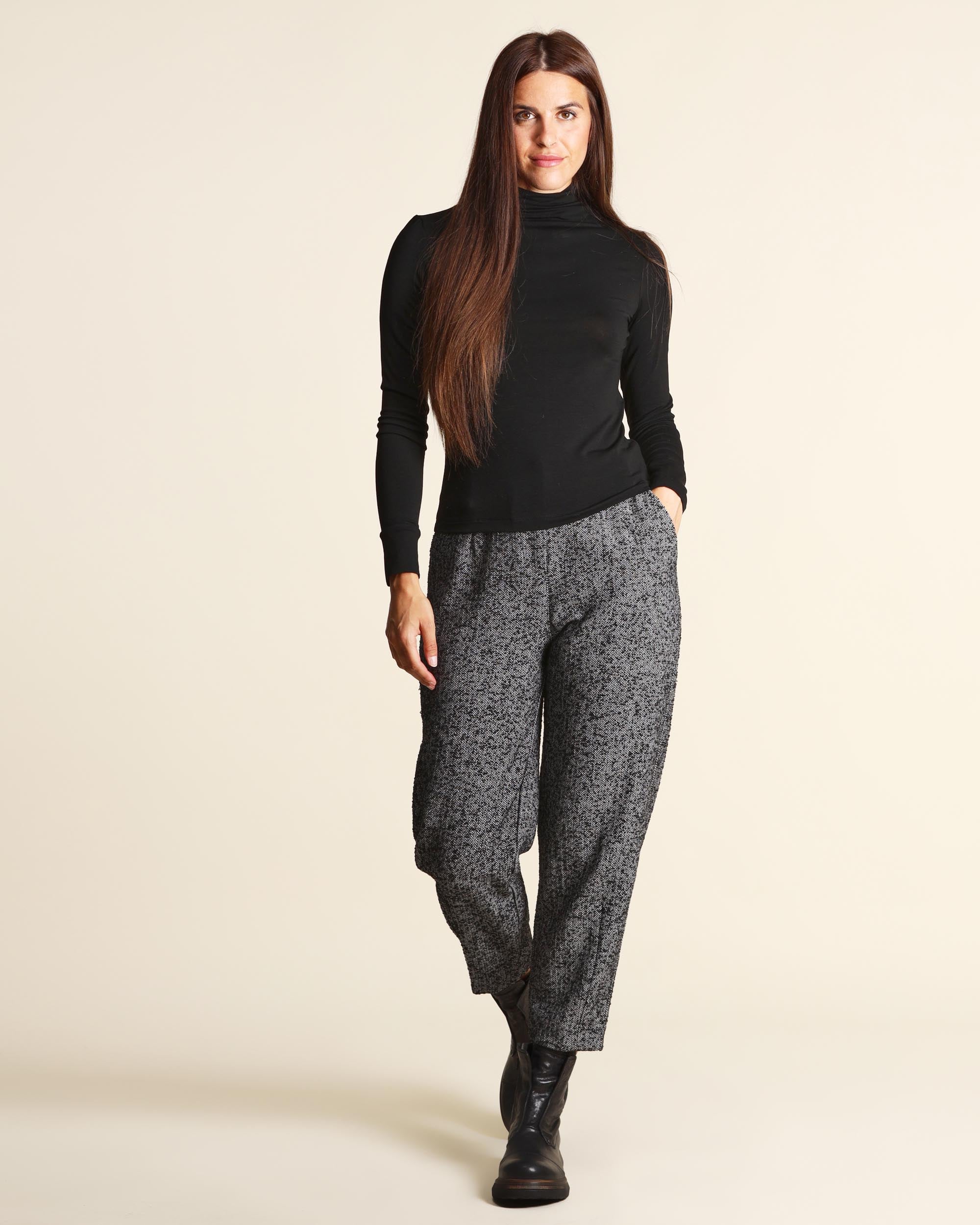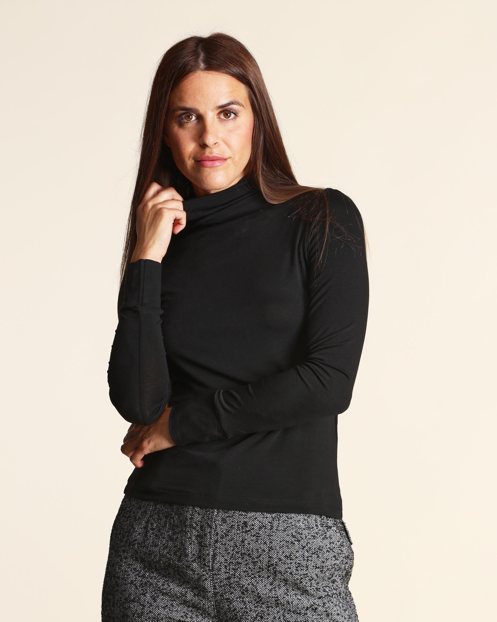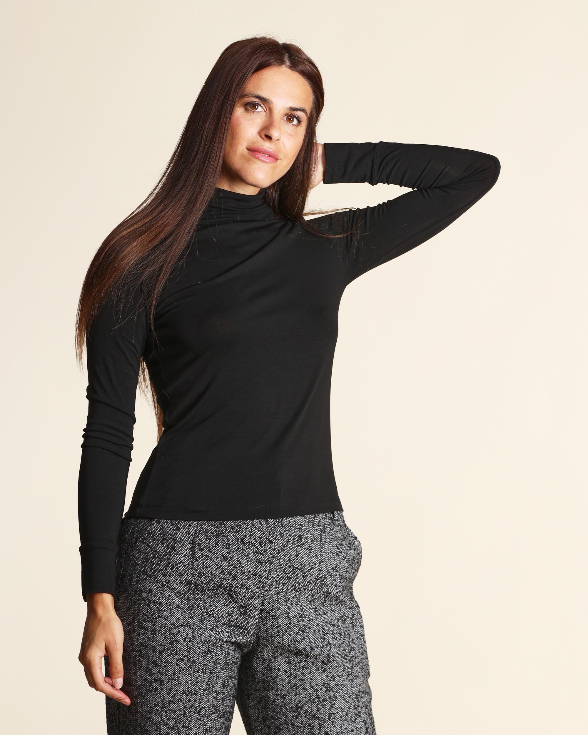 T shirt nera in jersey di viscosa stretch, collo alto, maniche lunghe, linea semiaderente, la modella indossa una tg.S, la modella ha le seguenti misure: altezza 179, seno 84, vita 63, fianchi 94, collezione donna Emme by Marella Autunno Inverno 2025/26