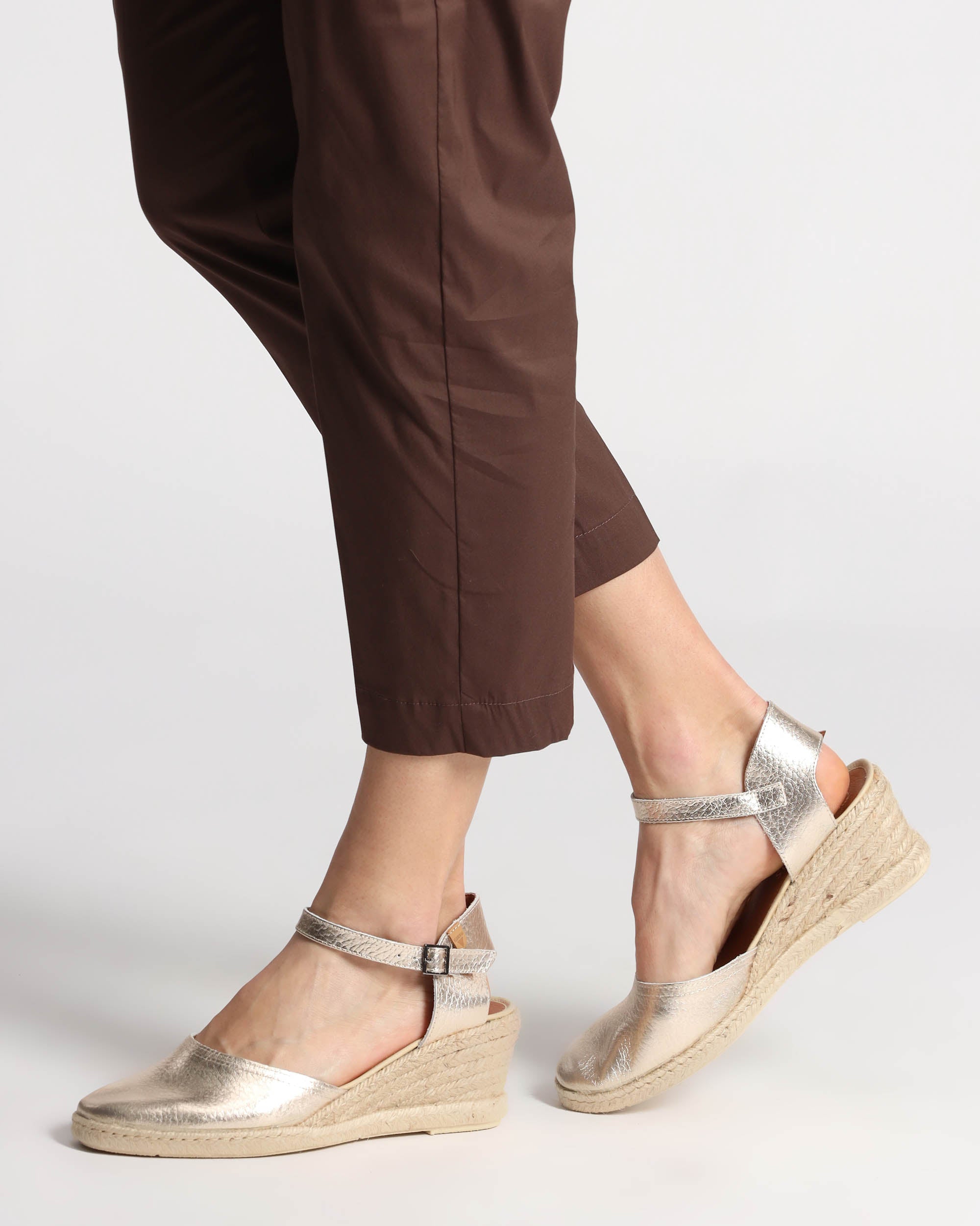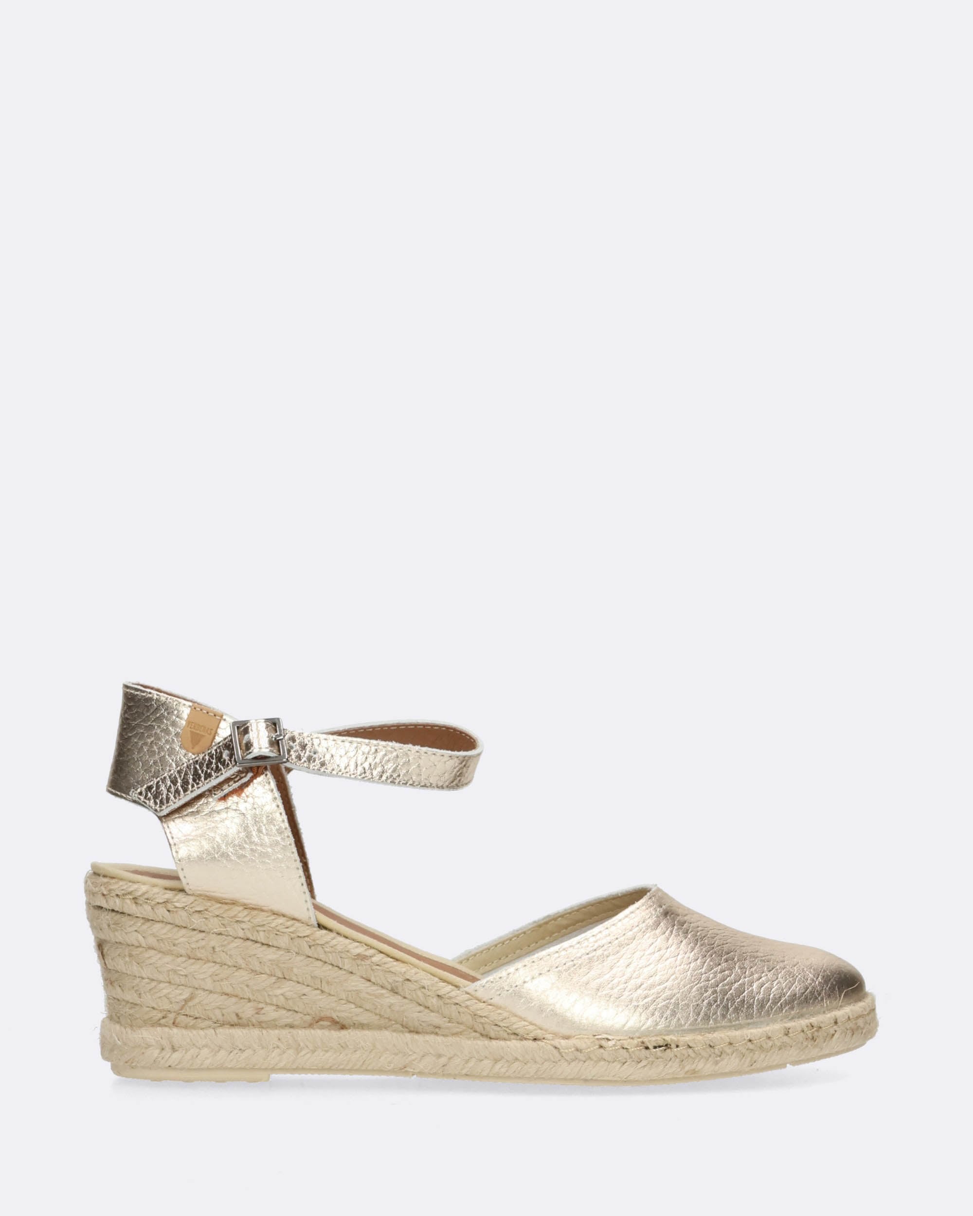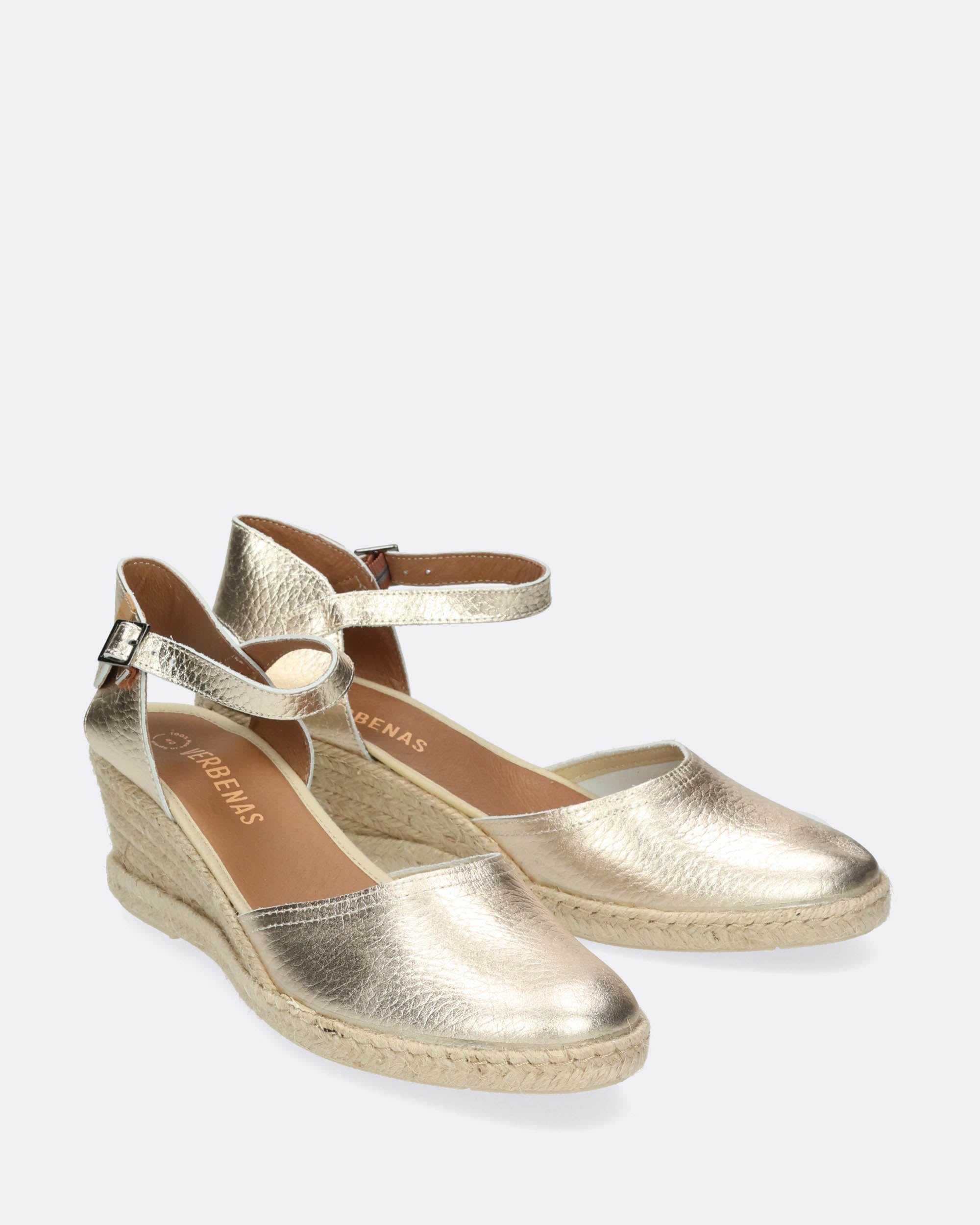 Espadrilles con zeppa in pelle laminata oro, sottopiede in pelle imbottito, zeppa 50mm, platform 10mm, suola in gomma, punta tonda, chiusura con cinturino e fibbia, collezione donna Verbenas Primavera Estate