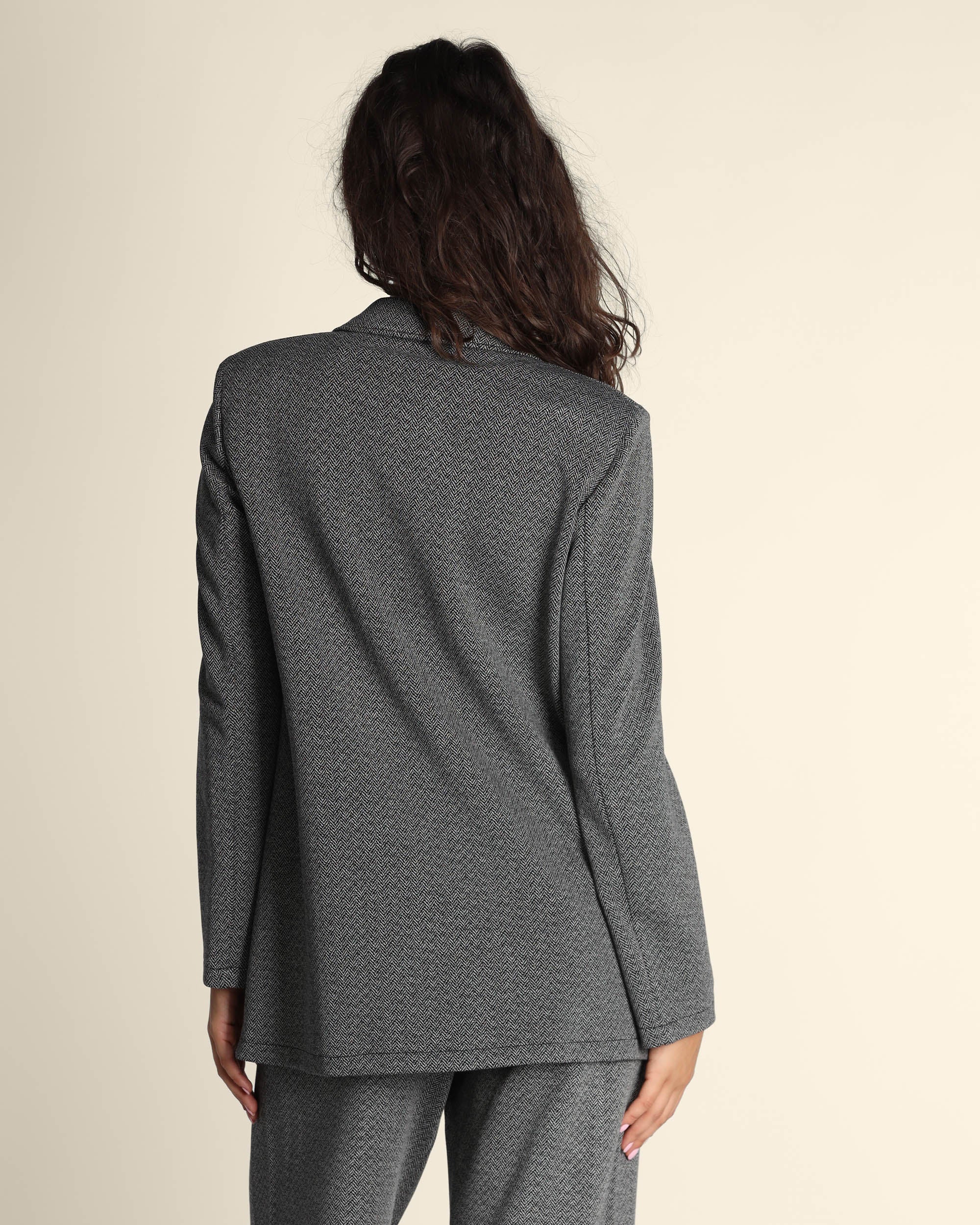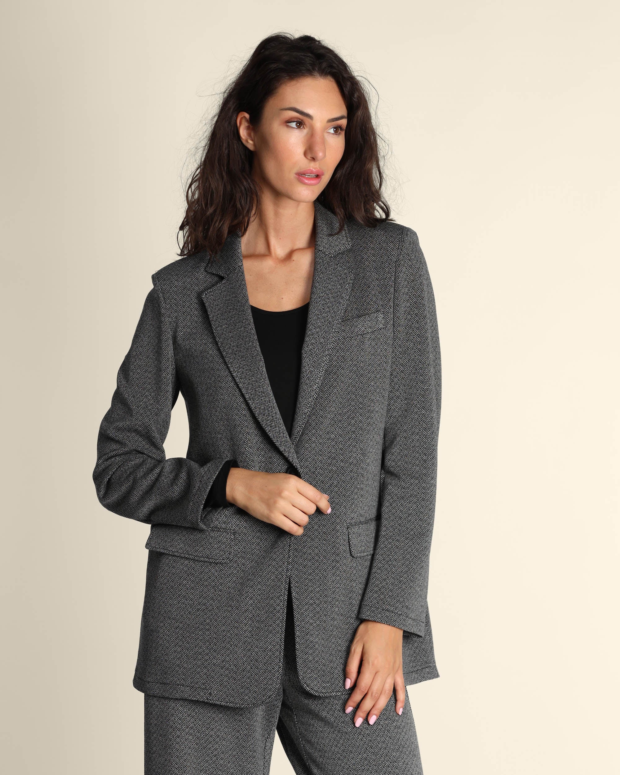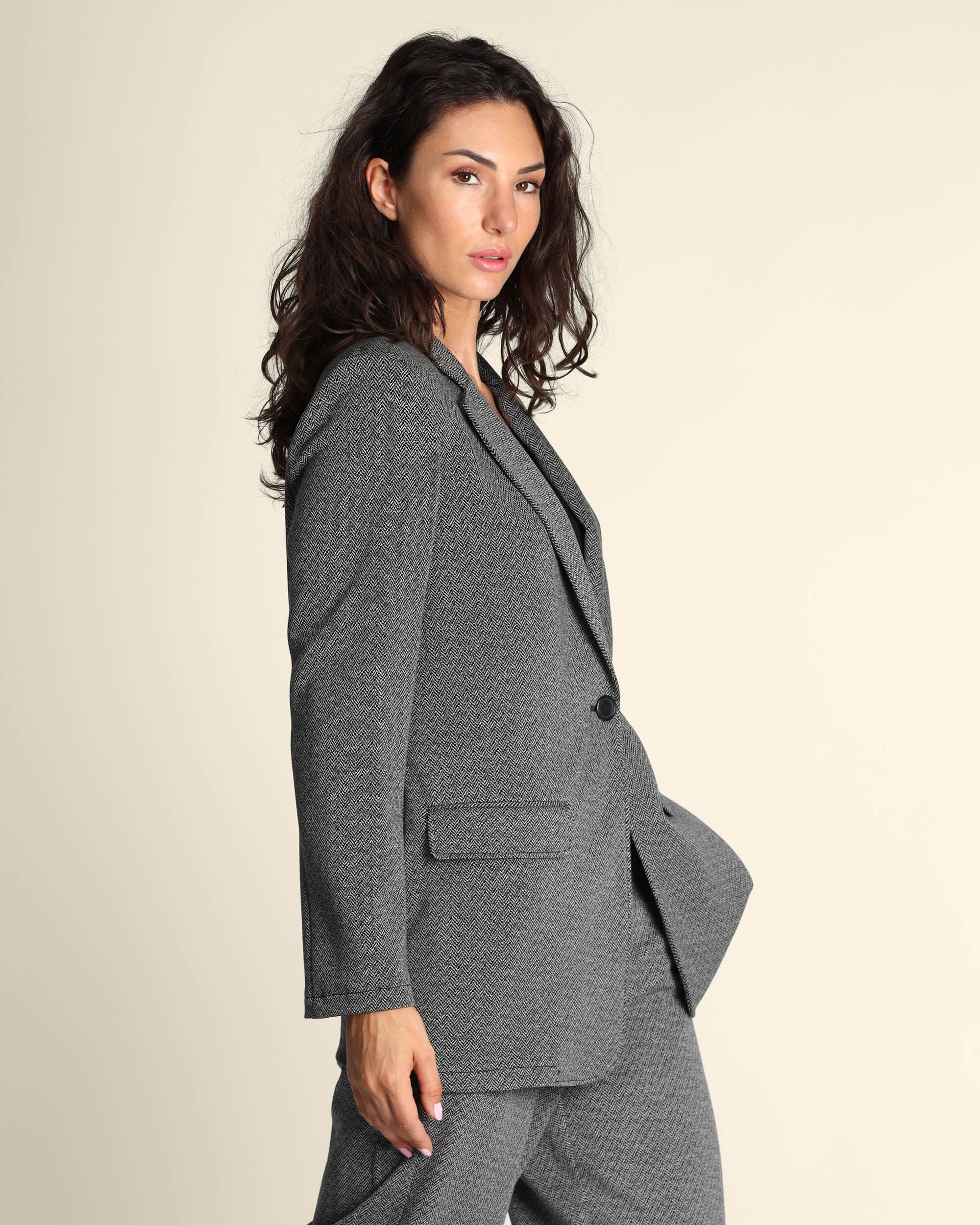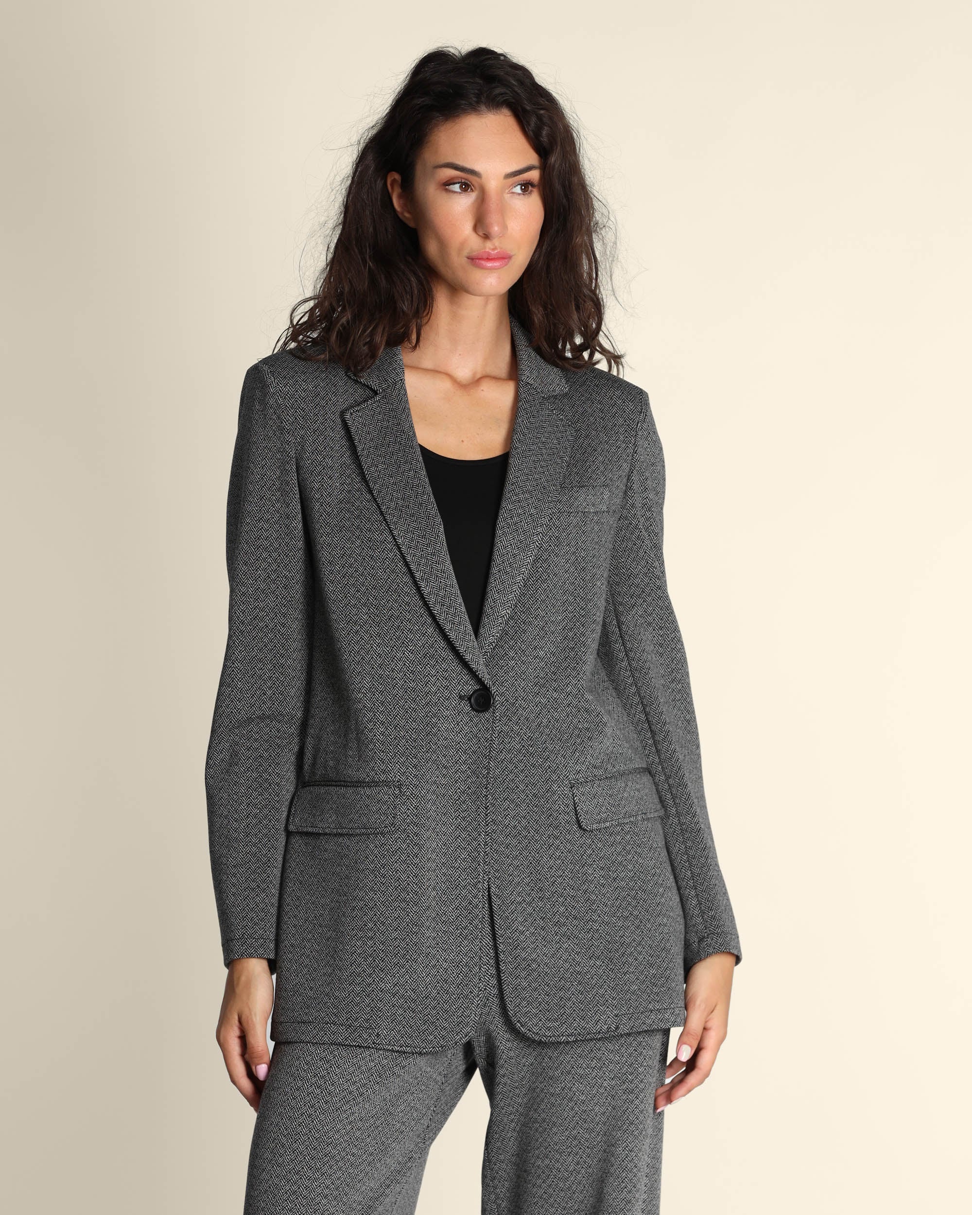 Giacca spinata nera in punto Milano, collo a rever, maniche lunghe, chiusura con bottone, linea dritta, tasche con patta, sfoderata, la modella indossa una tg.42, la modella ha le seguenti misure: altezza 178, seno 86,vita 65, fianchi 93, collezione donna Pennyblack Autunno Inverno 2025