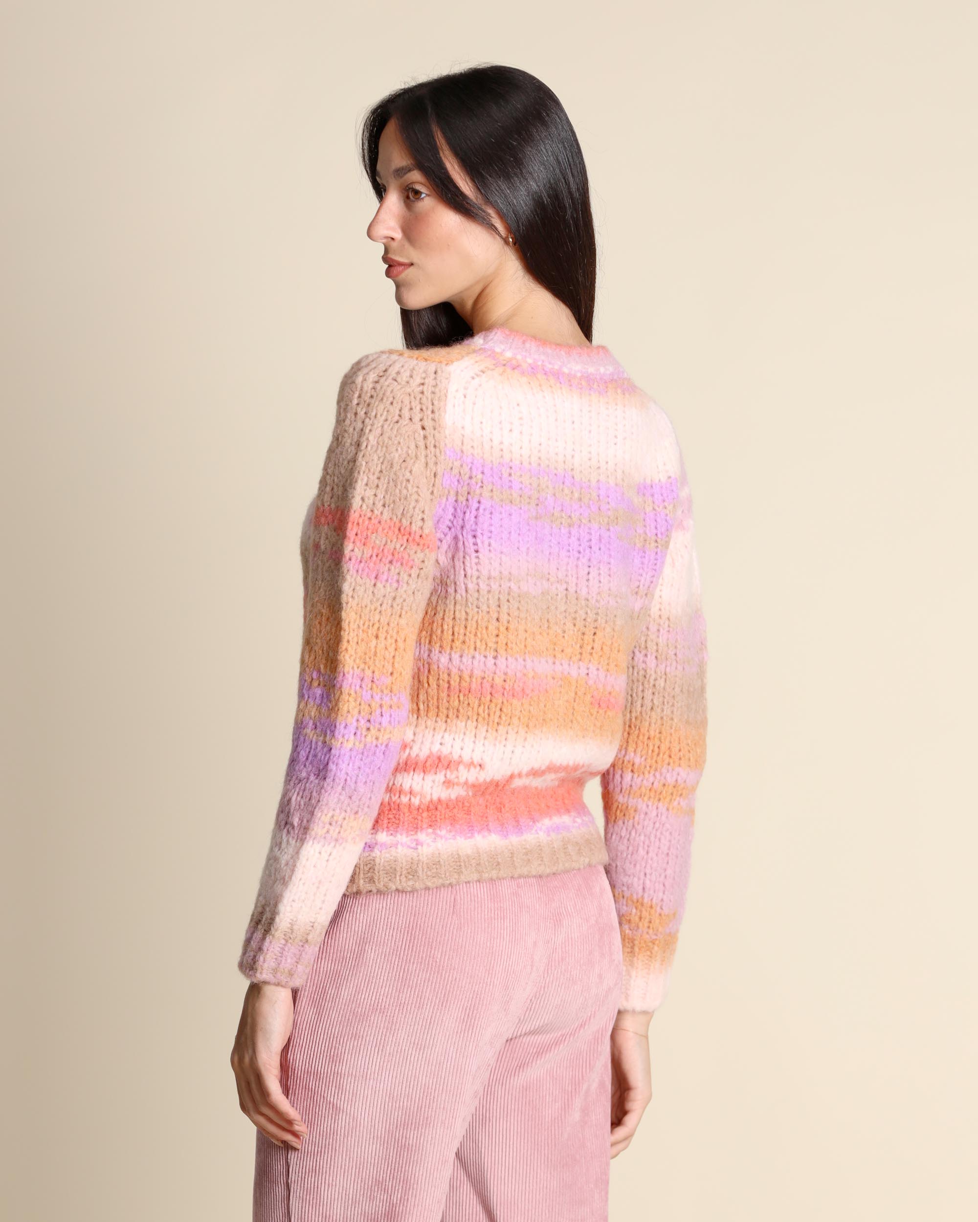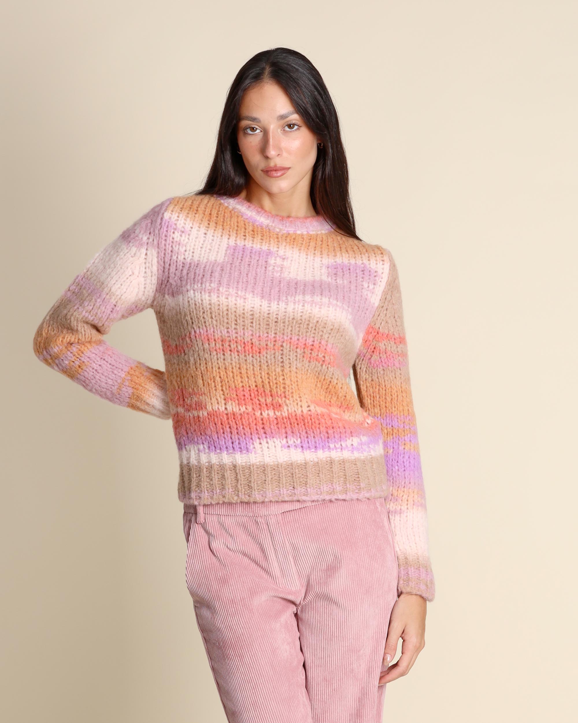 Maglia multicolor rosa e arancio in misto lana e alpaca, scollo tondo, maniche lunghe, linea dritta, la modella indossa una tg.S, la modella ha le seguenti misure: altezza 173, seno 84, vita 63, fianchi 94, collezione donna Emme by Marella Autunno Inverno 2025/26