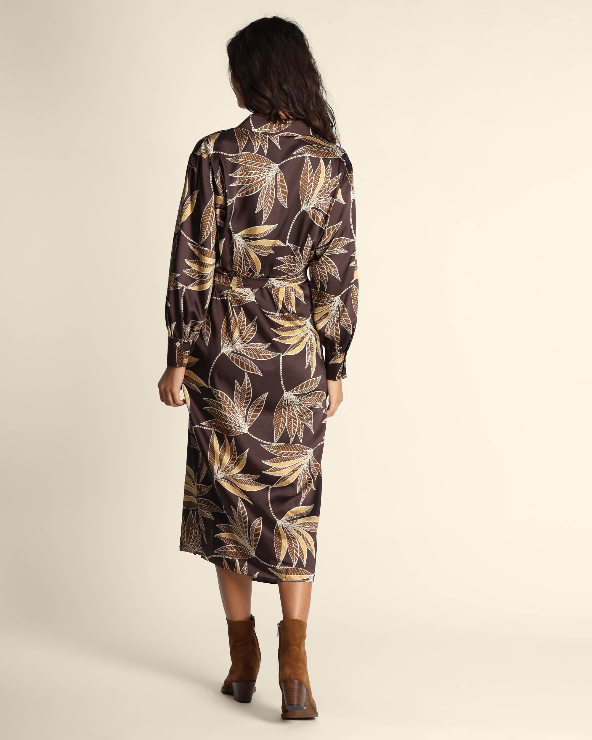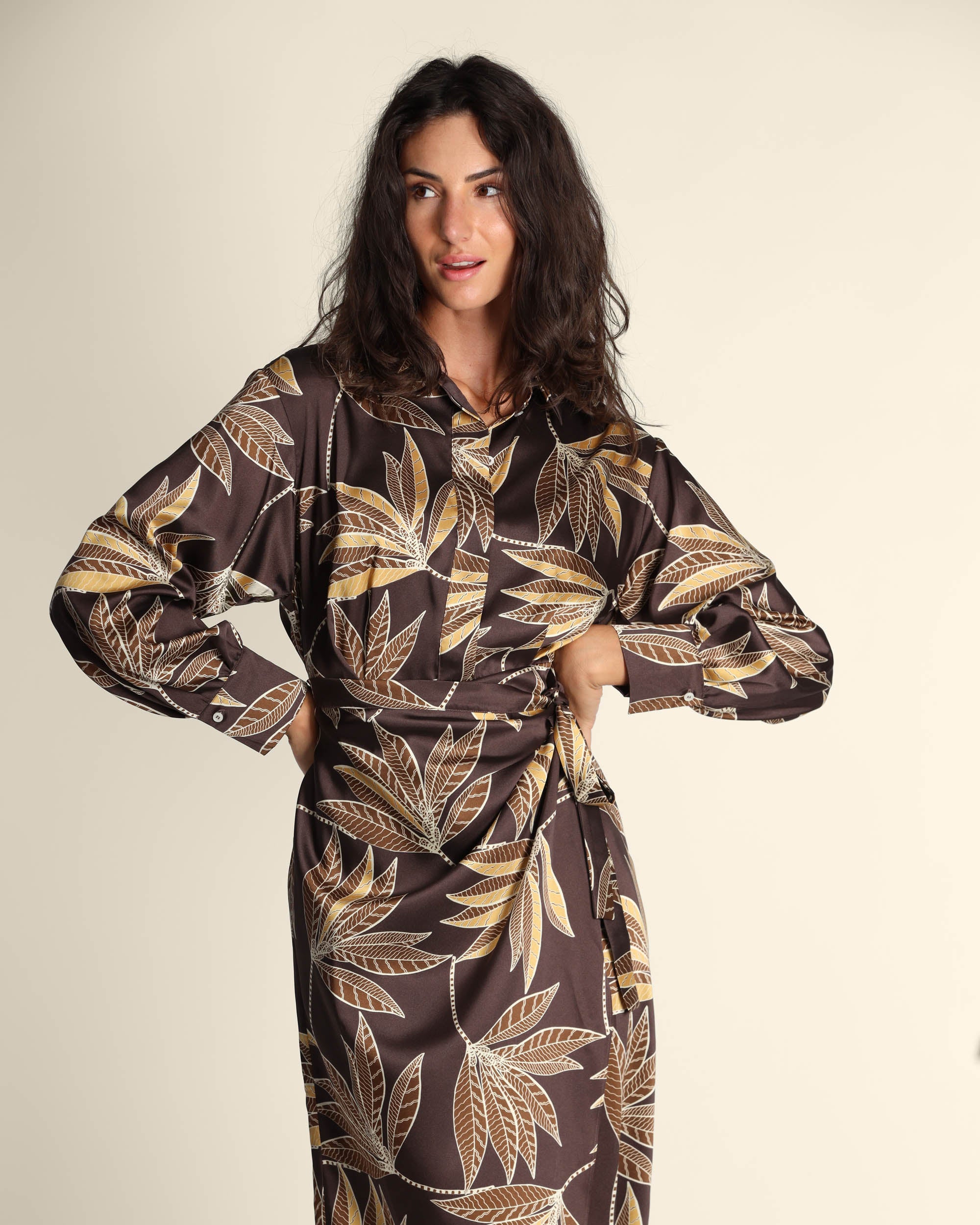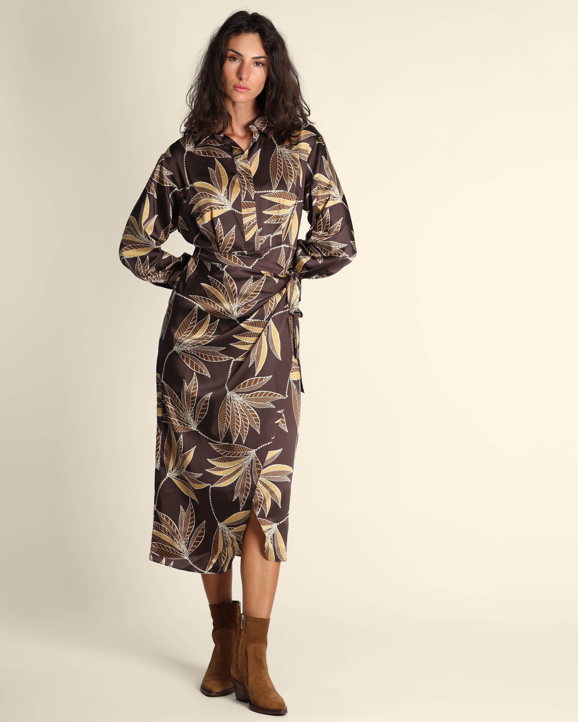 Abito a fantasia marrone e ocra in twill, collo a camicia, maniche lunghe, chiusura parziale con bottoni, cintura coordinata, linea dritta a portafoglio, sfoderato, la modella indossa una tg.42, la modella ha le seguenti misure: altezza 178, seno 86,vita 65, fianchi 93, collezione donna Emme by Marella Autunno Inverno 2025/26