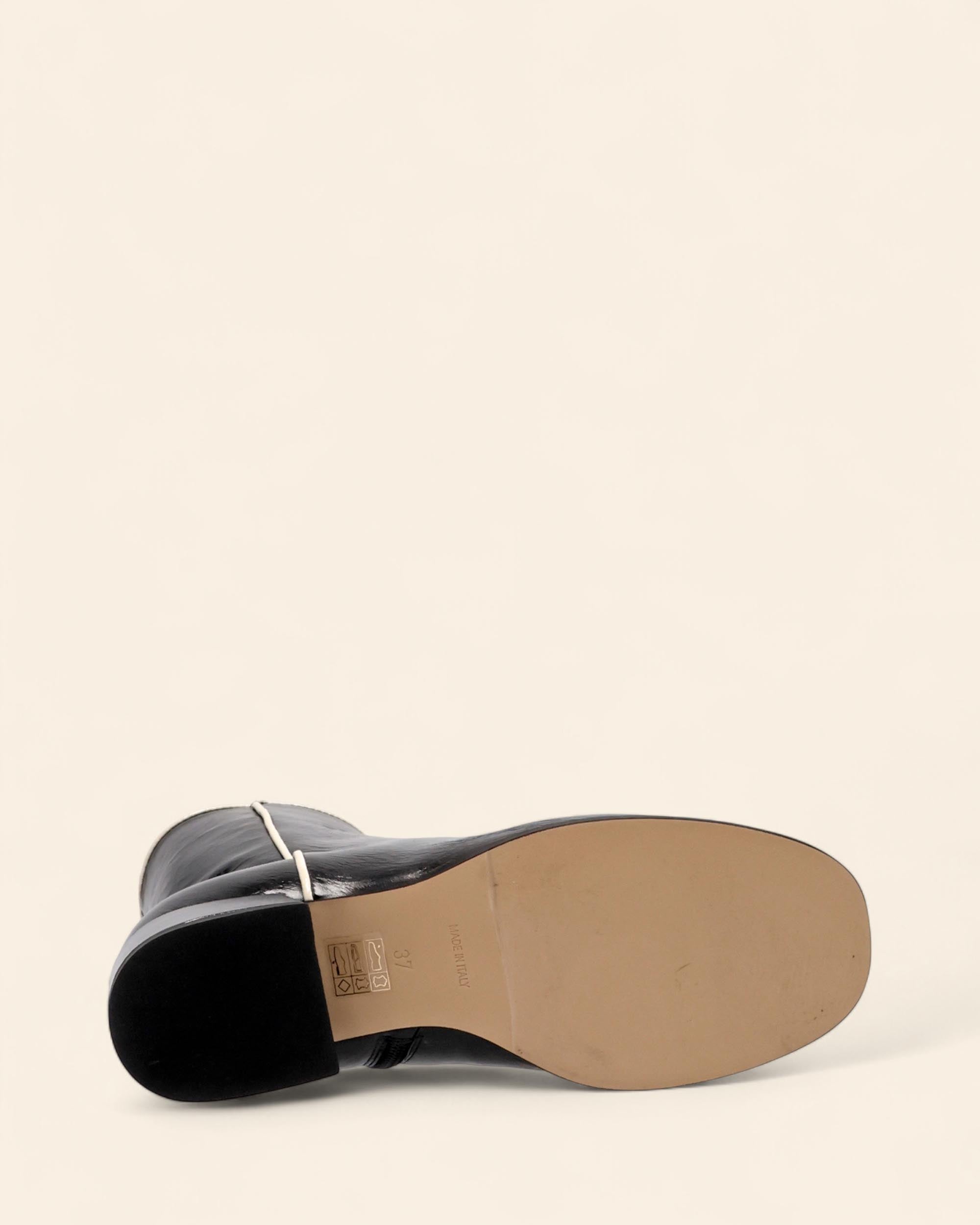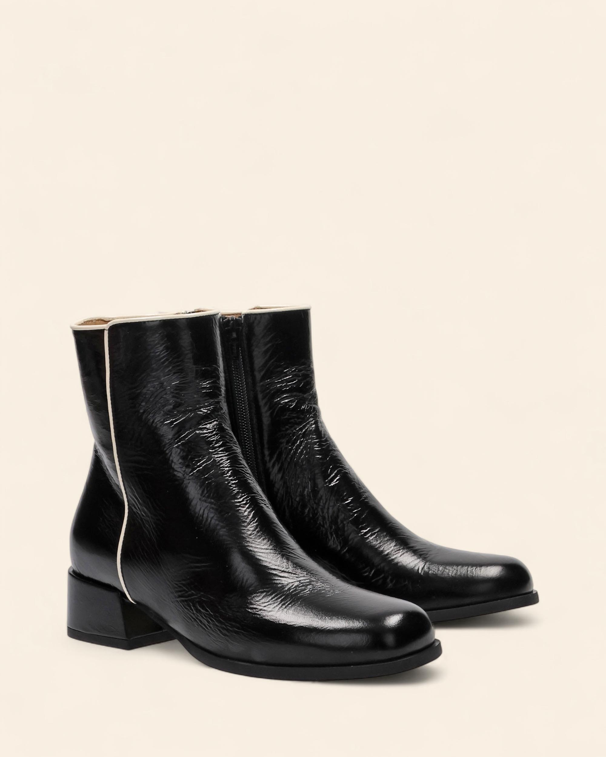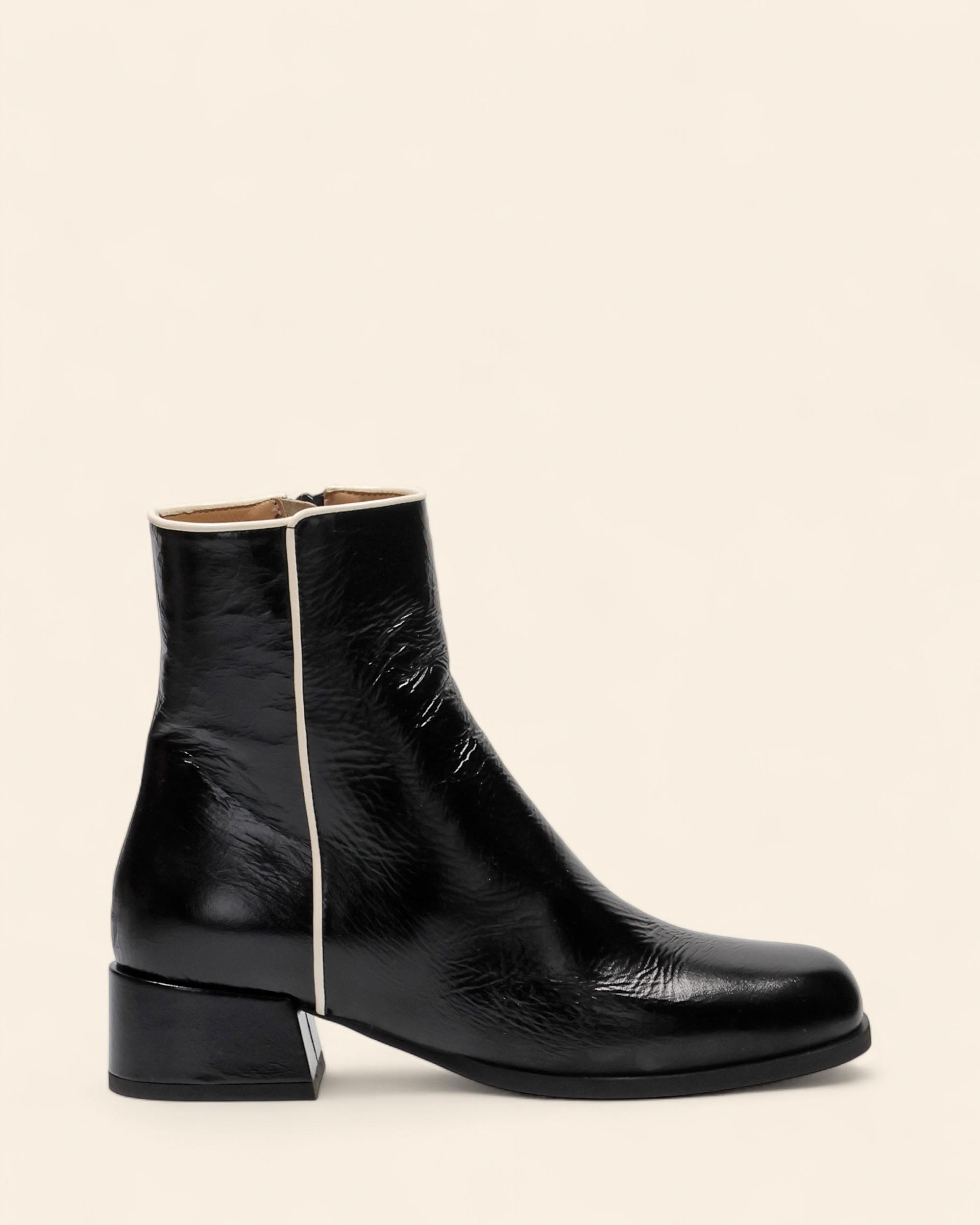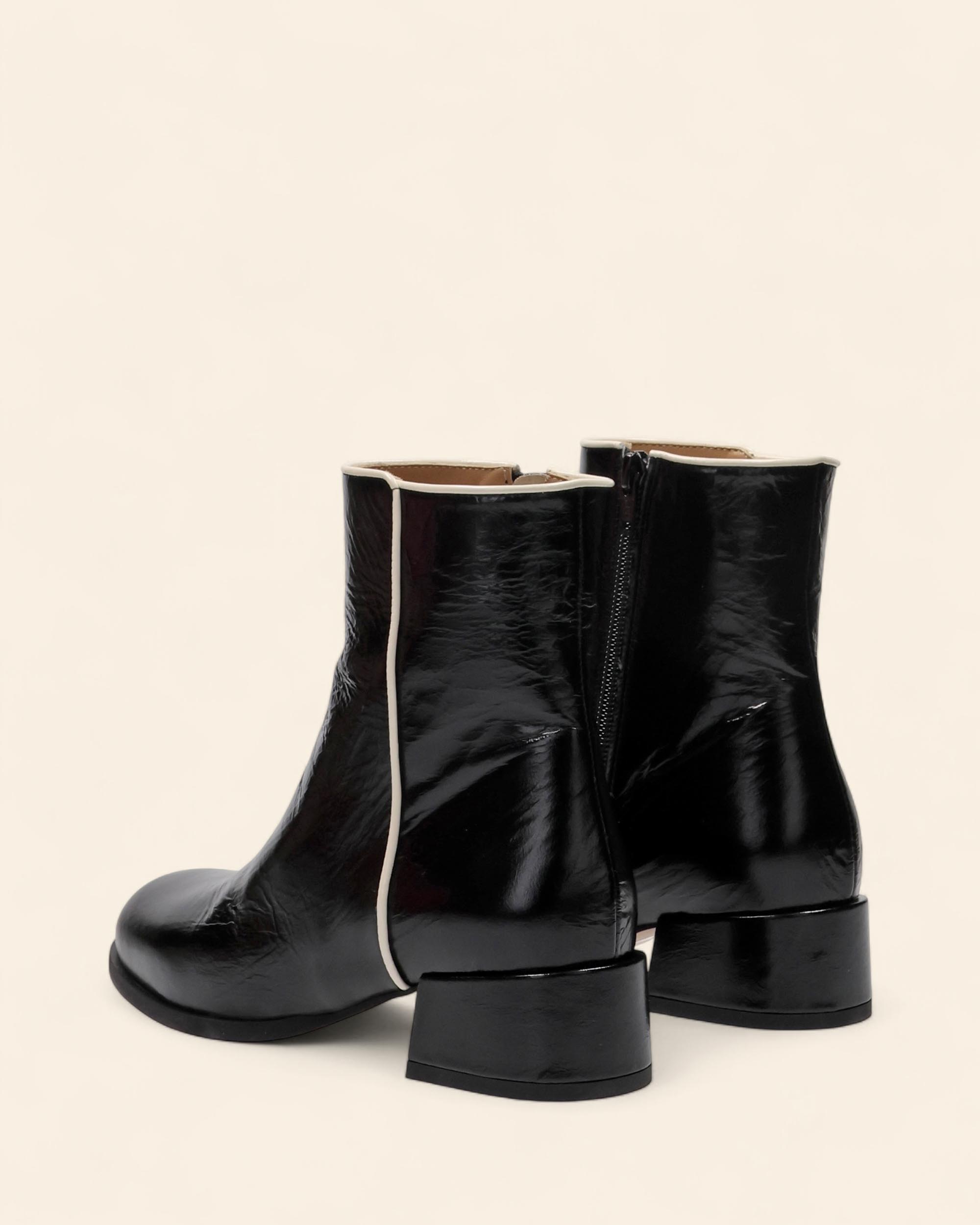 Stivaletti in naplak nero, fodera in pelle, sottopiede in pelle, punta tonda, tacco 40mm, chiusura con zip interna, profili a contrasto color panna, made in Italy, collezione Autunno inverno Hope 2025/2026