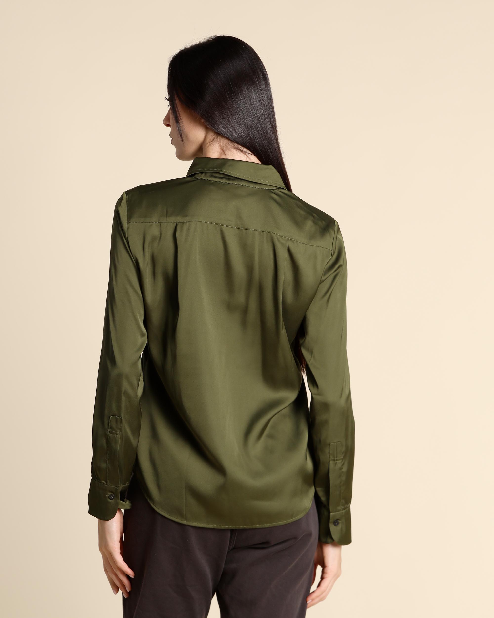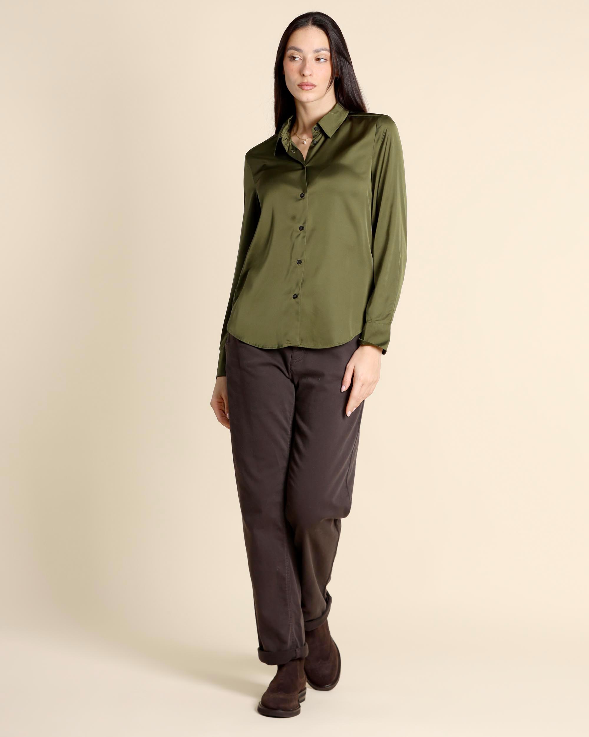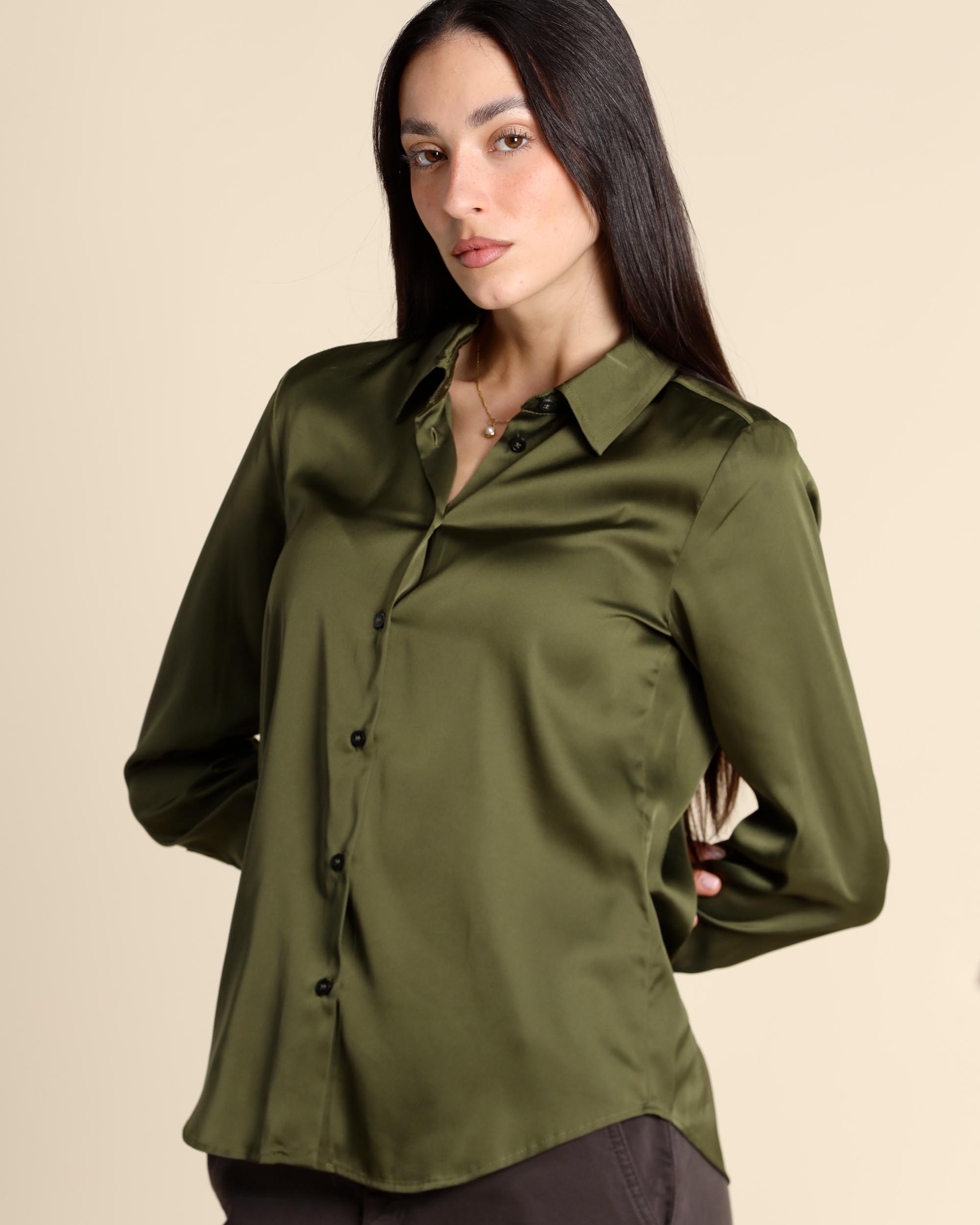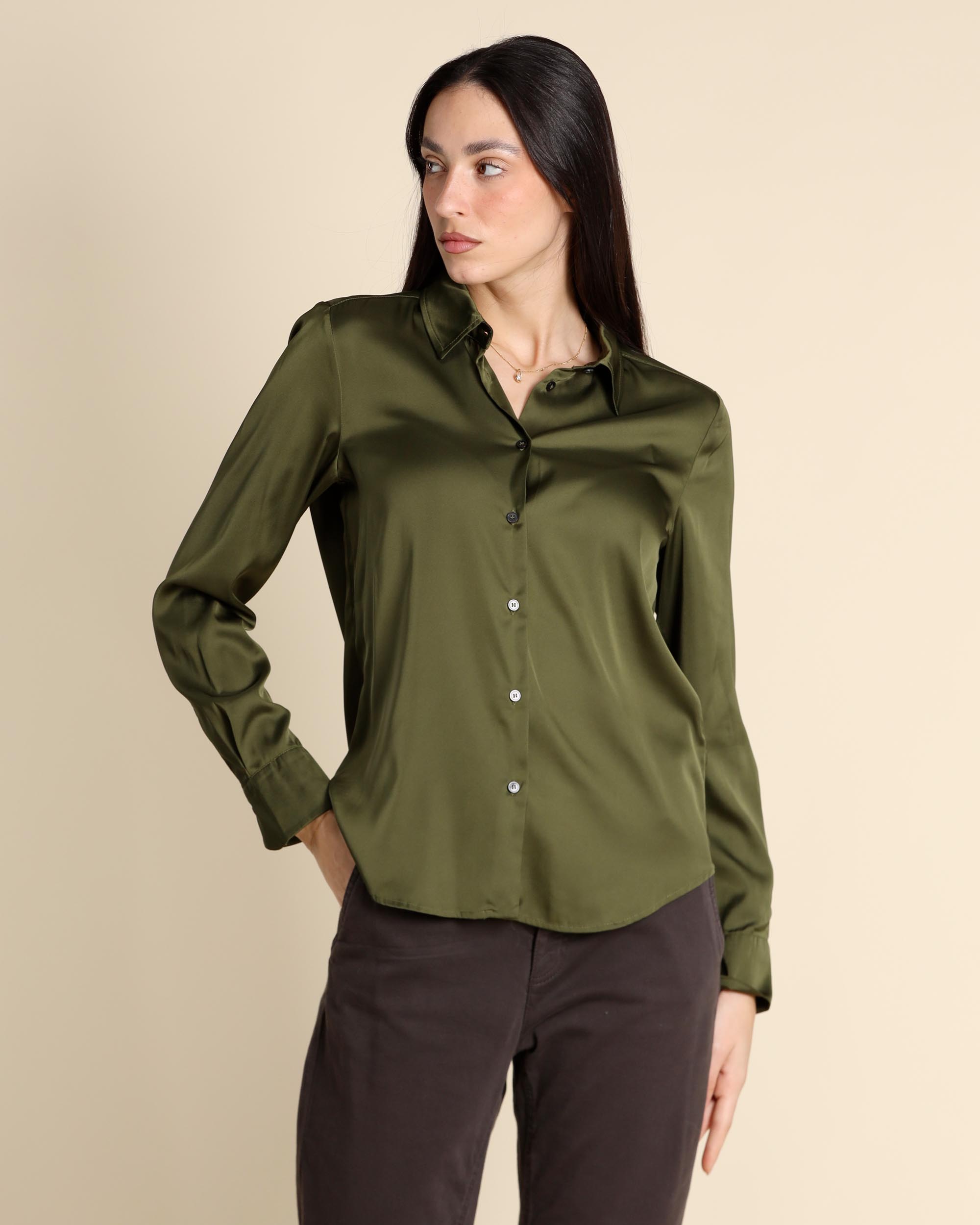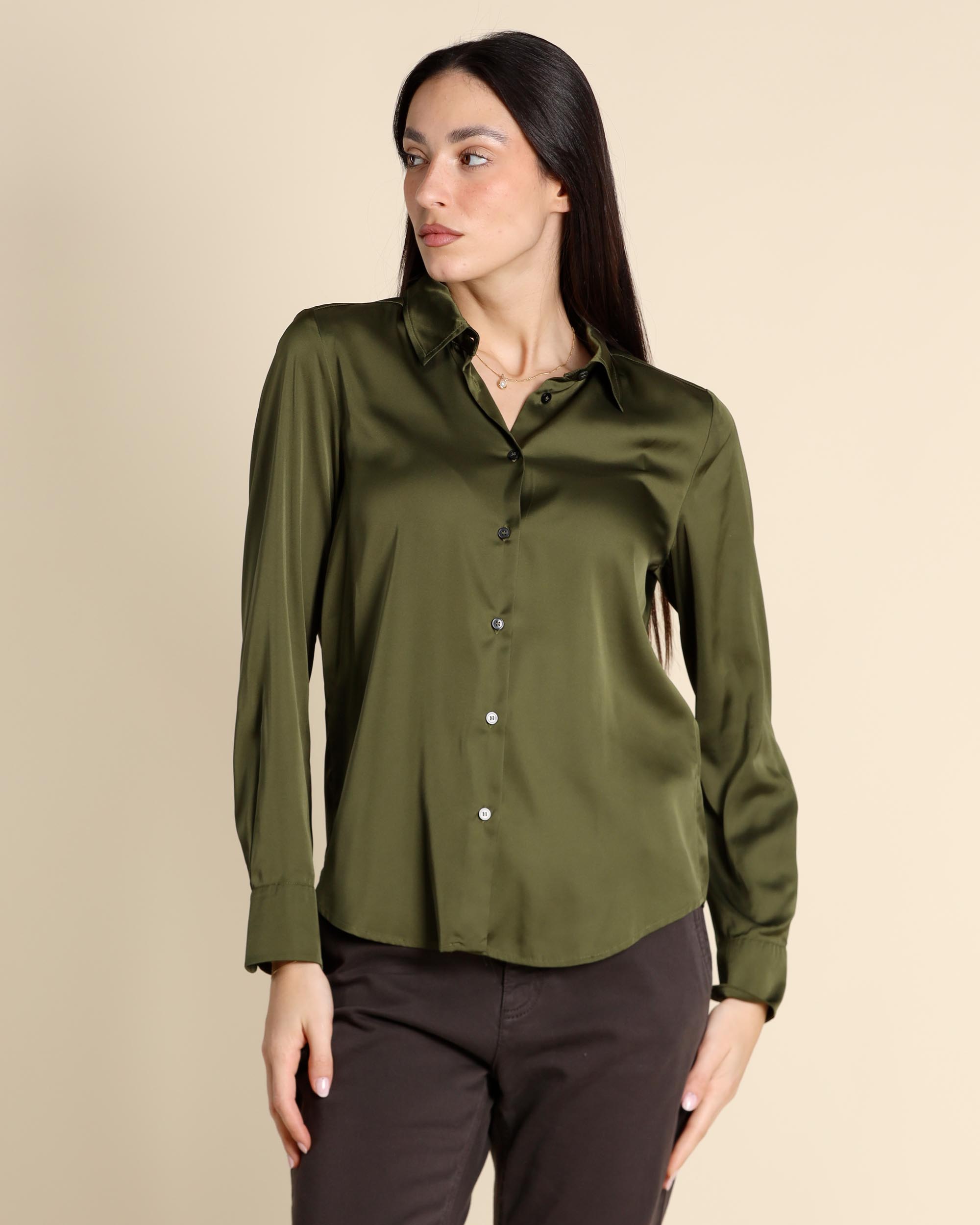 Camicia verde in raso stretch, collo a camicia, maniche lunghe con polsino, chiusura con bottoni, linea semiaderente, la modella indossa una tg.42, la modella ha le seguenti misure: altezza 175, seno 86,vita 65, fianchi 93, collezione donna Emme by Marella Autunno Inverno 2025/26