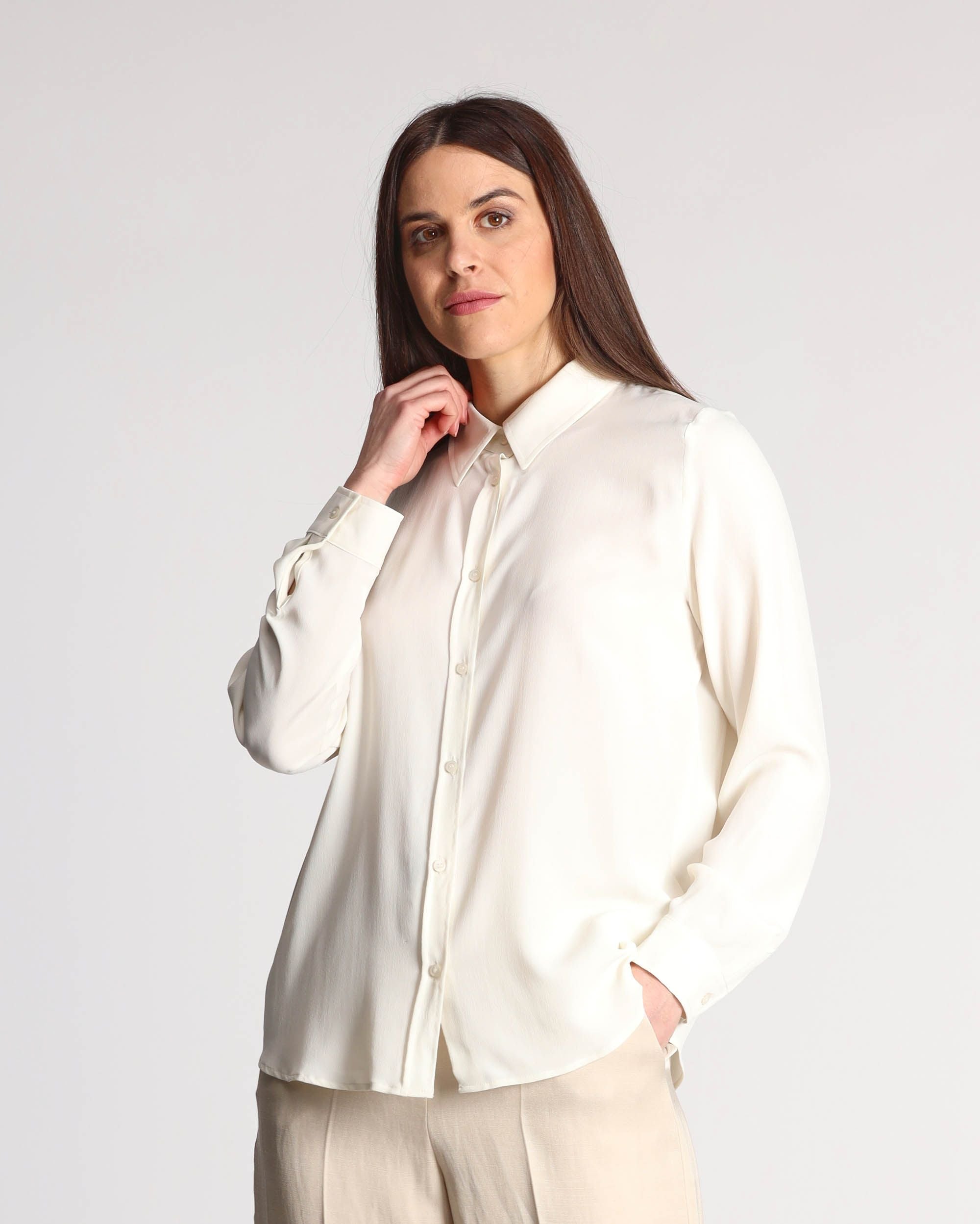 Camicia in crepe di misto seta color burro, collo a camicia, maniche lunghe con polsino, chiusura con bottoni, linea dritta, la modella indossa una tg.42, la modella ha le seguenti misure: altezza 178, seno 86,vita 65, fianchi 93, collezione donna Emme by Marella Primavera Estate 2025
