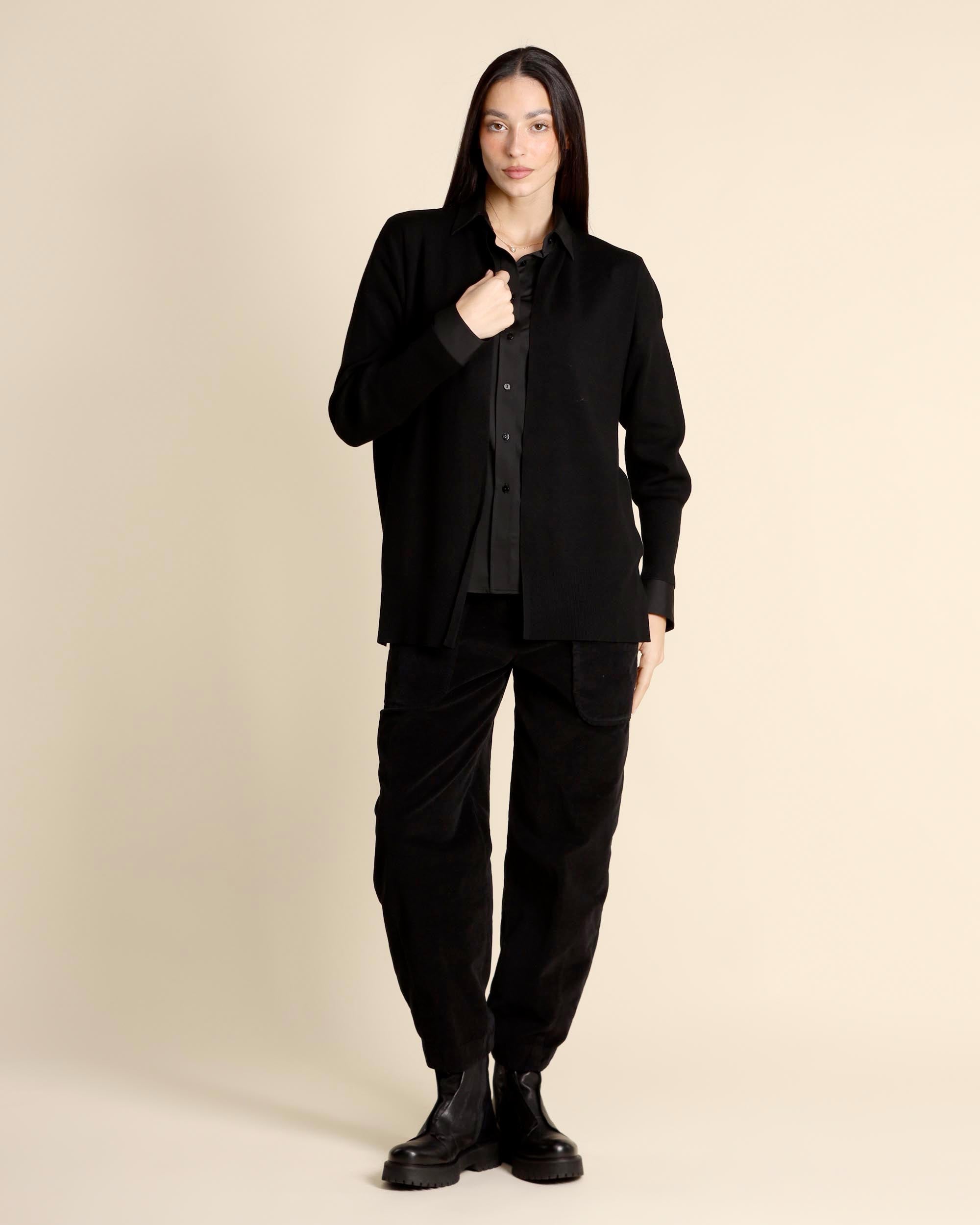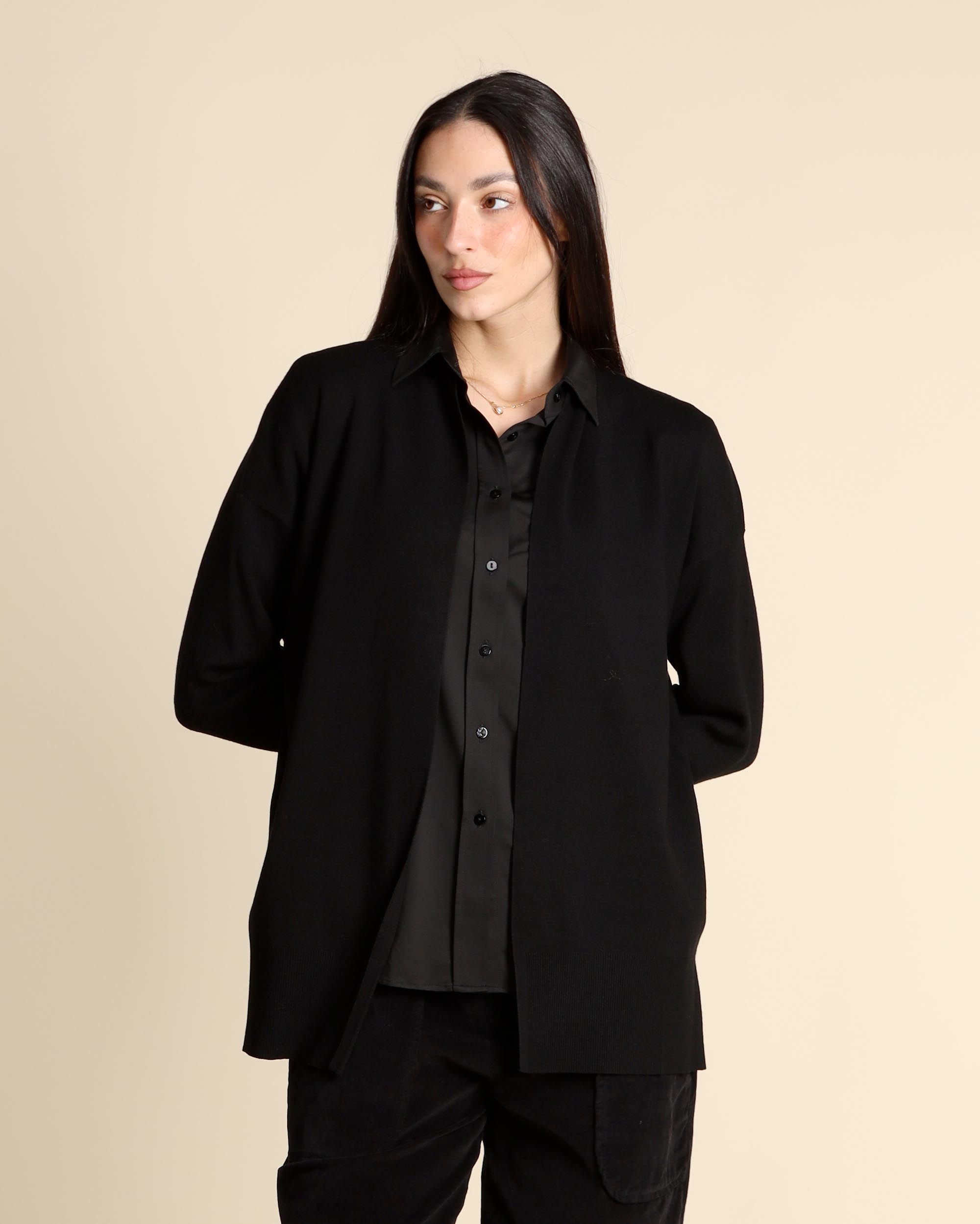 Cardigan nero in misto viscosa, maniche lunghe, giro sceso, linea ampia, la modella indossa una tg.S, la modella ha le seguenti misure: altezza 173, seno 84, vita 63, fianchi 94, collezione donna Emme by Marella Autunno Inverno 2025/26