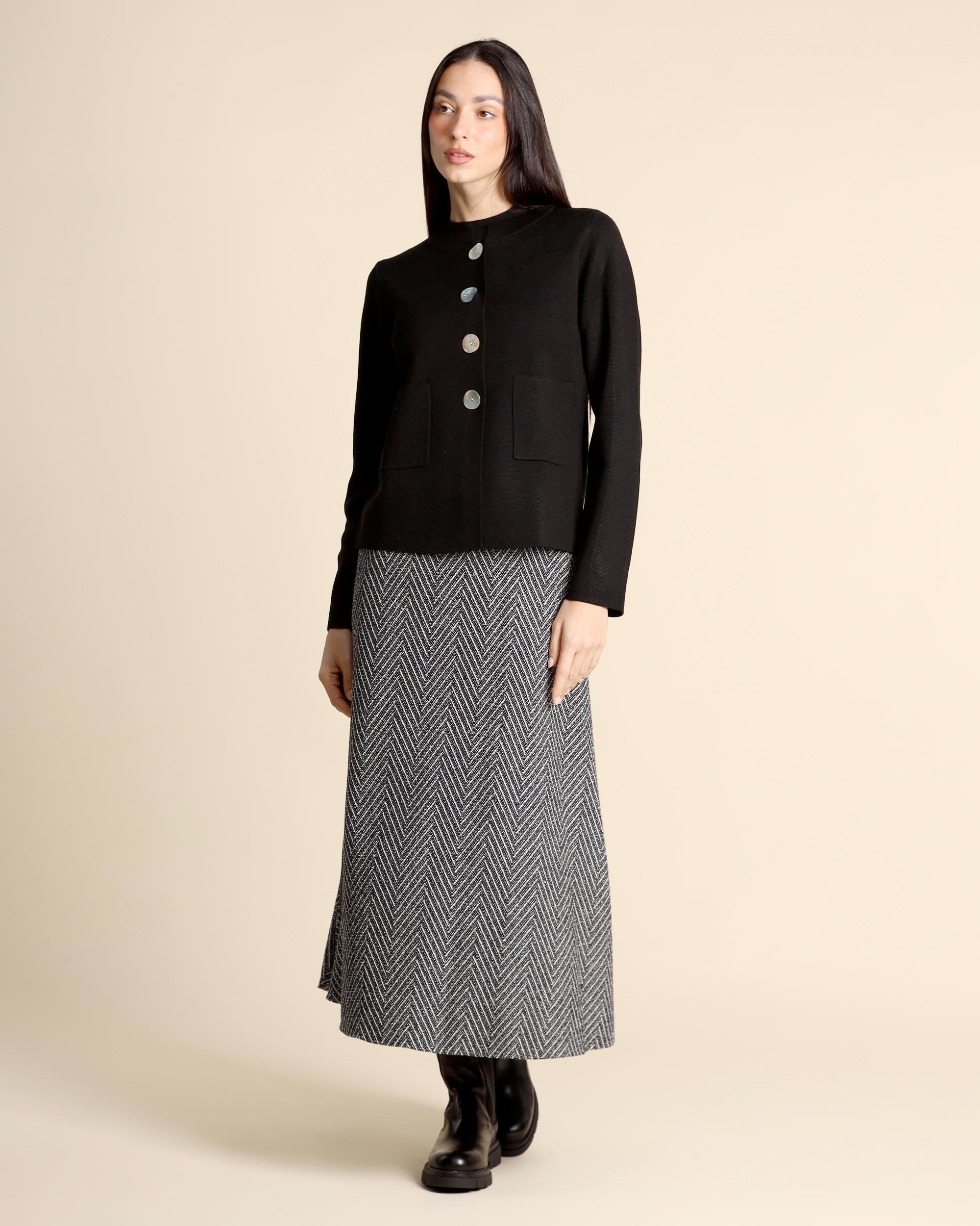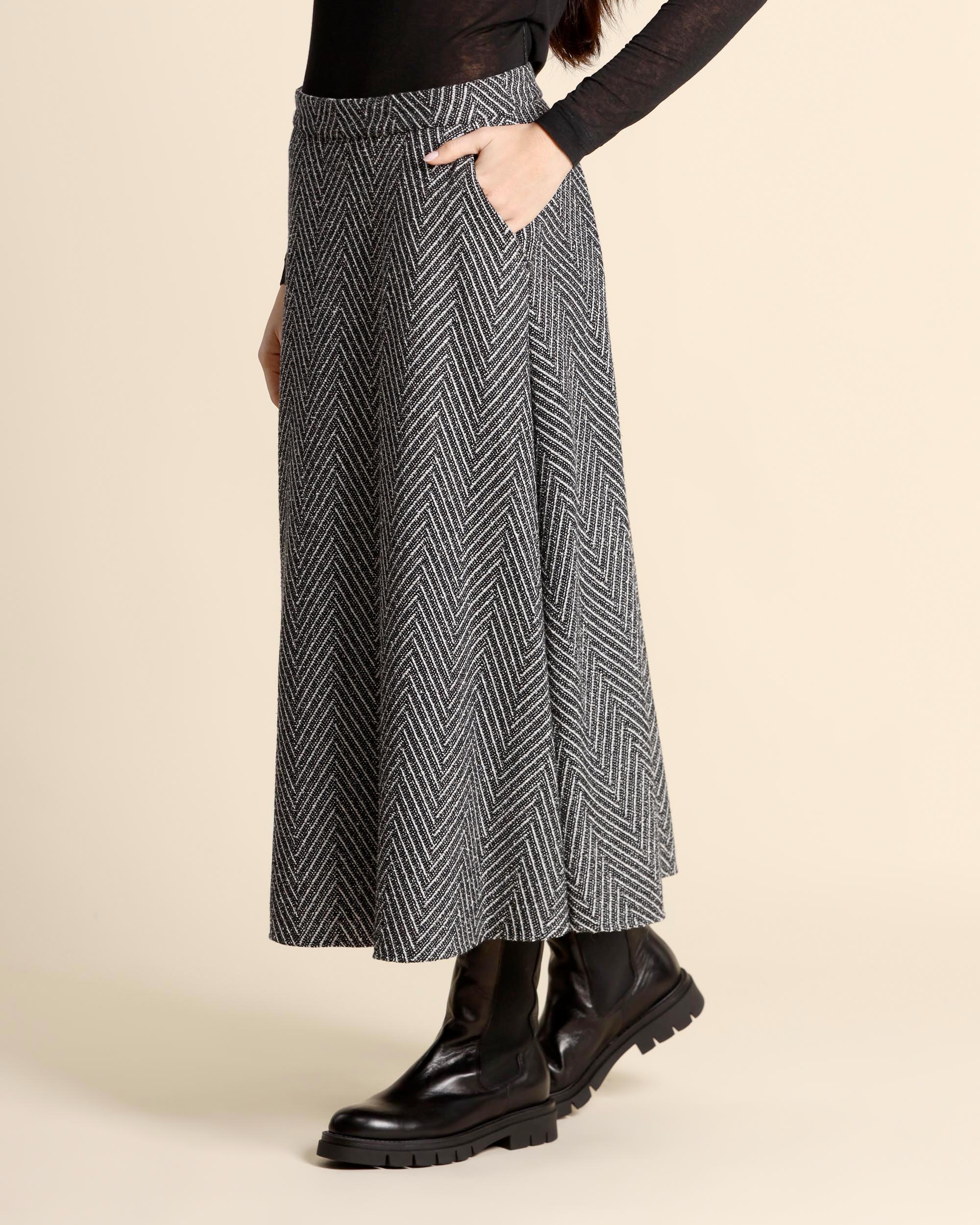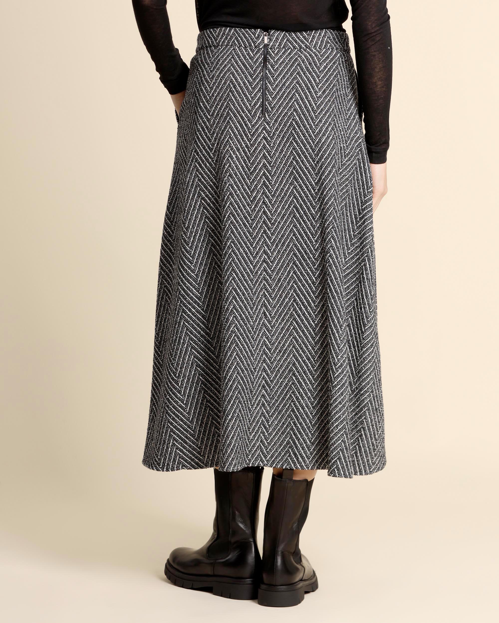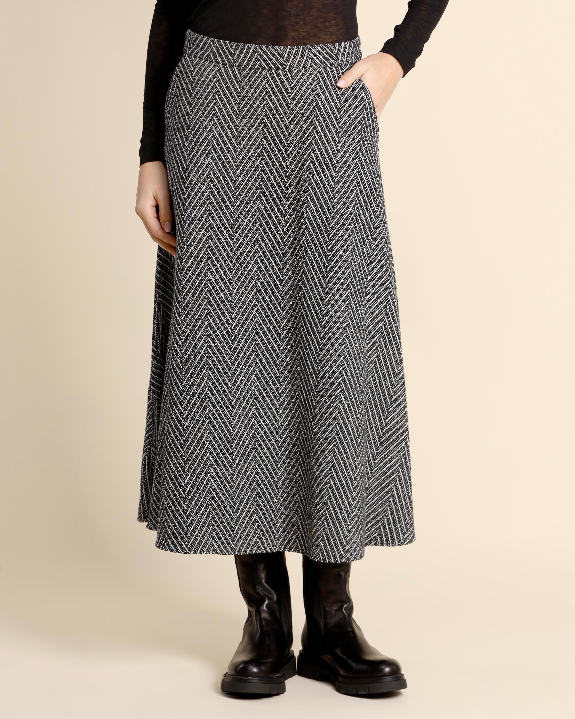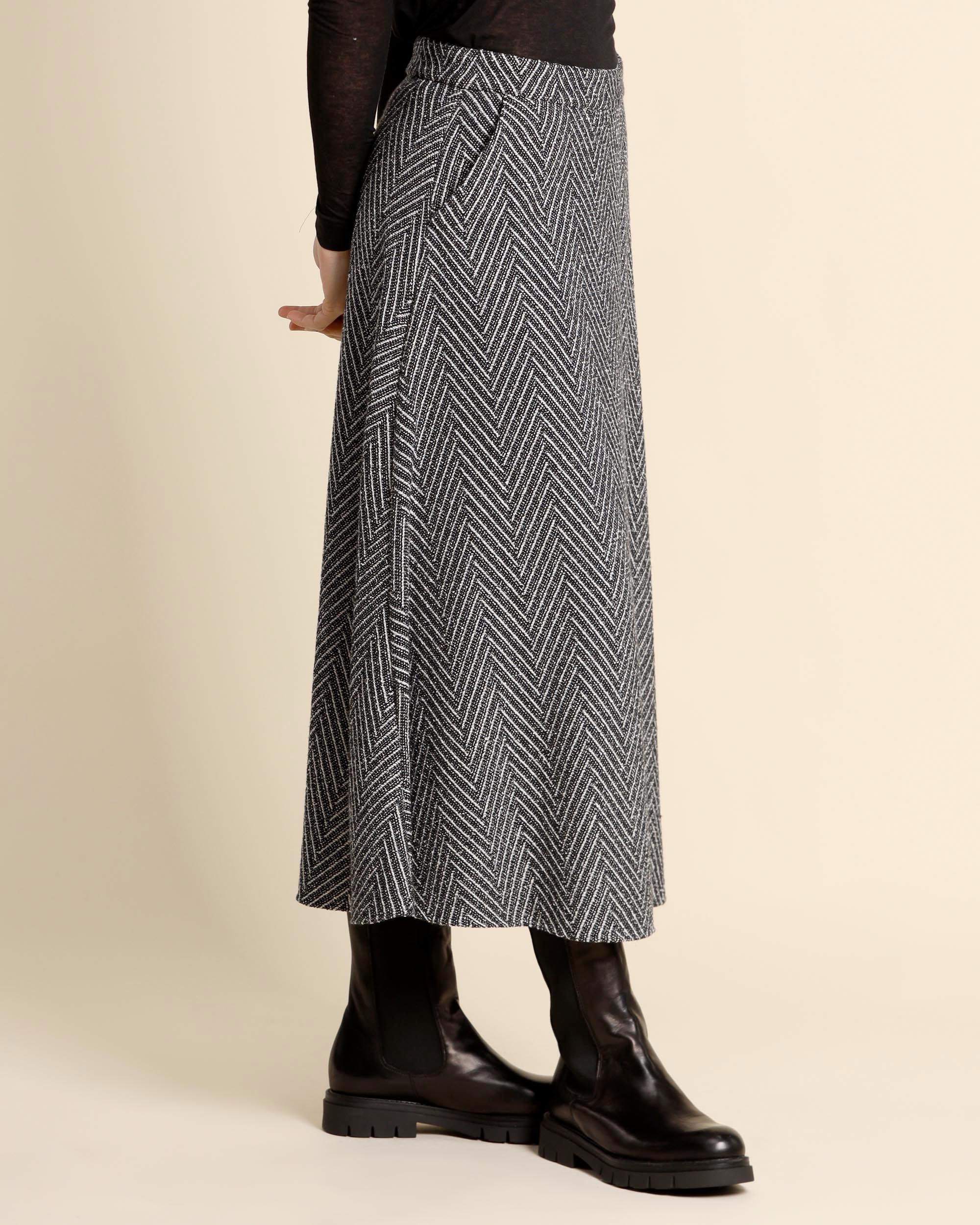 Gonna lunga nera in stuoia in misto cotone con disegno grafico, linea svasata, sfoderata, chiusura con zip sul dietro, tasche alla francese, la modella indossa una tg.40, la modella ha le seguenti misure: altezza 175, seno 86,vita 65, fianchi 93, collezione donna Pennyblack Autunno Inverno 2025/26