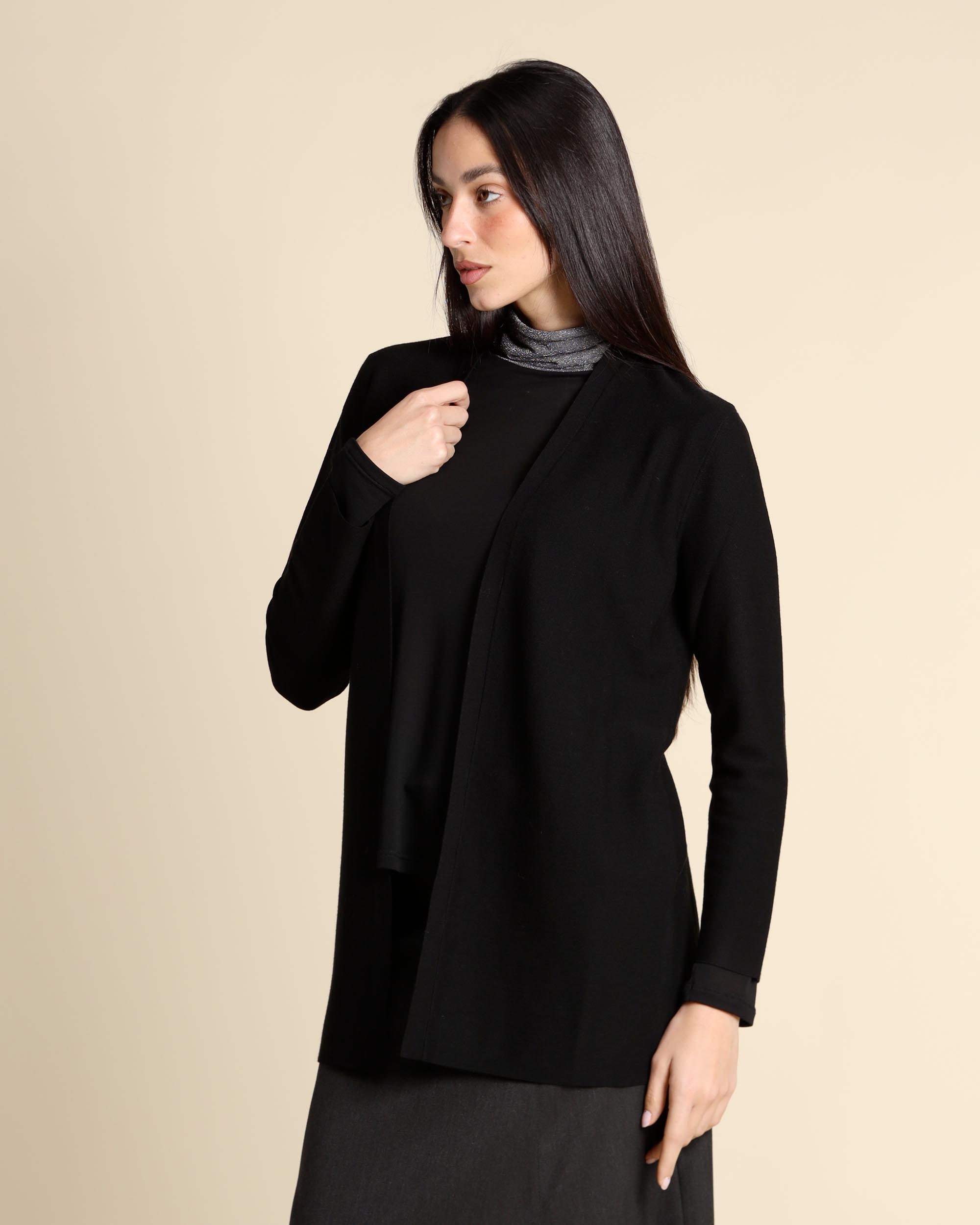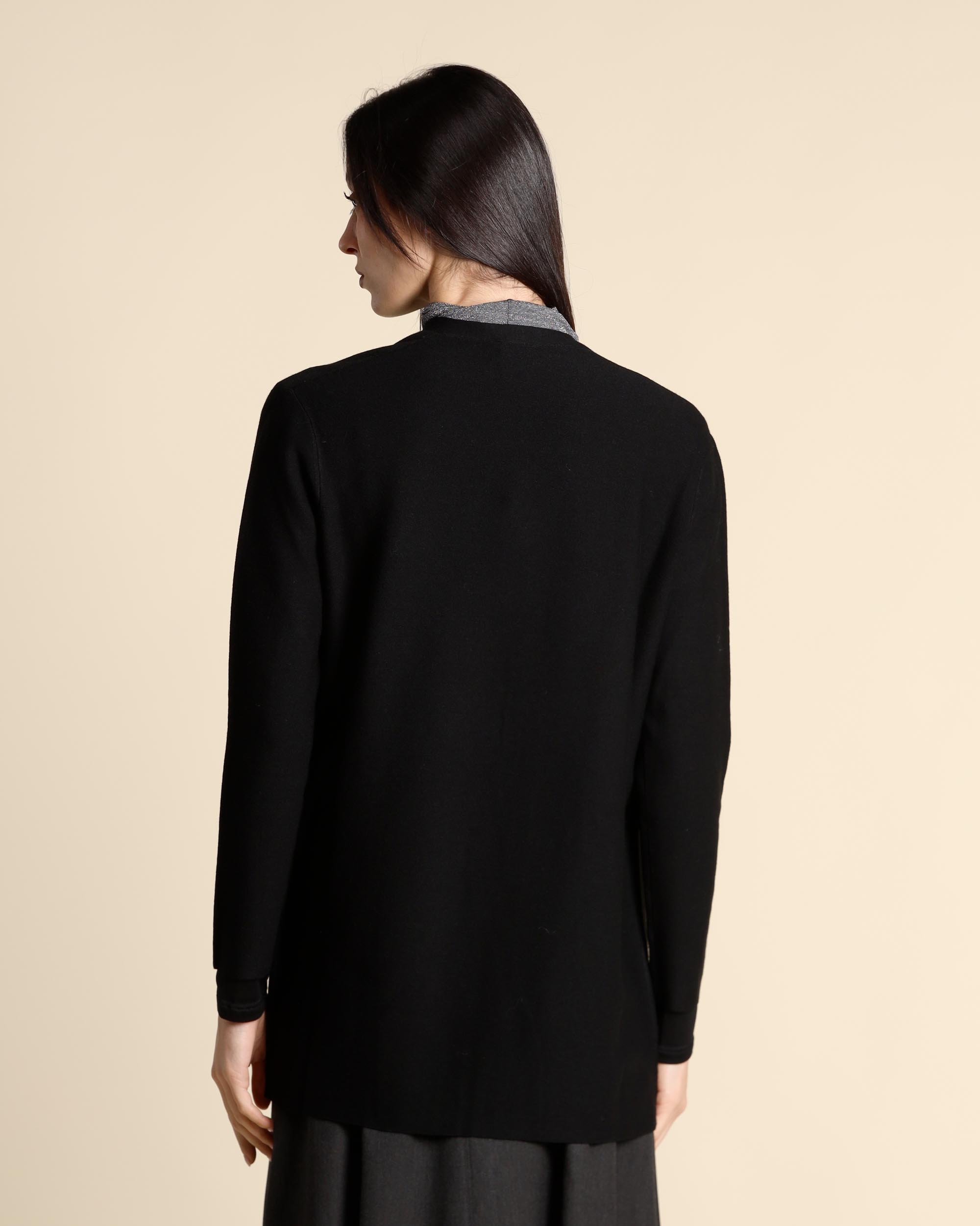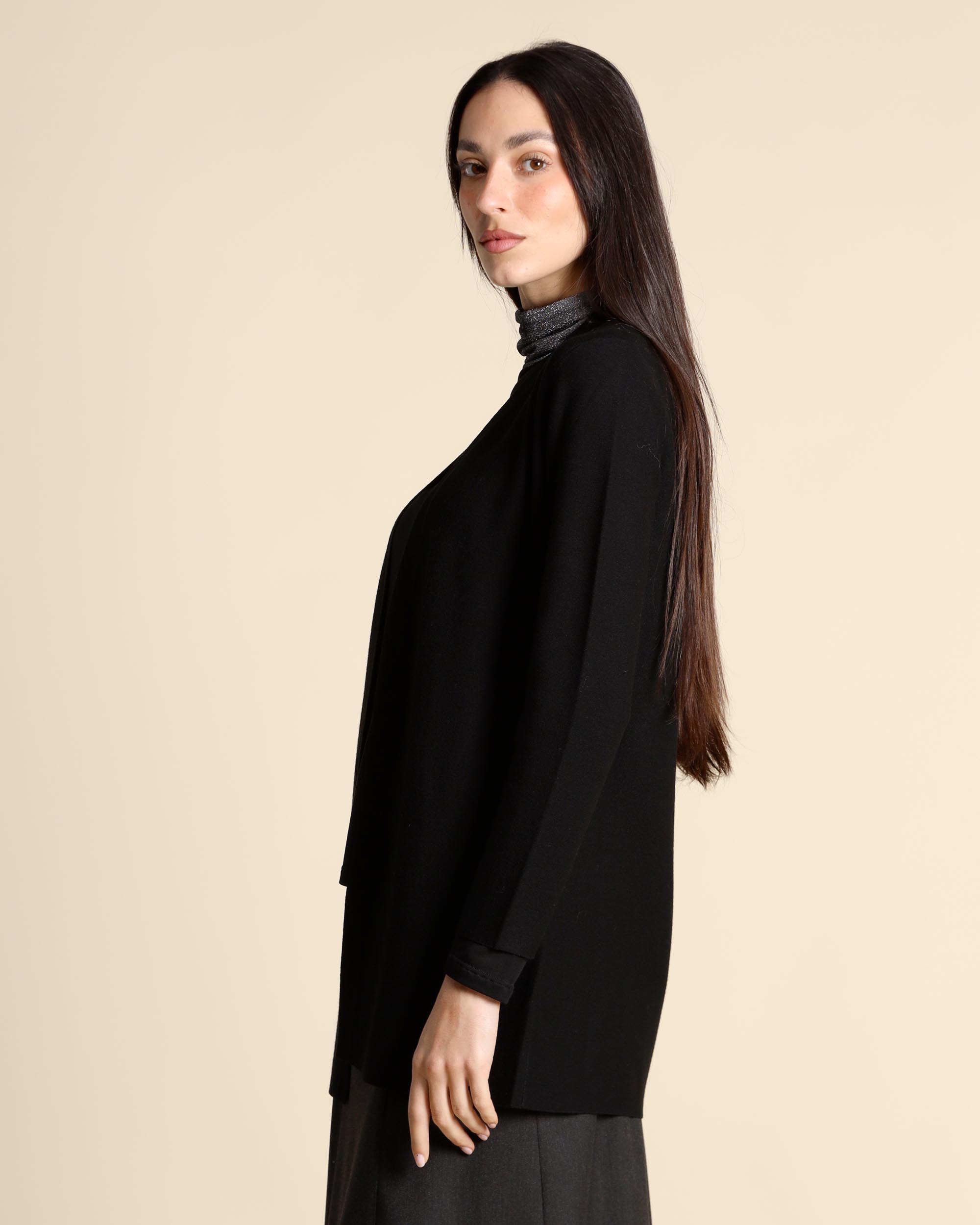 Cardigan nero rasato in misto viscosa, maniche lunghe, giro sceso, linea dritta morbida, senza bottoni, la modella indossa una tg.S, la modella ha le seguenti misure: altezza 173, seno 84, vita 63, fianchi 94, collezione donna Emme by Marella Autunno Inverno 2025/26
