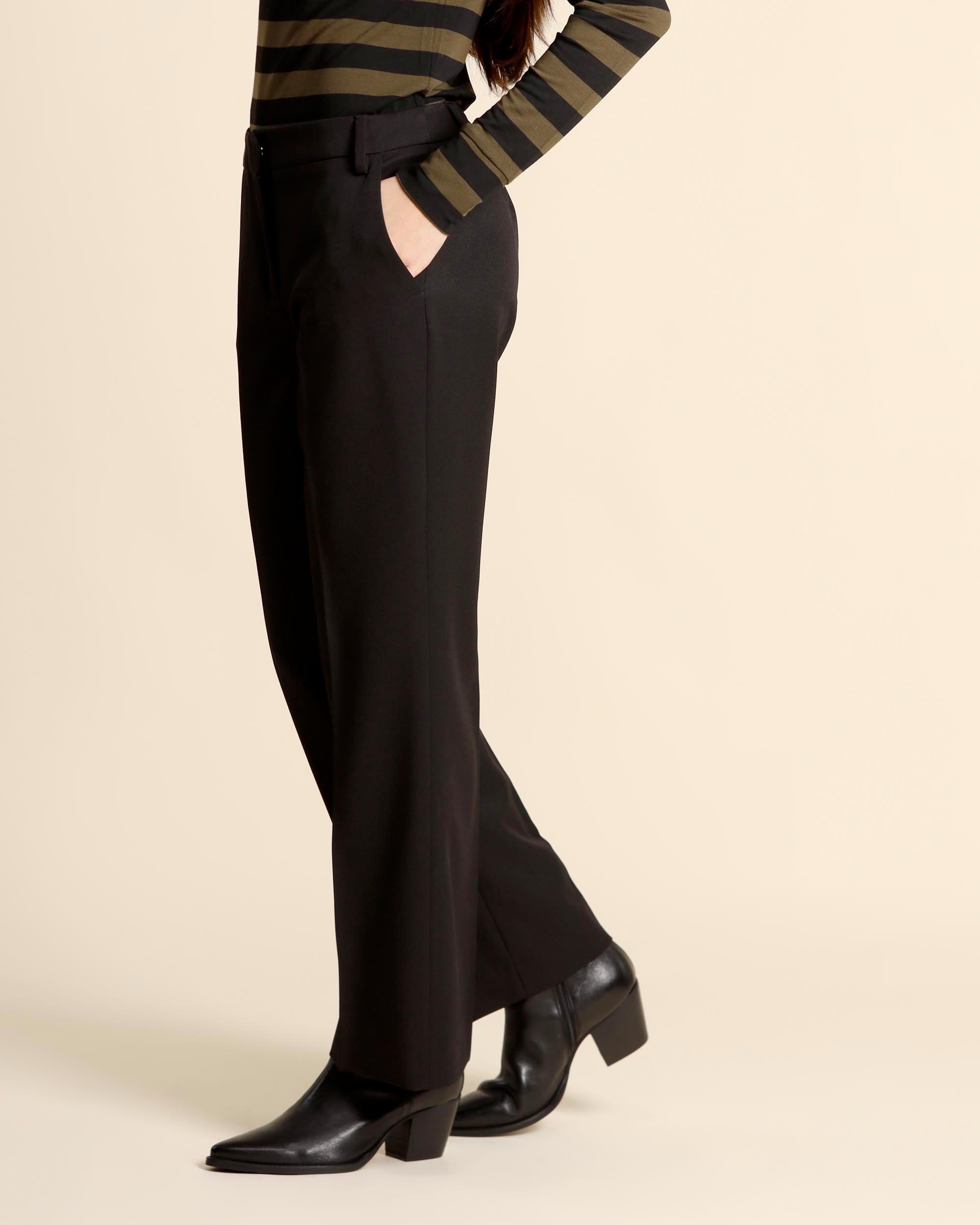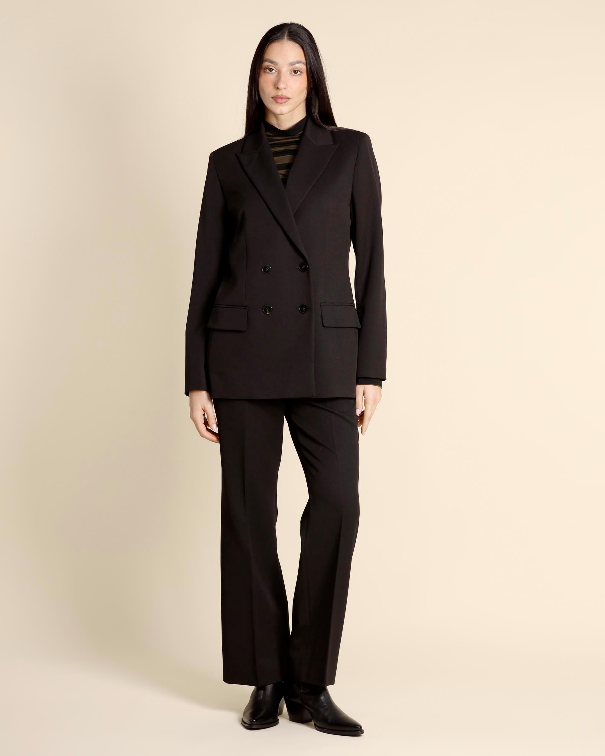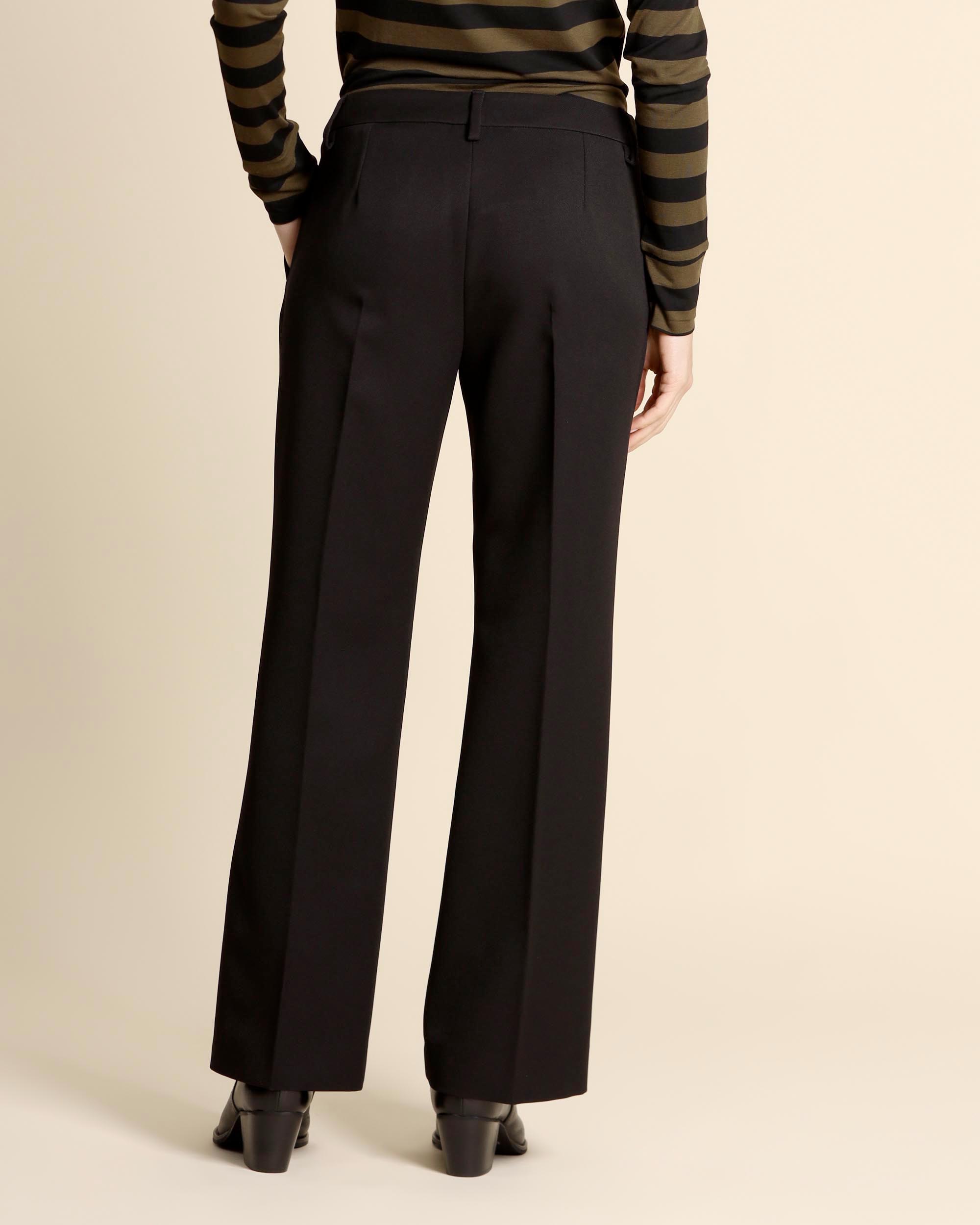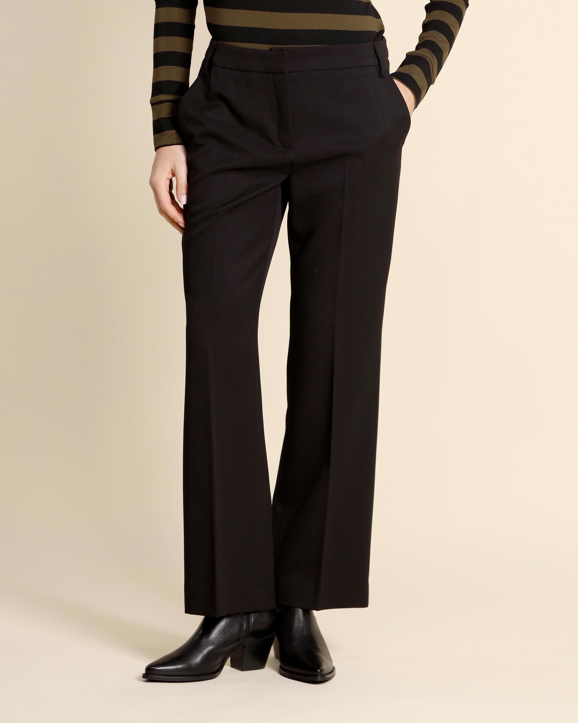 Pantaloni neri in diagonale tecnico stretch, chiusura con bottone automatico e zip nascosta, tasche alla francese, linea semiaderente flare al fondo, piega stirata, la modella indossa una tg.42, la modella ha le seguenti misure: altezza 173, seno 86,vita 65, fianchi 93, collezione donna Emme by Marella Autunno Inverno 2025/26