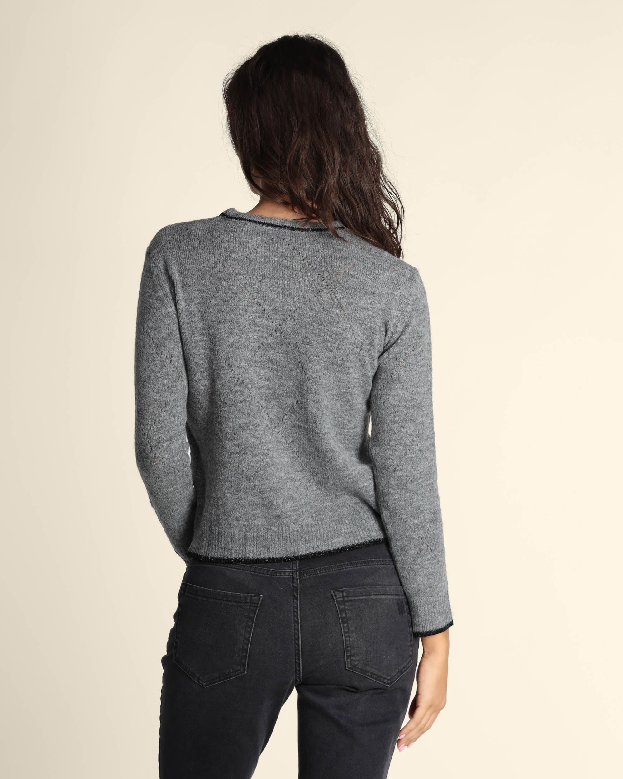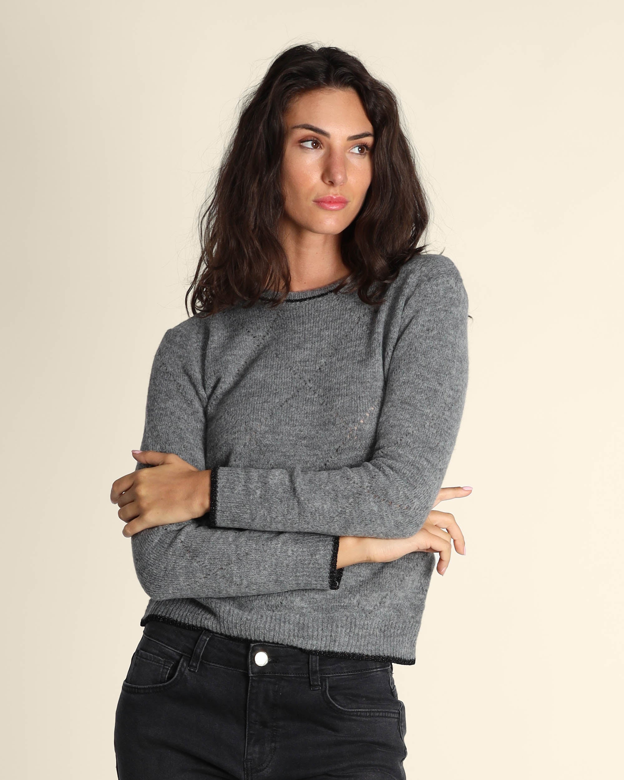 Maglia grigio scuro con lavorazione a rombi sul davanti, scollo tondo, maniche lunghe, linea semiaderente, dettagli in lurex, made in Italy, Elisa indossa una tg.S, Elisa ha le seguenti misure: altezza 179, seno 84, vita 63, fianchi 94, collezione donna Emme by Marella Autunno Inverno 2025/26