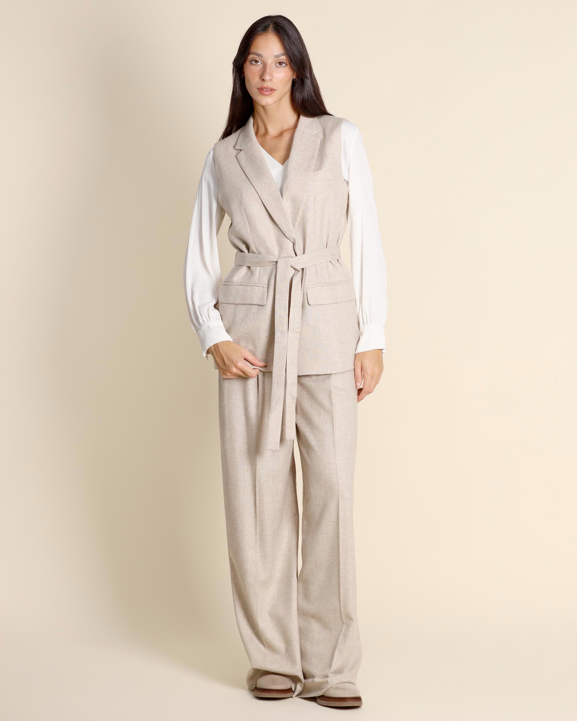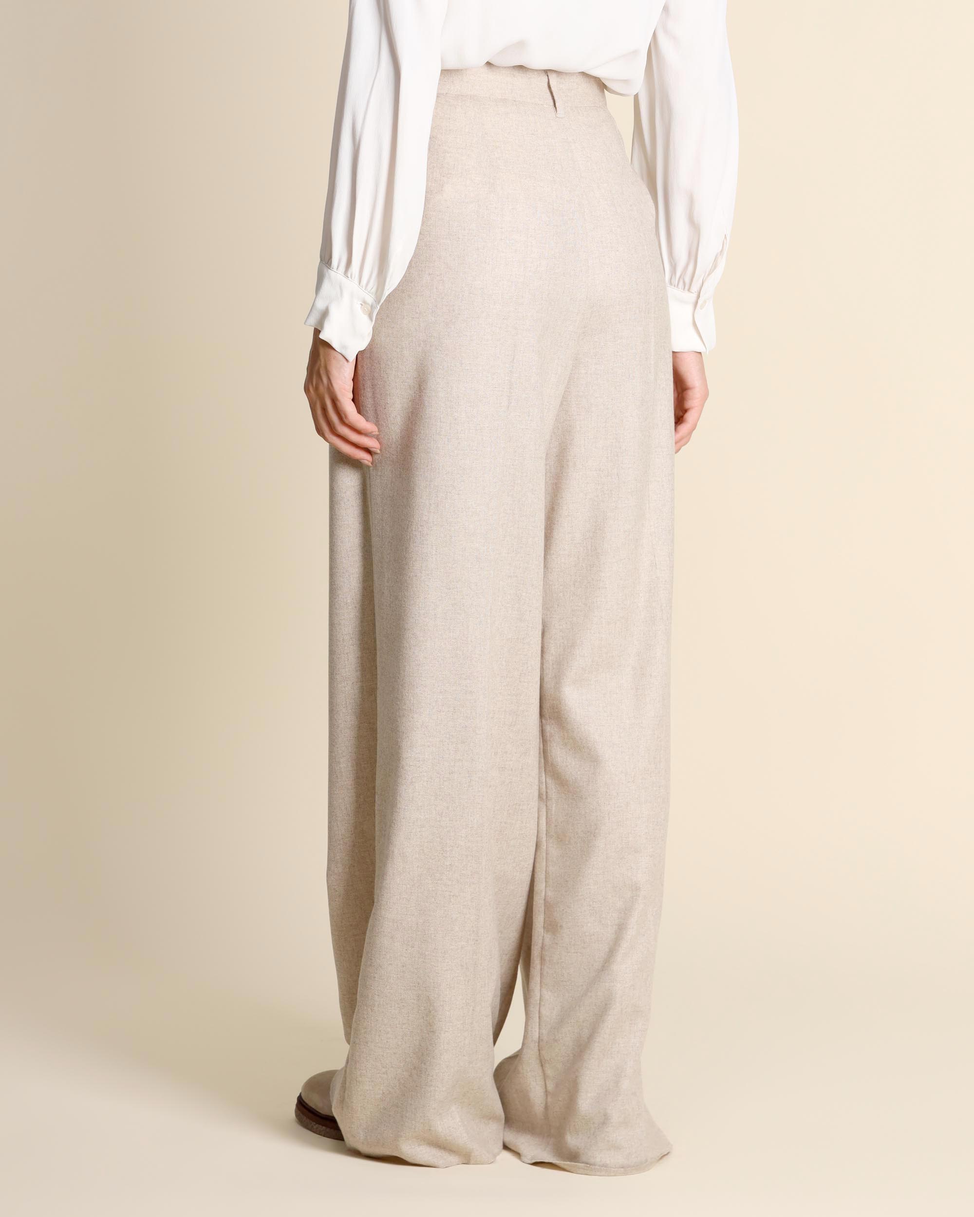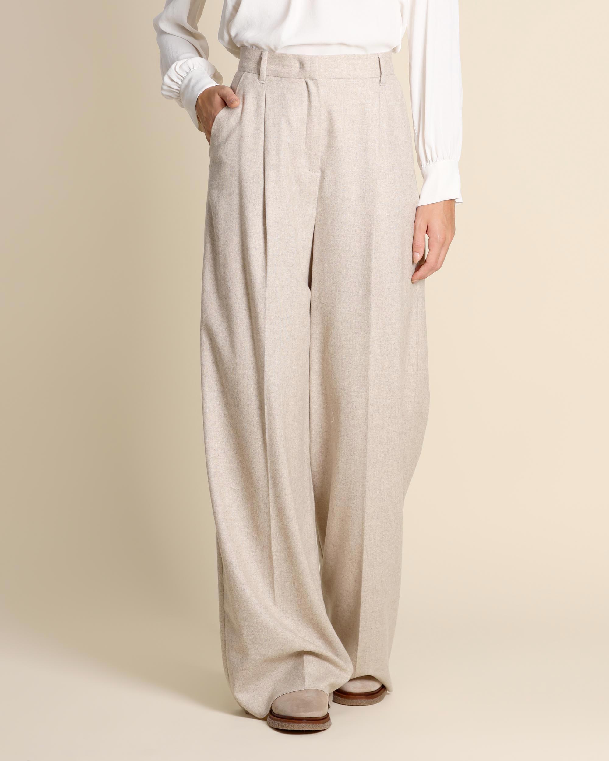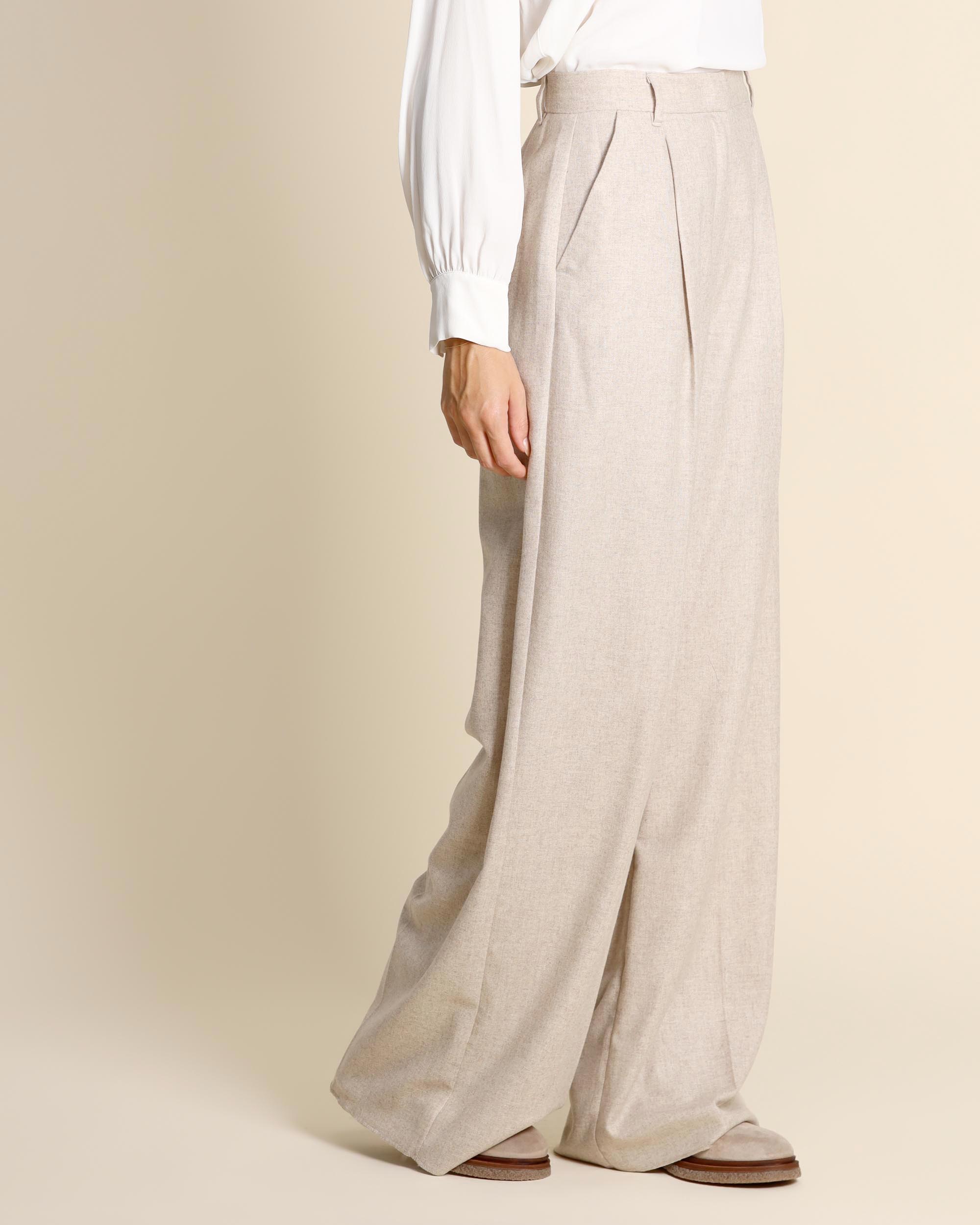 Pantaloni in flanella di misto lana e viscosa color cacha, chiusura con gancio e zip nascosti, tasche alla francese, linea ampia con pince in vita, piega stirata, la modella indossa una tg.42, la modella ha le seguenti misure: altezza 173, seno 86,vita 65, fianchi 93, collezione donna Emme by Marella Autunno Inverno 2025/26
