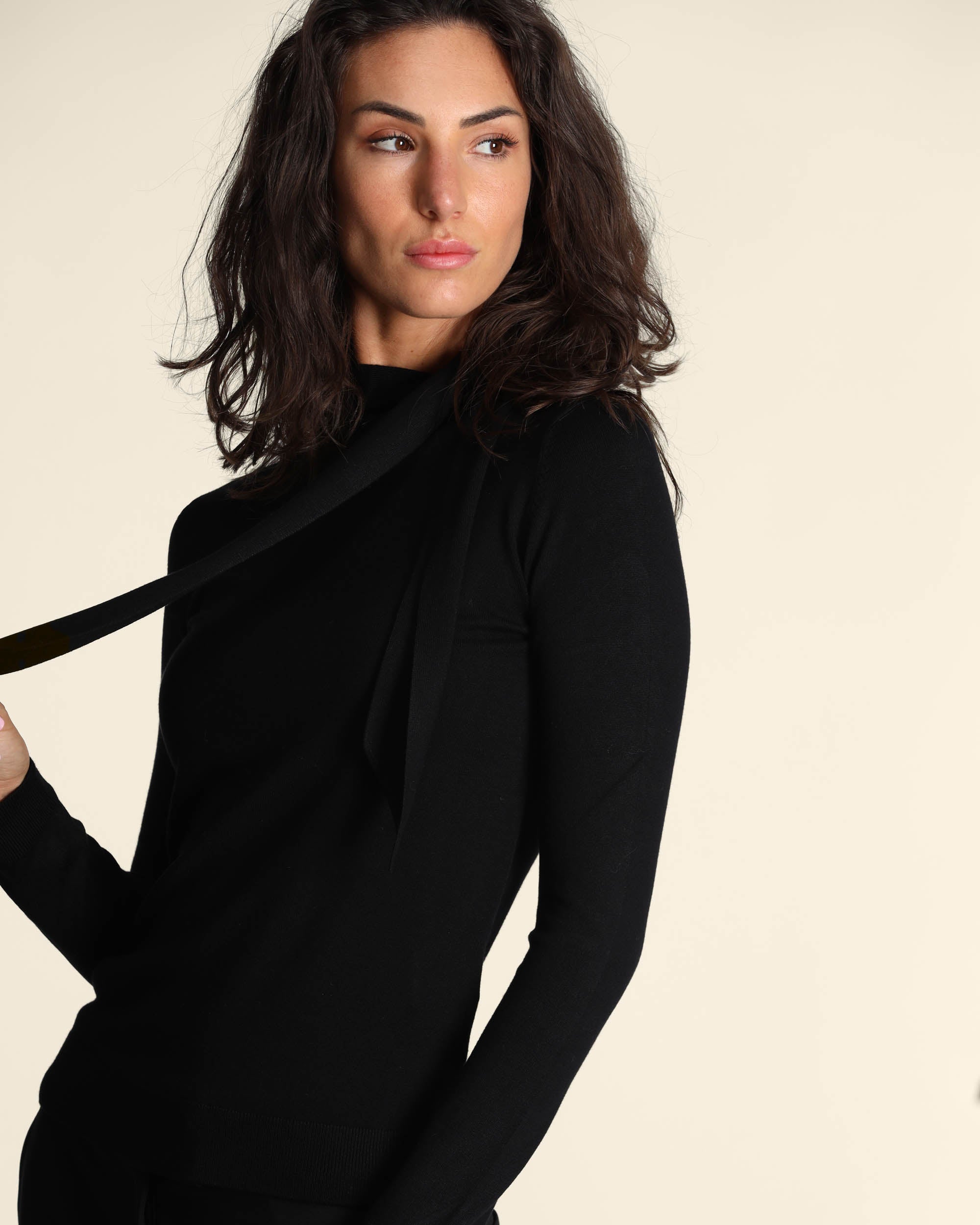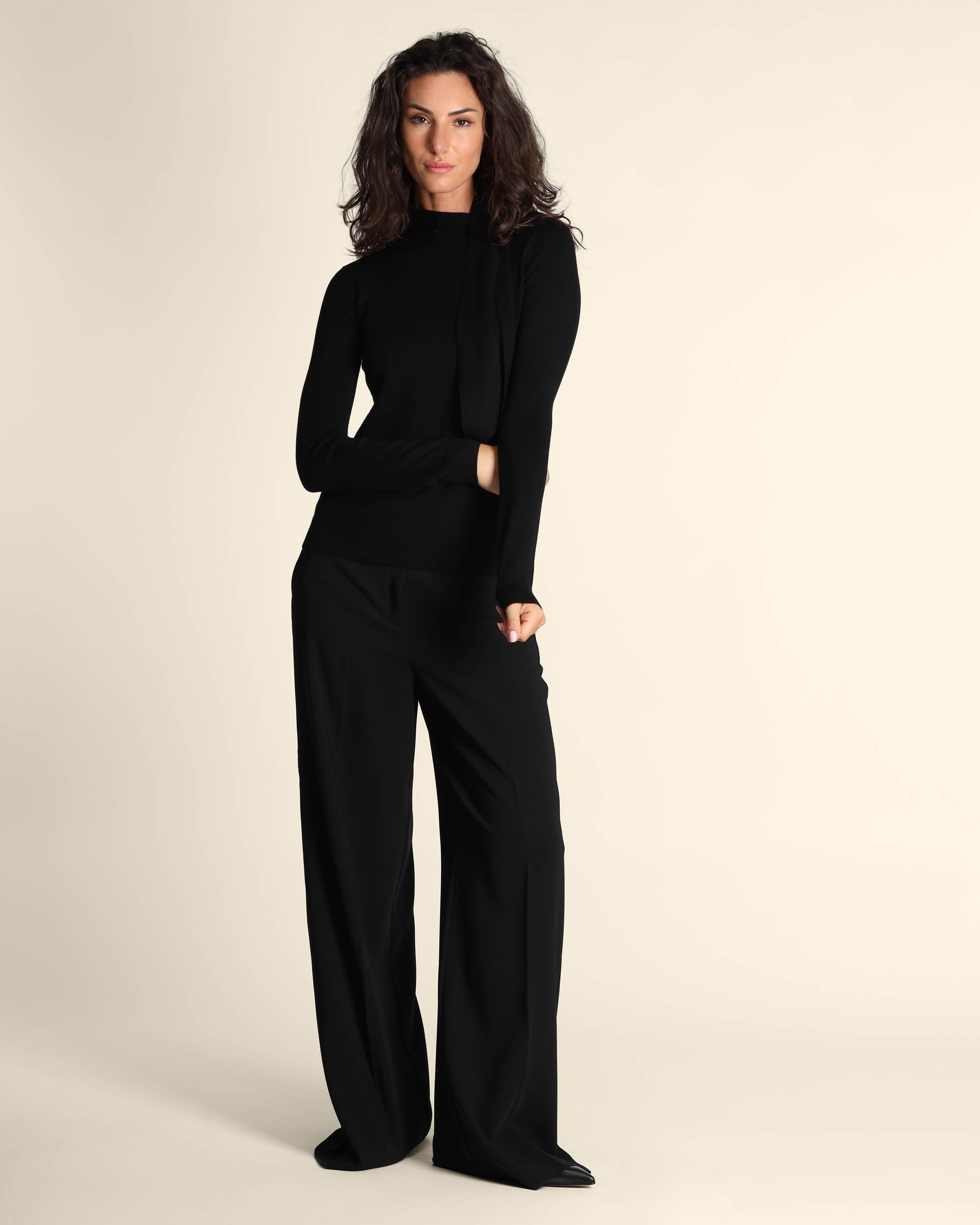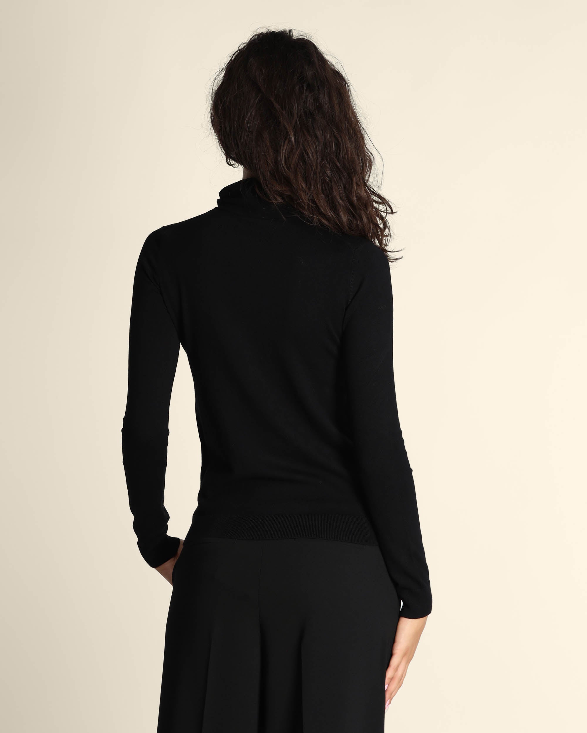 Maglia nera rasata in misto viscosa, collo alto, maniche lunghe, linea dritta, Elisa indossa una tg.S, Elisa ha le seguenti misure: altezza 179, seno 84, vita 63, fianchi 94, collezione donna Emme by Marella Autunno Inverno 2025/26