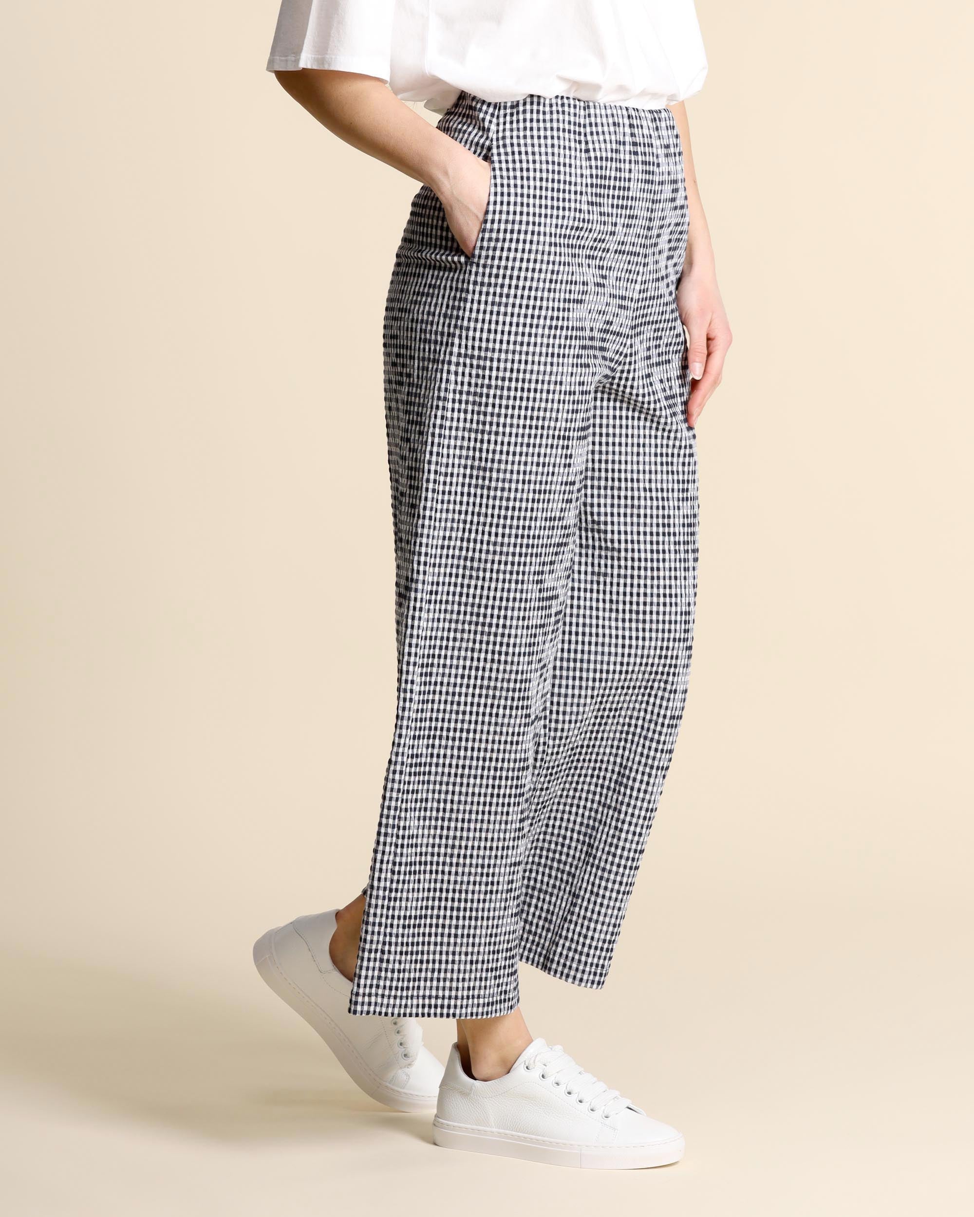 Pantaloni Vichy blu navy in misto cotone stretch goffrato, vita elastica, chiusura con zip invisibile sul fianco, tasche inserite sul fianco, linea ampia, made in Italy, la modella indossa una tg.42, la modella ha le seguenti misure: altezza 177, seno 86,vita 65, fianchi 93, collezione donna Neirami Primavera Estate 2026