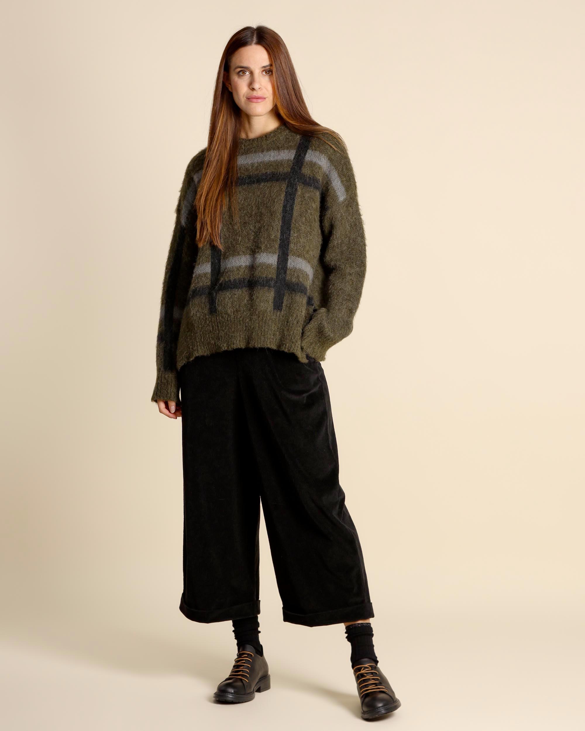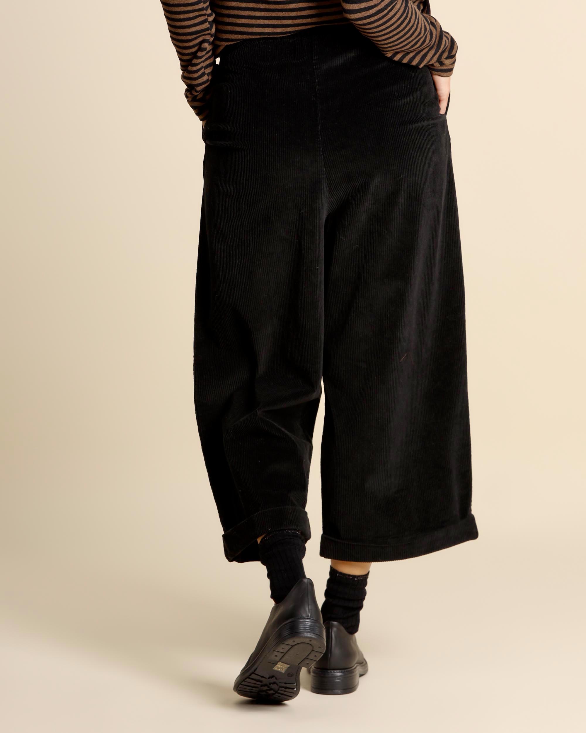 Pantaloni neri in velluto a coste di cotone stretch, vita elastica, tasche inserite sul fianco, linea ampia, risvolto sul fondo sul fondo, made in Italy, la modella indossa una tg.S, la modella ha le seguenti misure: altezza 177, seno 87,vita 65, fianchi 93, collezione donna Neirami Autunno Inverno 2025/26