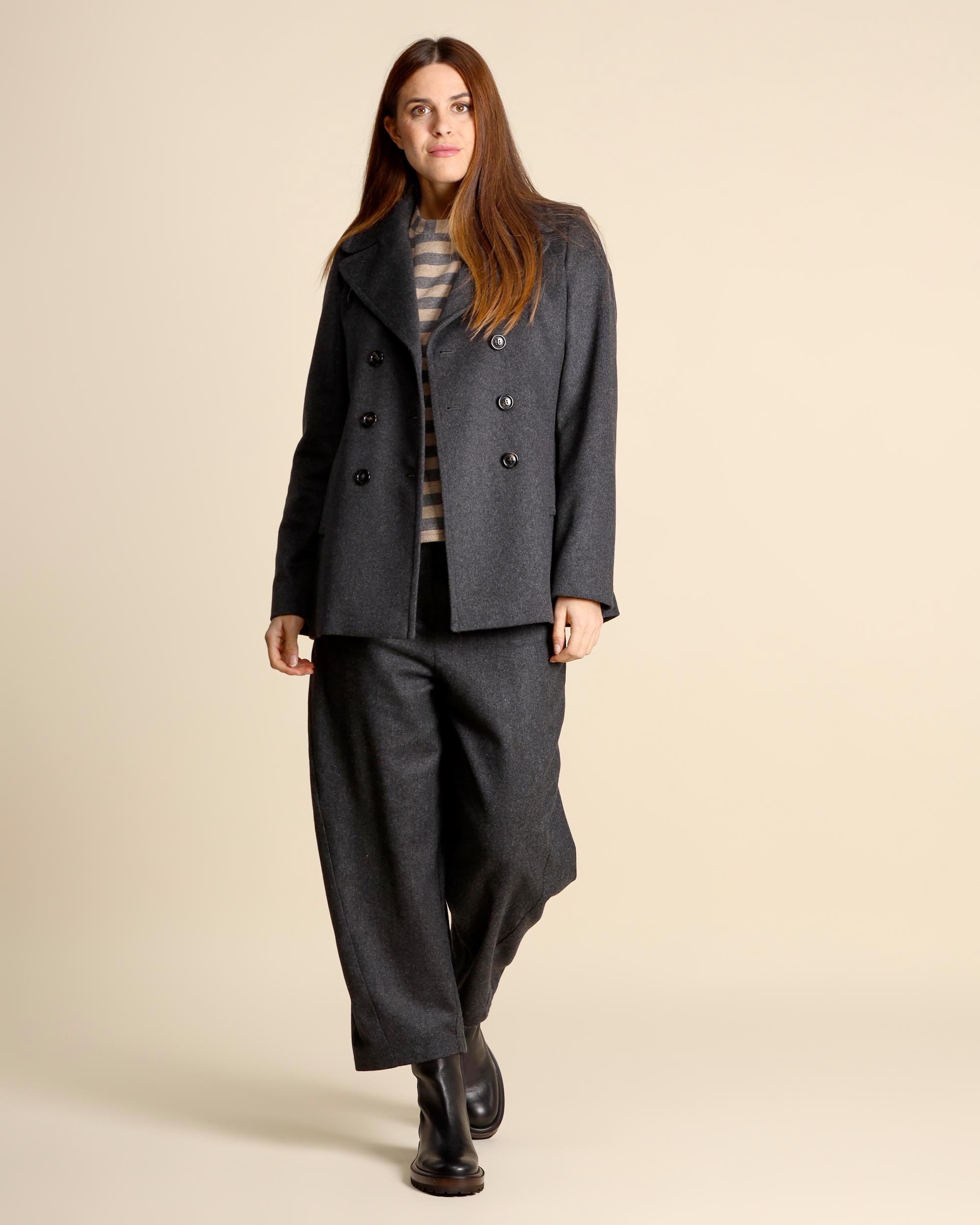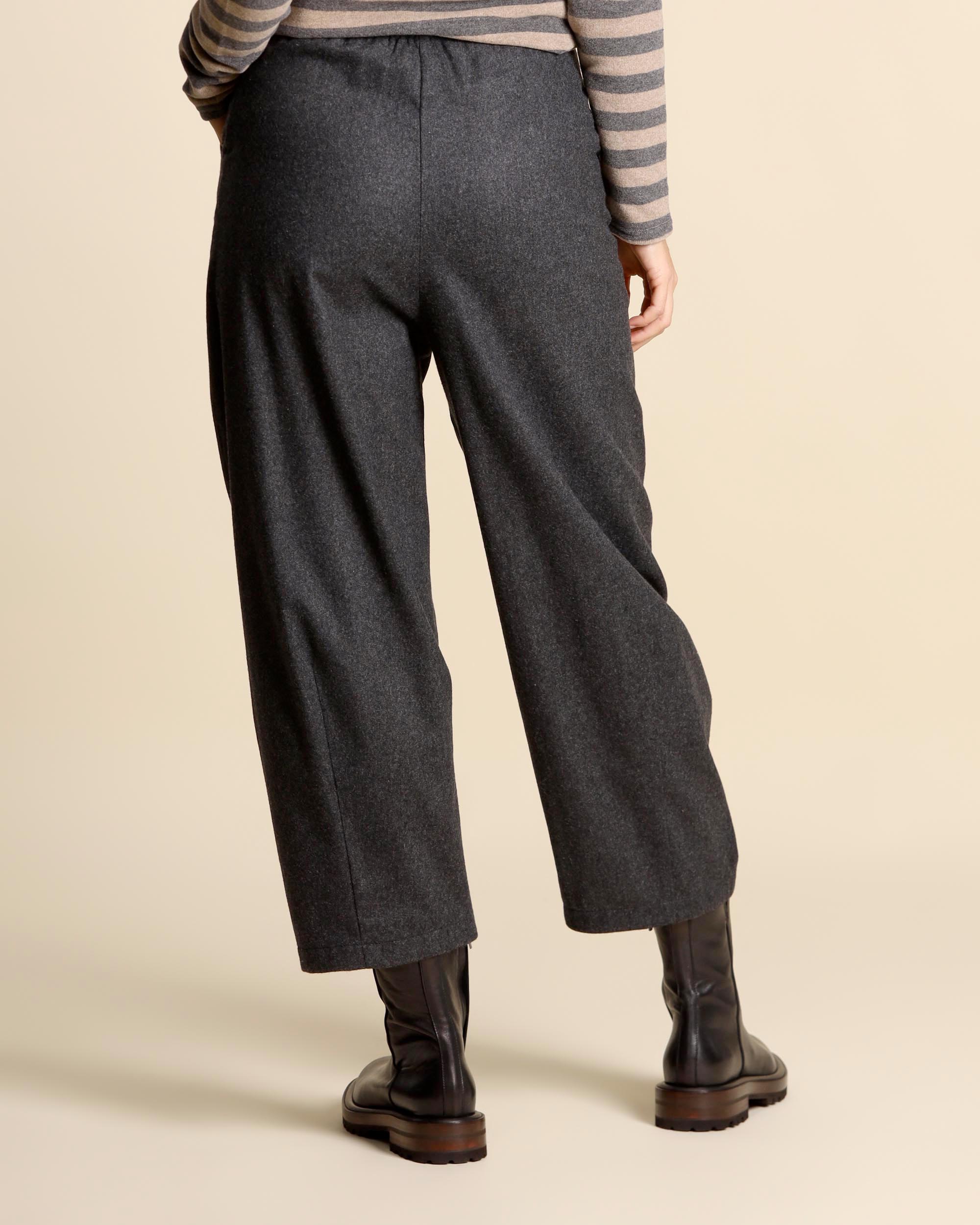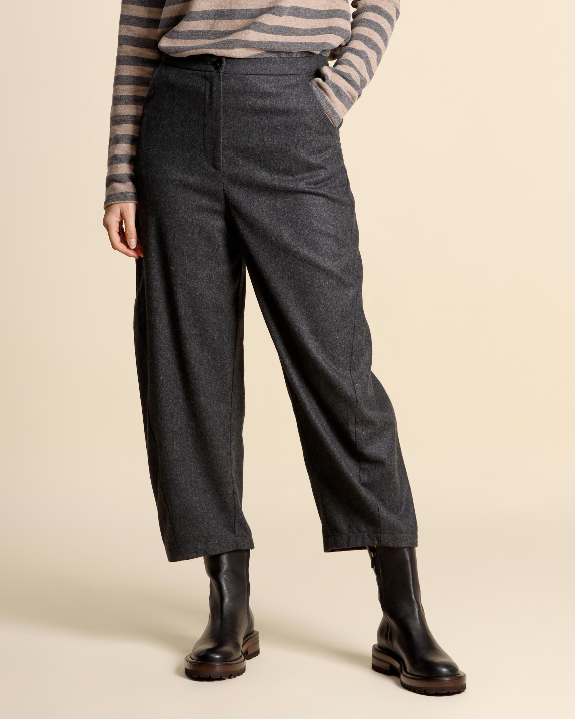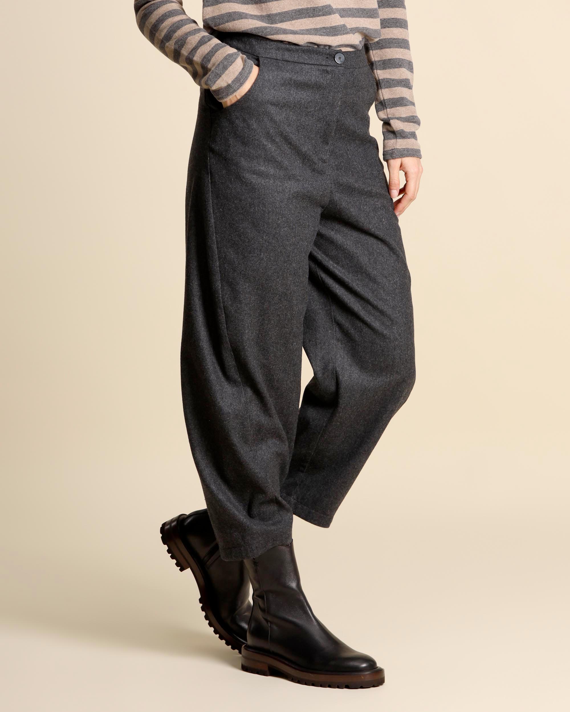 Pantaloni grigio antracite in flanella di misto lana, chiusura con bottone e zip nascosta, vita elastica sul dietro, tasche alla carrettiera, linea morbida leggermente più stretta sul fondo, made in Italy, la modella indossa una tg.S, la modella ha le seguenti misure: altezza 177, seno 87,vita 65, fianchi 93, collezione donna Neirami Autunno Inverno 2025/26