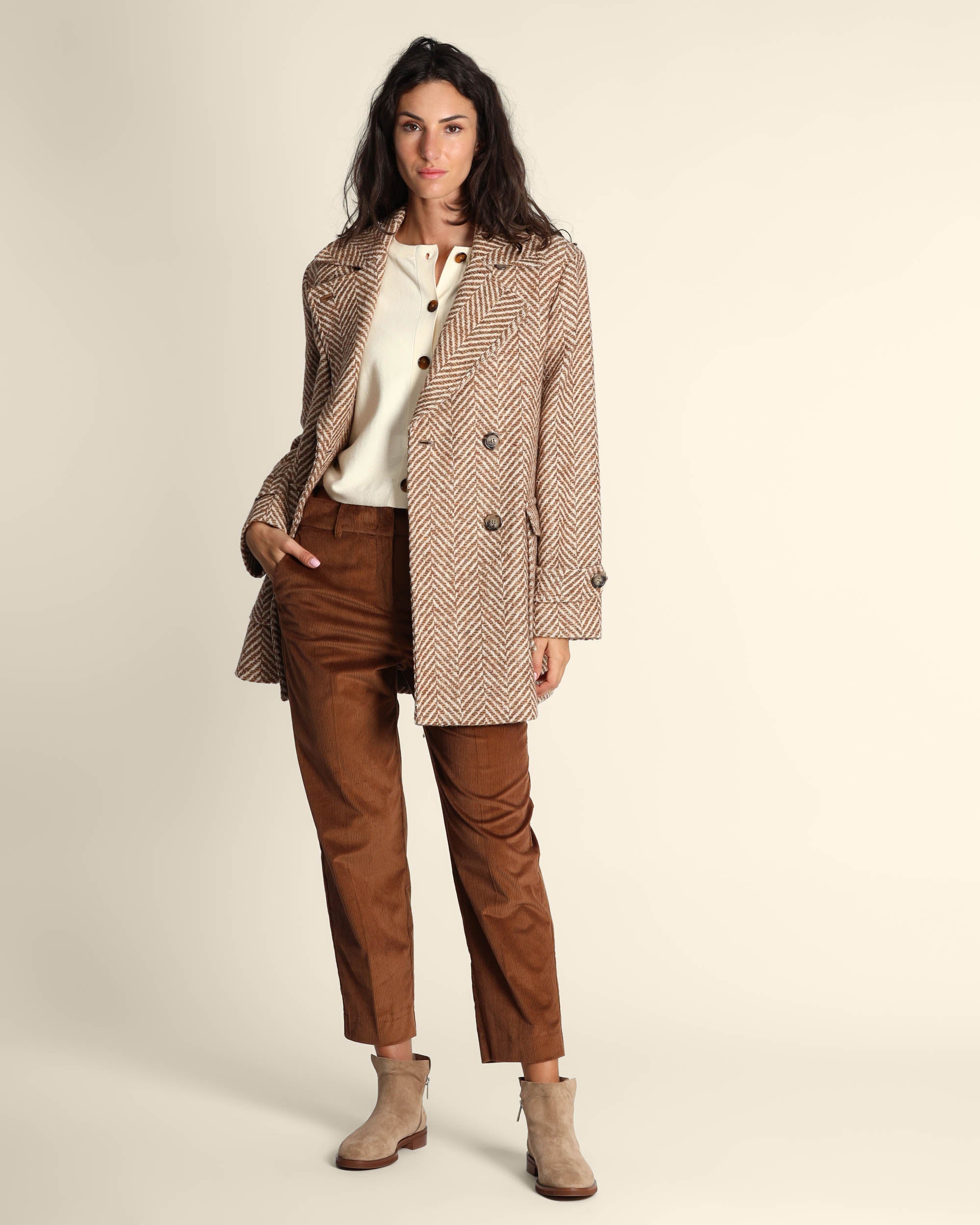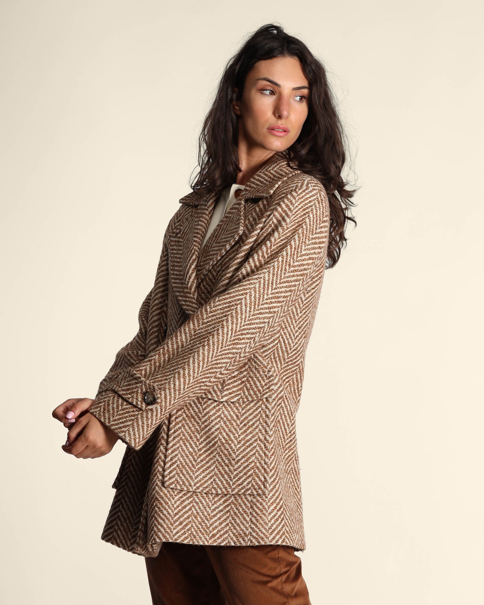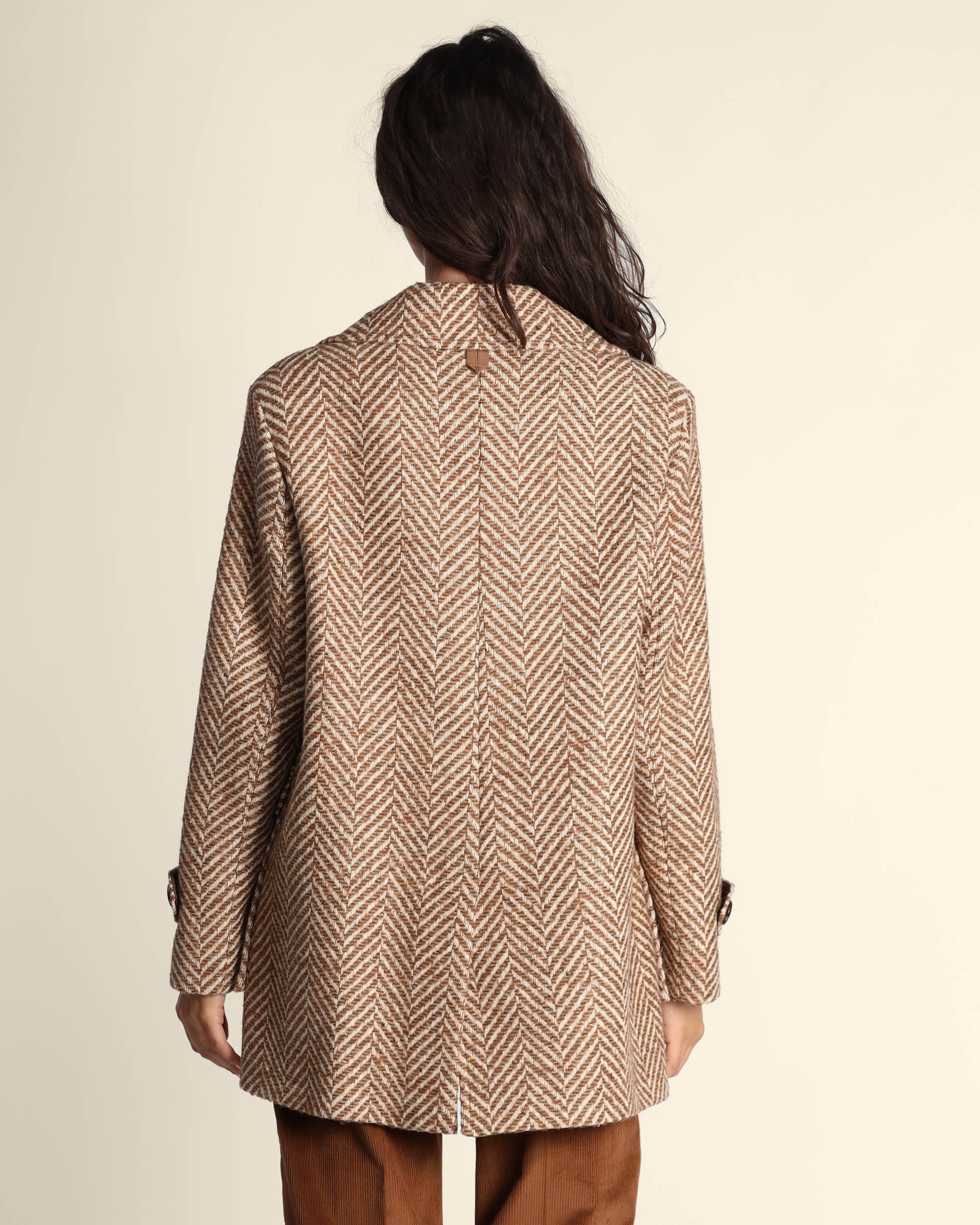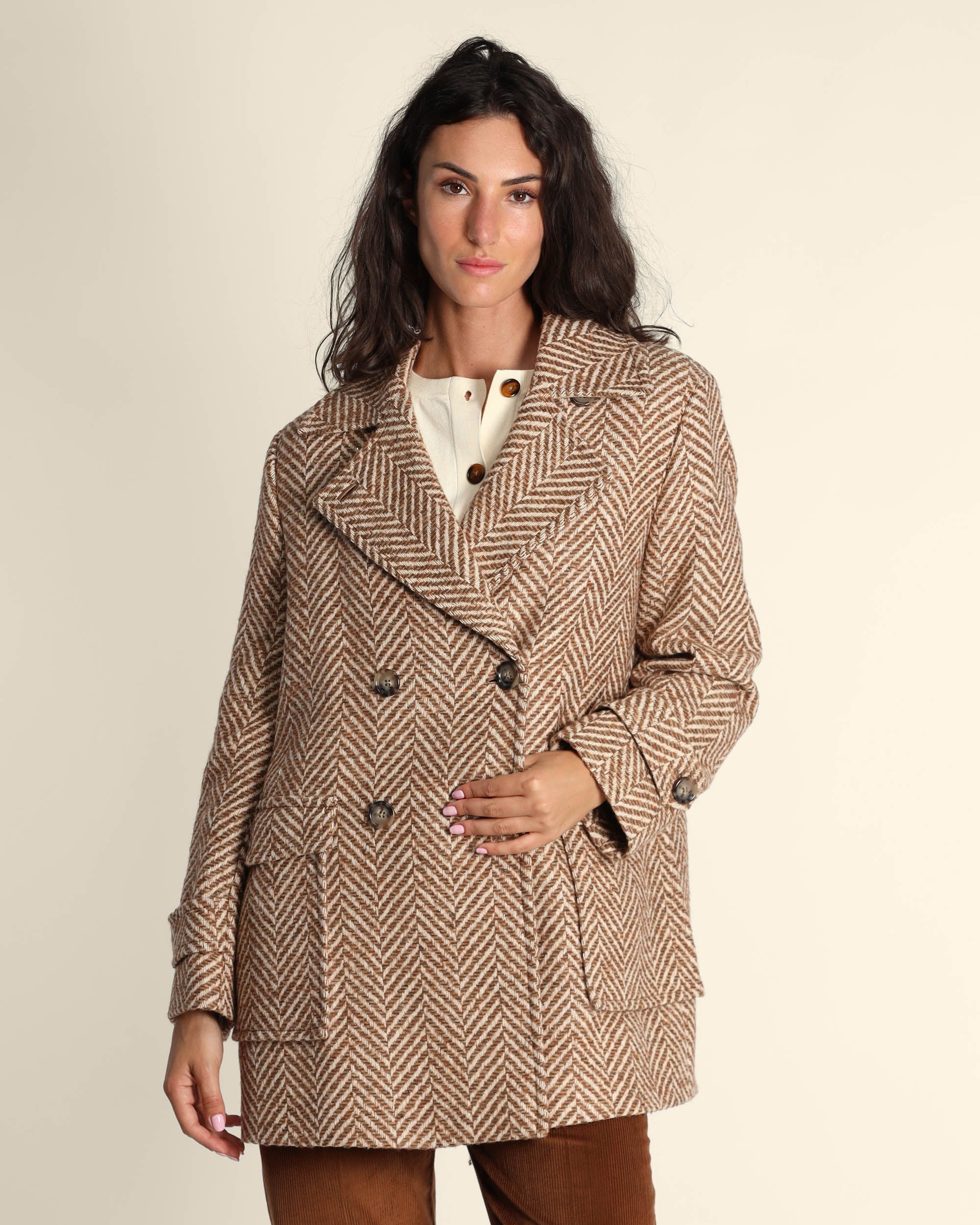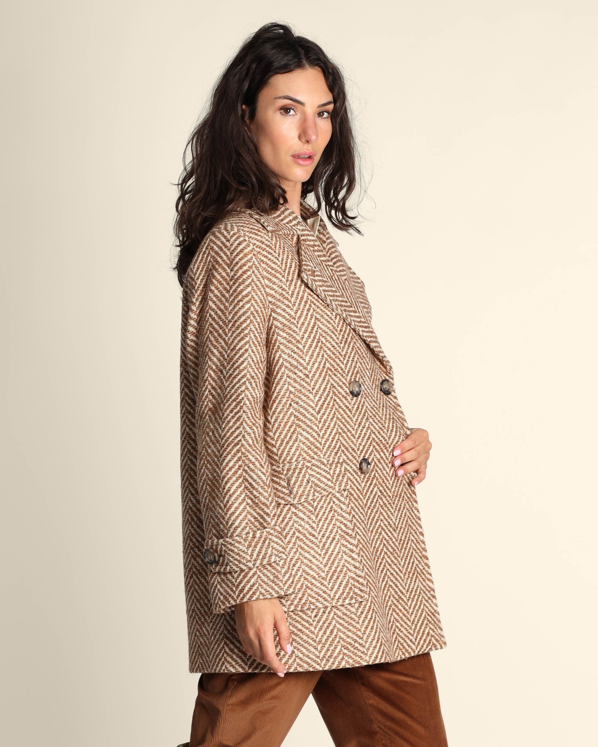 Giaccone spinato color cammello in misto lana, doppiopetto, collo a rever, maniche lunghe, chiusura con bottoni, linea morbida, tasche applicate con patta, spacco centrale sul dietro, foderato, la modella indossa una tg.42, la modella ha le seguenti misure: altezza 178, seno 86,vita 65, fianchi 93, collezione donna Pennyblack Autunno Inverno 2025