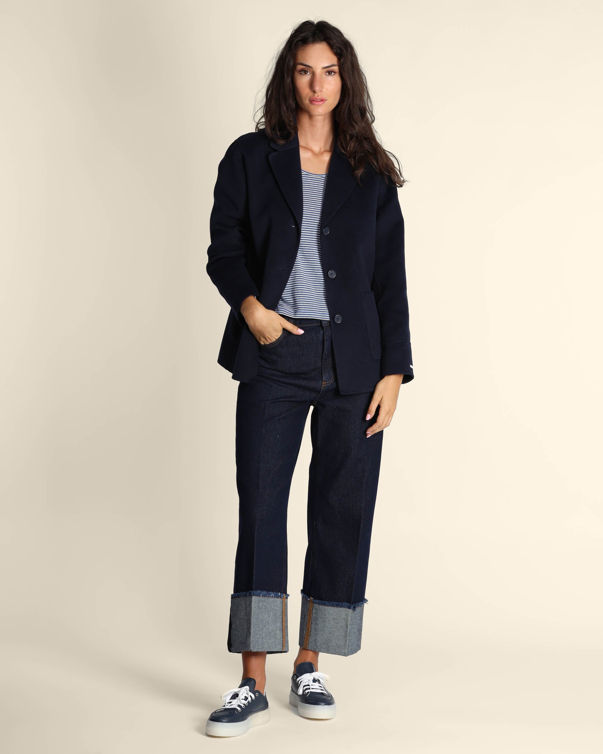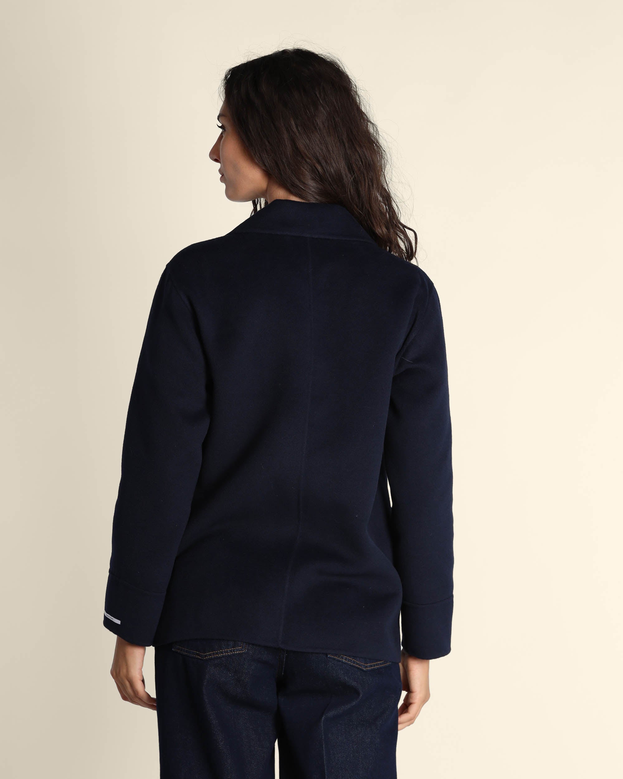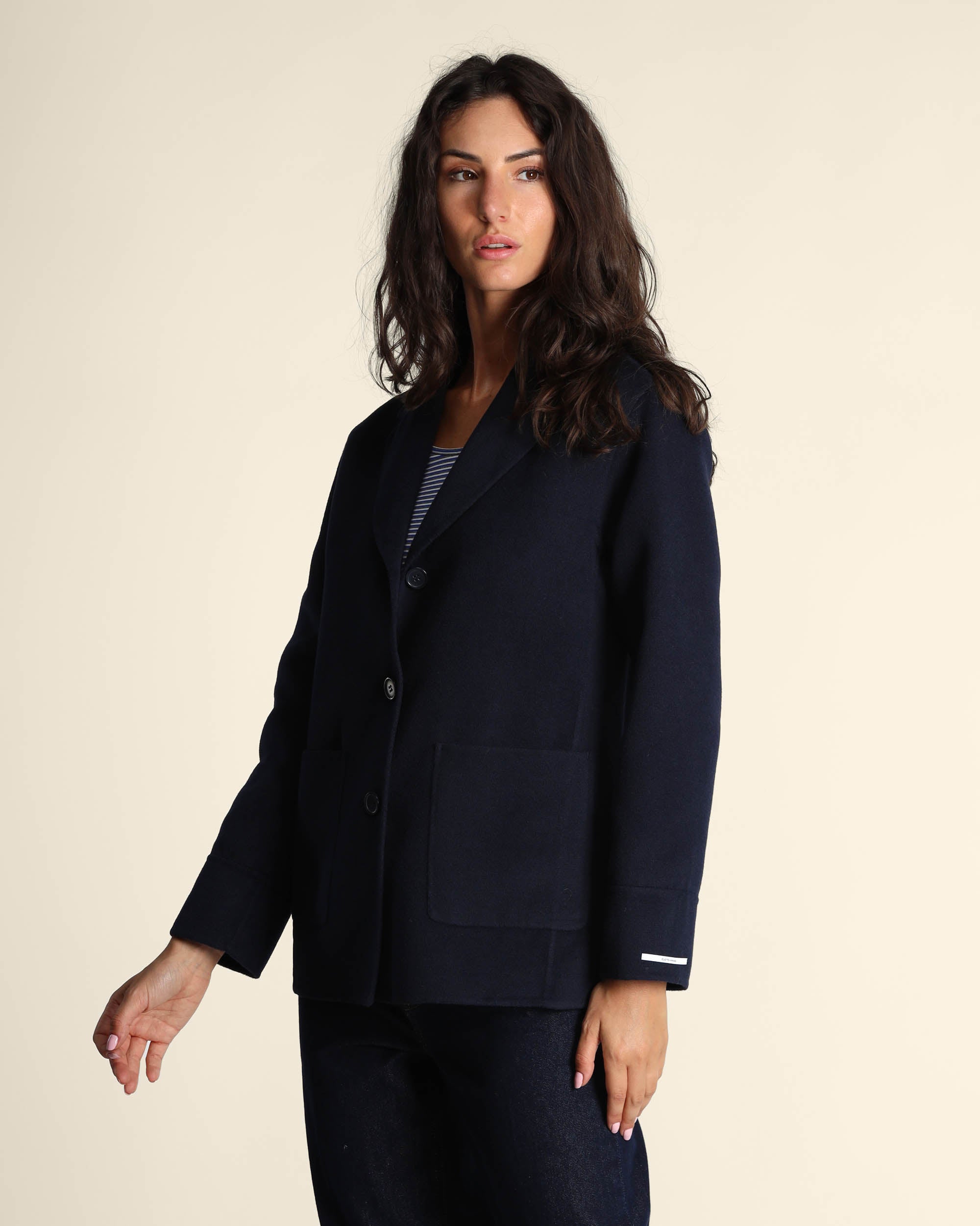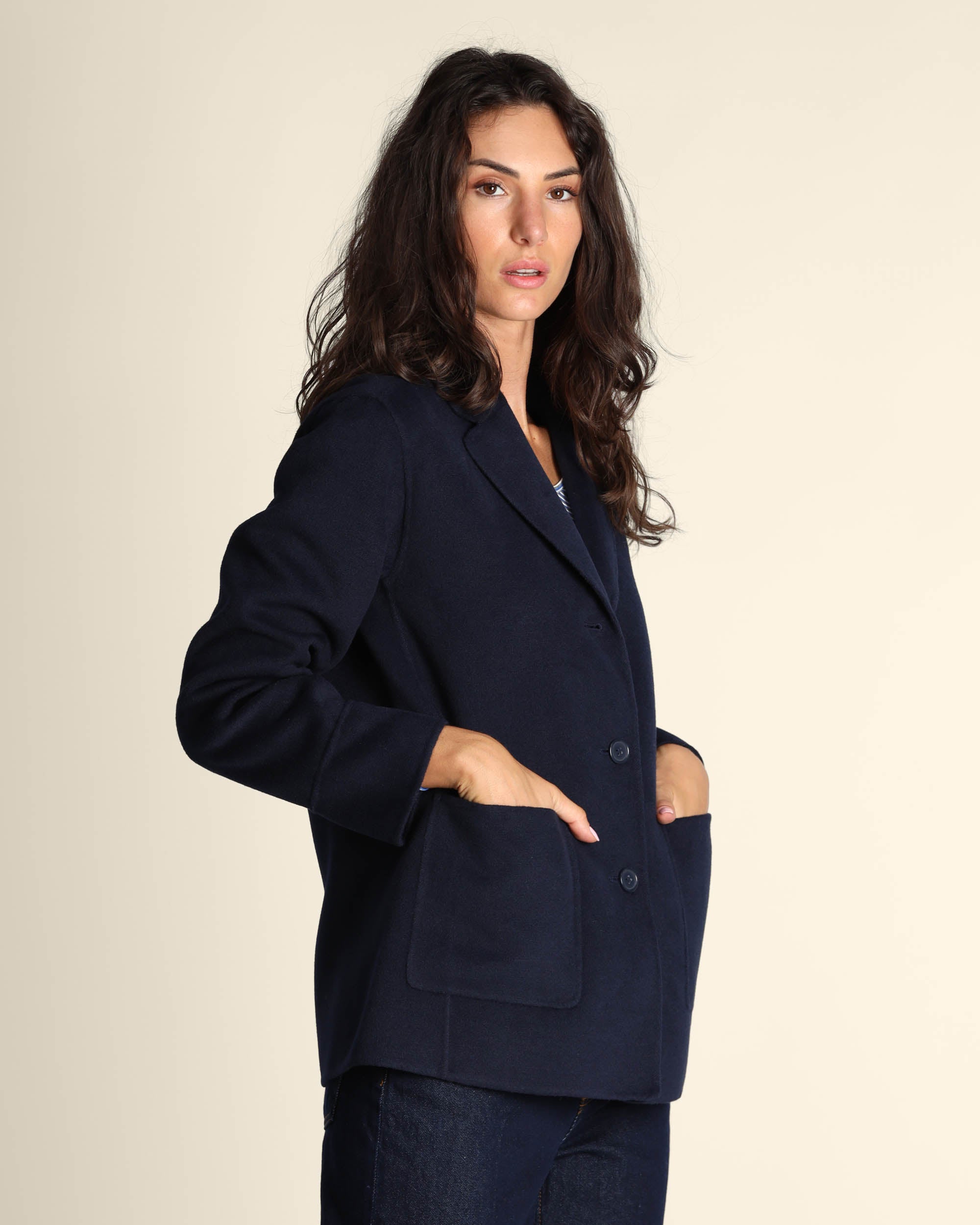 Giaccone in panno double blu navy, collo a rever, maniche lunghe, chiusura con bottoni, linea dritta, tasche applicate, cucito a mano, sfoderato, la modella indossa una tg.42, la modella ha le seguenti misure: altezza 178, seno 86,vita 65, fianchi 93, collezione donna Emme by Marella Autunno Inverno 2025