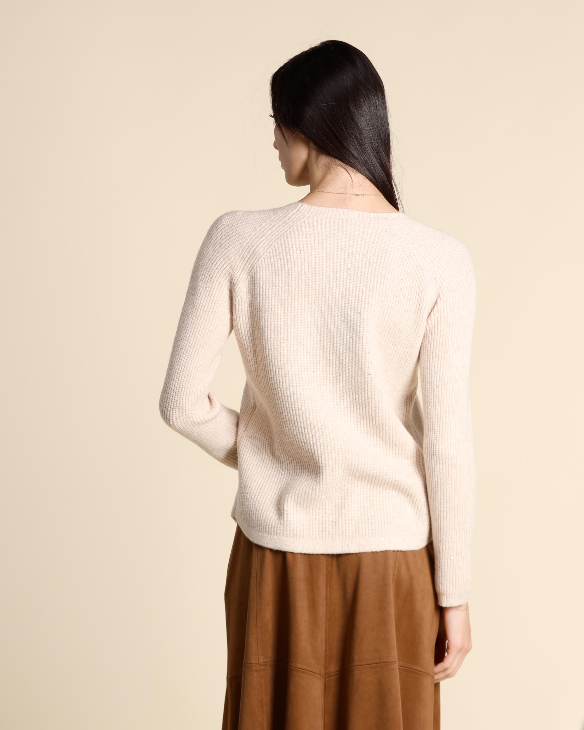 Maglia color cacha con lavorazione a coste e micropaillettes, scollo tondo, maniche lunghe raglan, linea dritta, la modella indossa una tg.S, la modella ha le seguenti misure: altezza 173, seno 84, vita 63, fianchi 94, collezione donna Emme by Marella Autunno Inverno 2025/26
