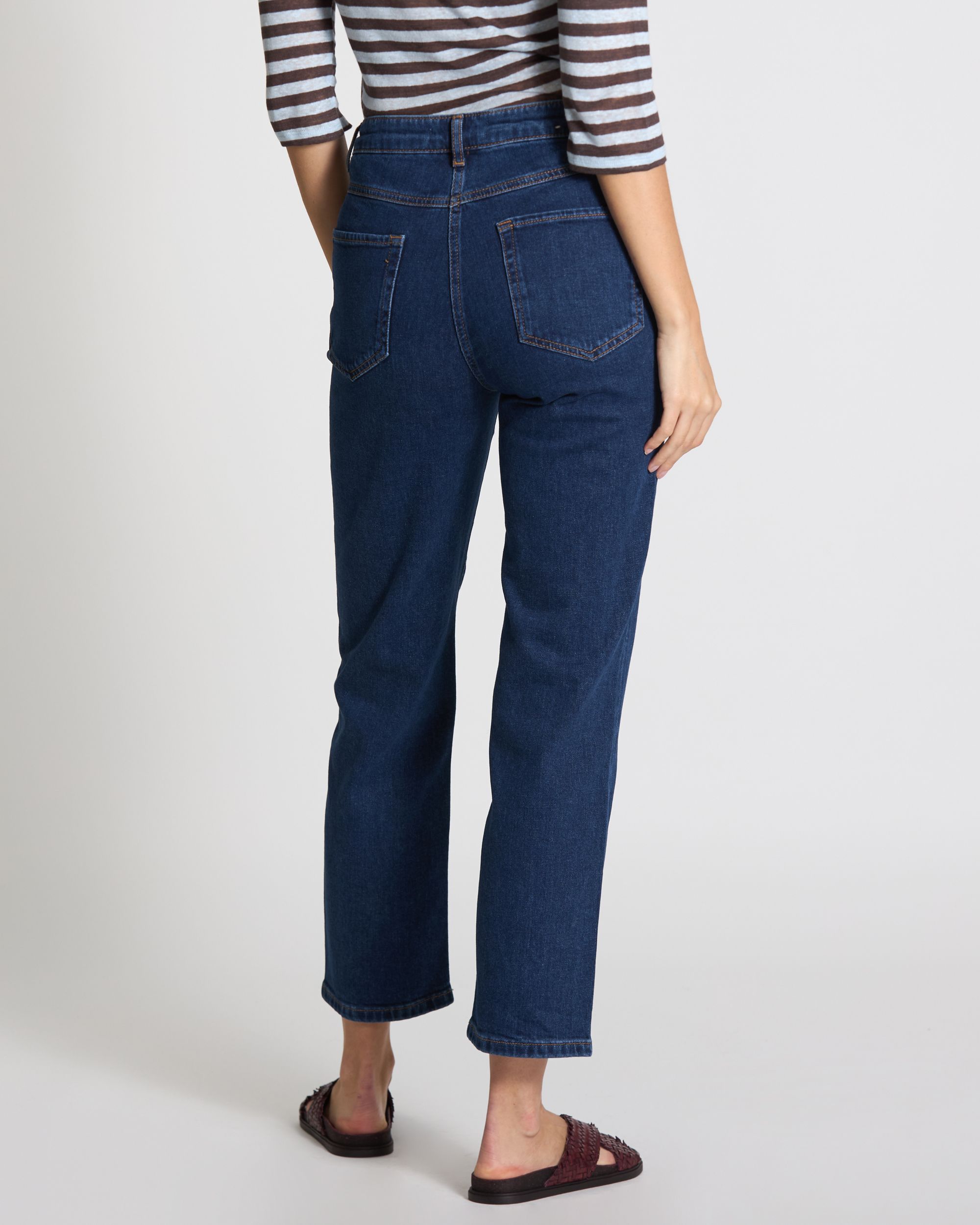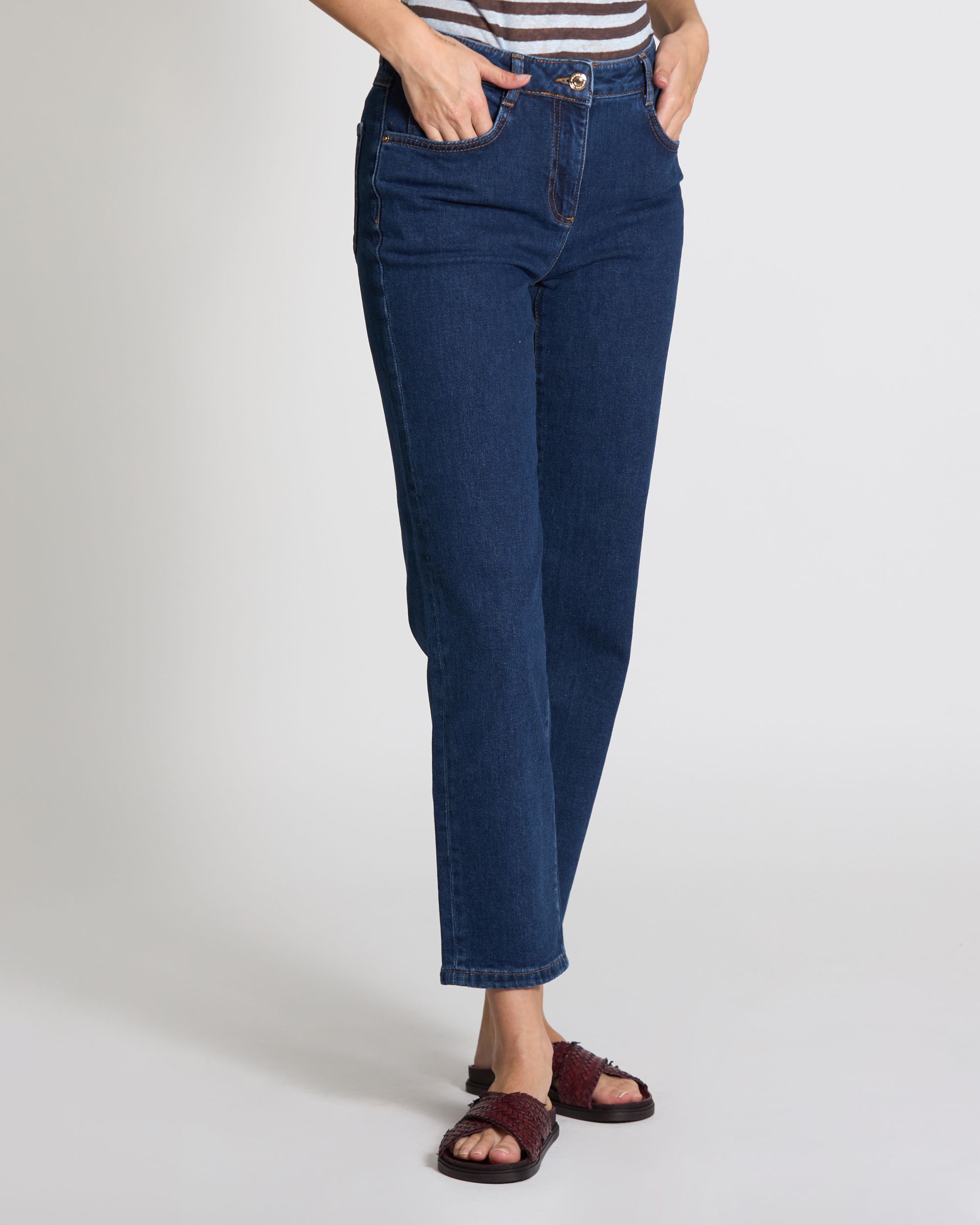 Jeans blu in denim di cotone stretch, chiusura con bottone a chiodo e zip nascosta, cinque tasche, regular fit, Giorgia indossa una tg.42, Giorgia ha le seguenti misure:altezza 1.78, seno 85cm, vita 70cm, fianchi 88cm, collezione donna Pennyblack Primavera Estate 2024