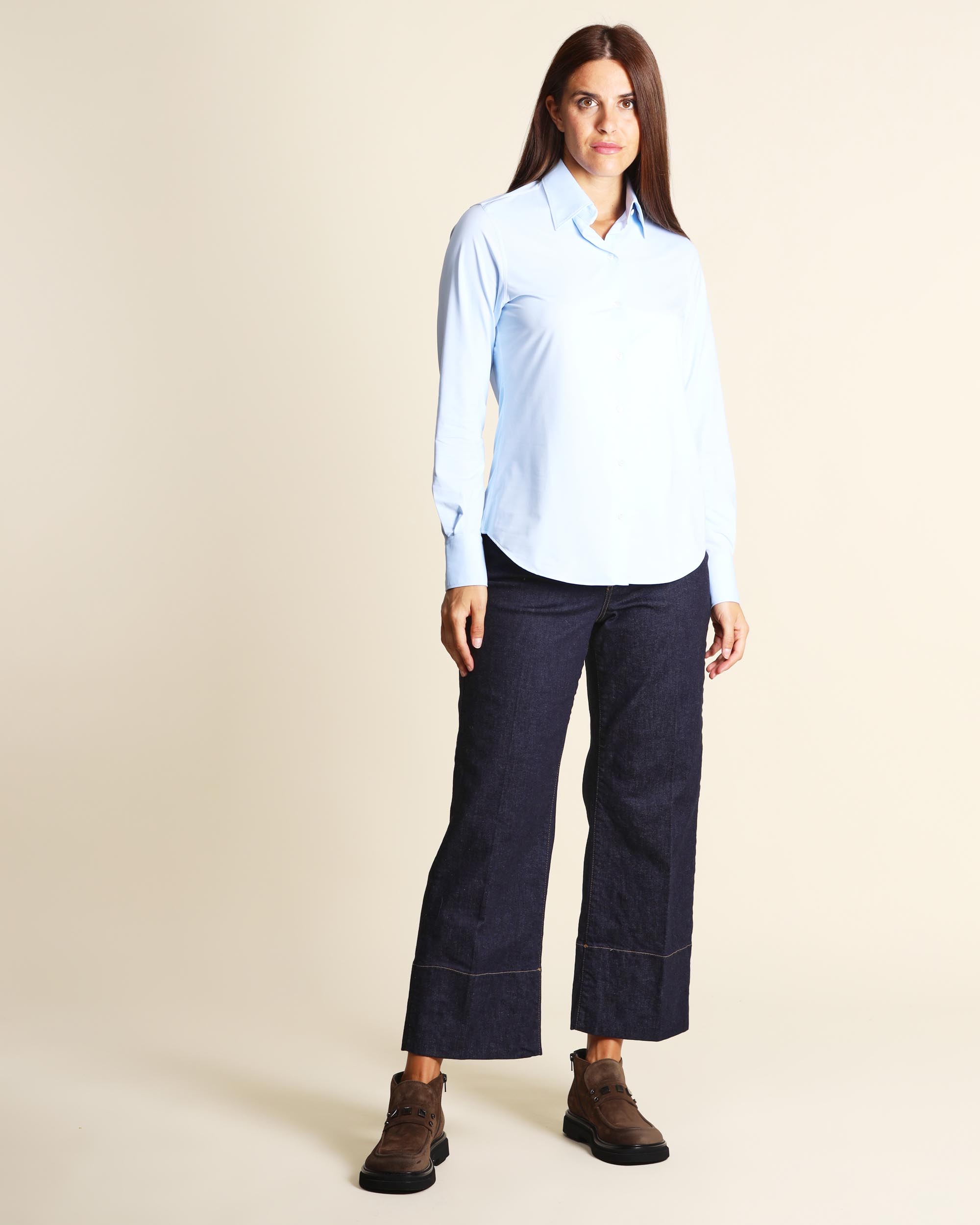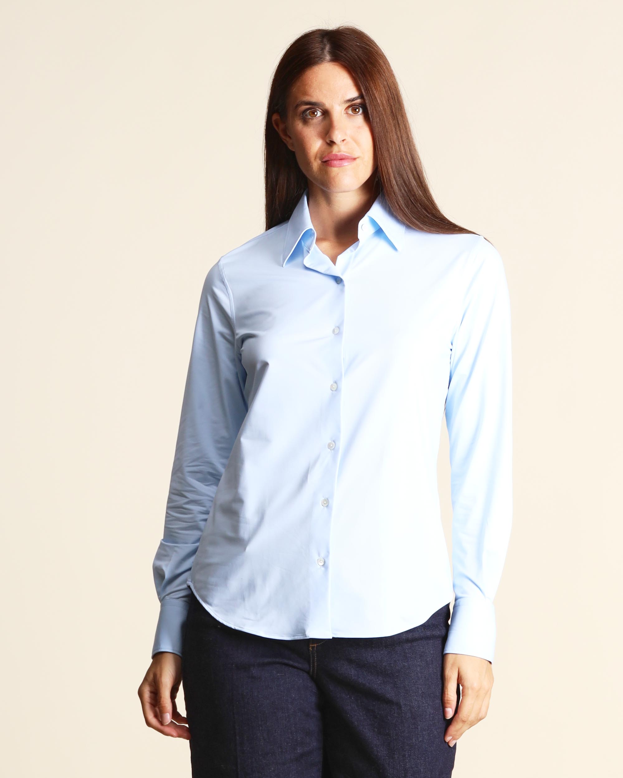 Camicia azzurra in tessuto tecnico Active, tessuto composto da un filato di poliammide ed elastane, altamente traspirante, 3D stretch che si asciuga rapidamente, confortevole in qualsiasi momento, collo a camicia, maniche lunghe con polsino, chiusura con bottoni, linea semiaderente, la modella indossa una tg.42, la modella ha le seguenti misure: altezza 177, seno 87,vita 65, fianchi 93, collezione donna Xacus Autunno Inverno 2025/26