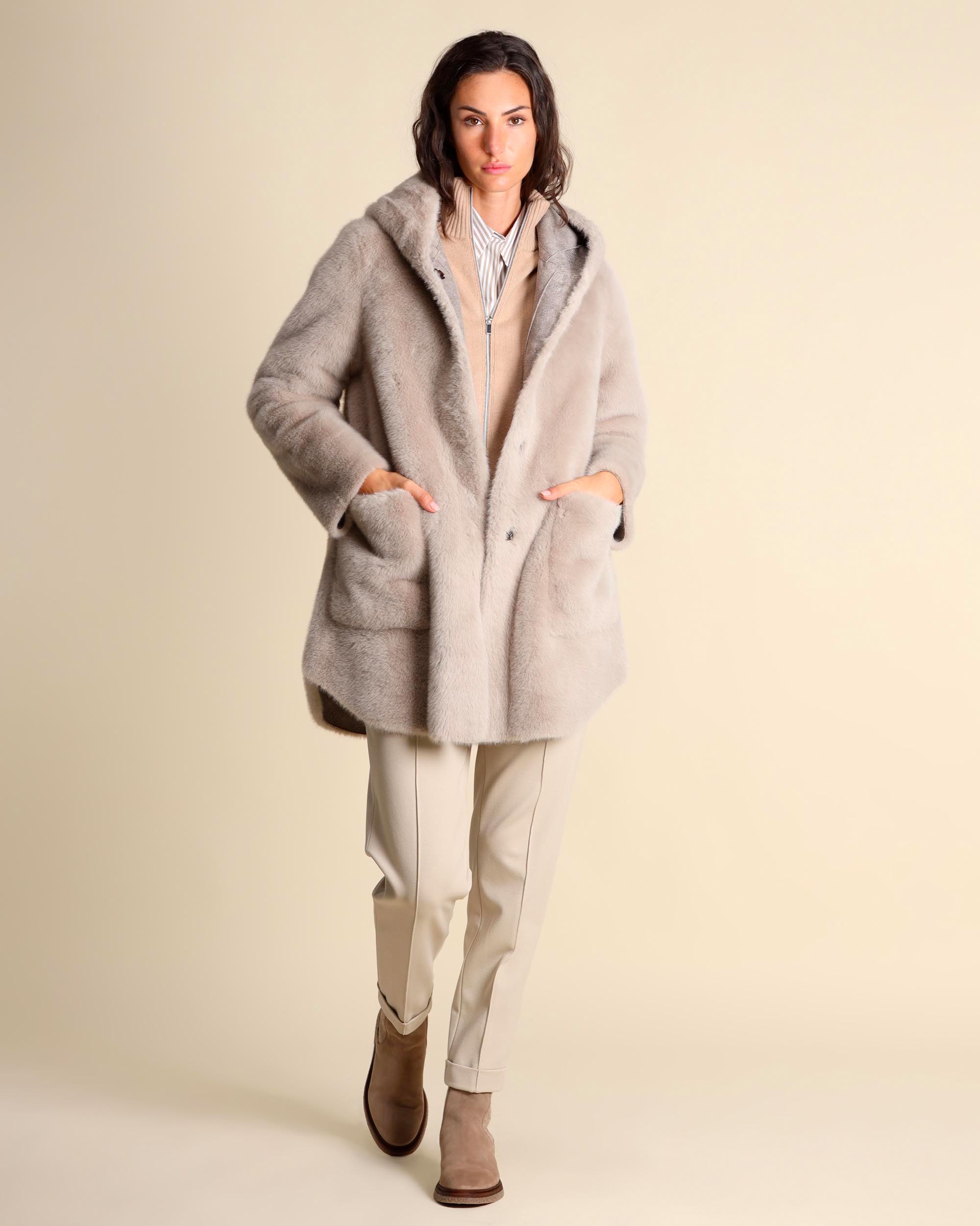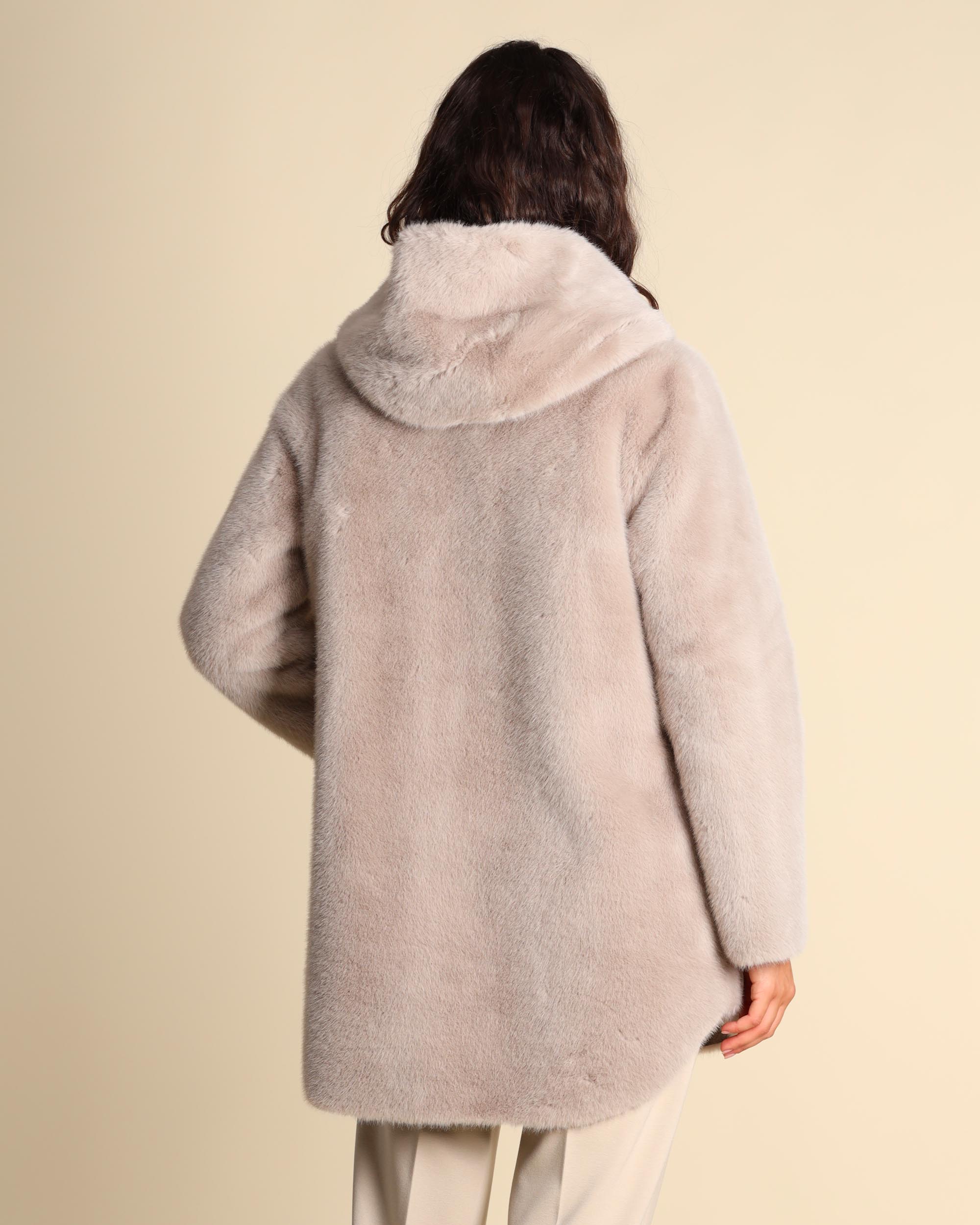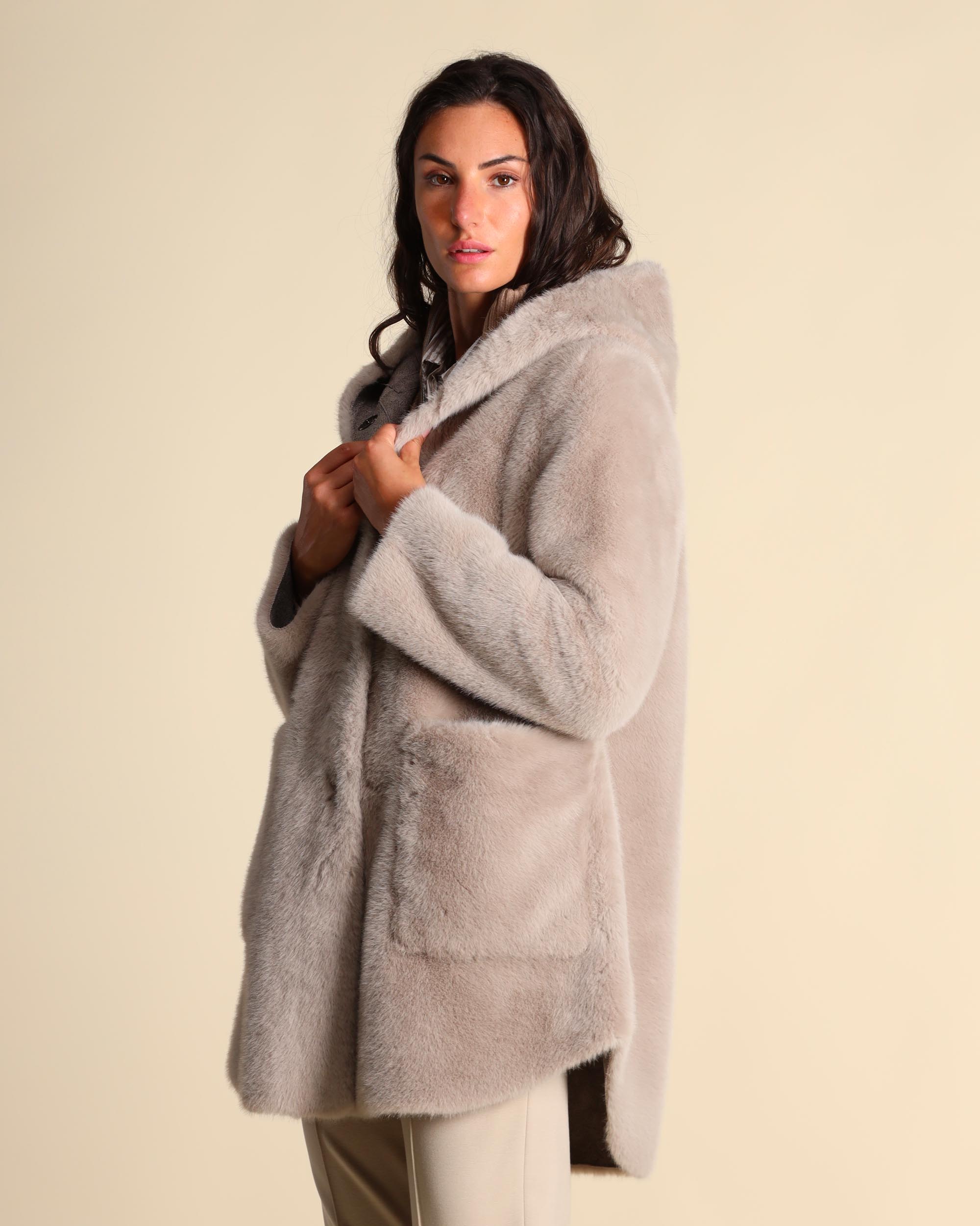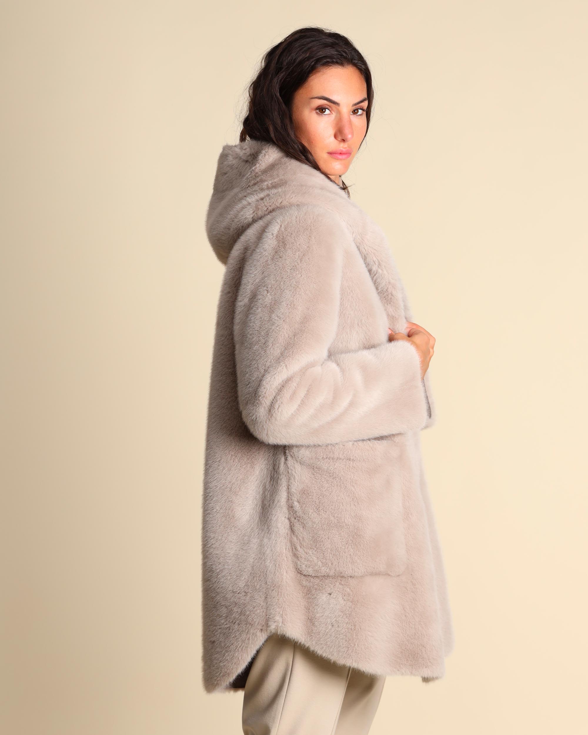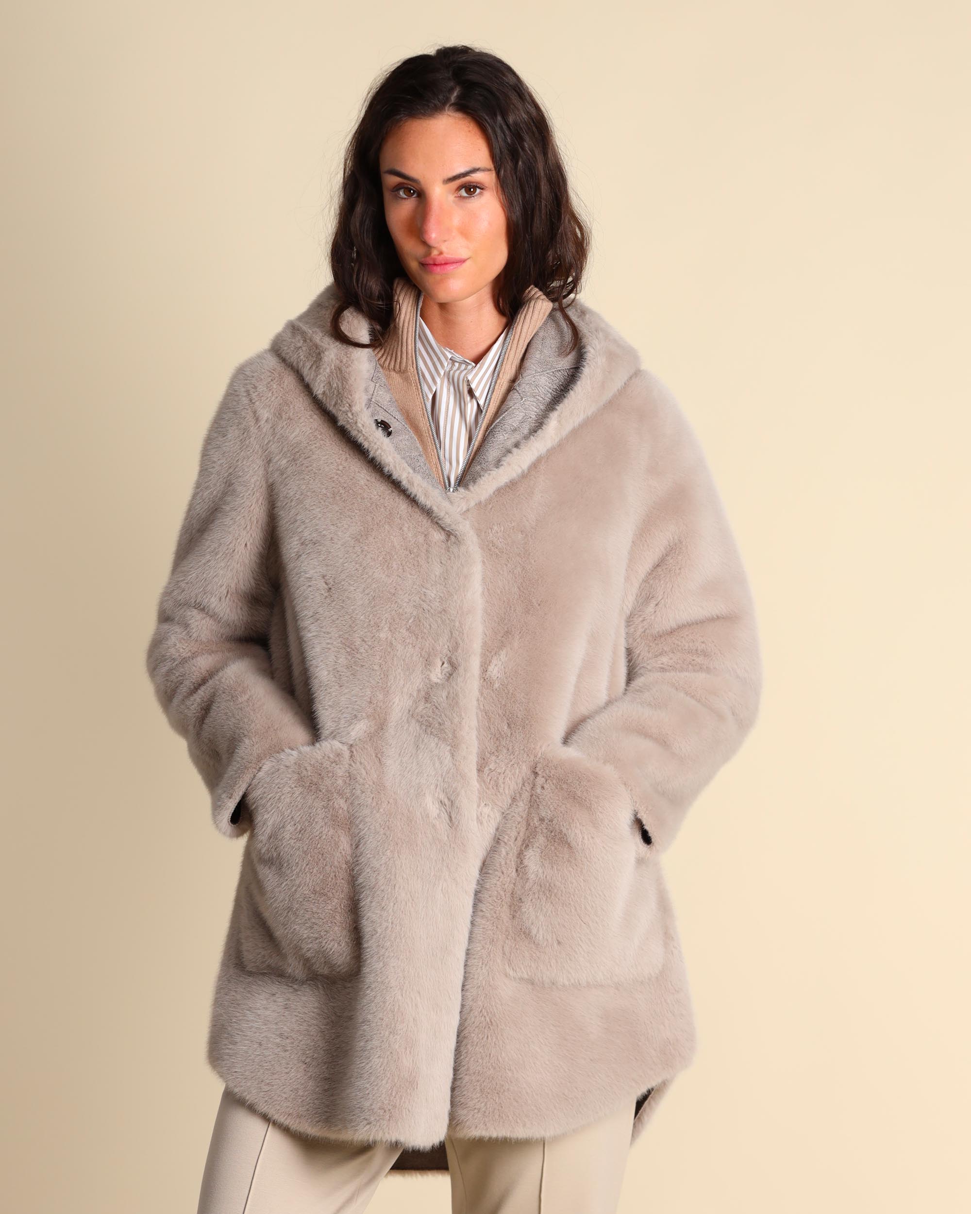 Giaccone color tortora in eco fur, collo con cappuccio, maniche lunghe, chiusura con bottoni automatici nascosti, linea morbida, tasche applicate, la modella indossa una tg.42, la modella ha le seguenti misure: altezza 178, seno 86,vita 65, fianchi 93, collezione donna Milestone Autunno Inverno 2025/26