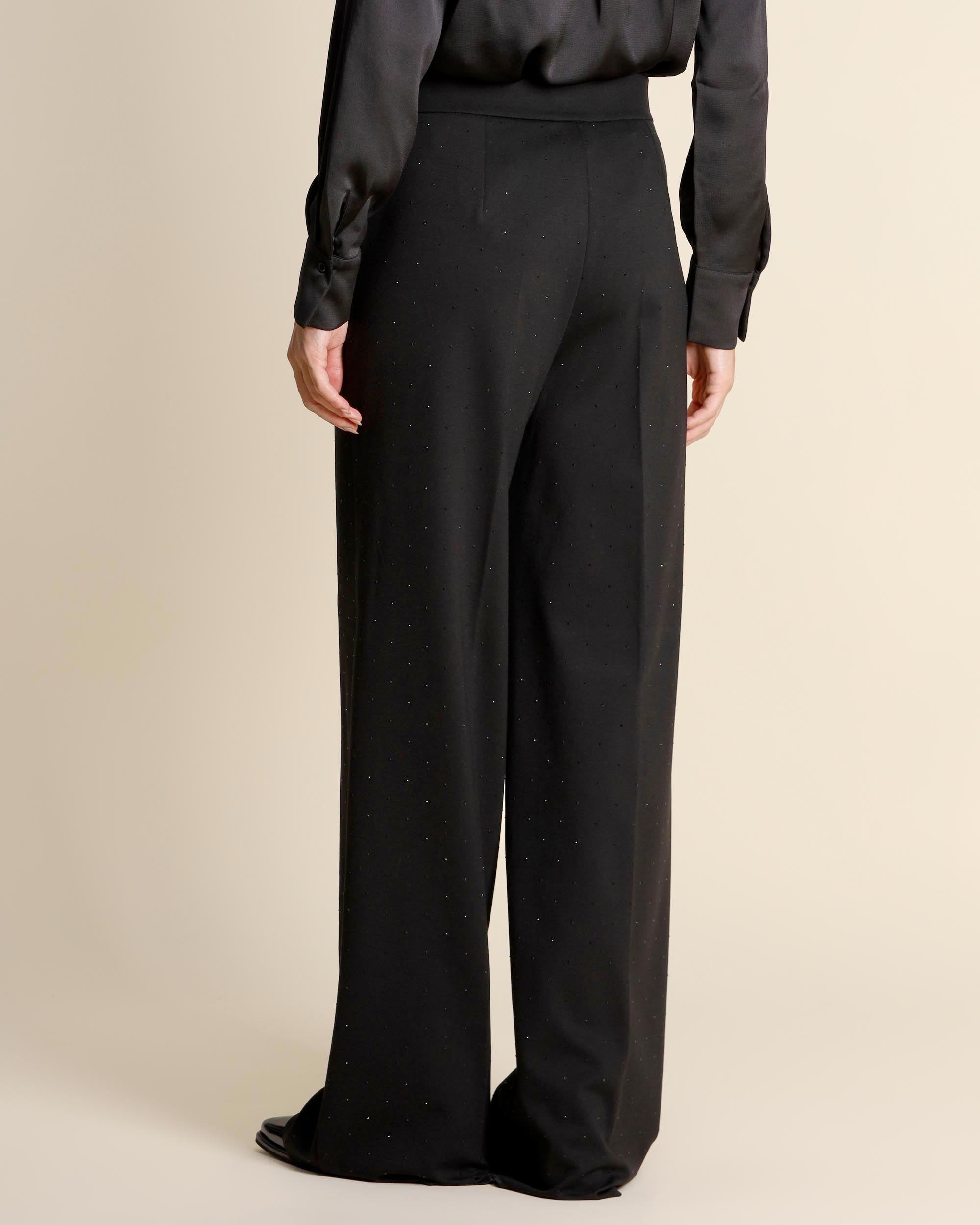 Pantaloni neri in jersey di misto viscosa stretch con appliacazione di piccoli strass in tinta, chiusura con bottone a pressione e zip nascosti, tasche alla francese, linea dritta, piega stirata, la modella indossa una tg.42, la modella ha le seguenti misure: altezza 173, seno 86,vita 65, fianchi 93, collezione donna Emme by Marella Autunno Inverno 2025/26