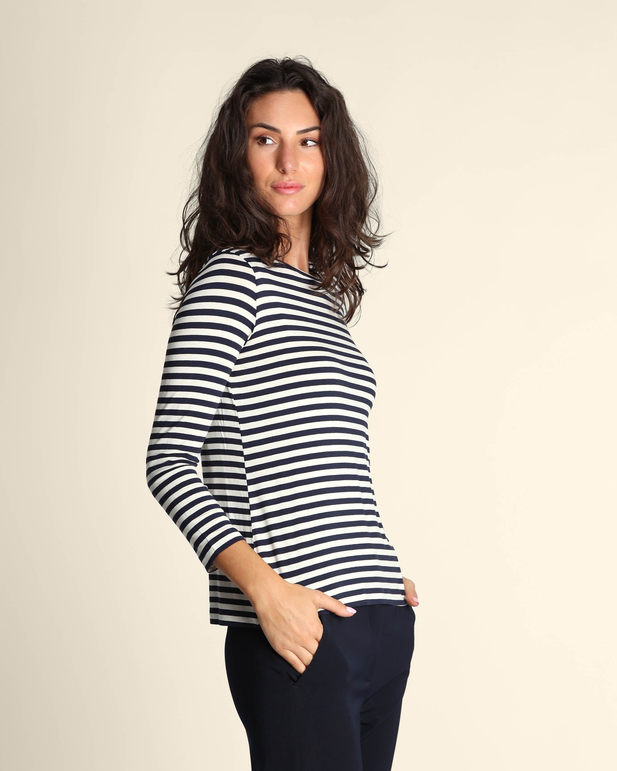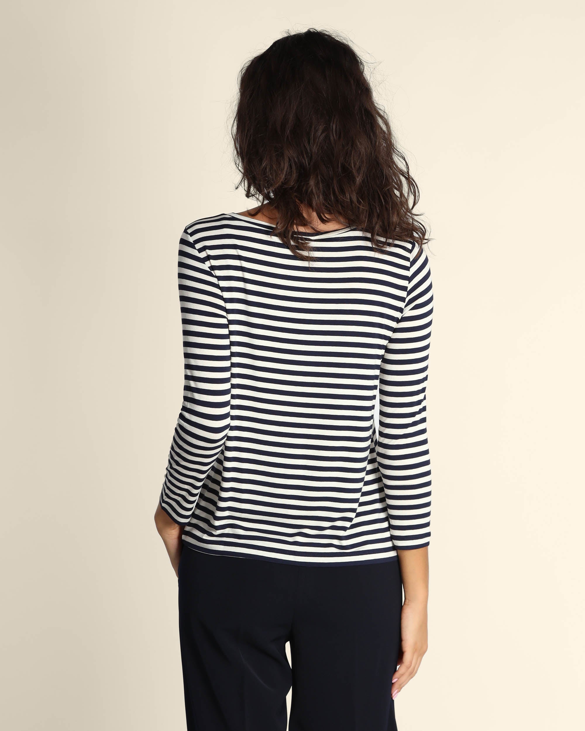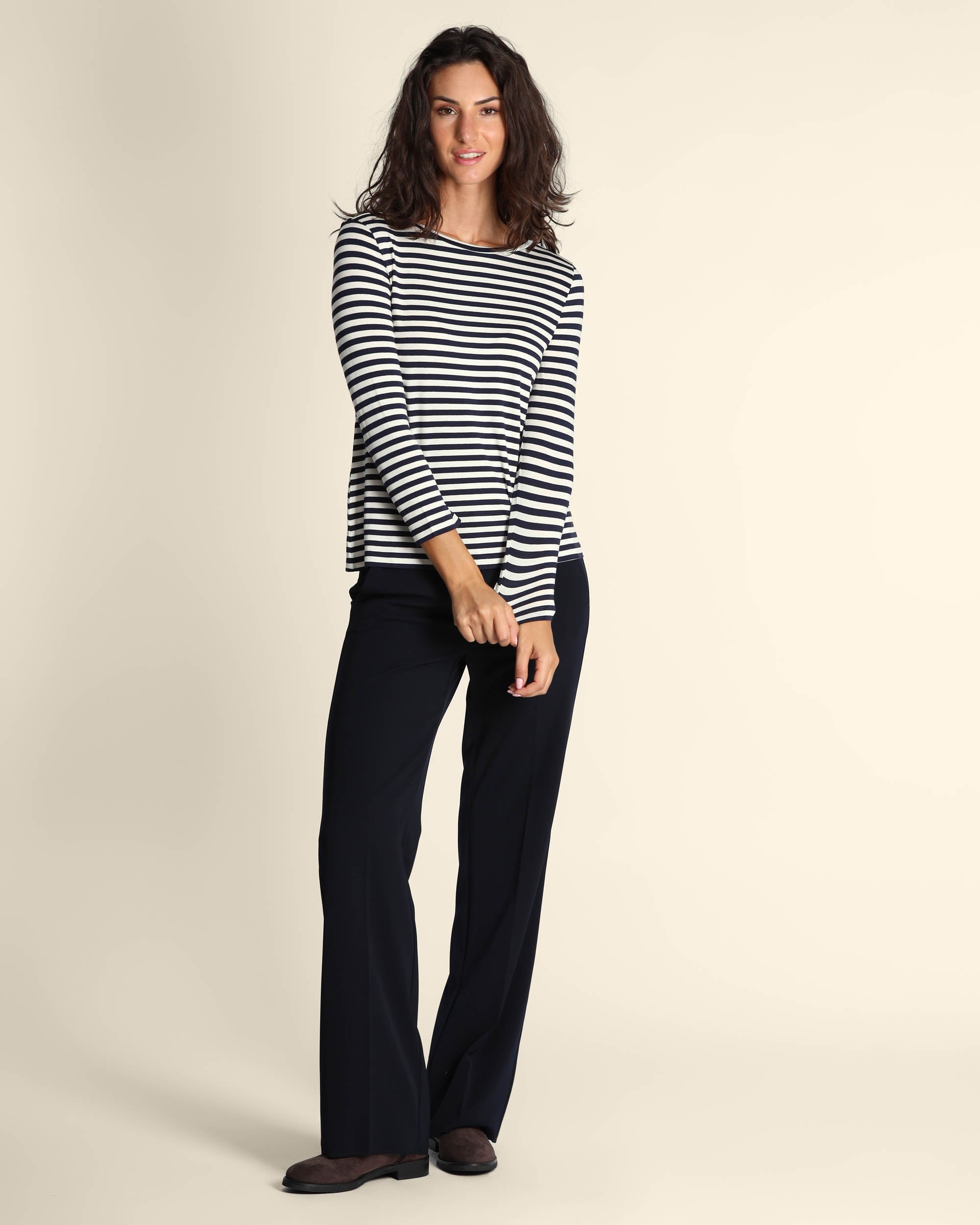 T shirt blu in jersey di viscosa stretch, scollo a barchetta, maniche lunghe, linea dritta, la modella indossa una tg.S, la modella ha le seguenti misure: altezza 179, seno 84, vita 63, fianchi 94, collezione donna Emme by Marella Autunno Inverno 2025/26