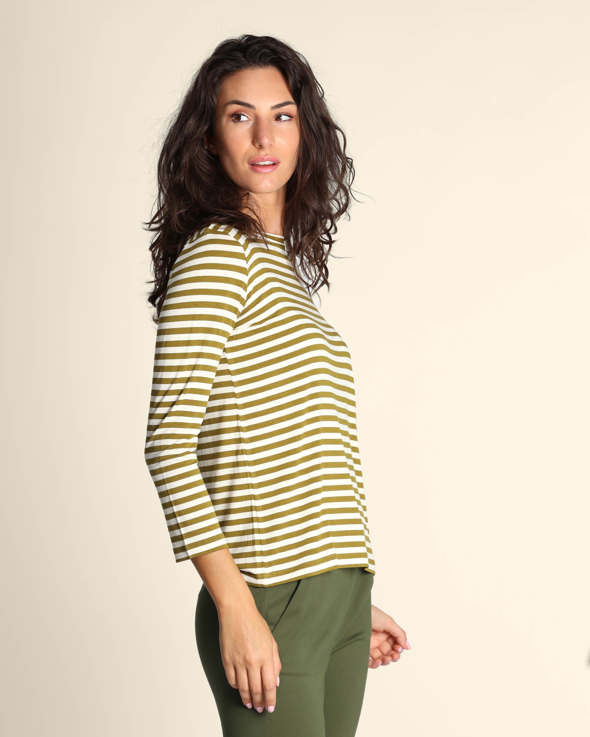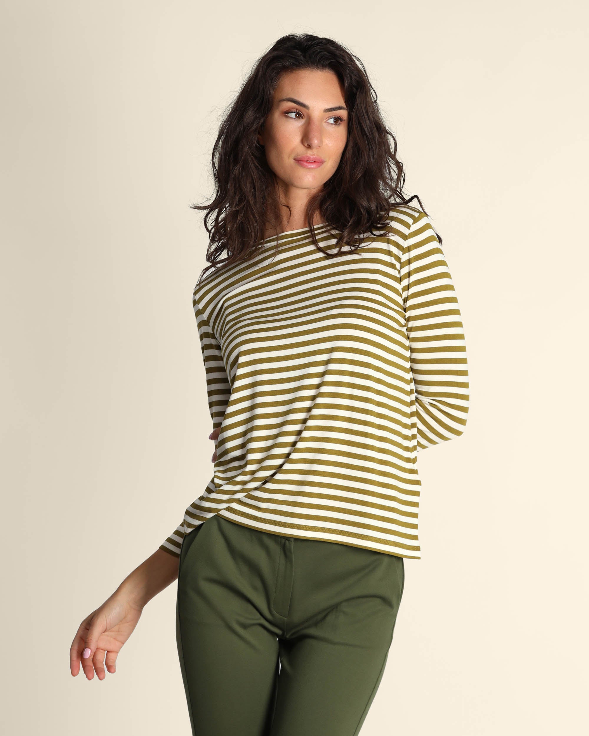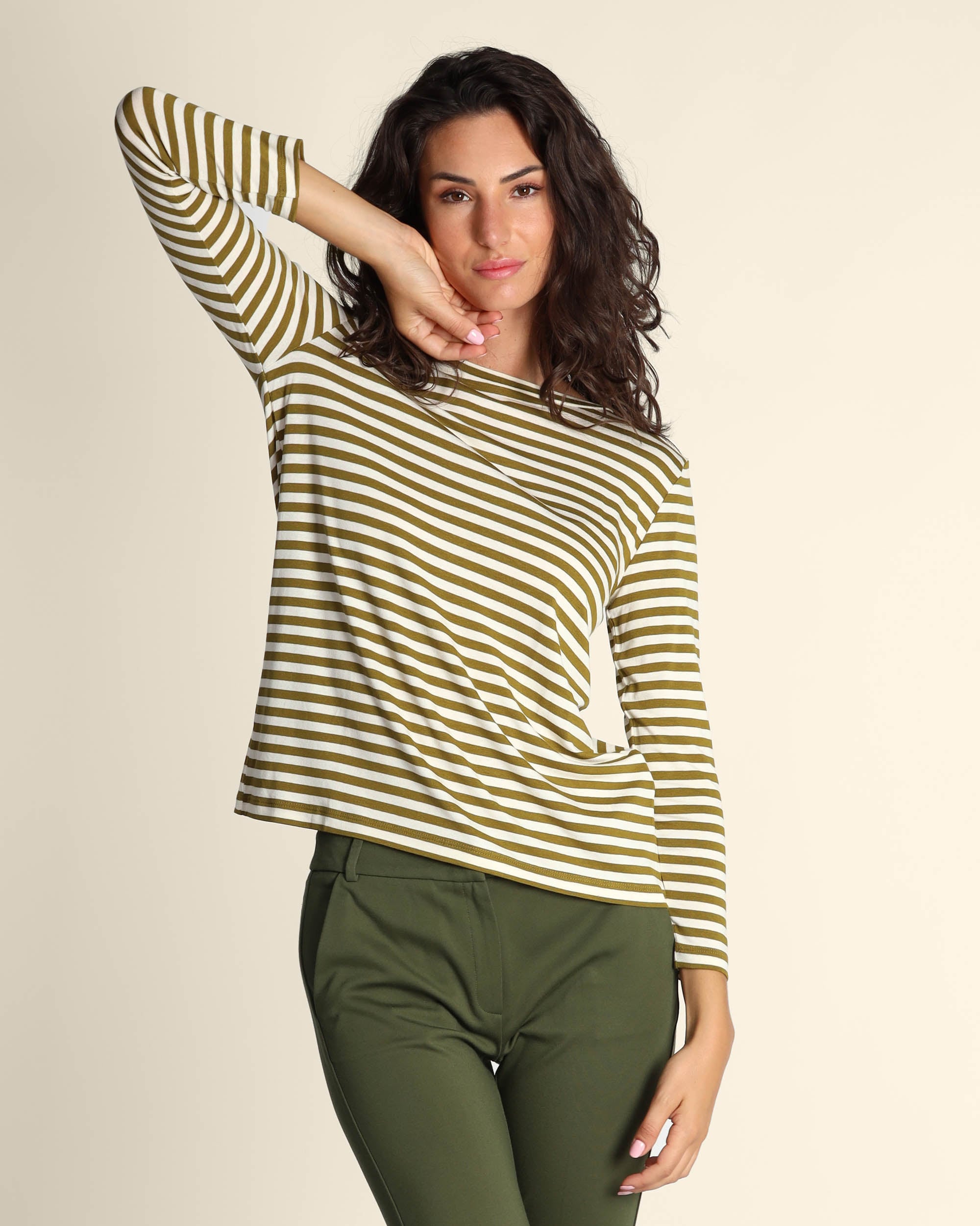 T shirt verde a righe in jersey di viscosa stretch, scollo a barchetta, maniche lunghe, linea dritta, la modella indossa una tg.S, la modella ha le seguenti misure: altezza 179, seno 84, vita 63, fianchi 94, collezione donna Emme by Marella Autunno Inverno 2025/26