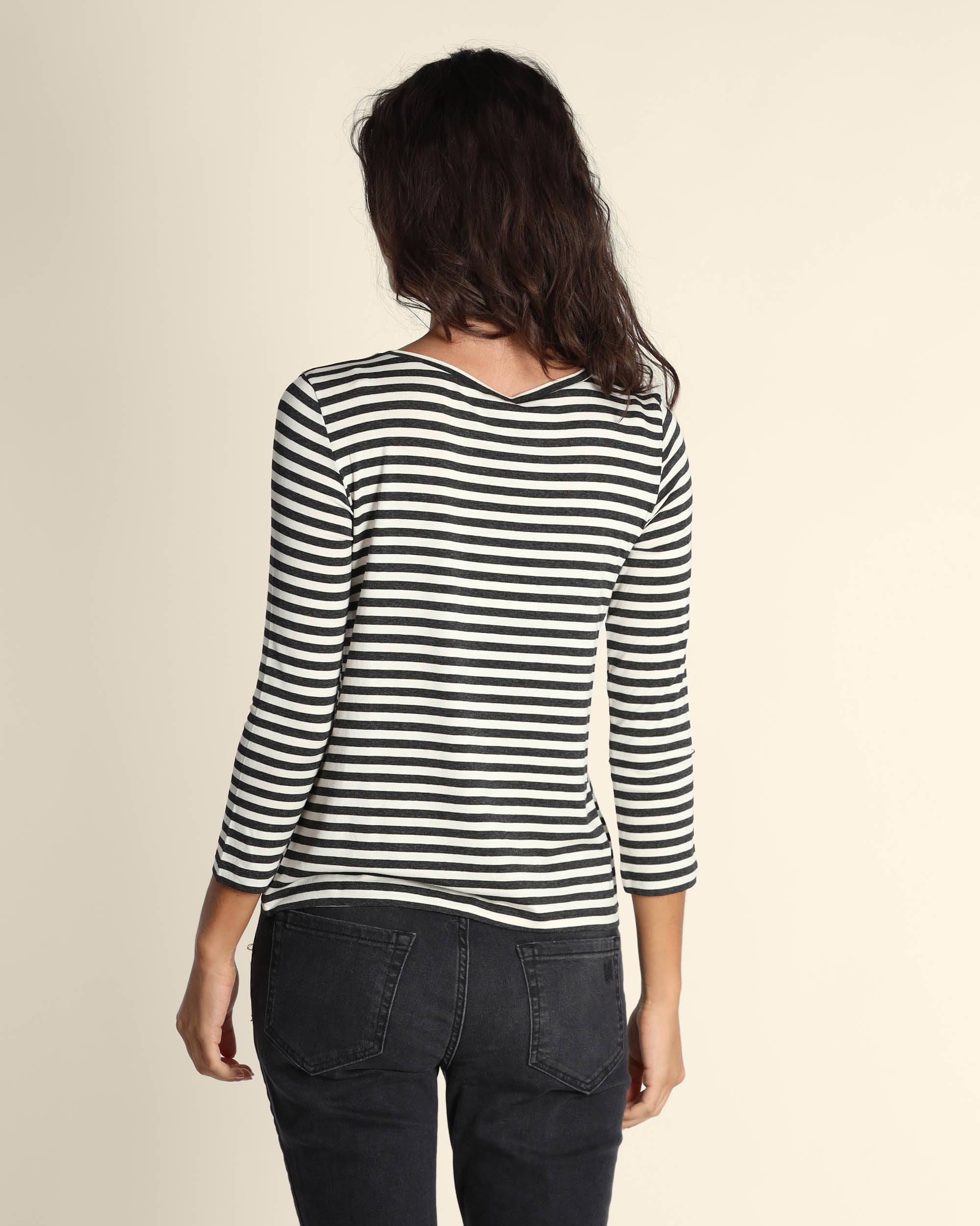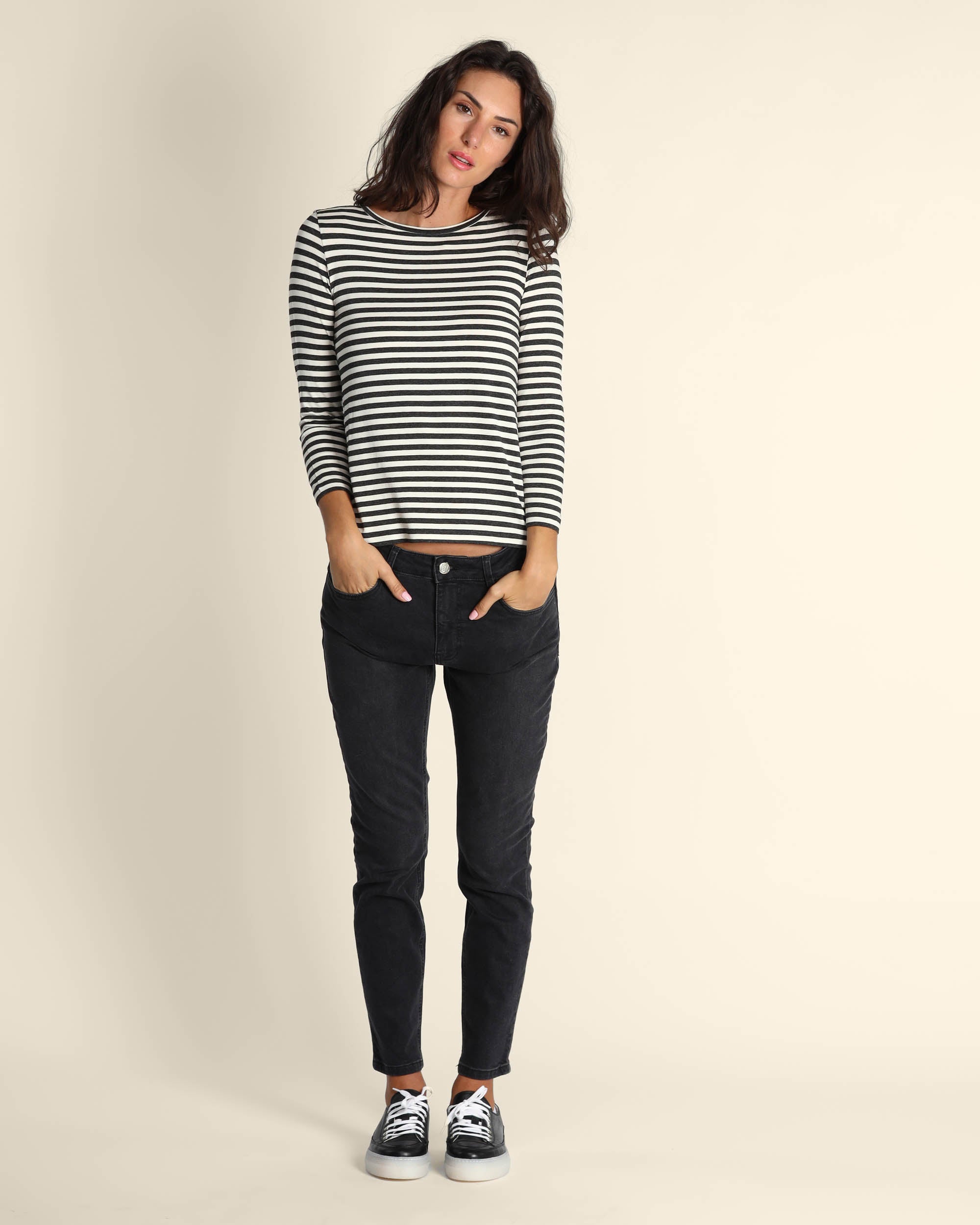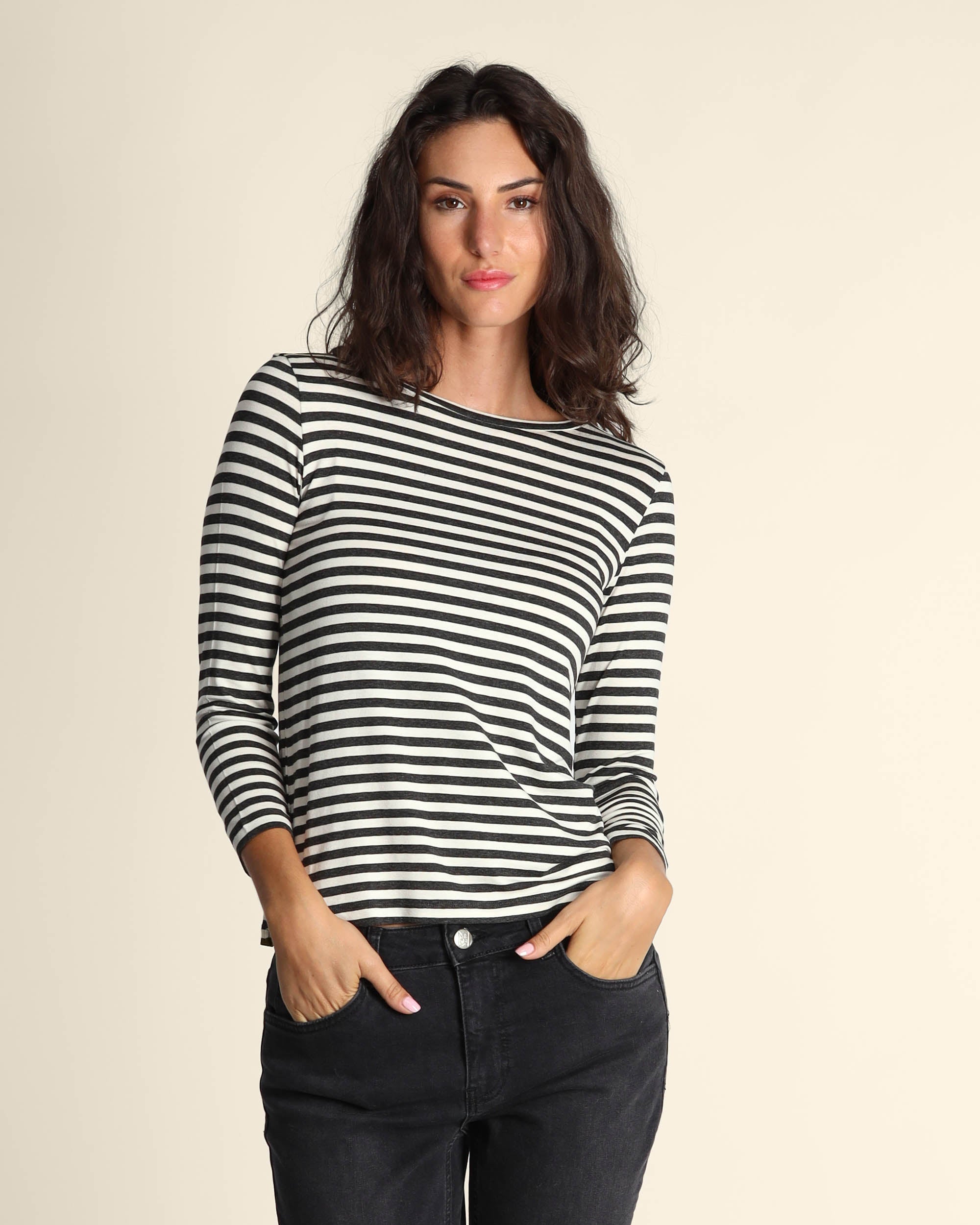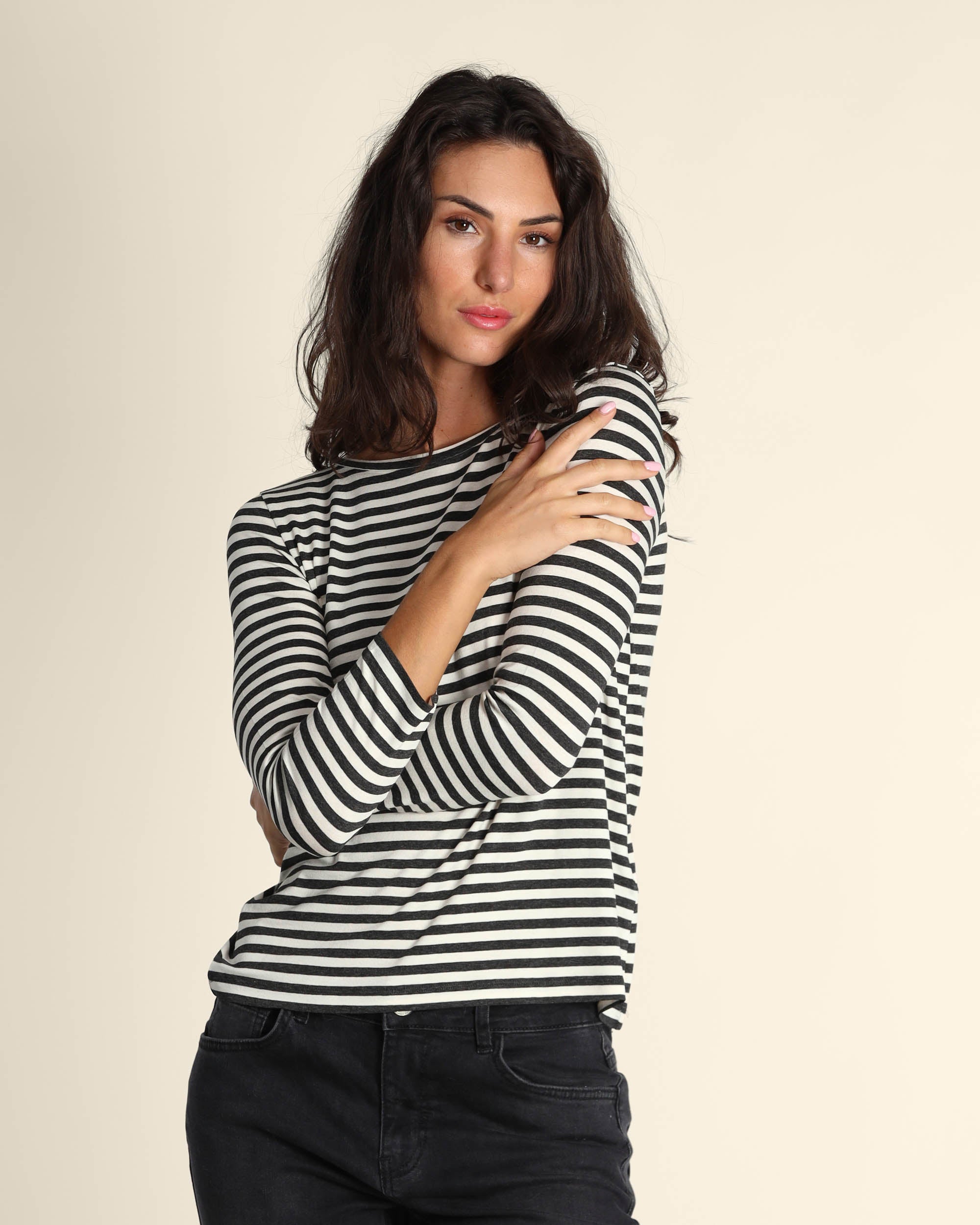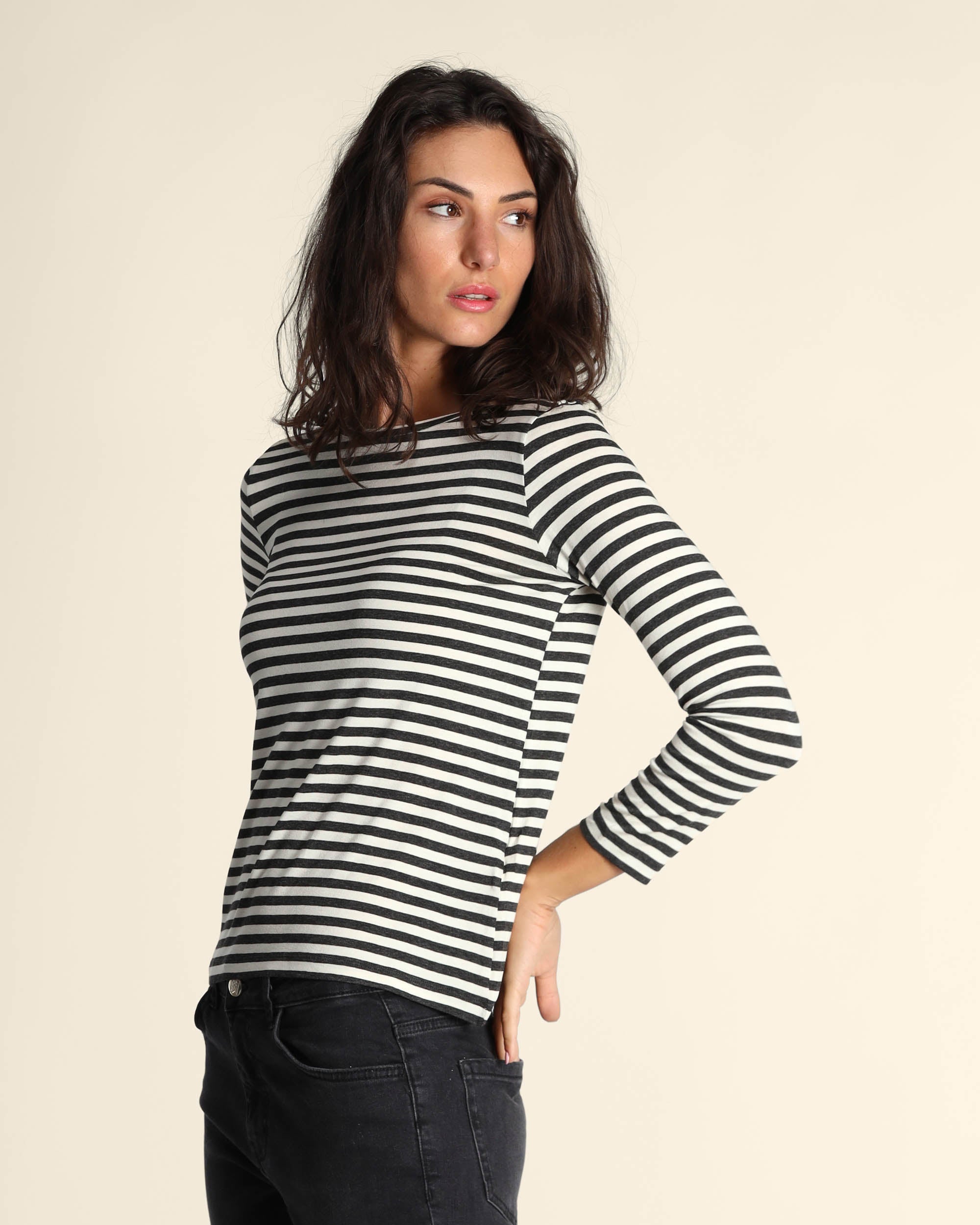 T shirt grigio antracite in jersey di viscosa stretch, scollo a barchetta, maniche lunghe, linea dritta, la modella indossa una tg.S, la modella ha le seguenti misure: altezza 179, seno 84, vita 63, fianchi 94, collezione donna Emme by Marella Autunno Inverno 2025/26