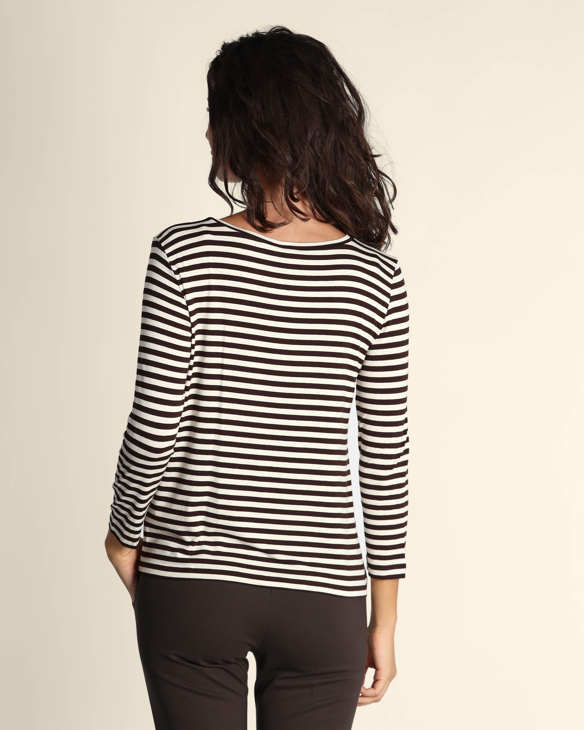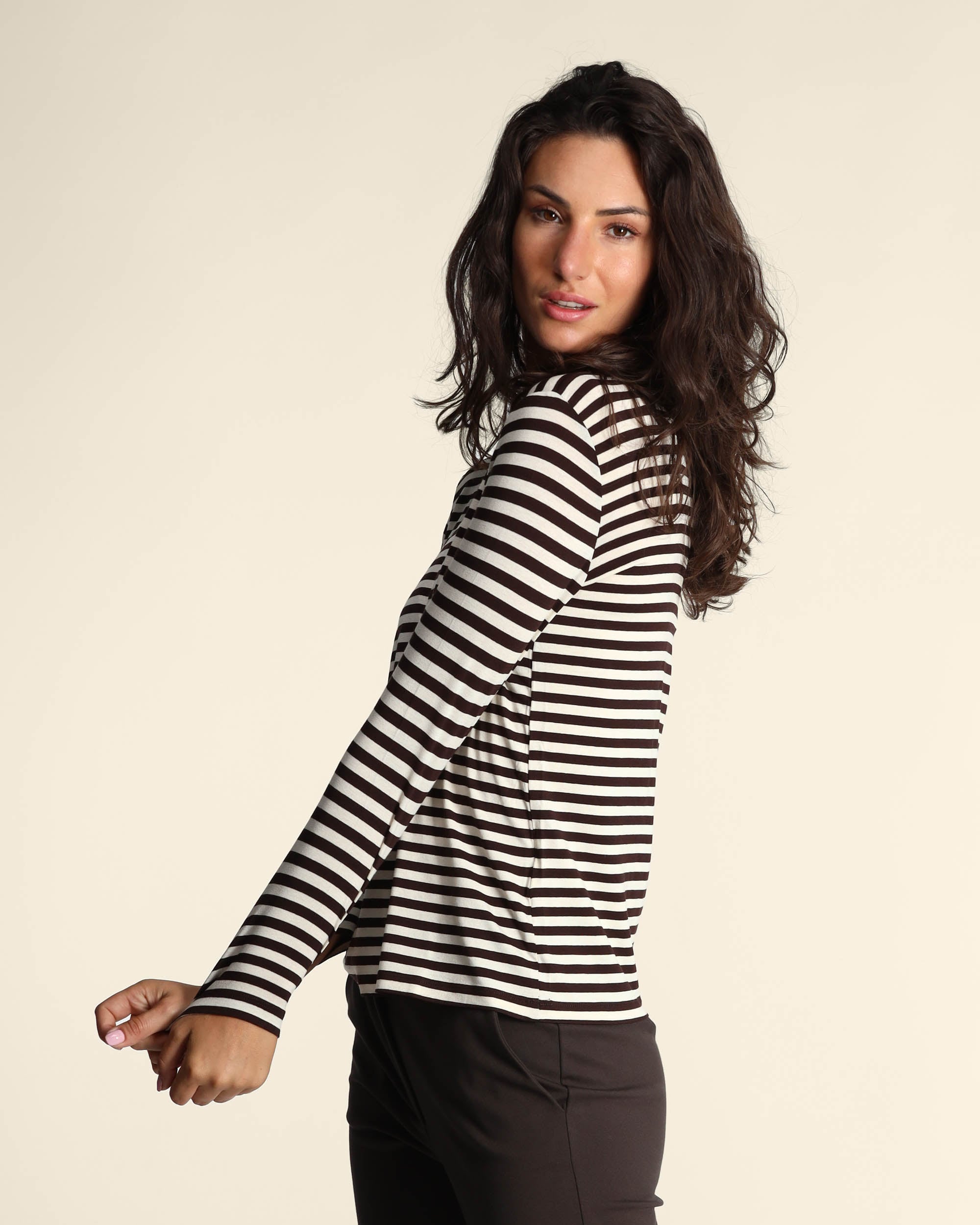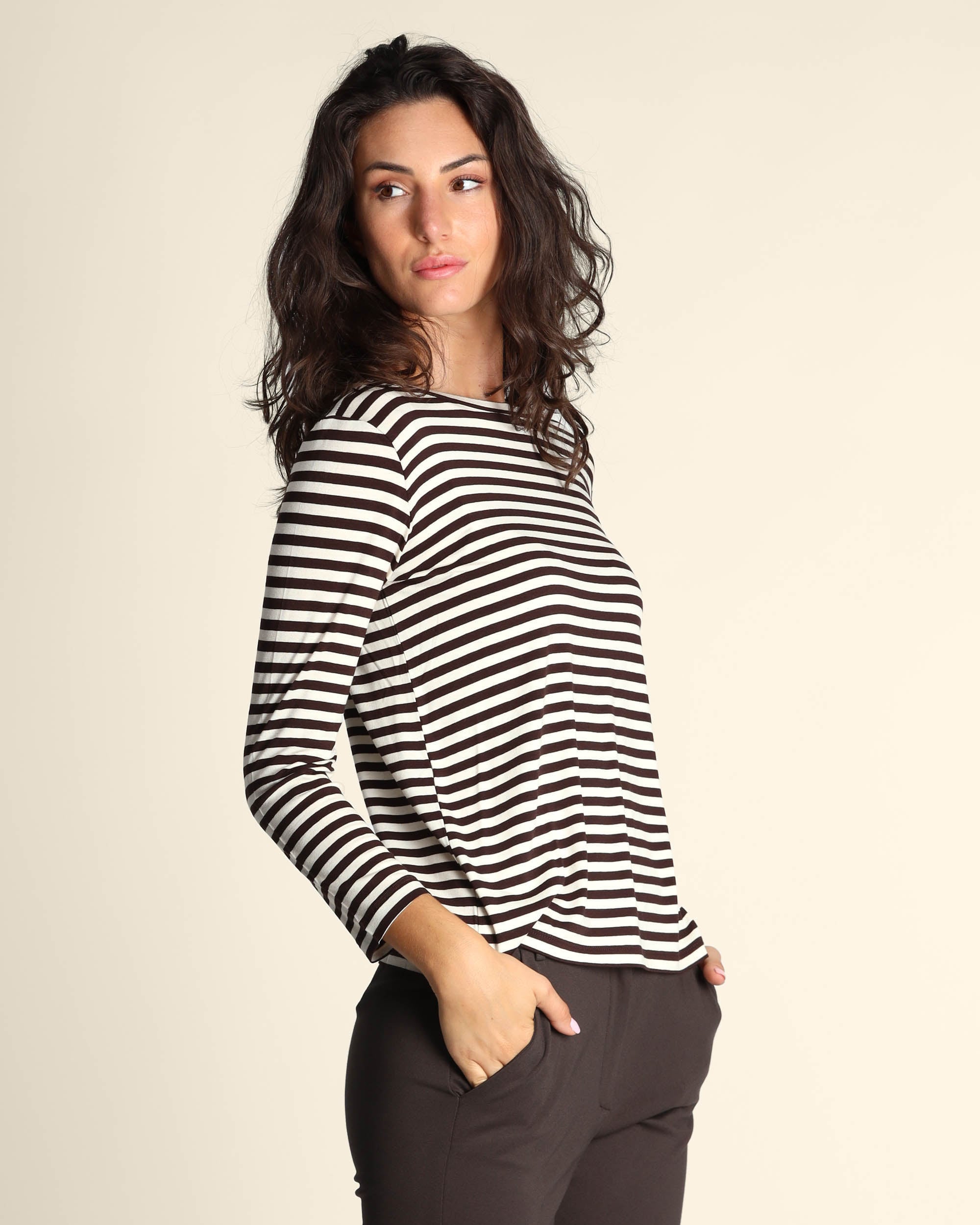 T shirt marrone a righe in jersey di viscosa stretch, scollo a barchetta, maniche lunghe, linea dritta, la modella indossa una tg.S, la modella ha le seguenti misure: altezza 179, seno 84, vita 63, fianchi 94, collezione donna Emme by Marella Autunno Inverno 2025/26