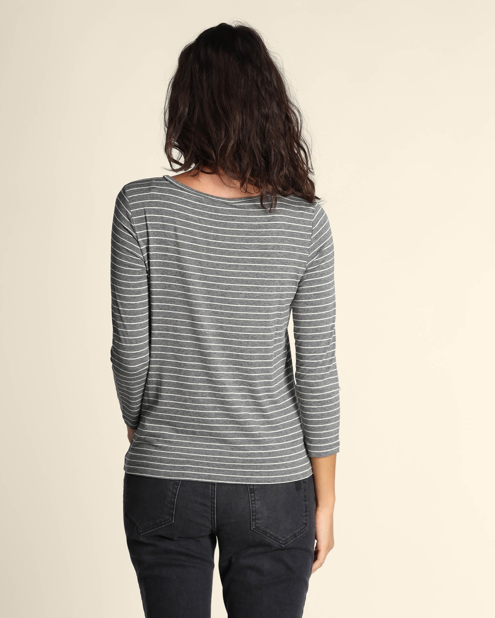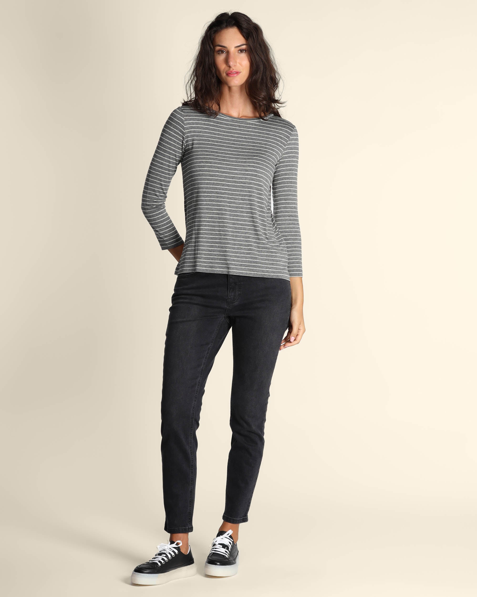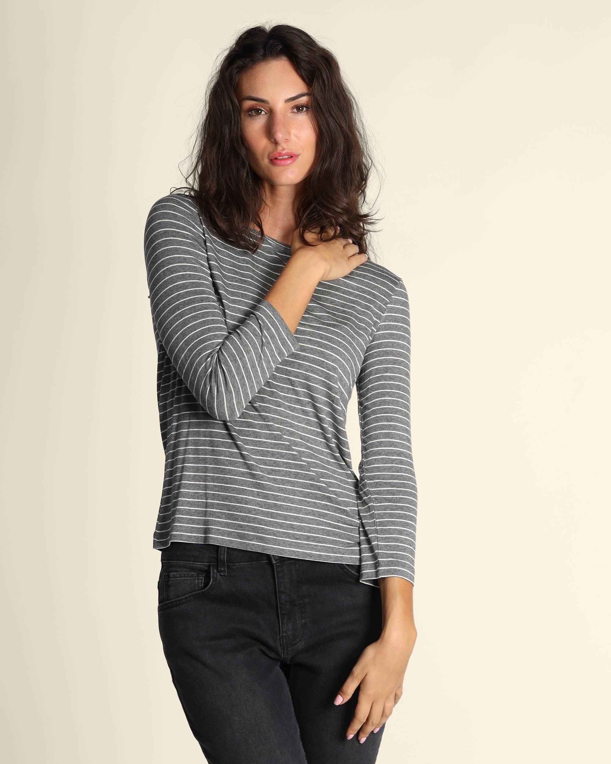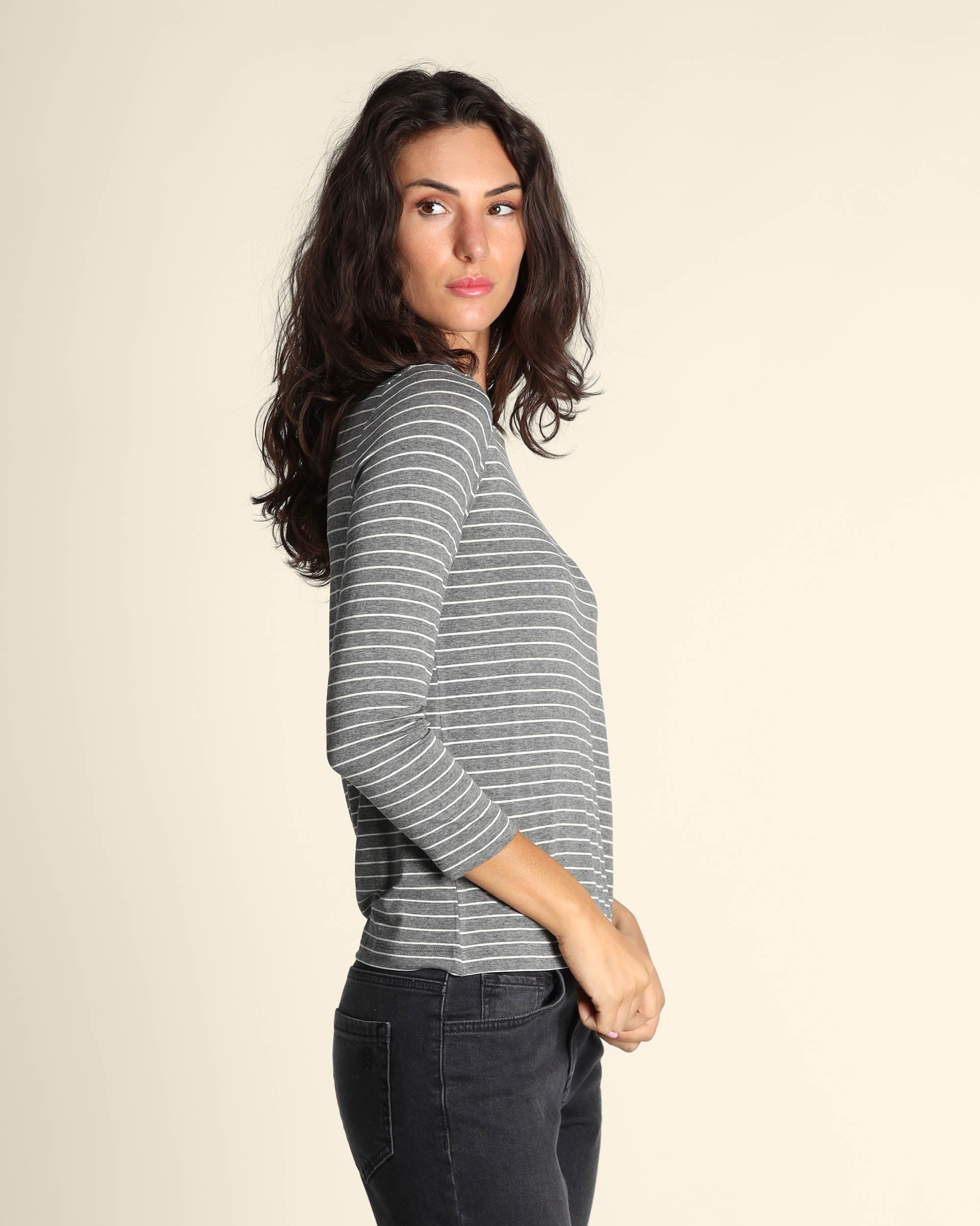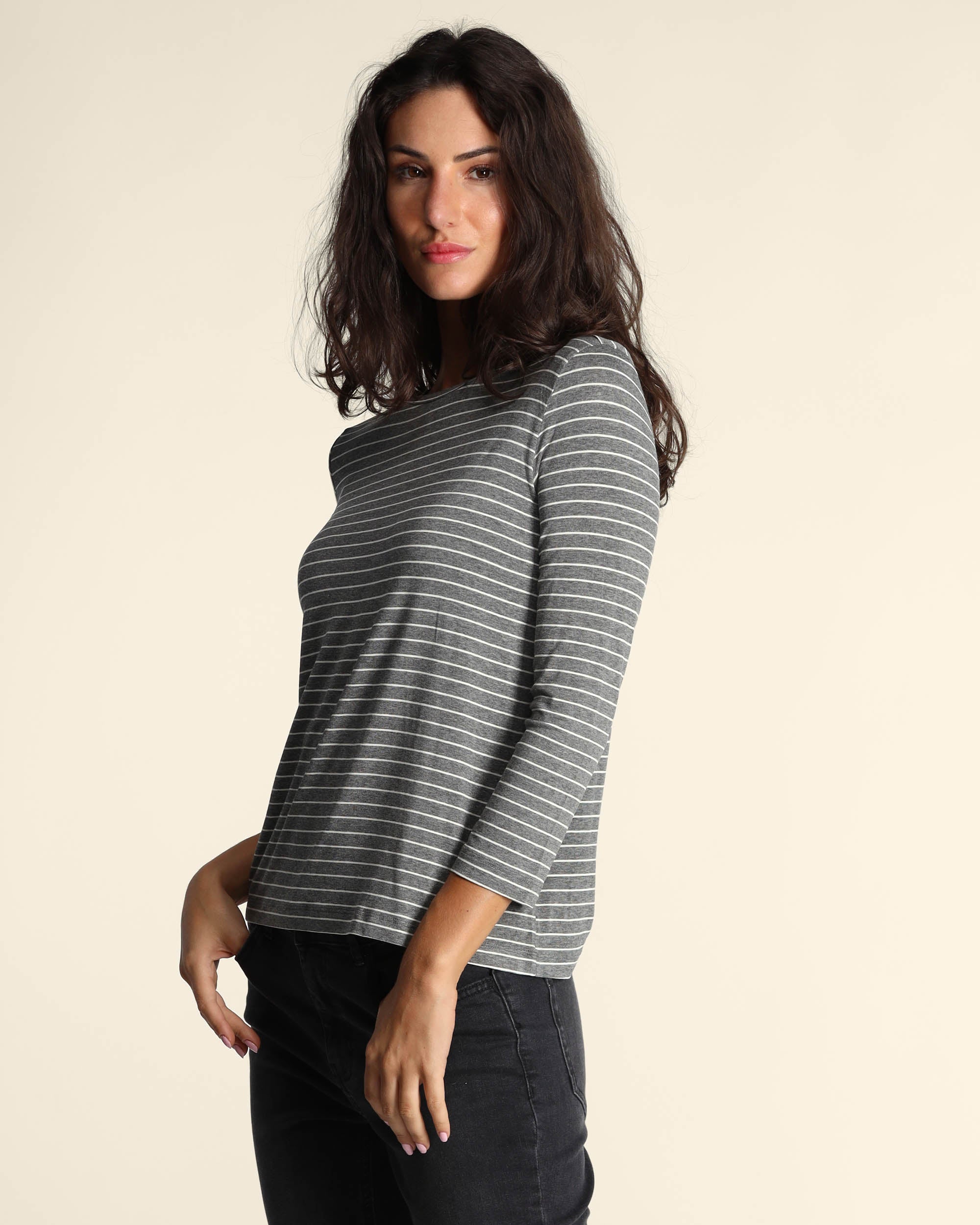 T shirt grigia a righe in jersey di viscosa stretch, scollo a barchetta, maniche lunghe, linea dritta, la modella indossa una tg.S, la modella ha le seguenti misure: altezza 179, seno 84, vita 63, fianchi 94, collezione donna Emme by Marella Autunno Inverno 2025/26
