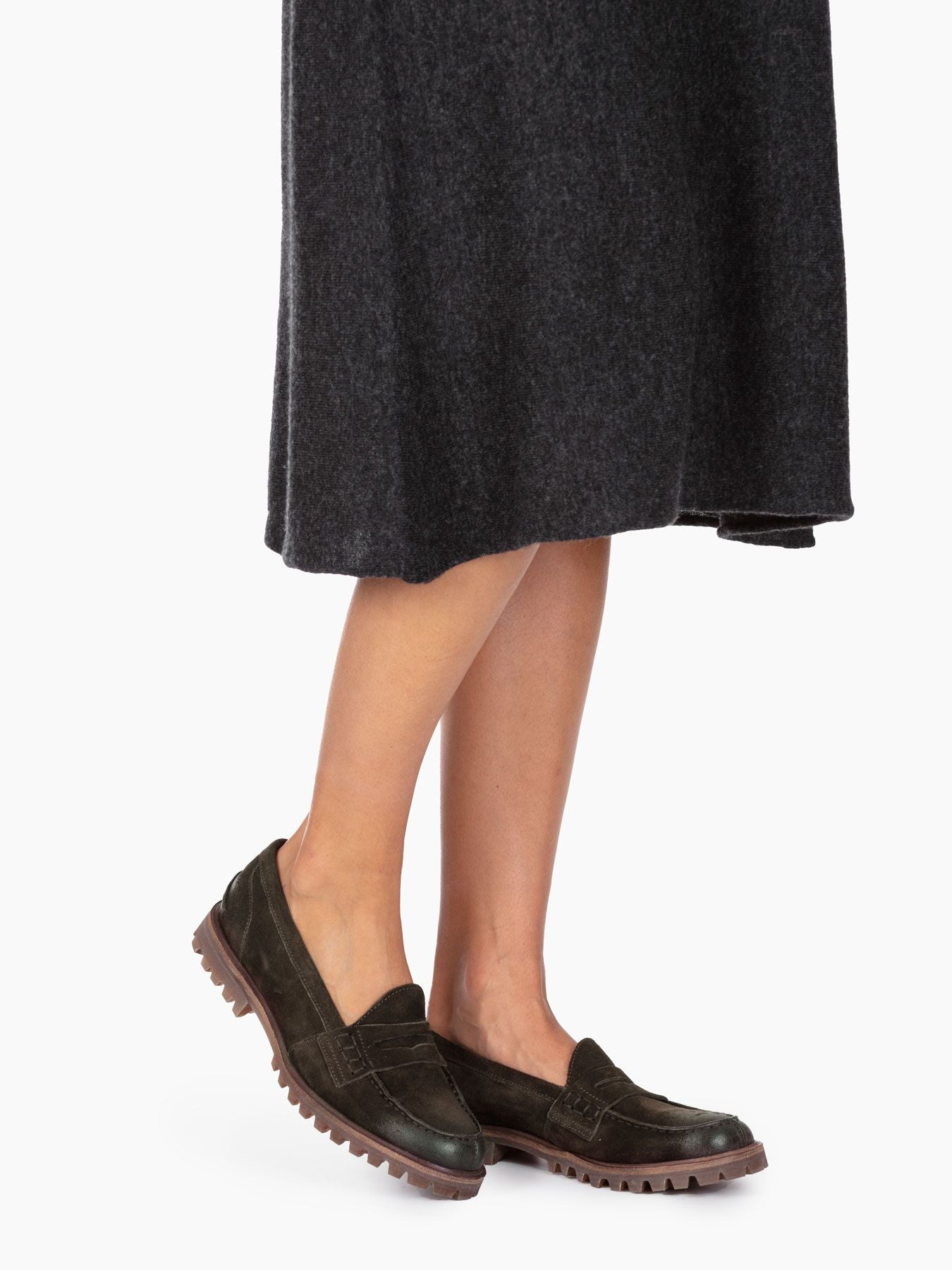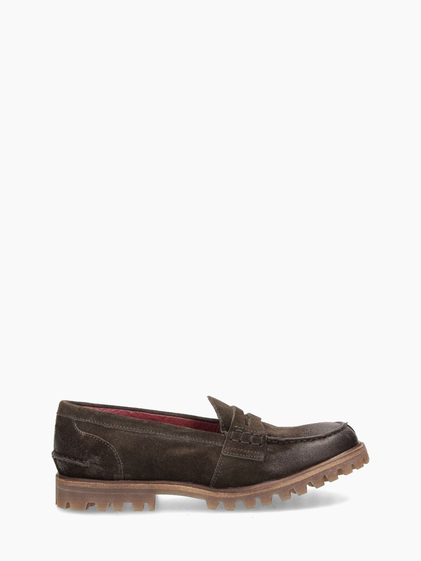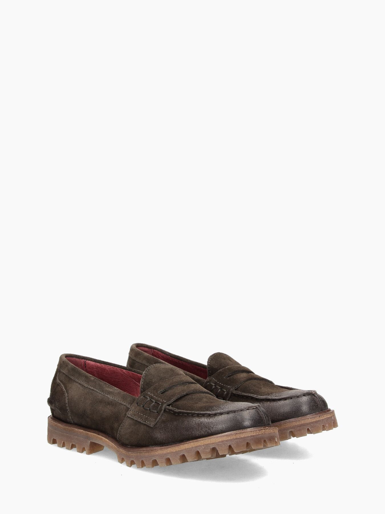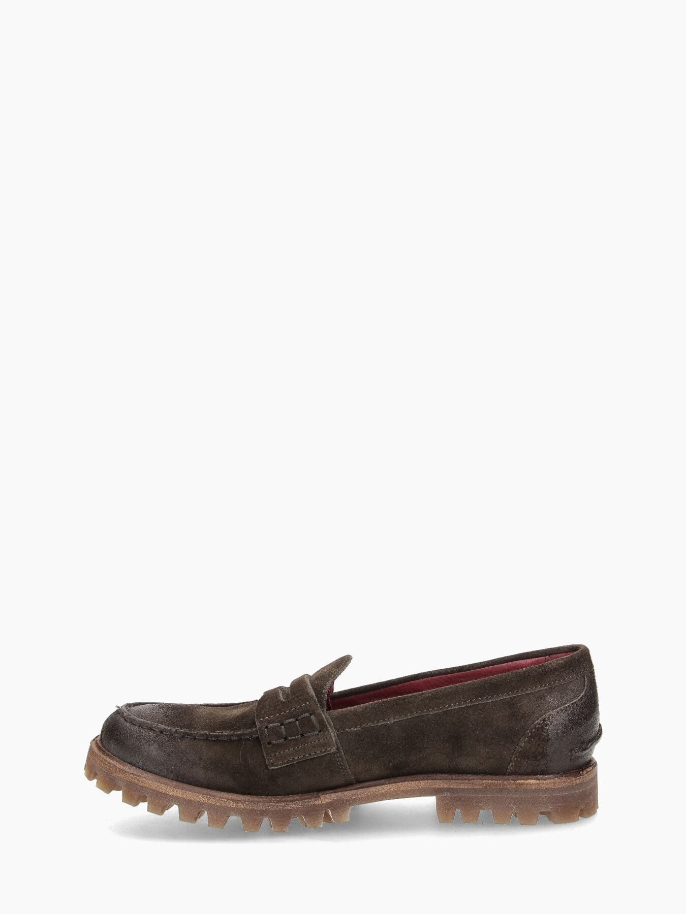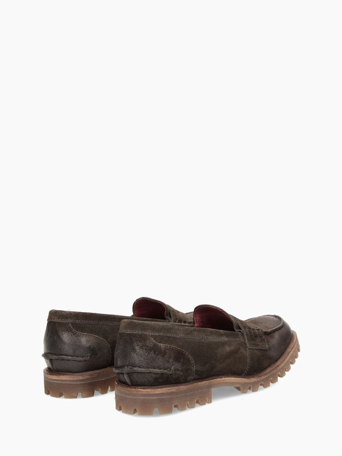 Mocassini in pelle scamosciata marrone tamponata effetto invecchiato, fodera in pelle, suola in gomma, tacco 20mm, punta tonda, sottopiede in pelle, made in Italy, collezione donna Juliette Vico Autunno Inverno 2020/2021