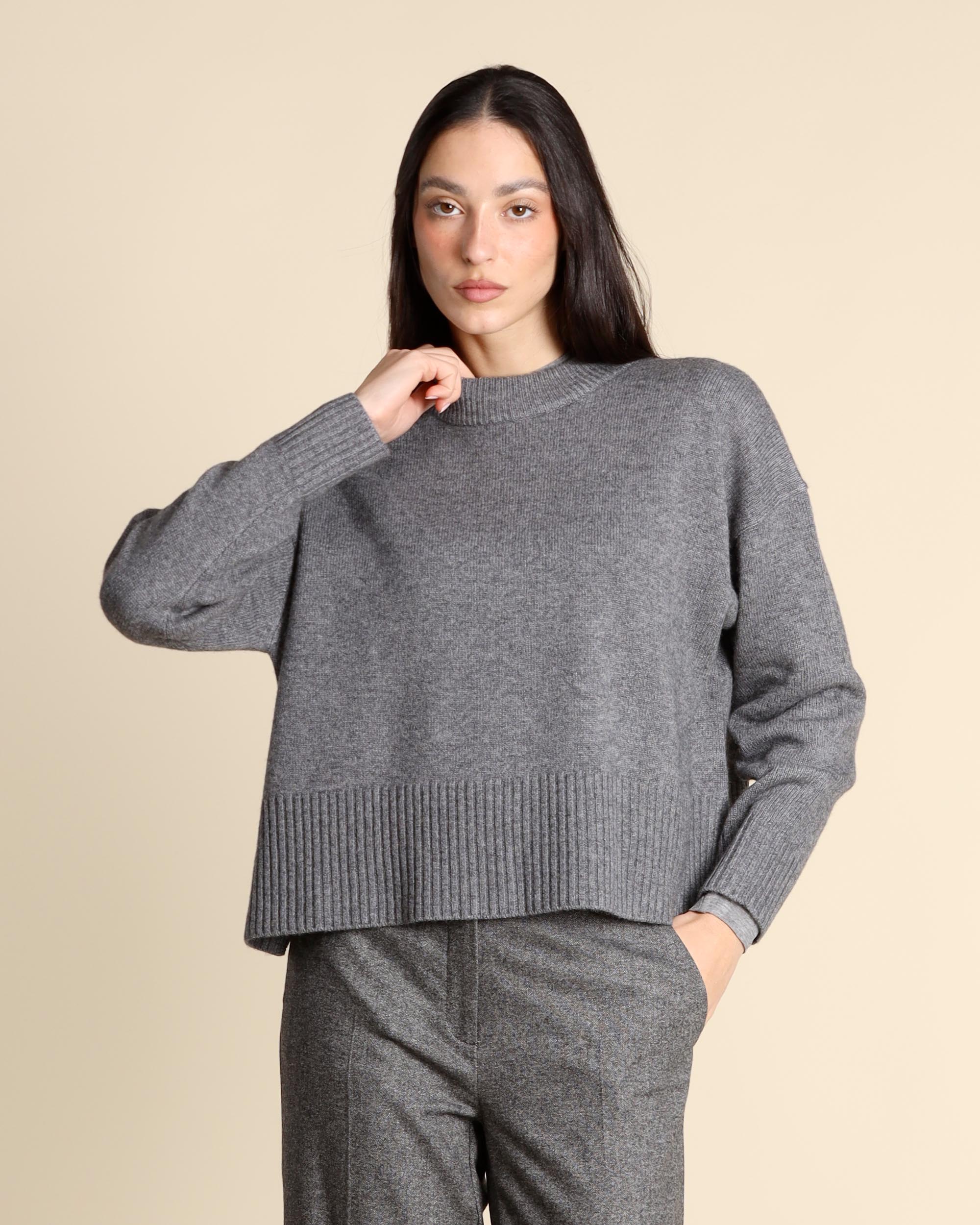 Maglia grigio melange in misto lana e cashmere, scollo tondo, maniche lunghe, giro sceso, linea boxy, la modella indossa una tg.S, la modella ha le seguenti misure: altezza 179, seno 84, vita 63, fianchi 94, collezione donna I Blues Autunno Inverno 2025/26