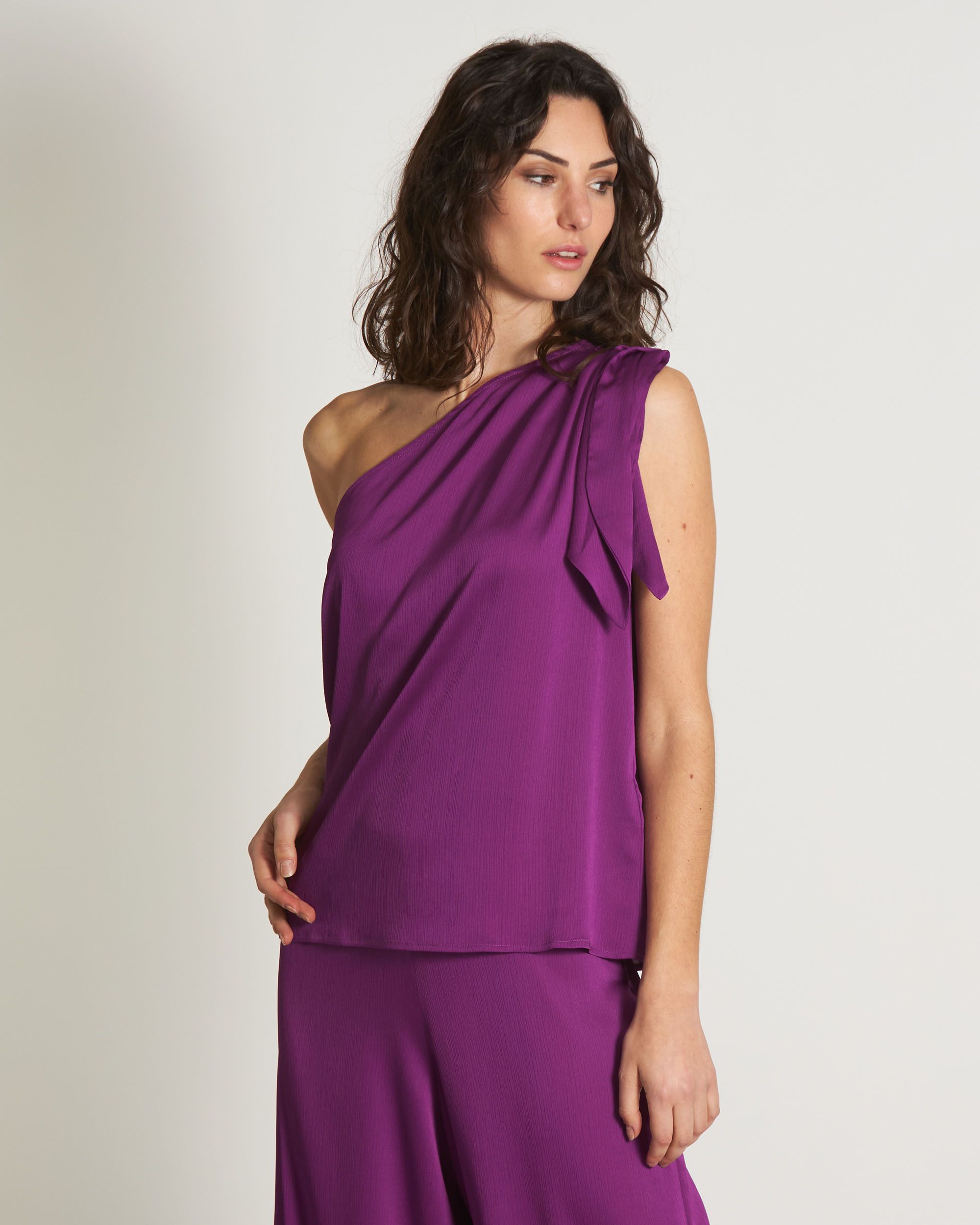 Top in creponne lucido color ciclamino con texture goffrata, monospalla, scollo asimmetrico, spalla con arricciatura e nodo, linea morbida, Elisa indossa una tg.42, Elisa ha le seguenti misure: altezza 179, seno 84, vita 63, fianchi 94, collezione donna Emme by Marella Primavera Estate 2024