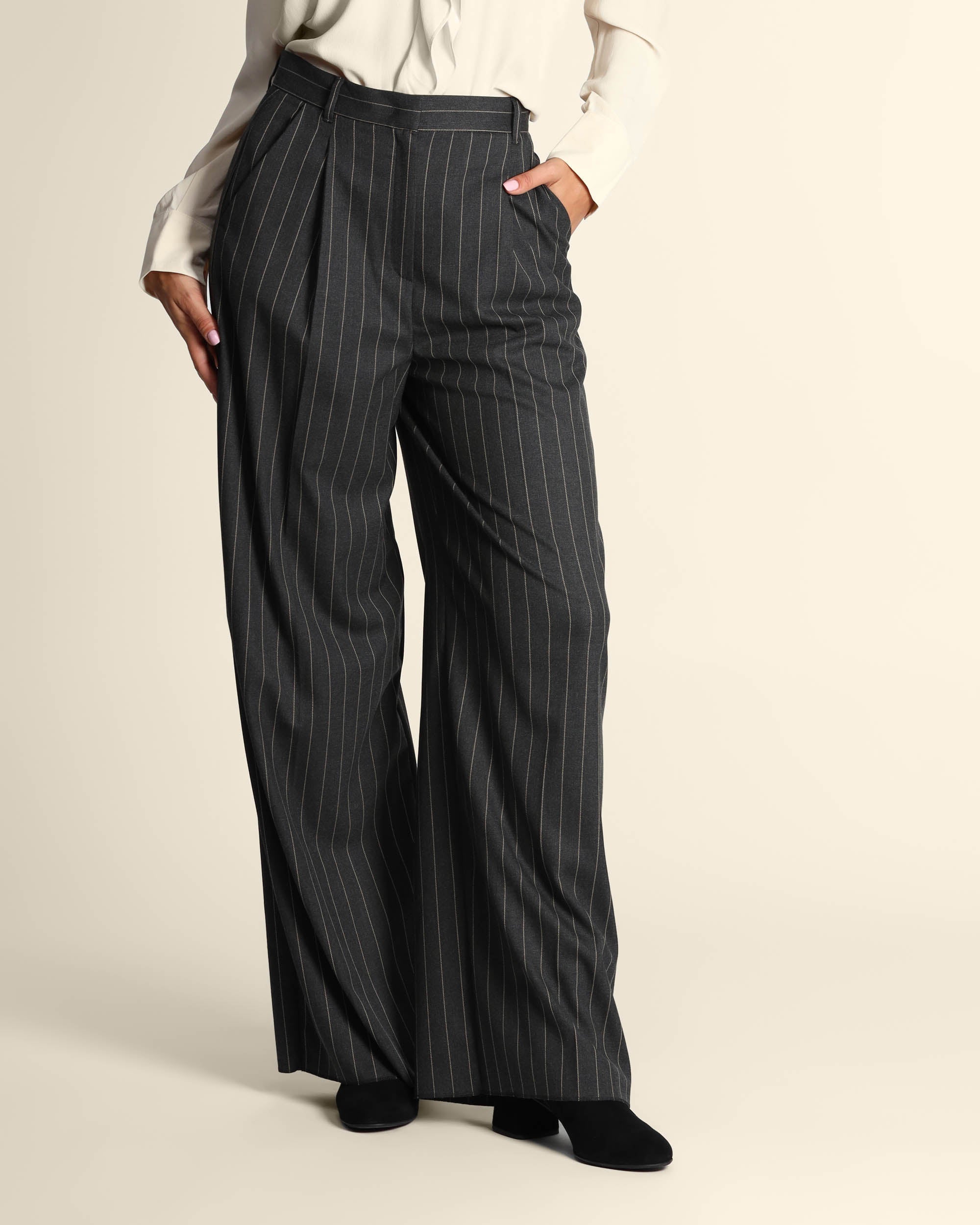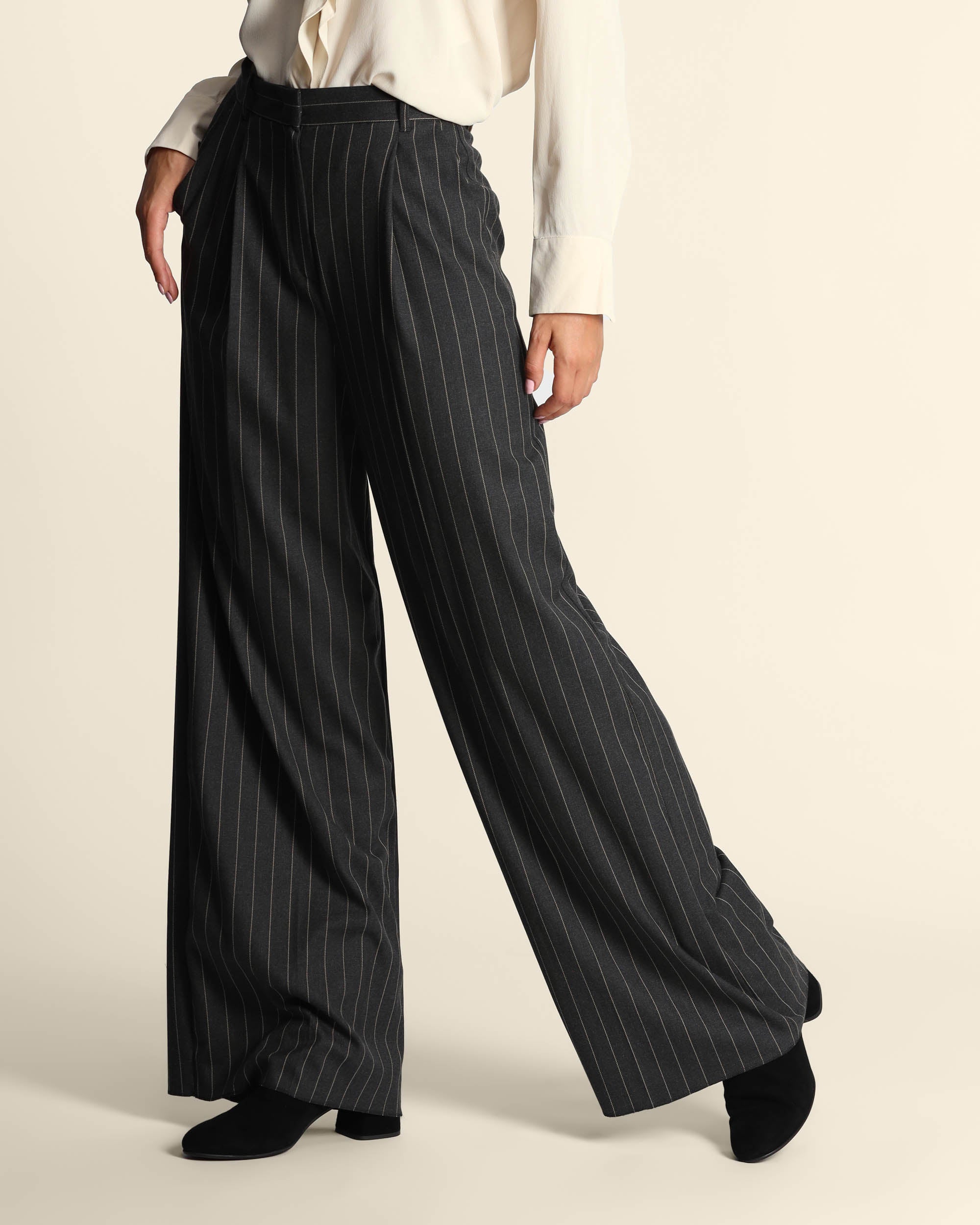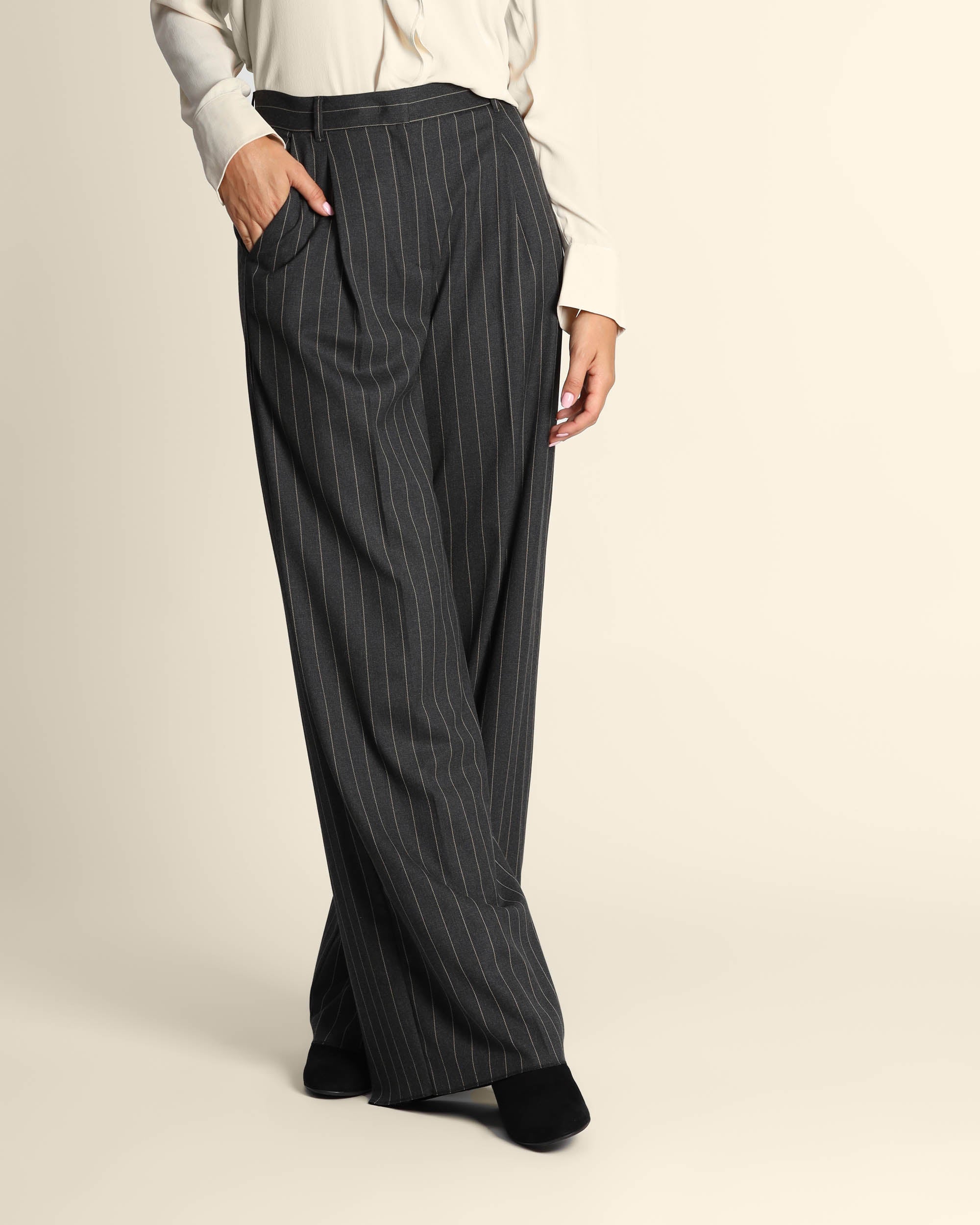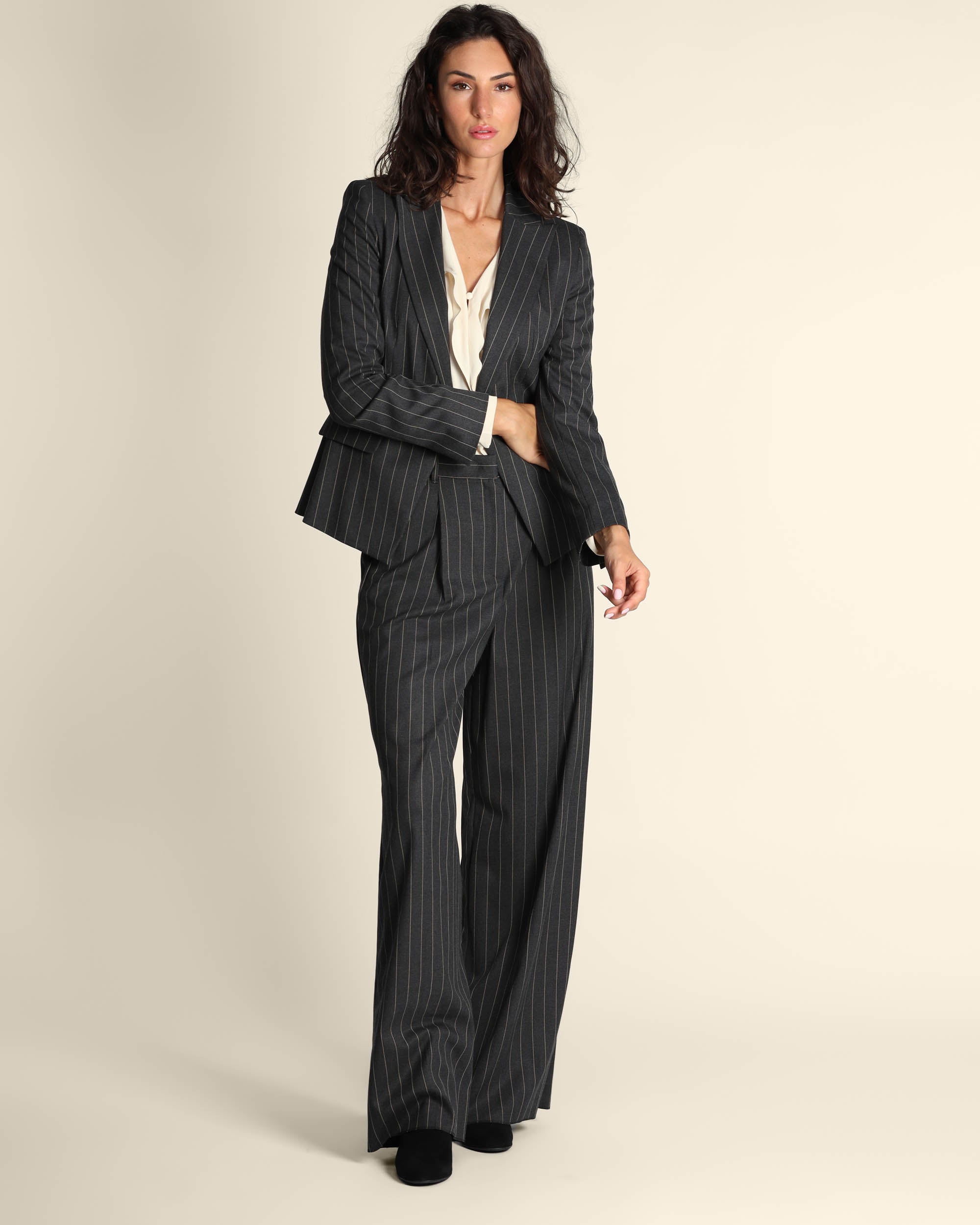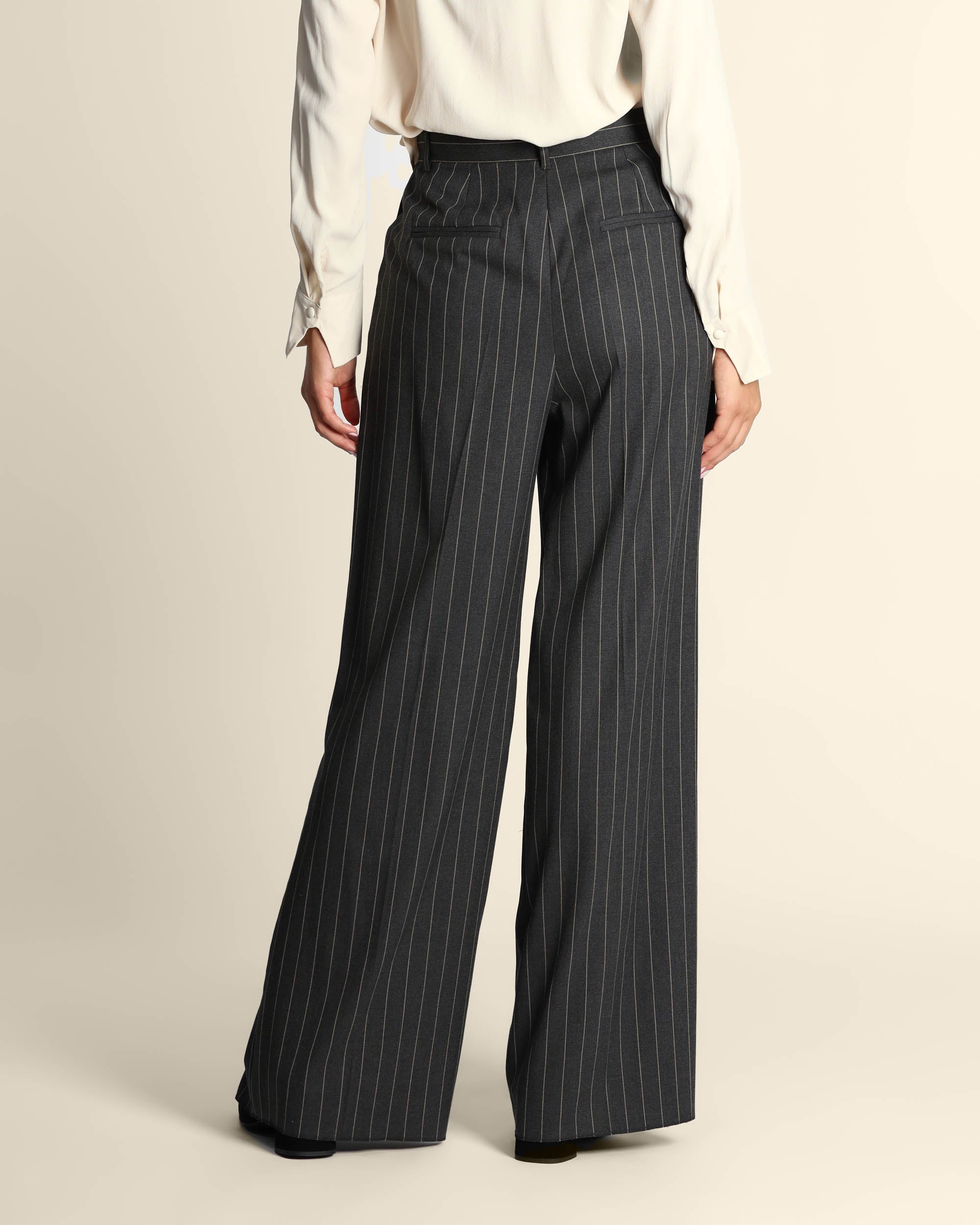 Pantaloni grigio scuro gessati in misto viscosa stretch, chiusura con gancio e zip nascosti, linea ampia, tasche alla francese sul davanti e tasche a filetto sul dietro, dettaglio di pinces, la modella indossa una tg.40, la modella ha le seguenti misure: altezza 178, seno 86,vita 65, fianchi 93, collezione donna Emme by Marella Autunno Inverno 2025/26