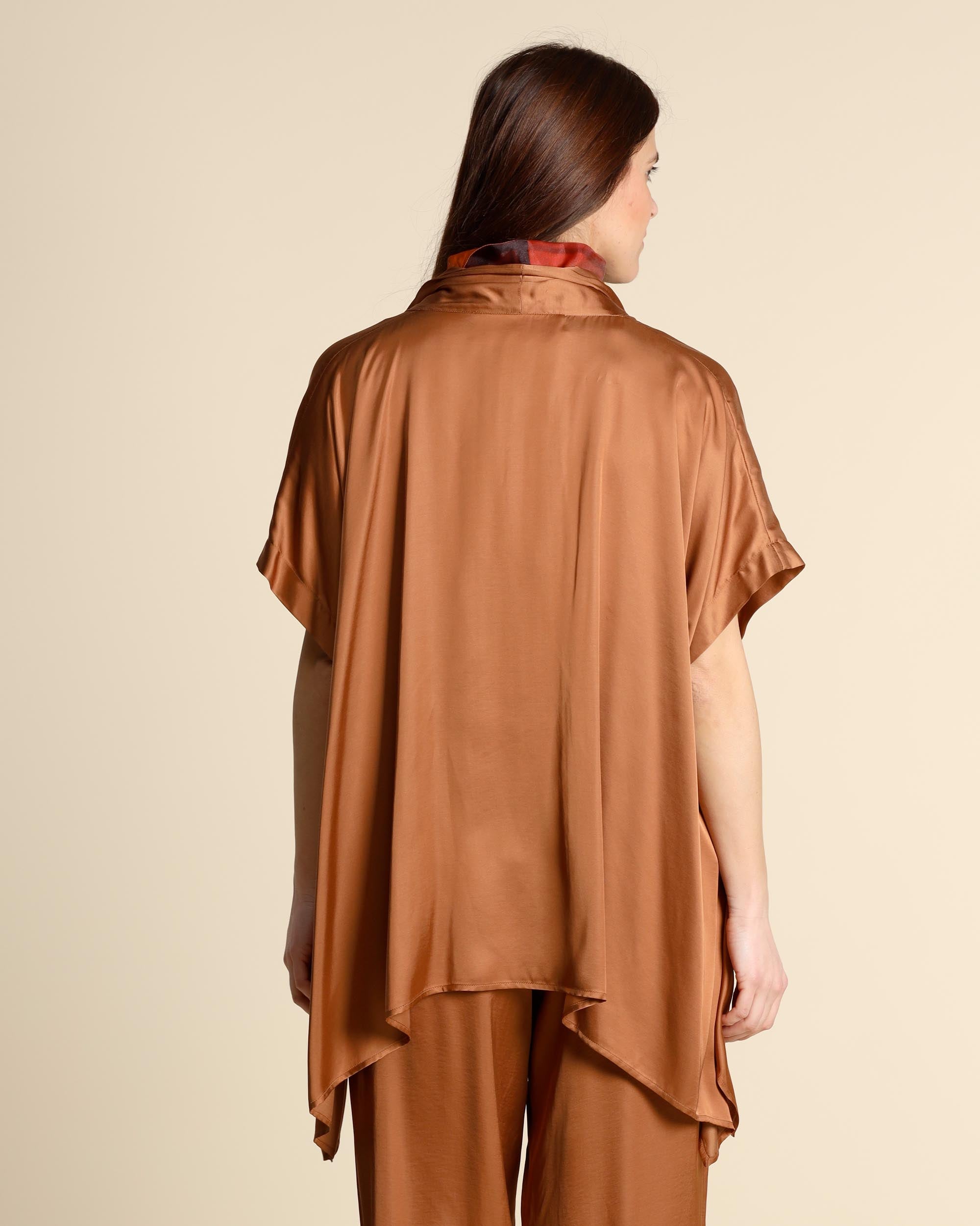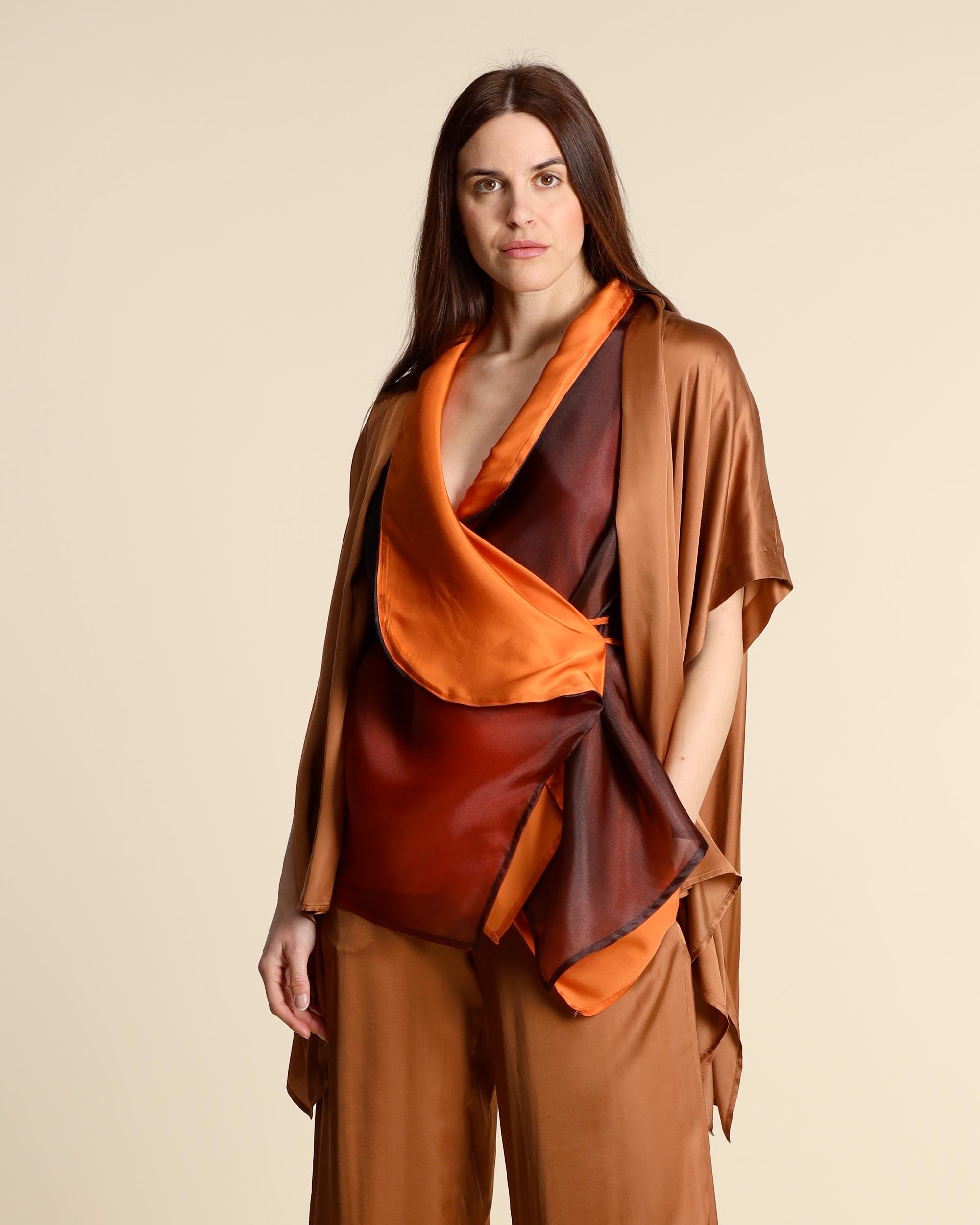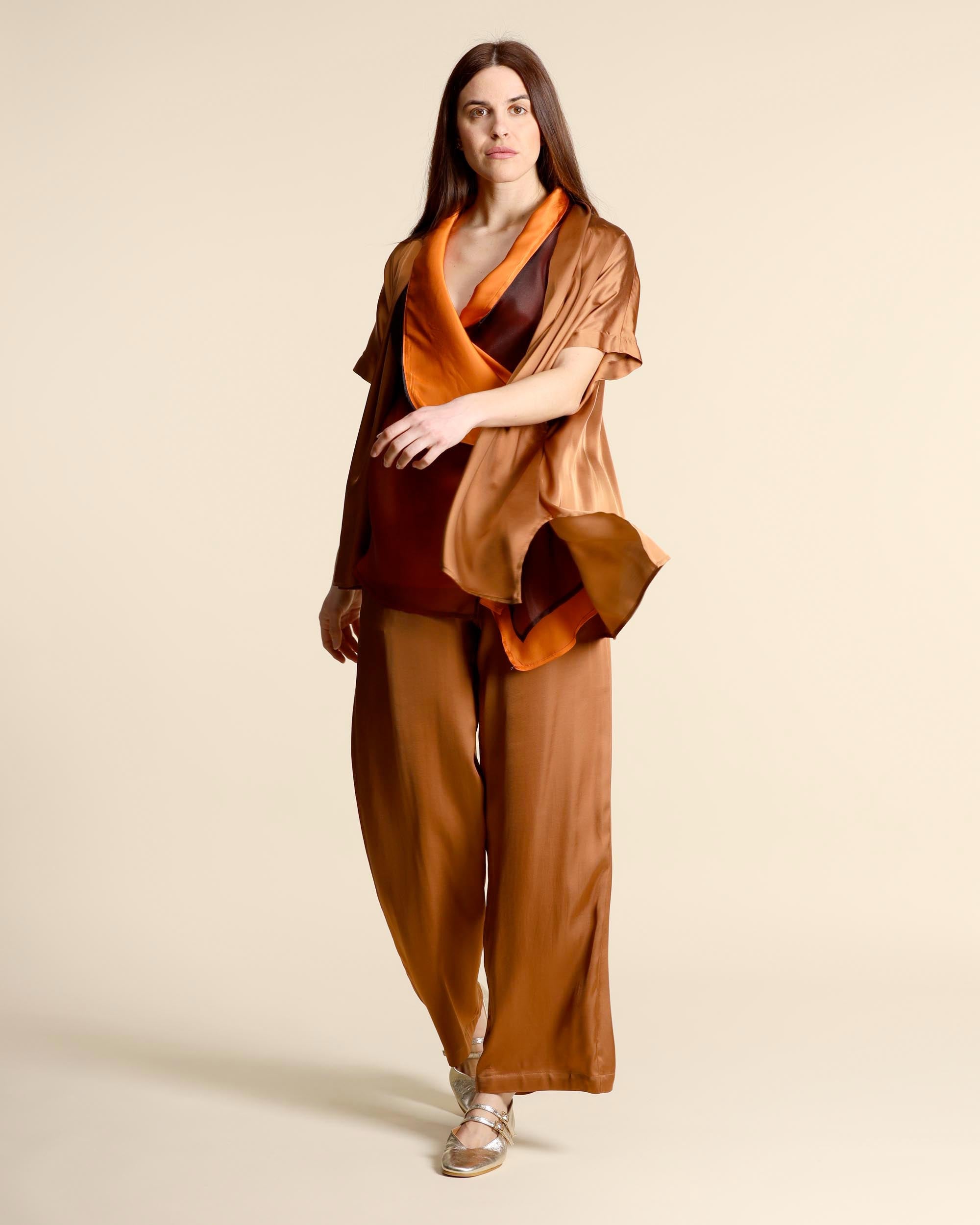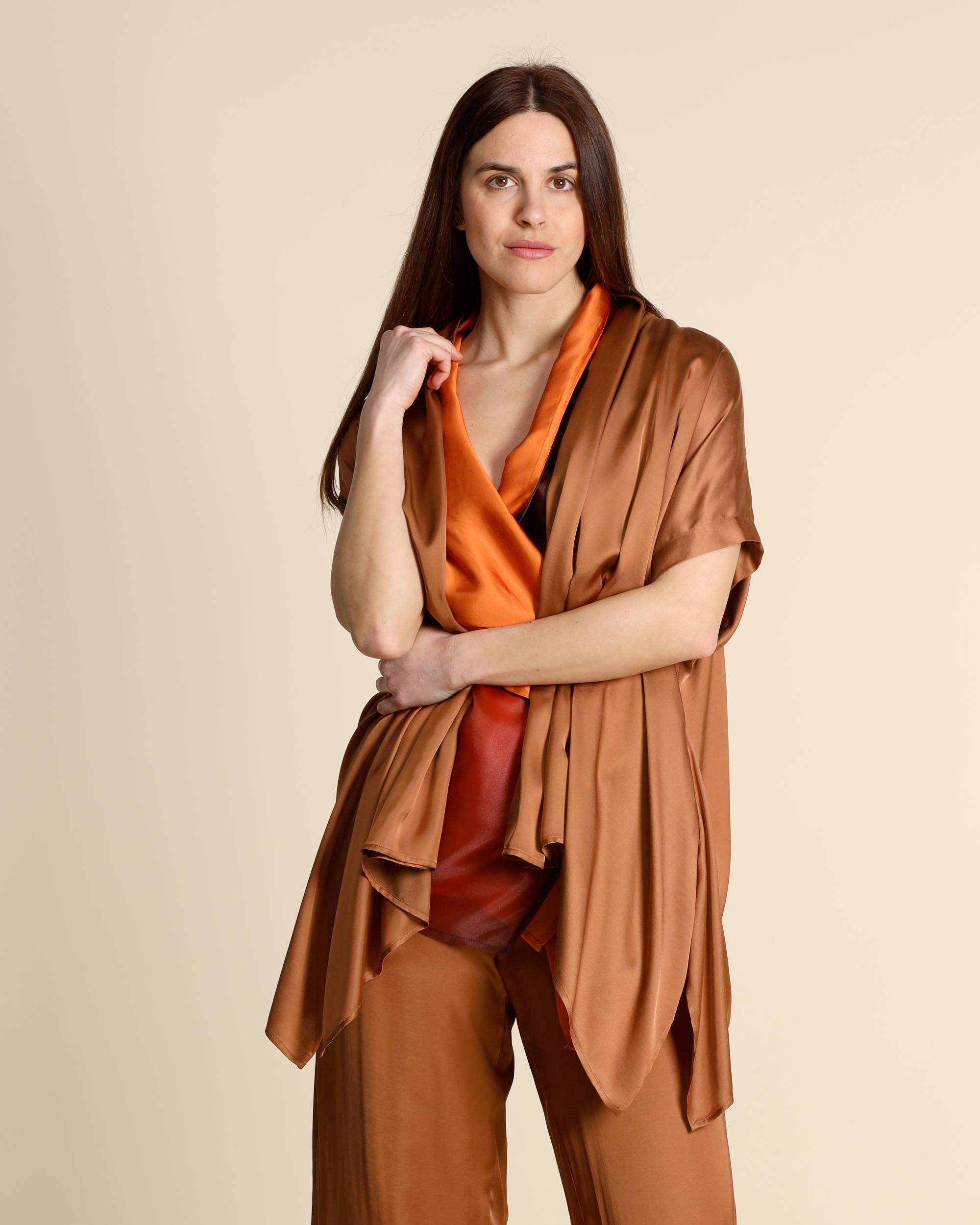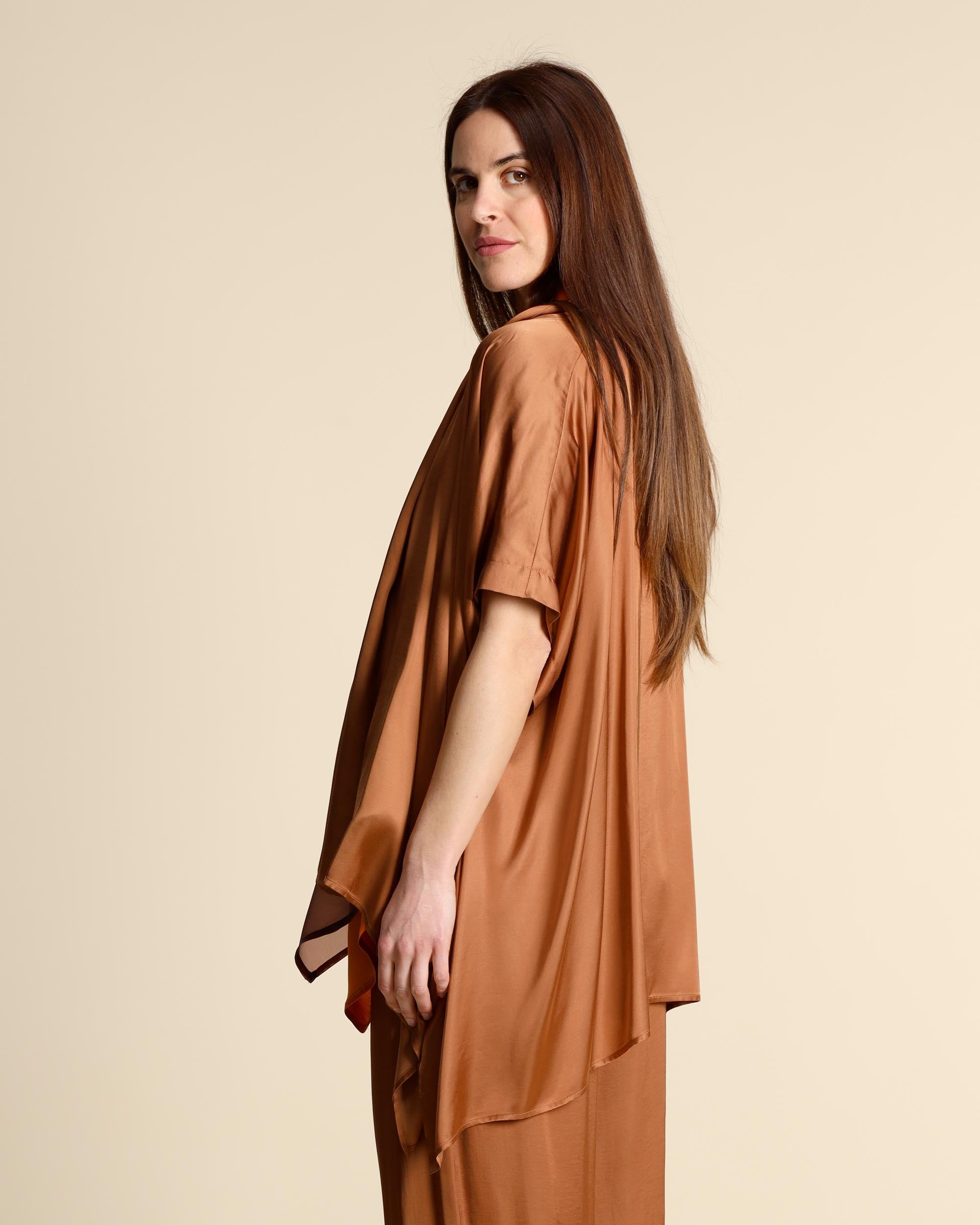 Caban in raso di viscosa color sigaro, collo sciallato, maniche corte a kimono, linea ampia, spacchi laterali, fondo asimmetrico, made in Italy, la modella indossa una tg.42, la modella ha le seguenti misure: altezza 177, seno 86,vita 65, fianchi 93, collezione donna Collection Privee Primavera Estate 2026