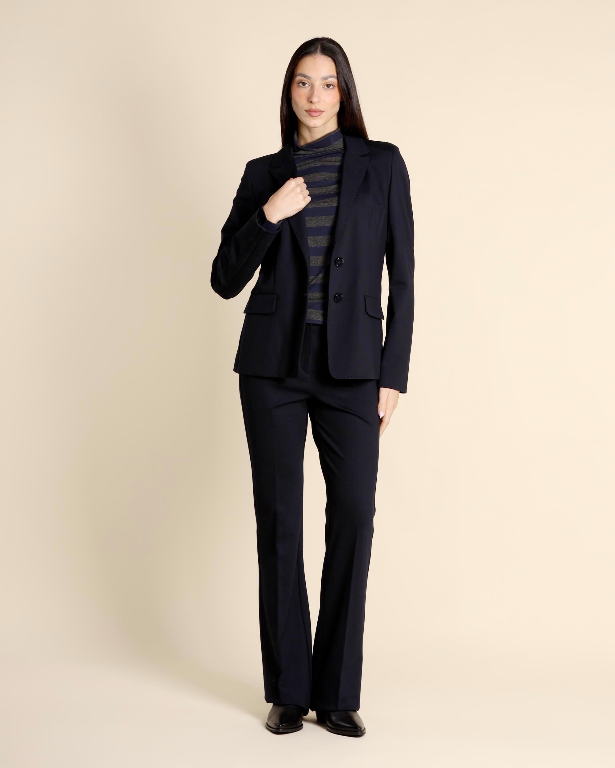 Pantaloni blu in jersey di misto viscosa stretch, chiusura con gancio e zip nascosta, tasca a filetto sul dietro, linea dritta leggermente svasata sul fondo, la modella indossa una tg.40, la modella ha le seguenti misure: altezza 175, seno 86,vita 65, fianchi 93, collezione donna I Blues Autunno Inverno 2025/26