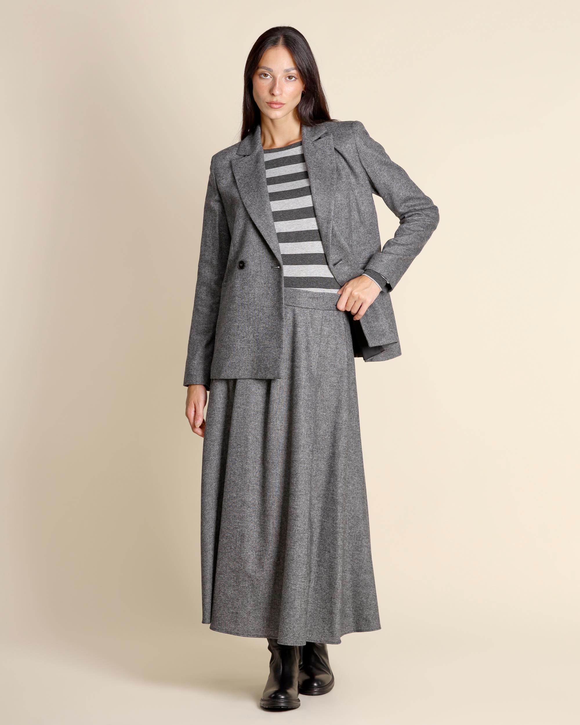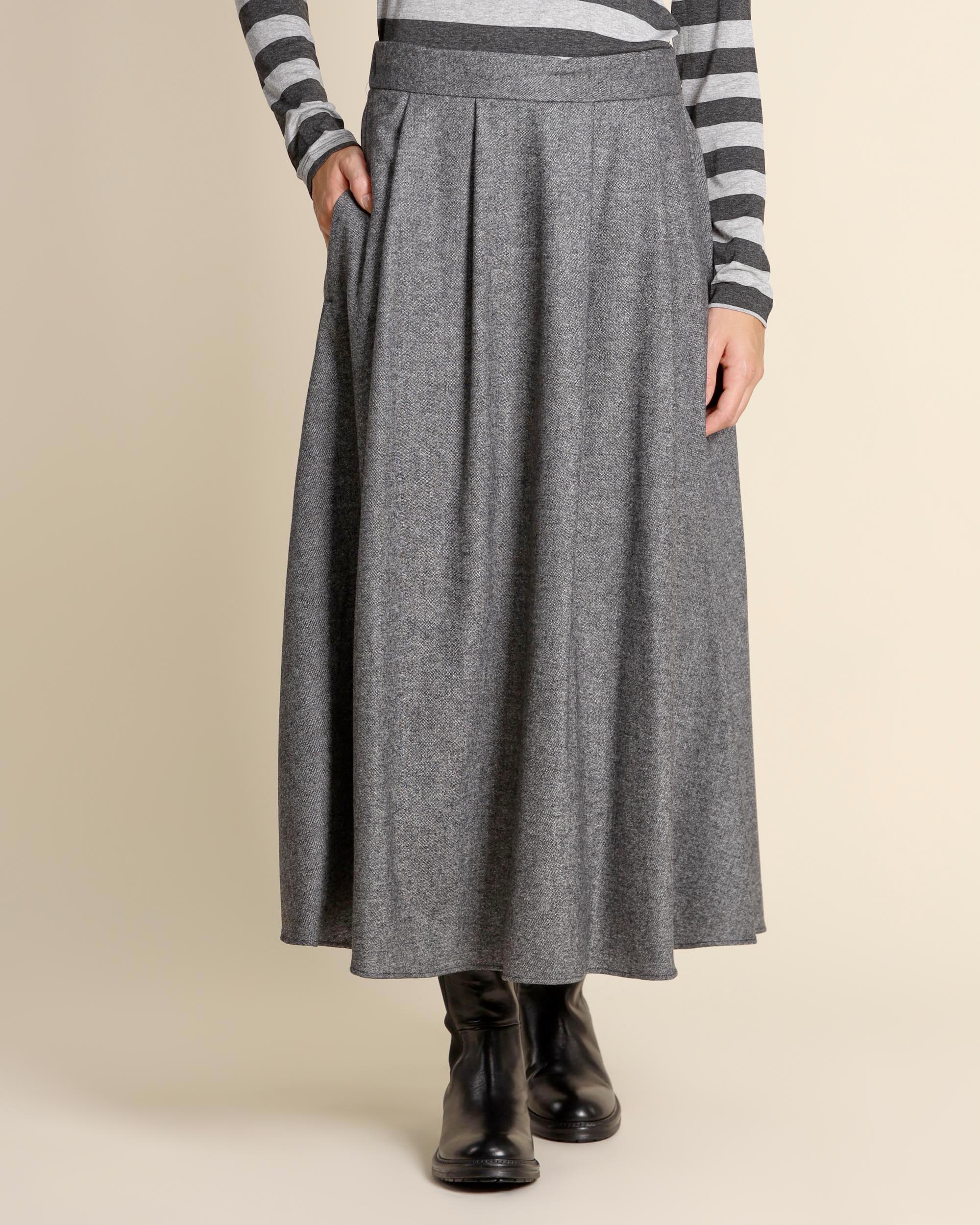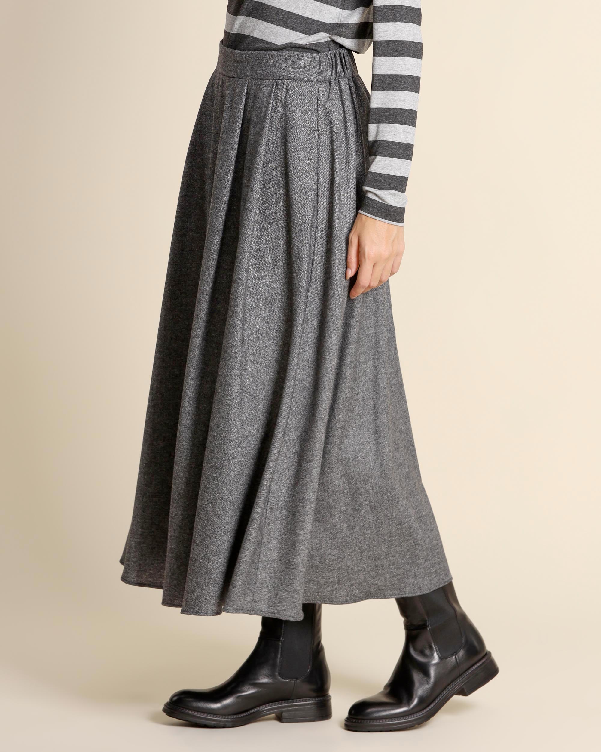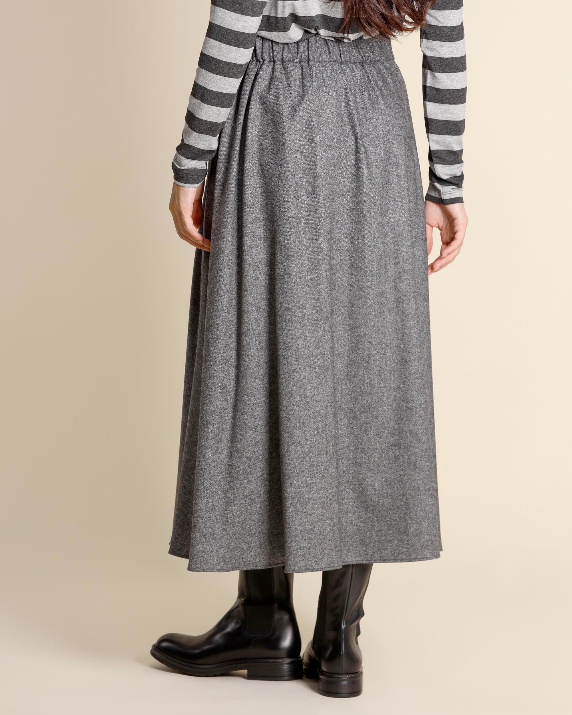 Gonna in flanella di misto lana e viscosa grigio ardesia melange, vita elastica sul dietro, tasche inserite sul fianco, linea ampia, sfoderata, la modella indossa una tg.42, la modella ha le seguenti misure: altezza 173, seno 86,vita 65, fianchi 93, collezione donna Emme by Marella Autunno Inverno 2025/26