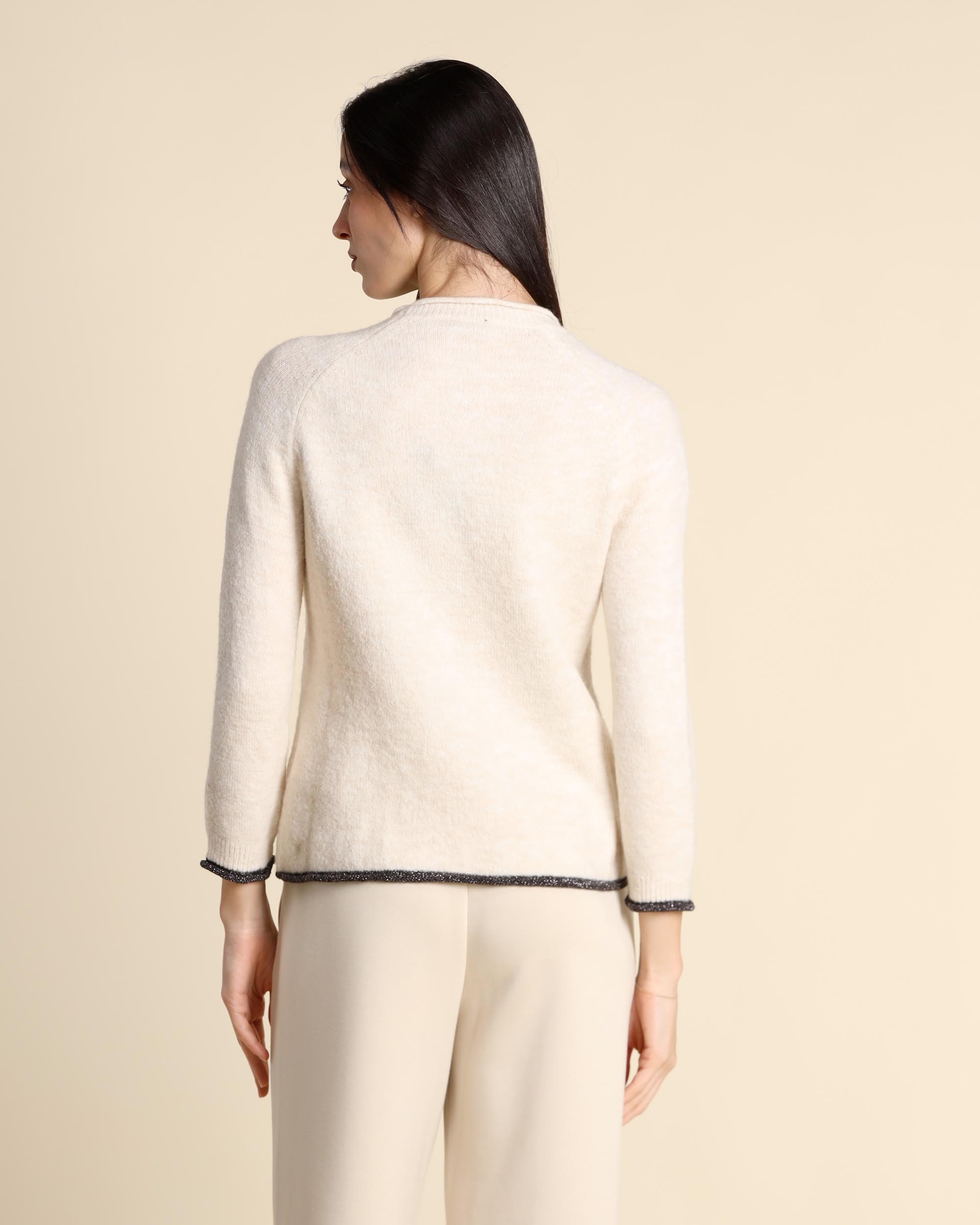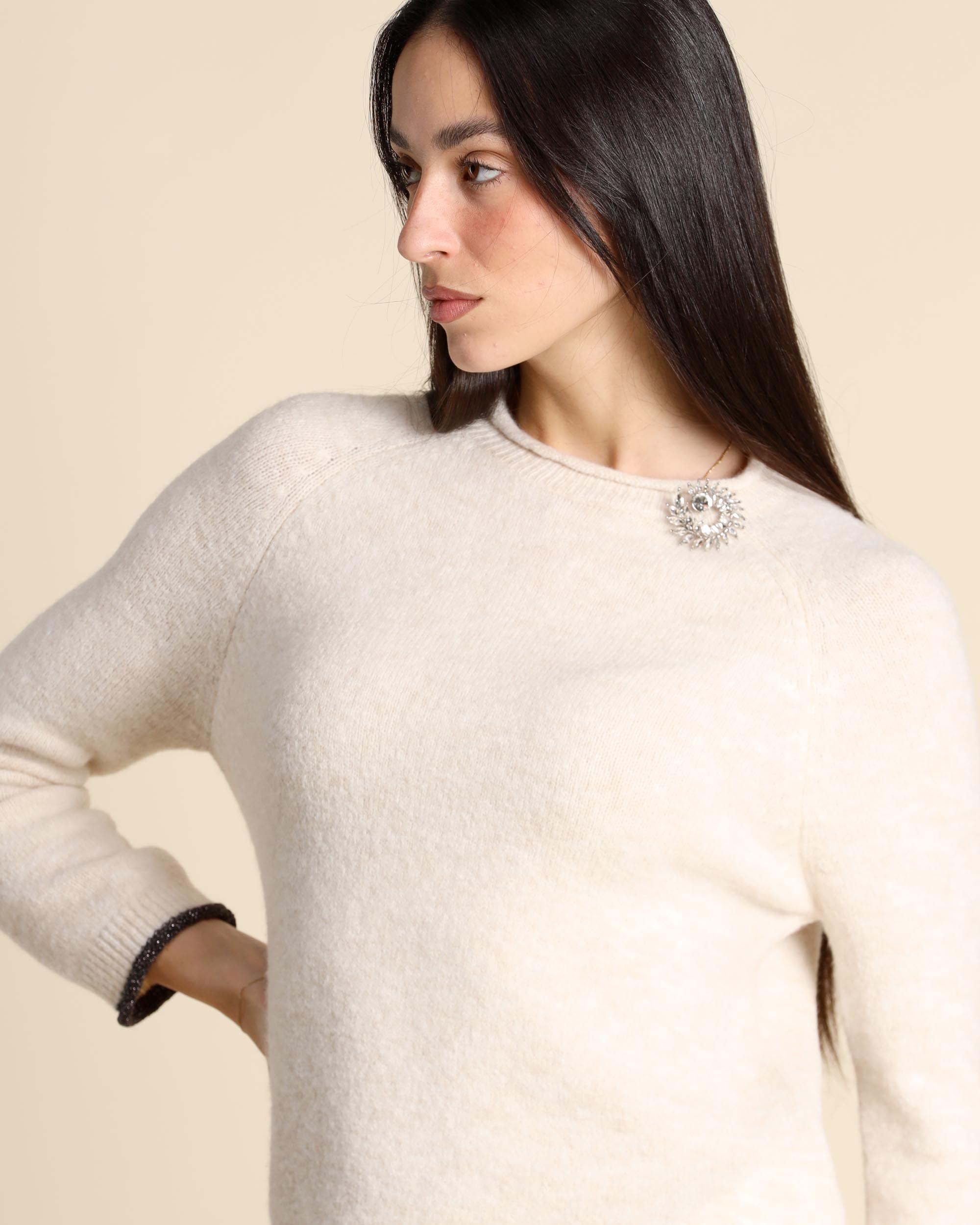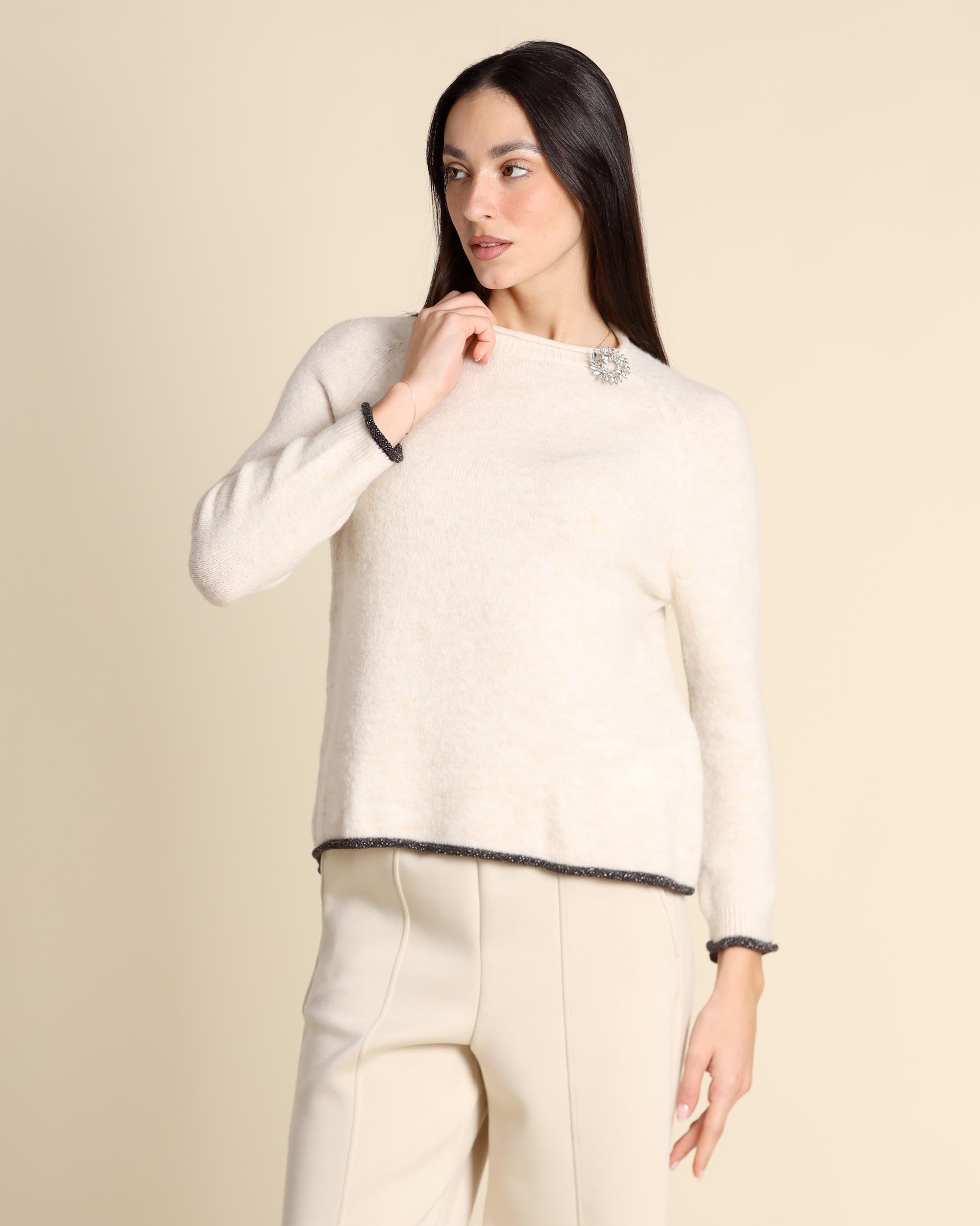 Maglia avorio con dettaglio di profili in lurex con spilla gioiello abbinata, scollo tondo con rolle, maniche lunghe raglan, linea dritta, la modella indossa una tg.S, la modella ha le seguenti misure: altezza 173, seno 84, vita 63, fianchi 94, collezione donna Emme by Marella Autunno Inverno 2025/26