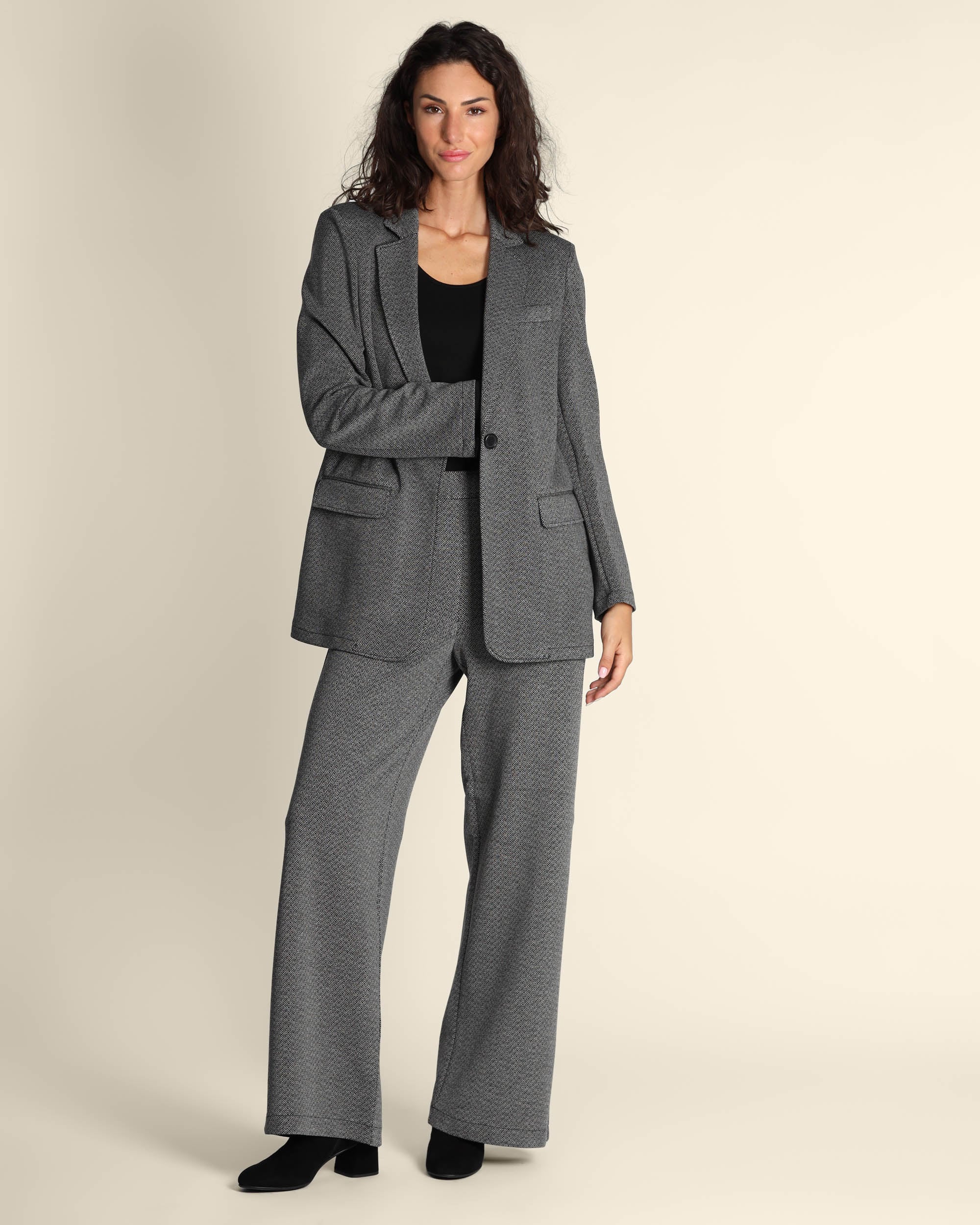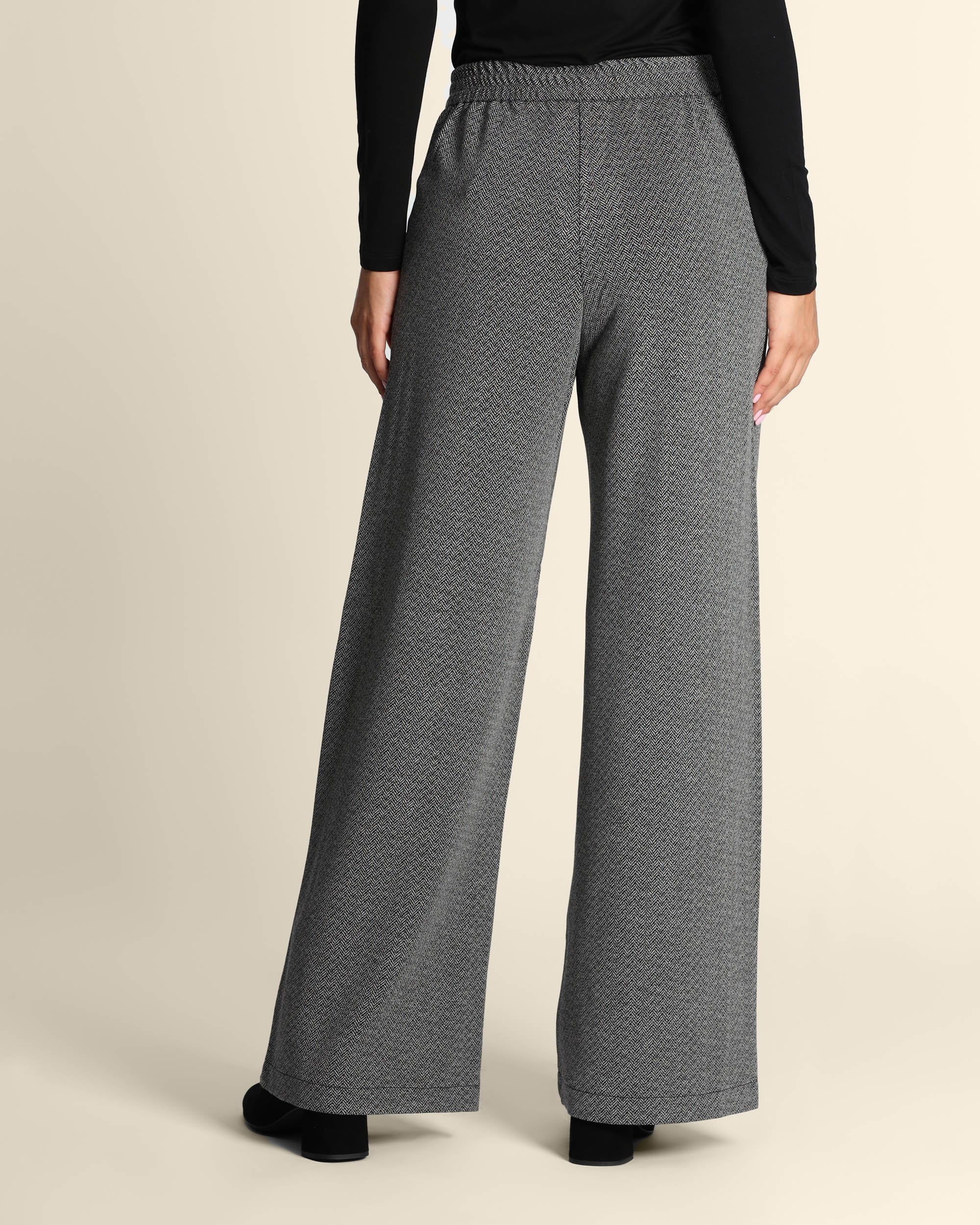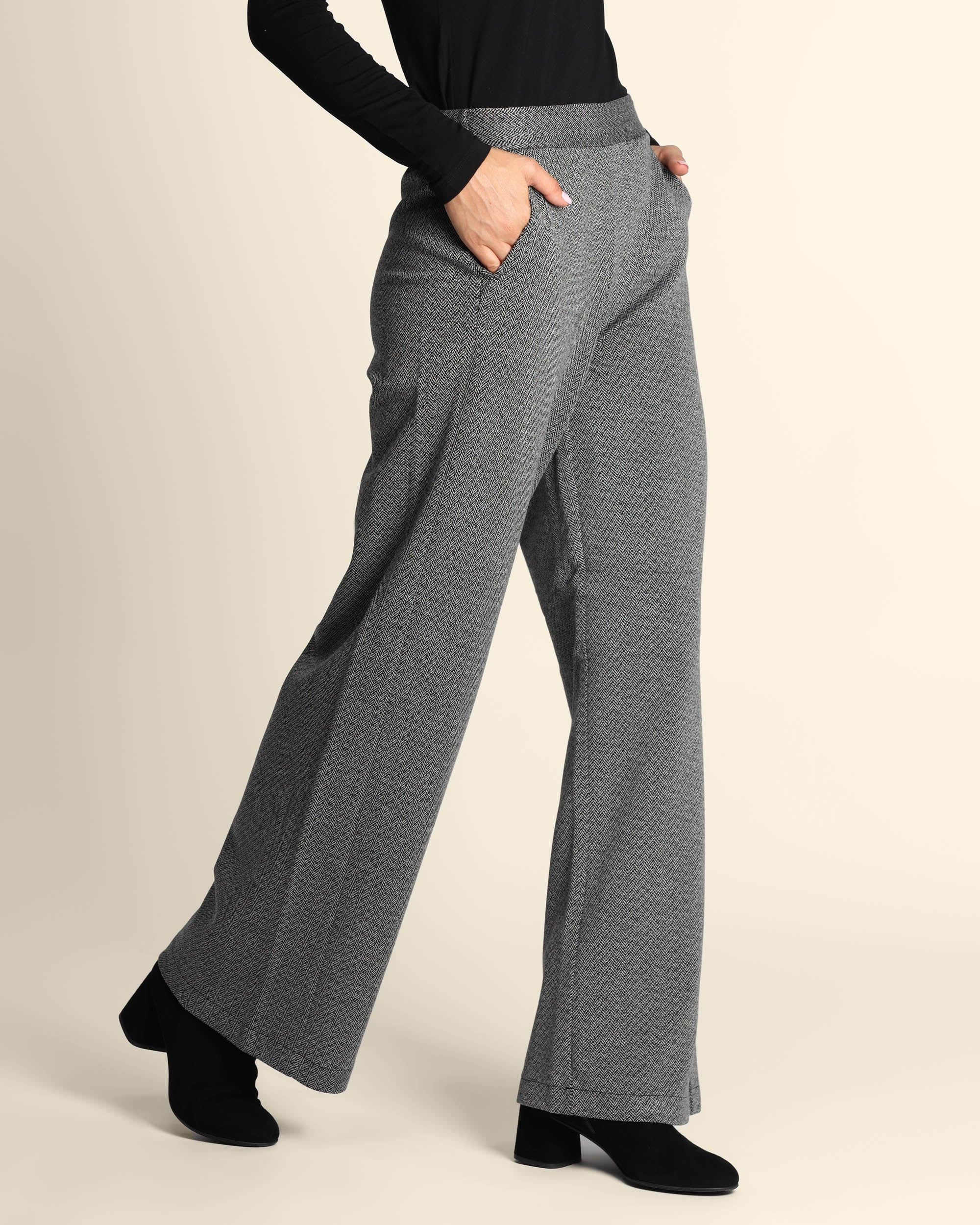 Pantaloni spinati neri in punto Milano di misto viscosa stretch, cinque tasche, vita elastica, tasche a filetto, linea ampia, la modella indossa una tg.42, la modella ha le seguenti misure: altezza 178, seno 86,vita 65, fianchi 93, collezione donna Pennyblack Autunno Inverno 2025/26