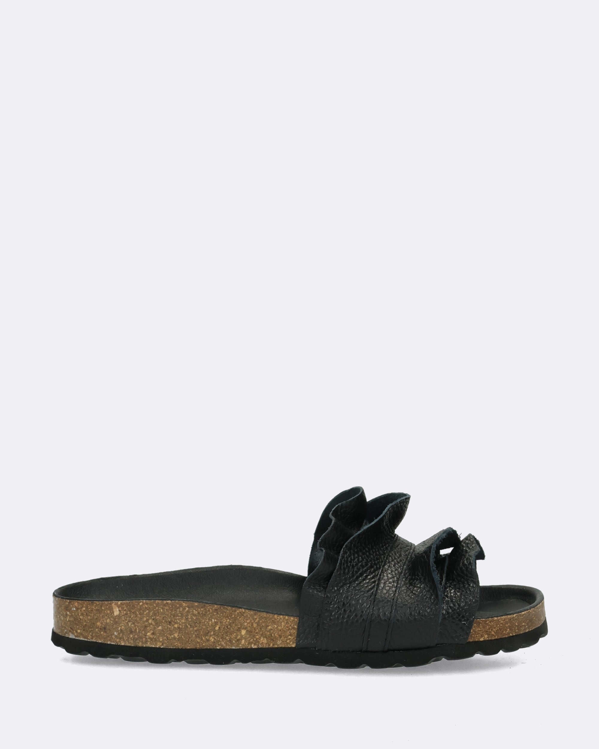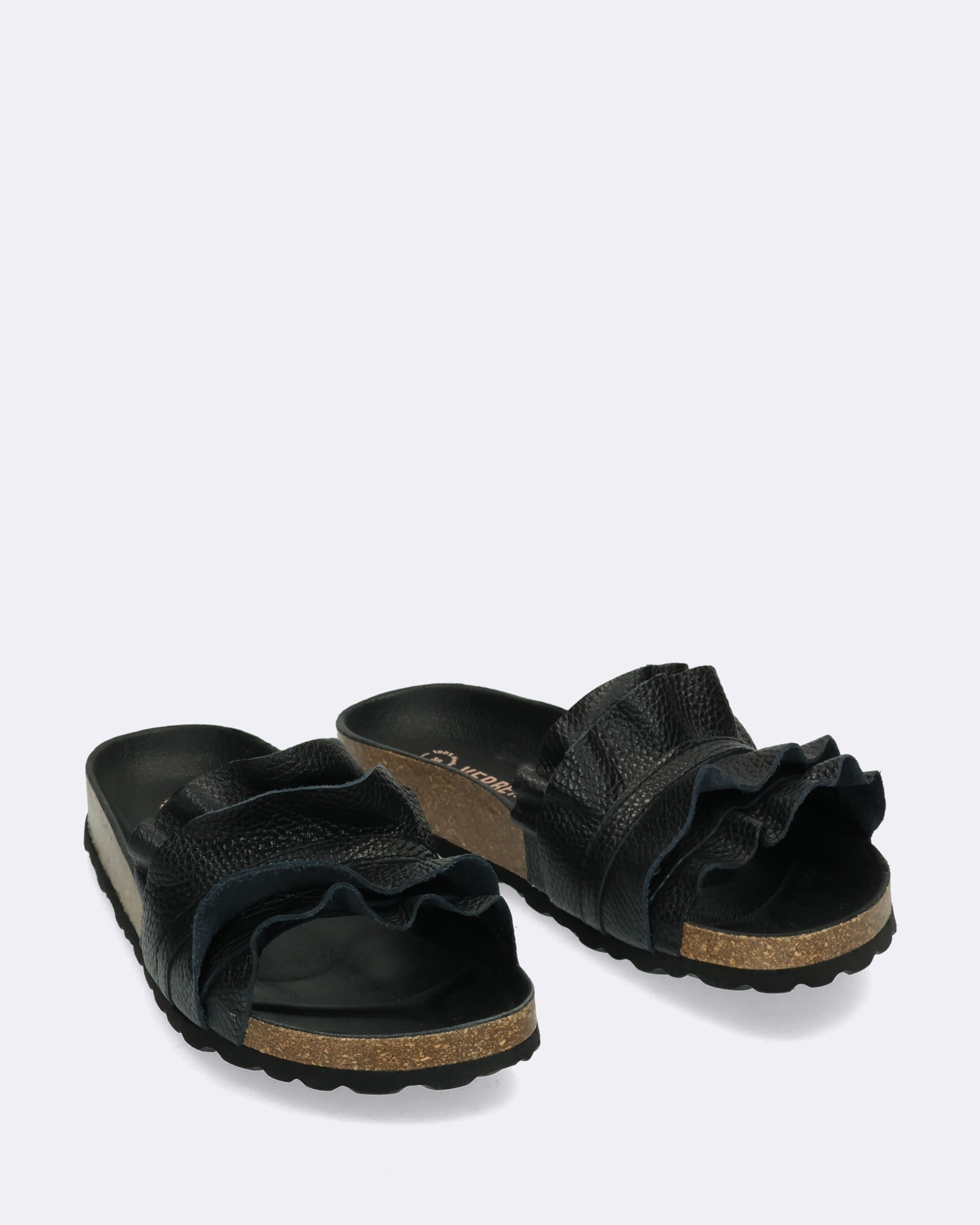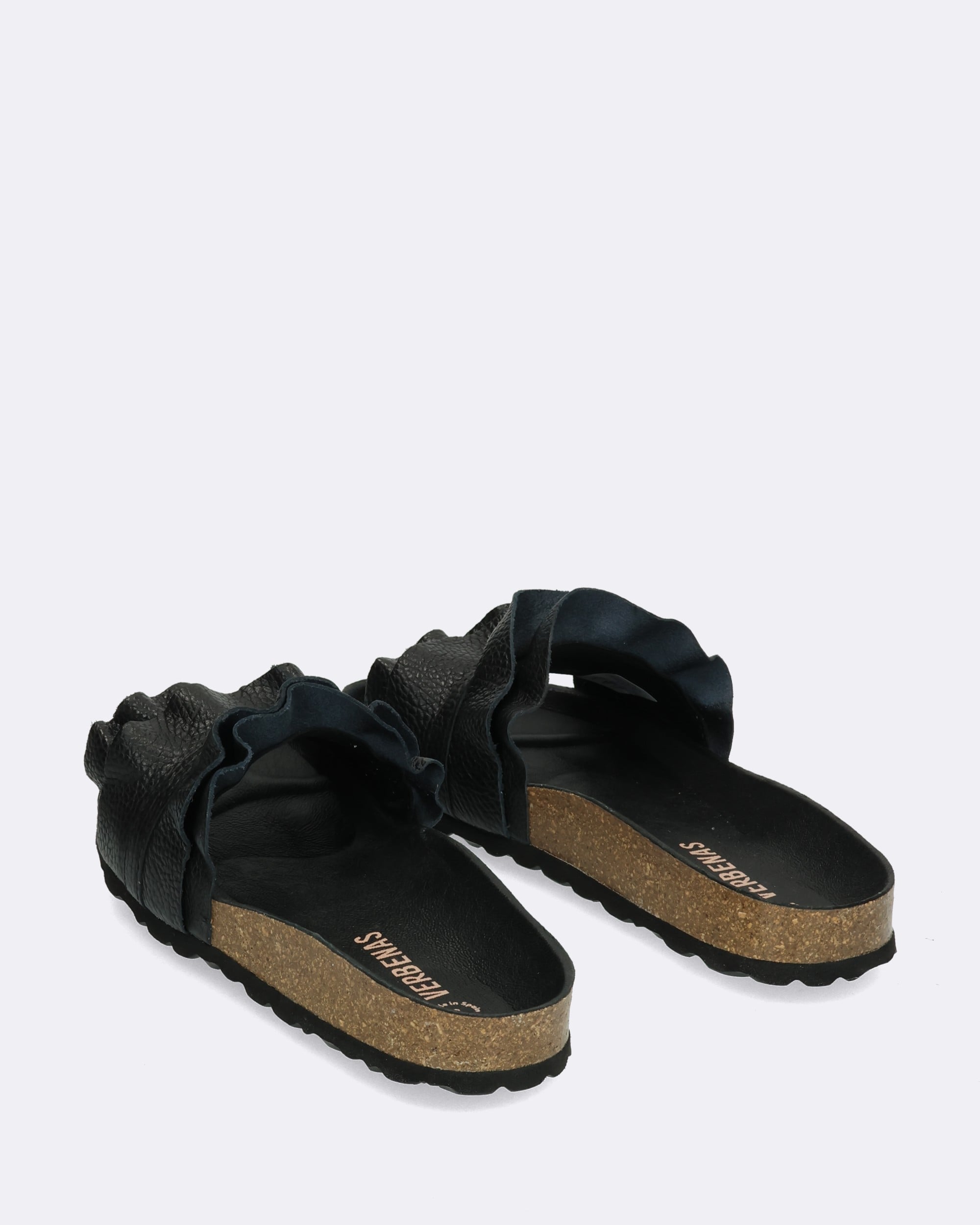 Sandali bassi in pelle martellata nera, fussbett, sottopiede in pelle, suola in gomma, fascia con ruches, collezione Verbenas Primavera estate 2025