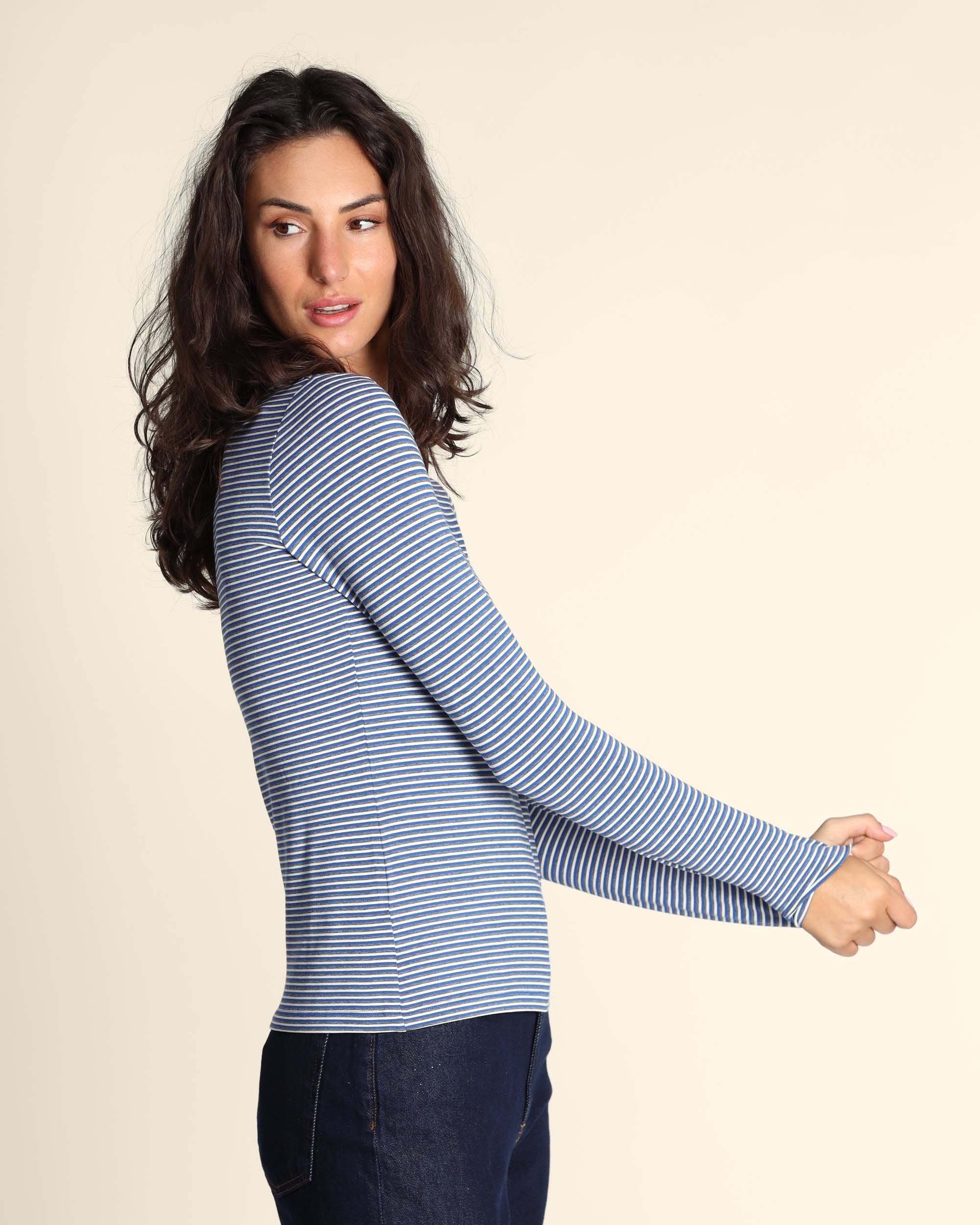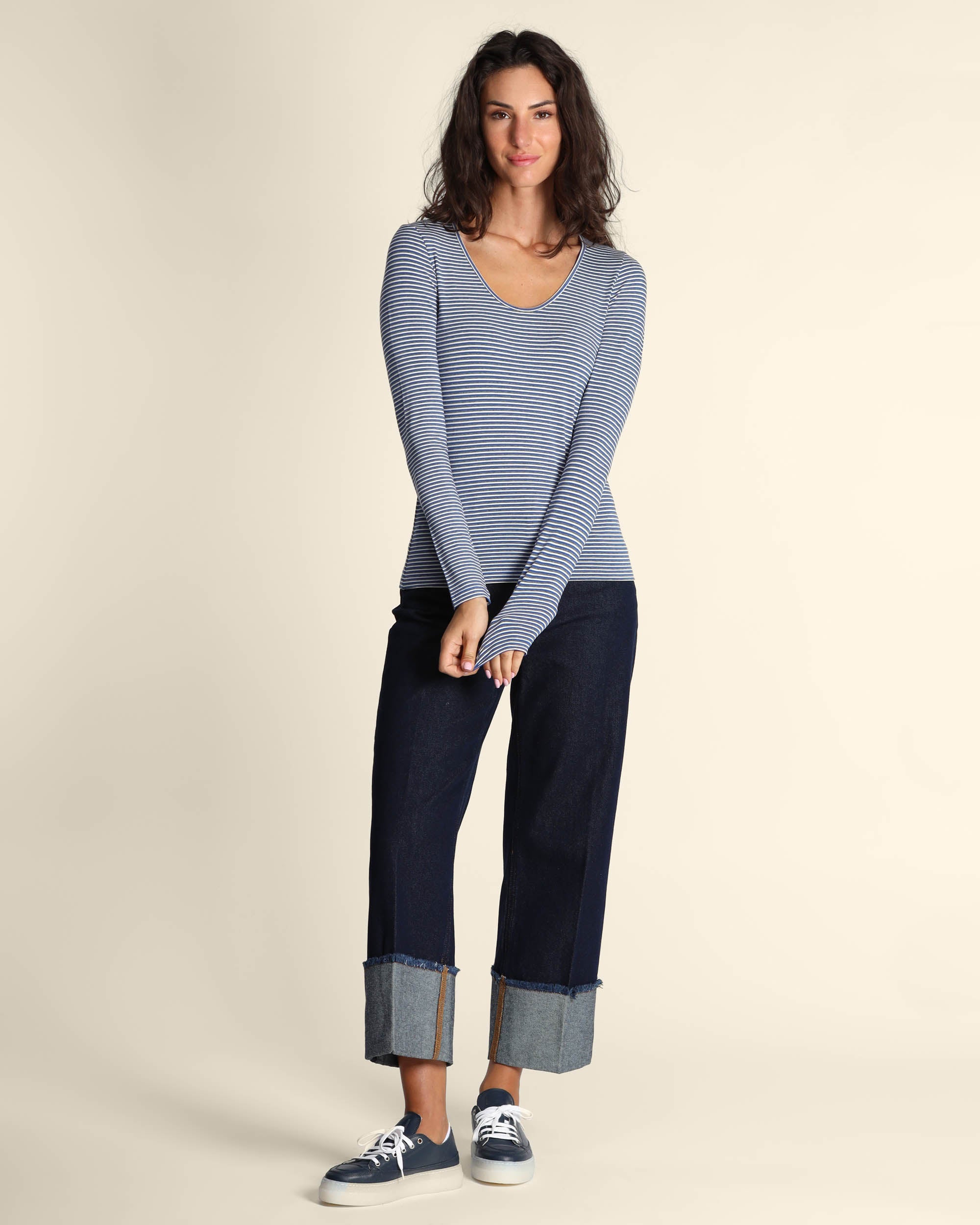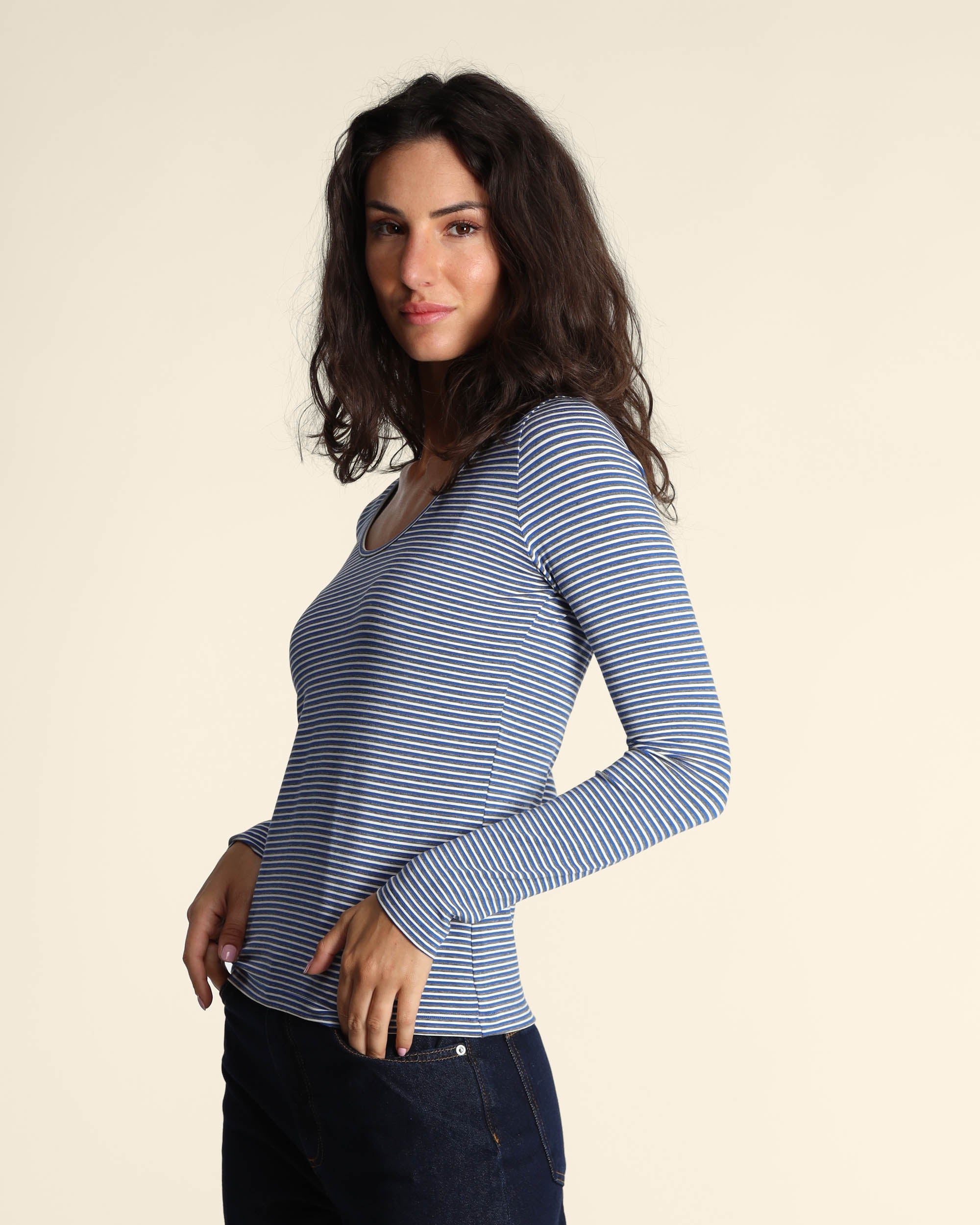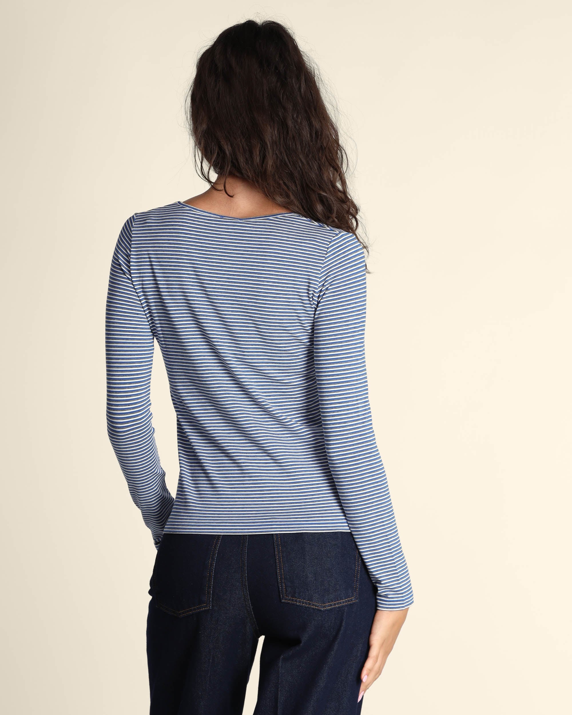 T shirt blu a righe in jersey di viscosa stretch, scollo tondo, maniche lunghe, linea semiaderente, la modella indossa una tg.S, la modella ha le seguenti misure: altezza 179, seno 84, vita 63, fianchi 94, collezione donna Pennyblack Autunno Inverno 2025/26