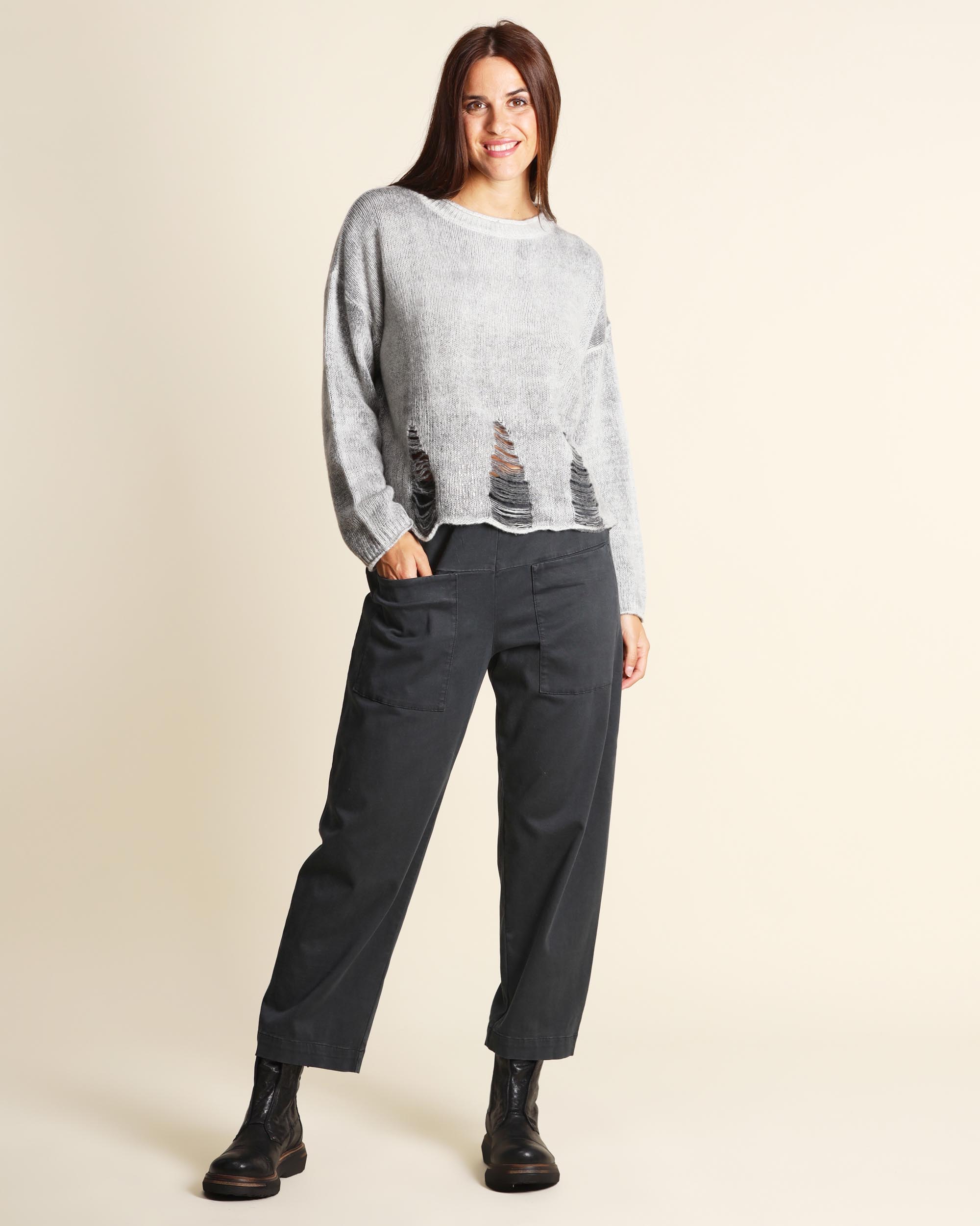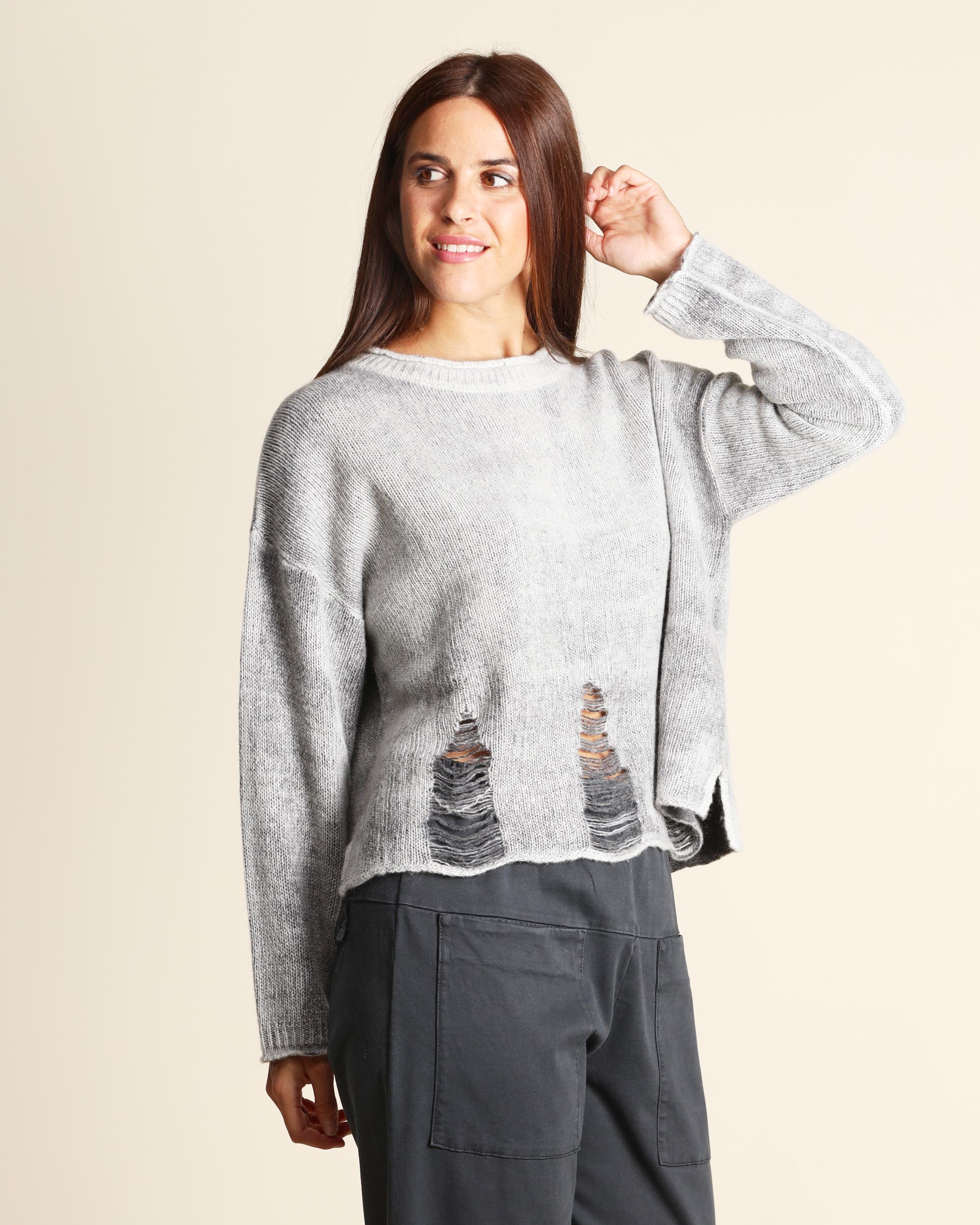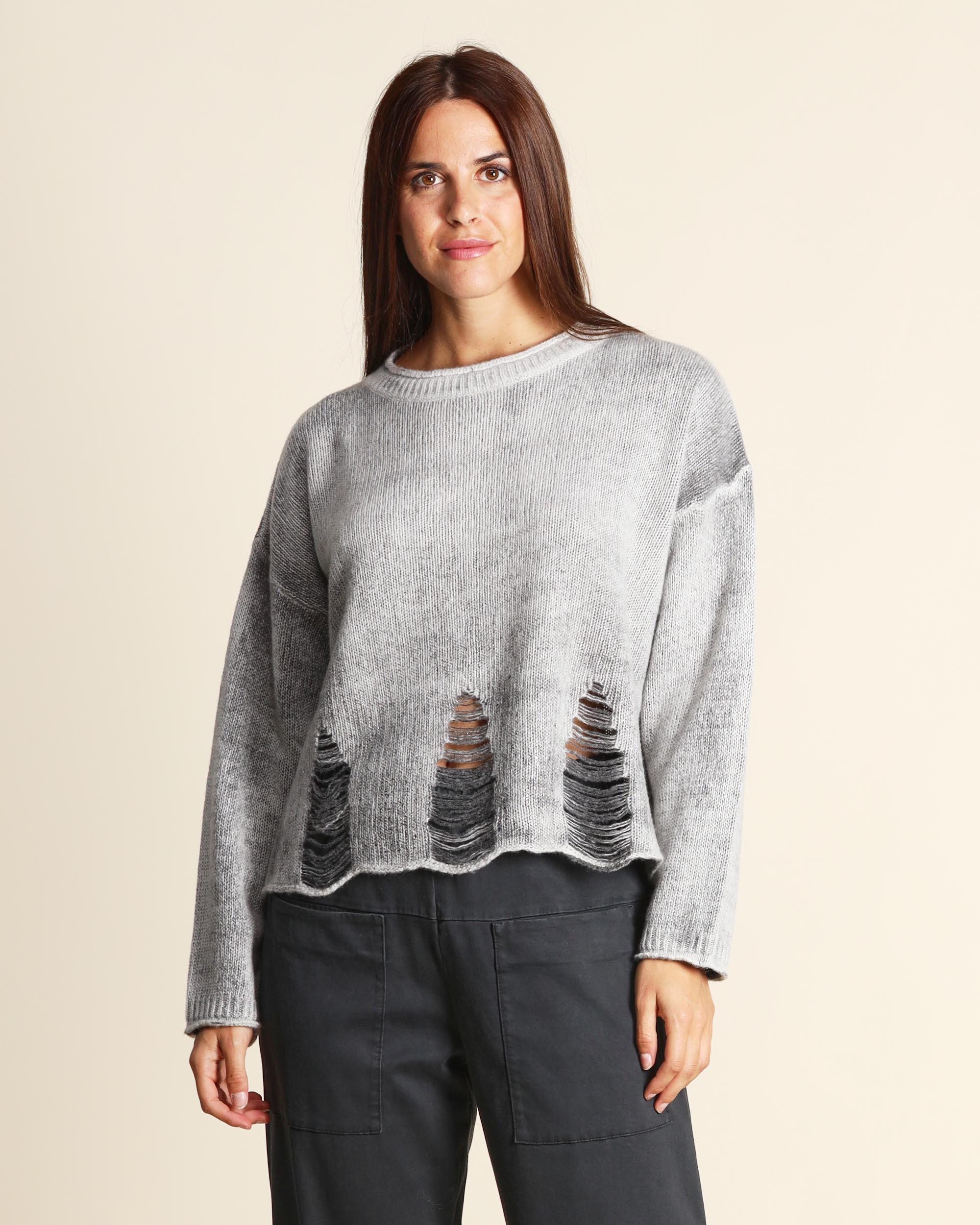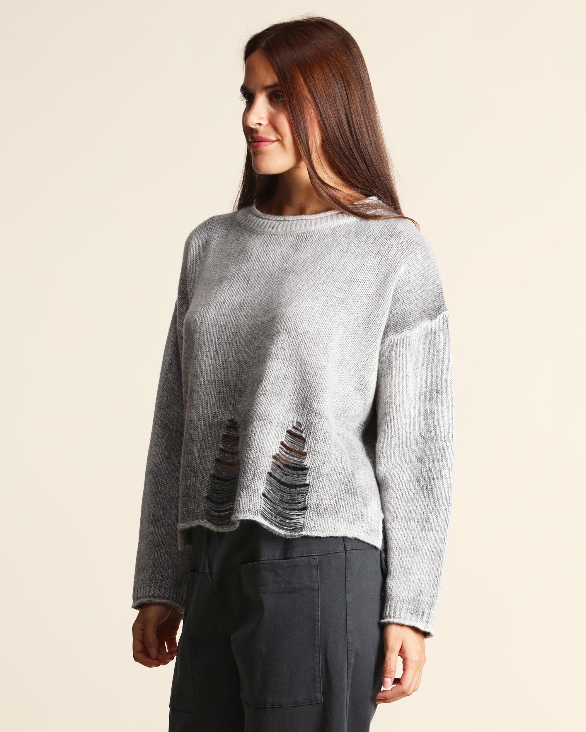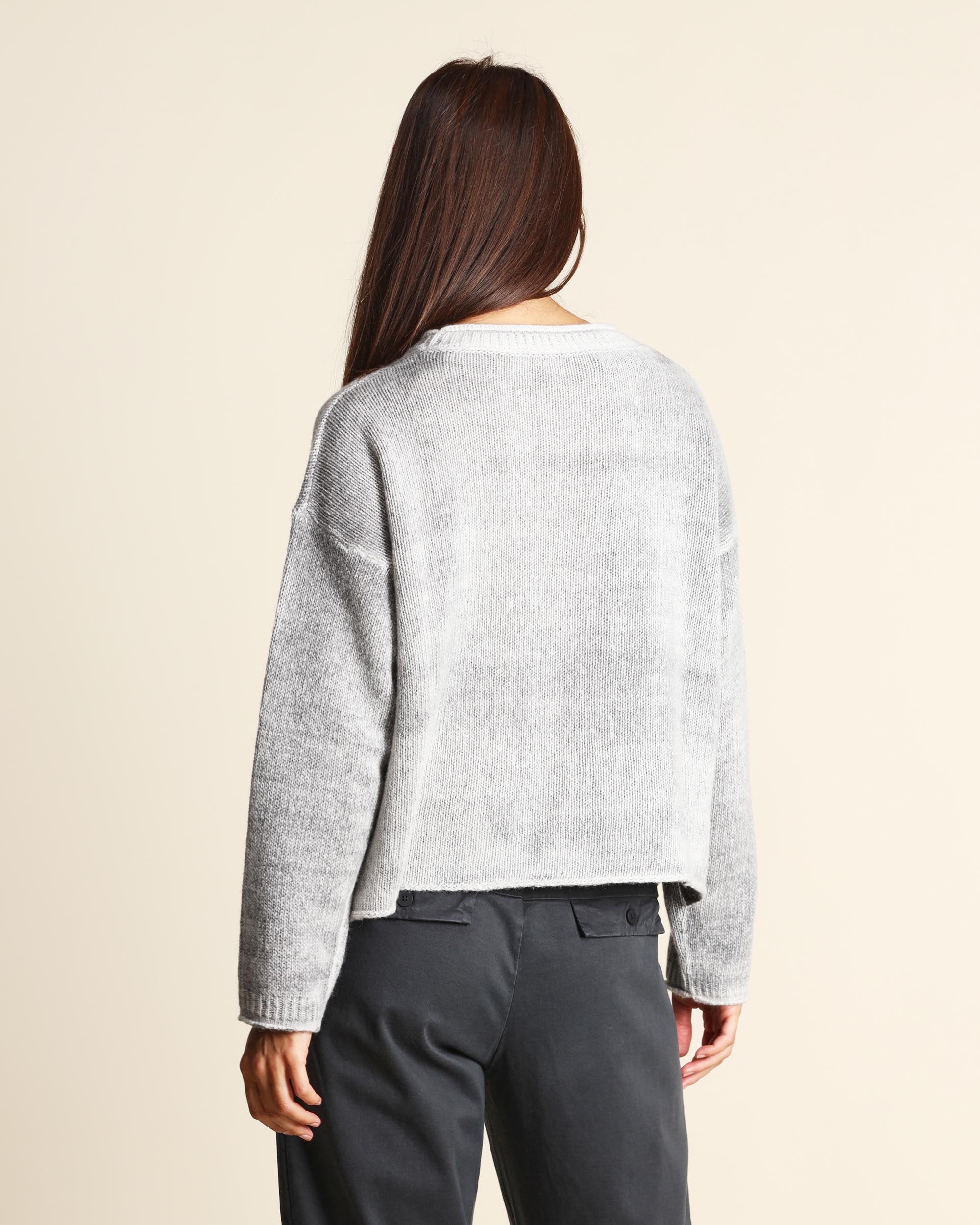 Maglia degradè in lana merinos, viscosa e cashmere, scollo tondo, maniche lunghe, giro sceso, linea boxy, made in Italy, la modella indossa una tg.42, la modella ha le seguenti misure: altezza 178, seno 86,vita 65, fianchi 93, collezione donna Collection Privèee Autunno Inverno 2025/26